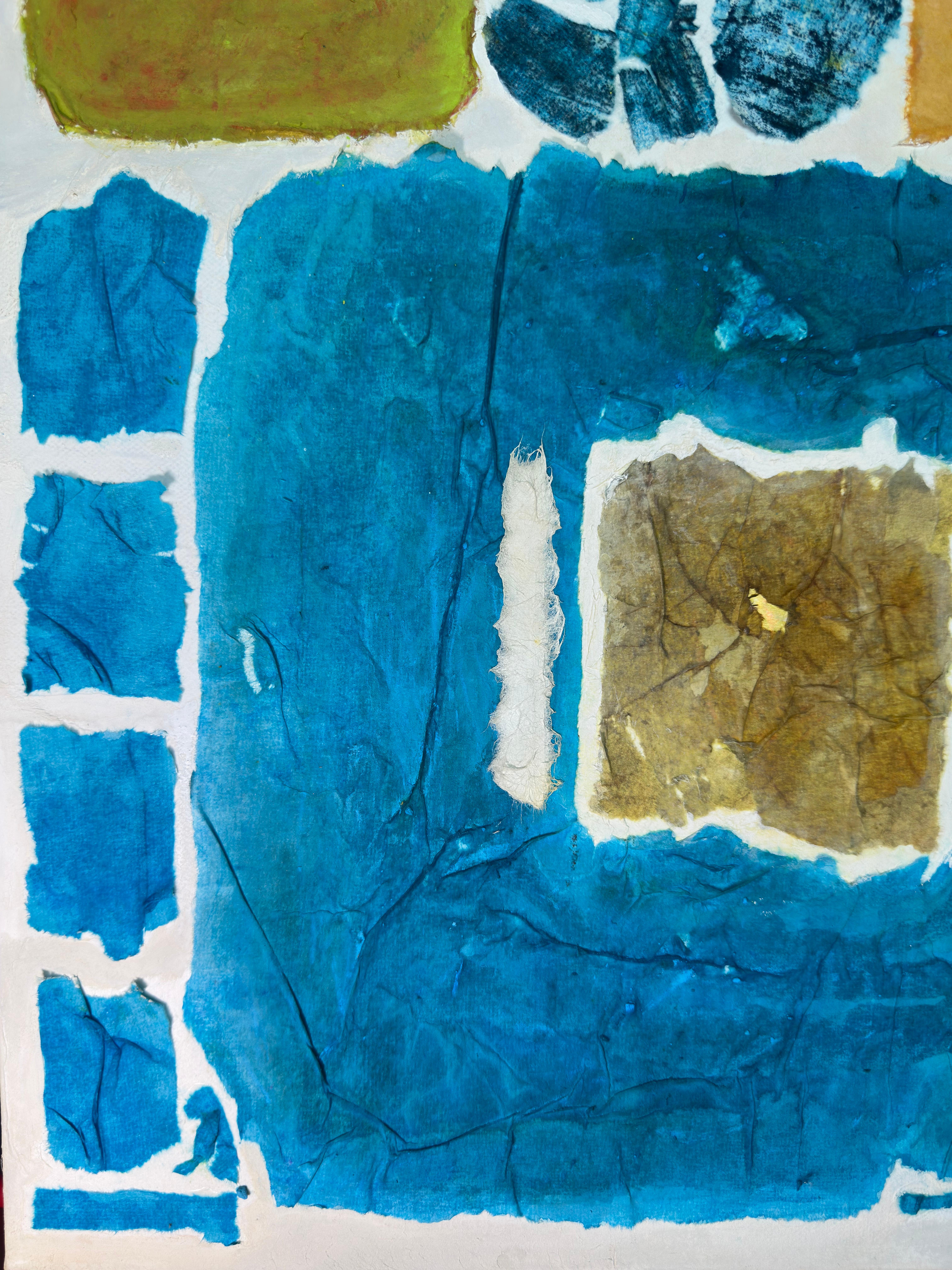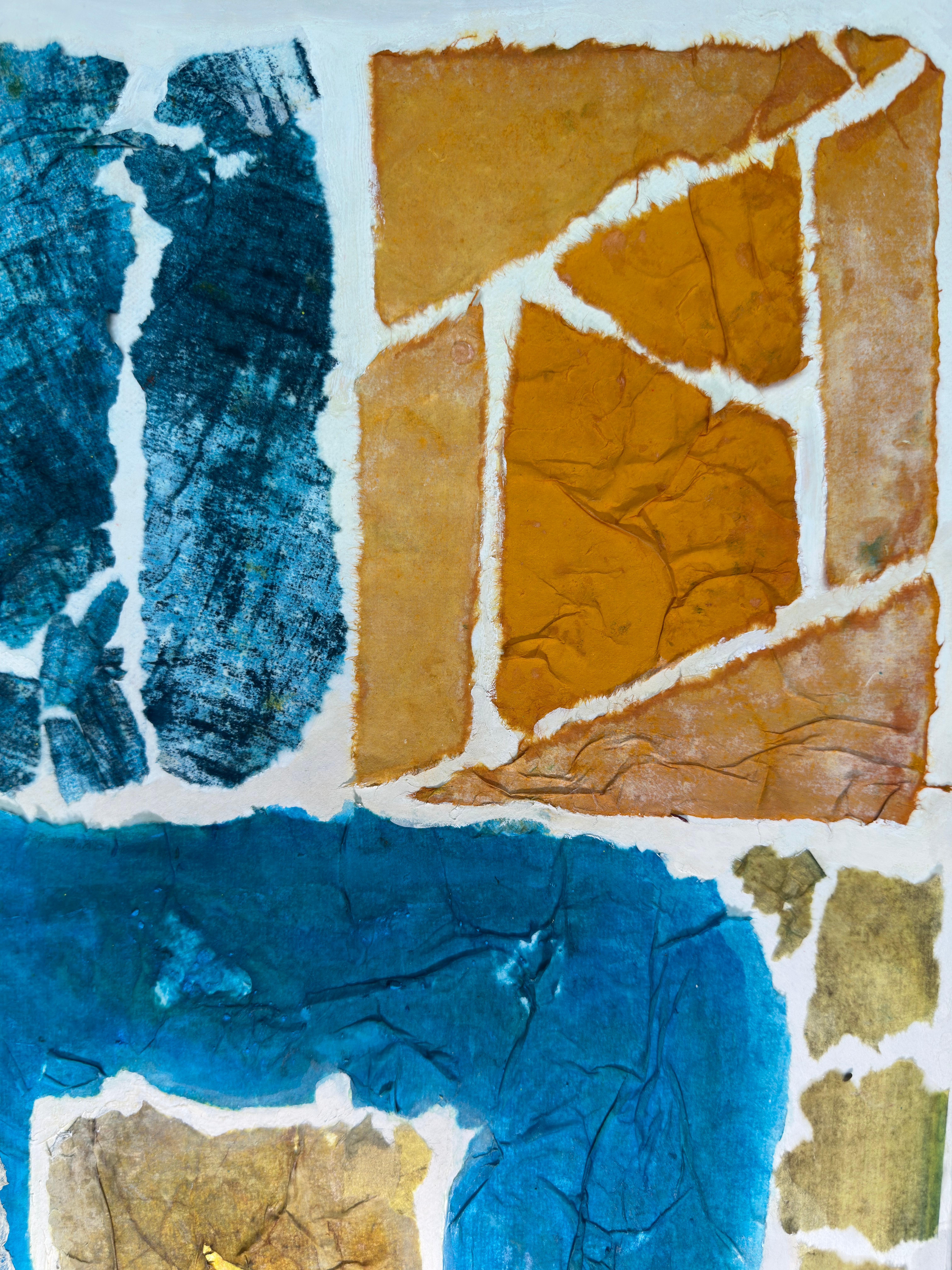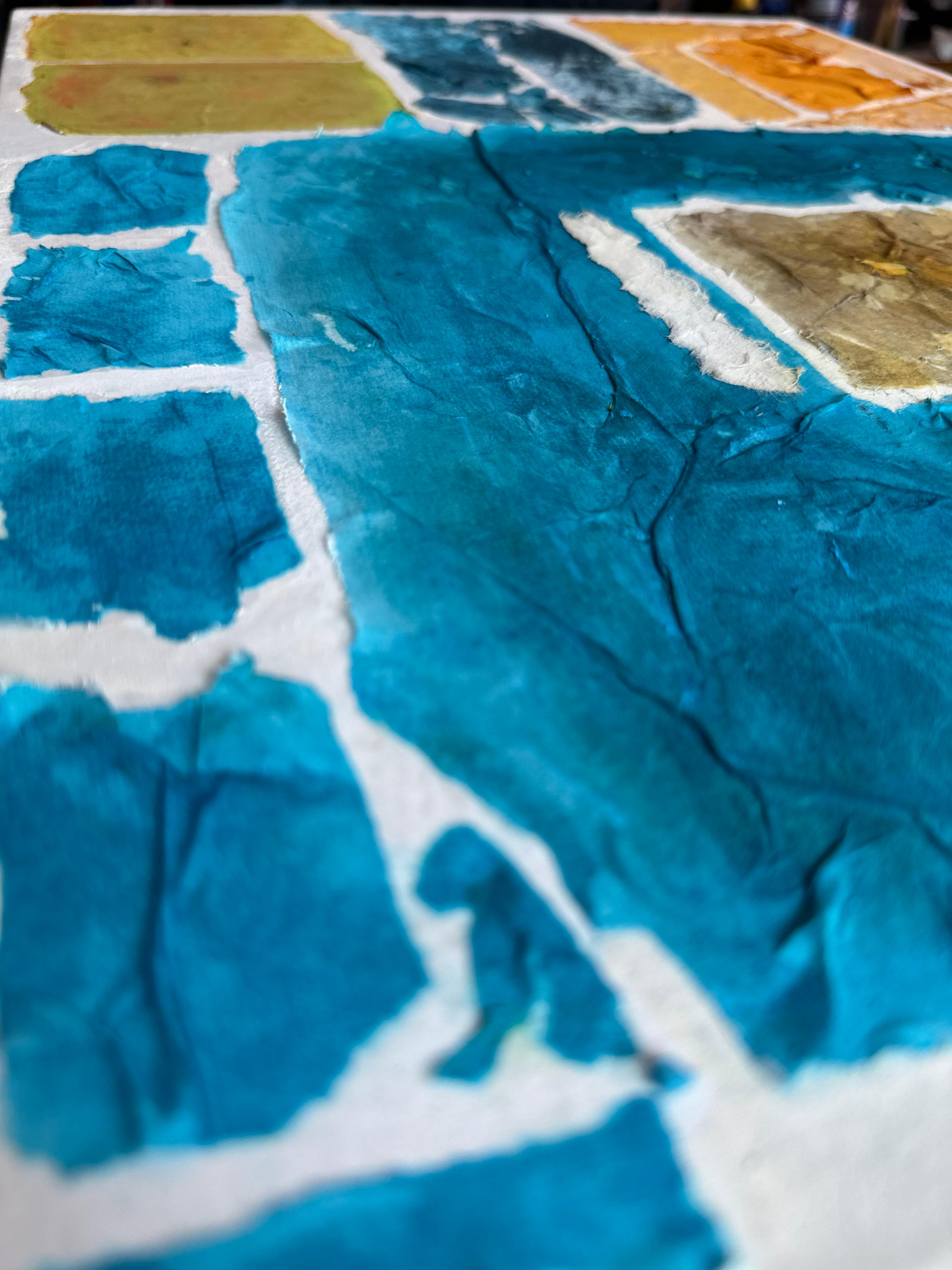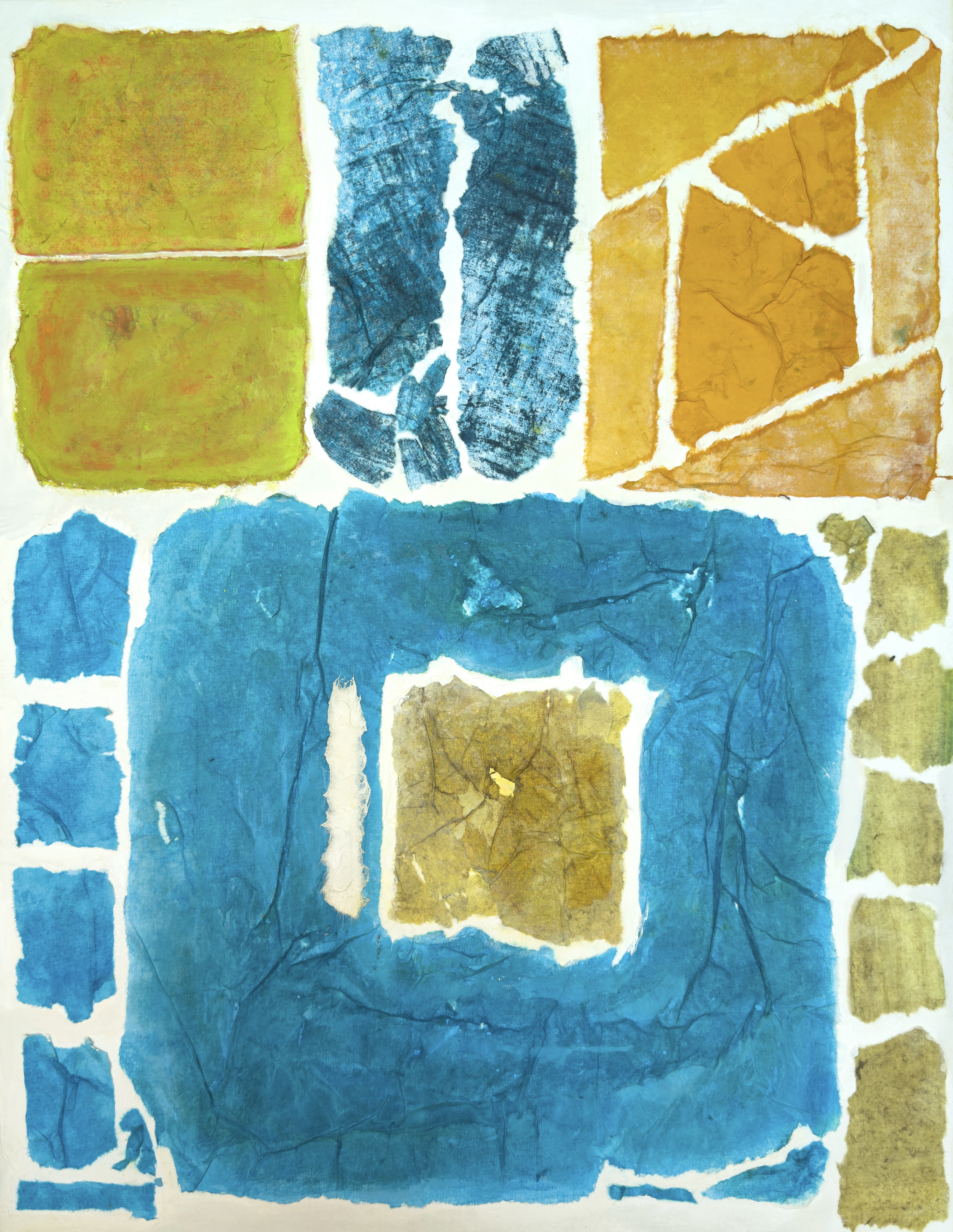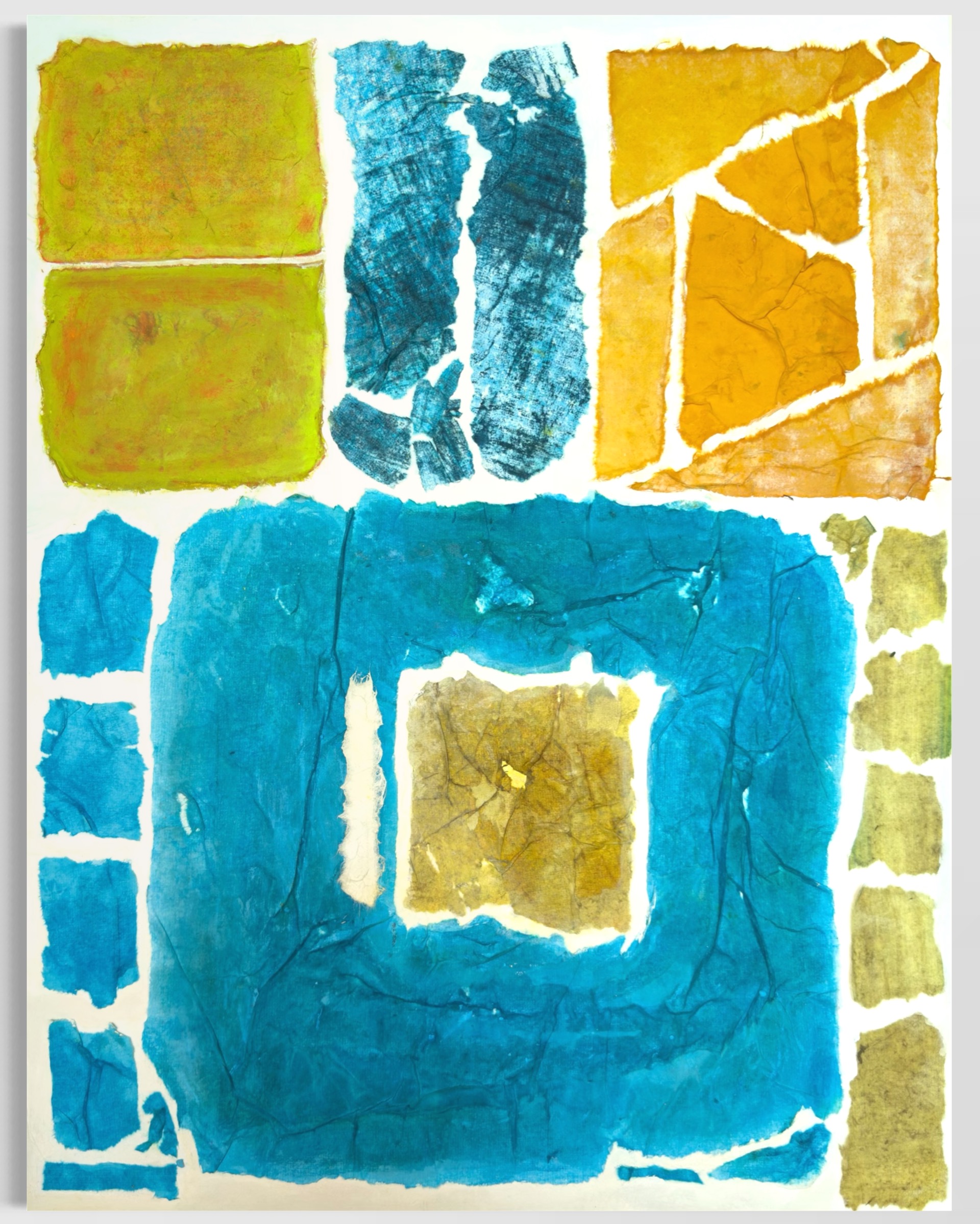 This work operates through material resistance rather than compositional mastery. When torn, hanji determines its own fracture lines—edges emerge as the fiber's autonomous response to tension. Cerulean and turquoise saturate the lower register while cadmium yellow, yellow ochre, and burnt sienna fragment across the upper zone. These are not arranged but deposited through sequential staining and removal. Pigment migrates unevenly into varying paper densities, creating topographical variance—pooling, ridging, cracking. What remains is stratigraphic record: each layer documenting decision, material refusal, and temporal erosion. The white interstices are literal absences where paper was excised—not negative space but actual loss.