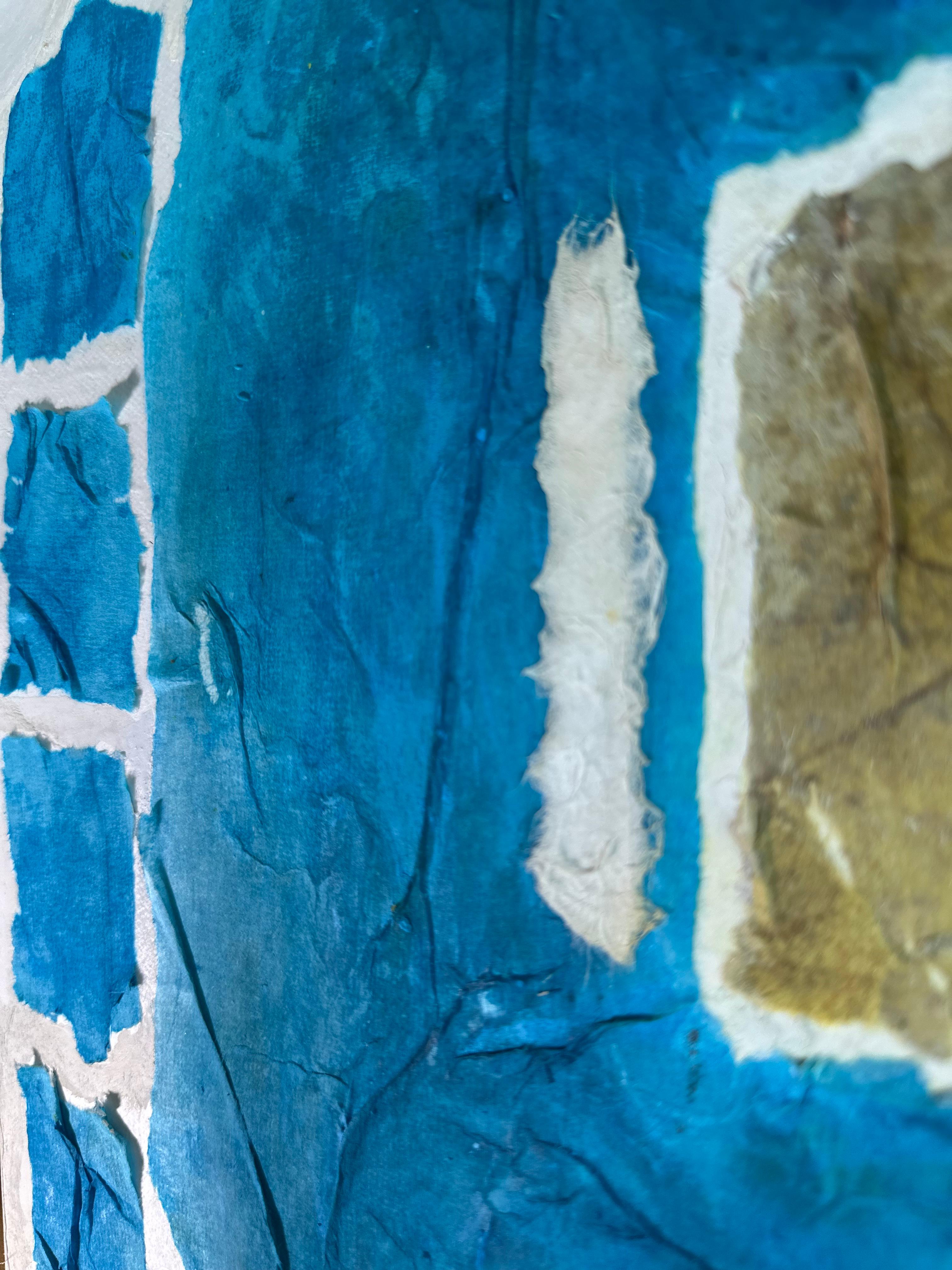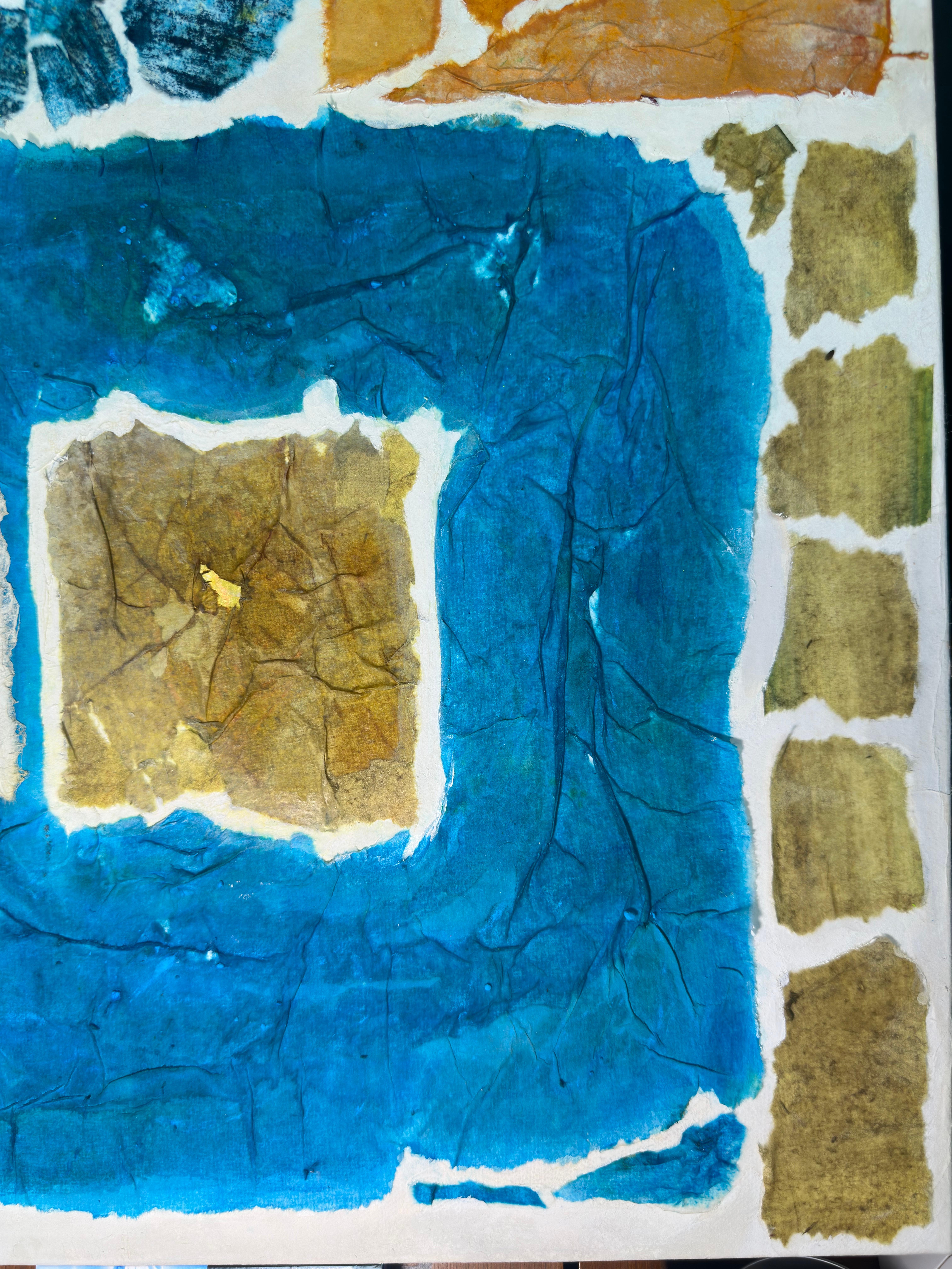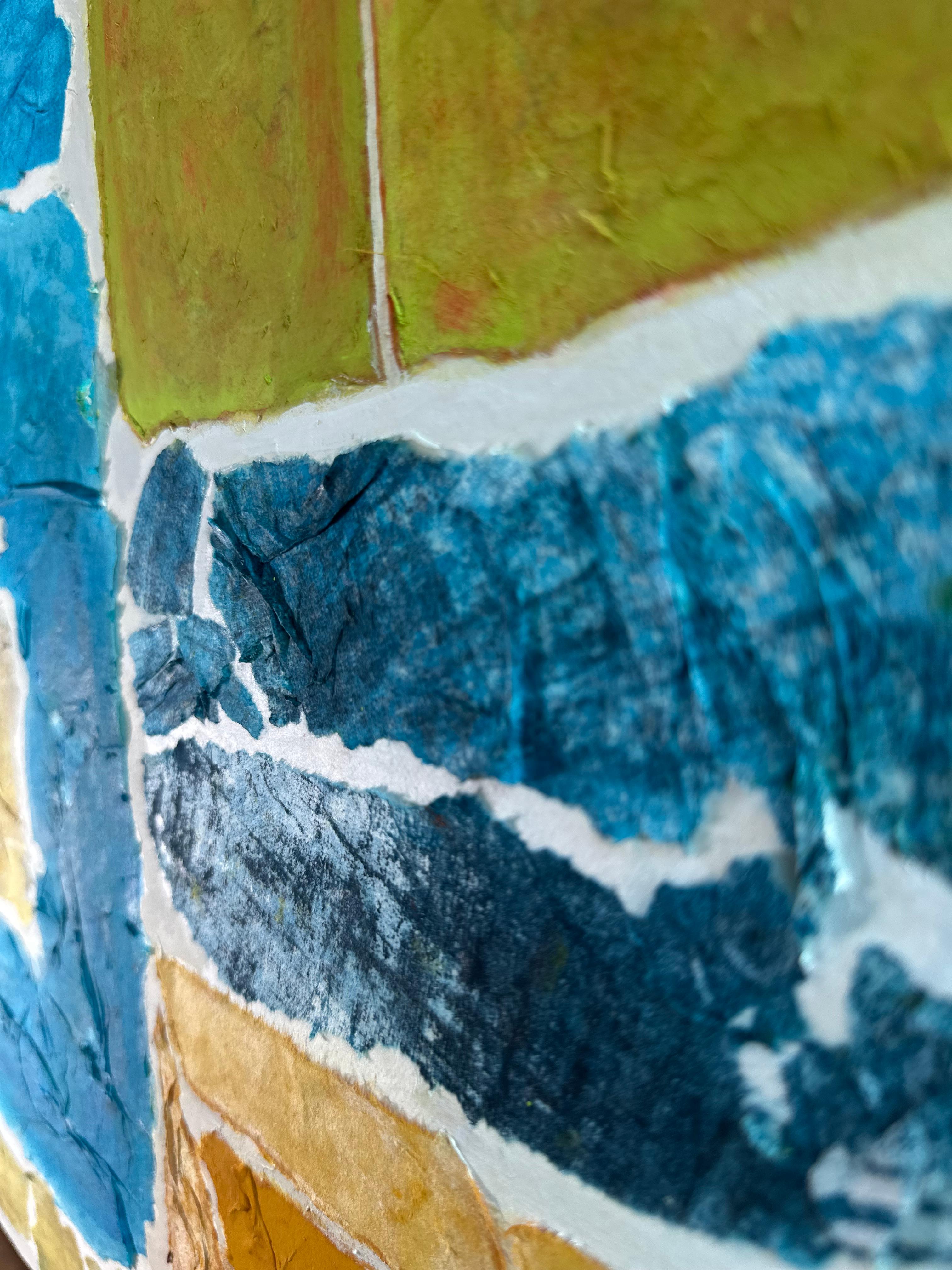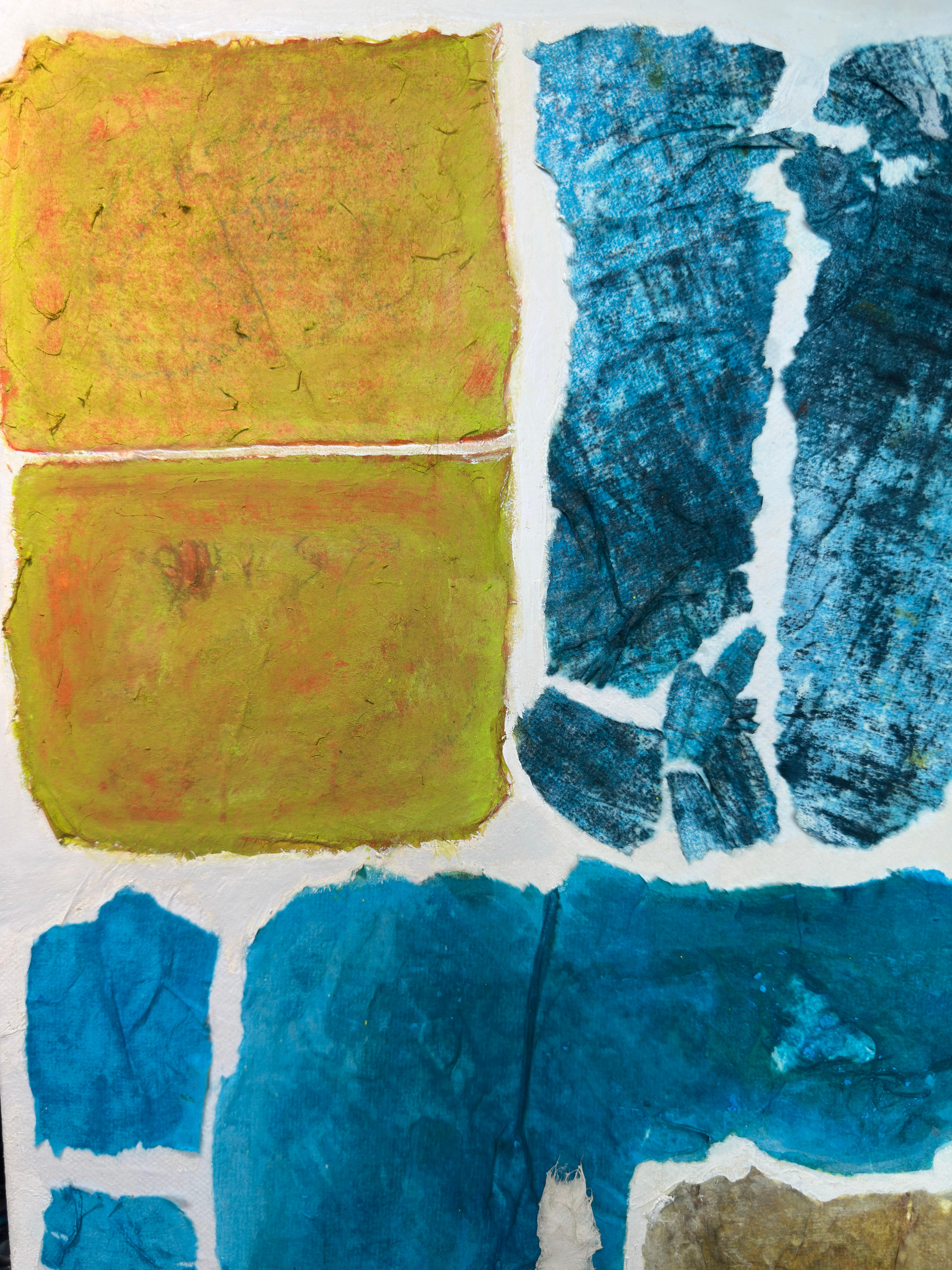 This work operates through material resistance rather than compositional mastery. When torn, hanji determines its own fracture lines—edges emerge as the fiber's autonomous response to tension. Cerulean and turquoise saturate the lower register while cadmium yellow, yellow ochre, and burnt sienna fragment across the upper zone. These are not arranged but deposited through sequential staining and removal. Pigment migrates unevenly into varying paper densities, creating topographical variance—pooling, ridging, cracking. What remains is stratigraphic record: each layer documenting decision, material refusal, and temporal erosion. The white interstices are literal absences where paper was excised—not negative space but actual loss.