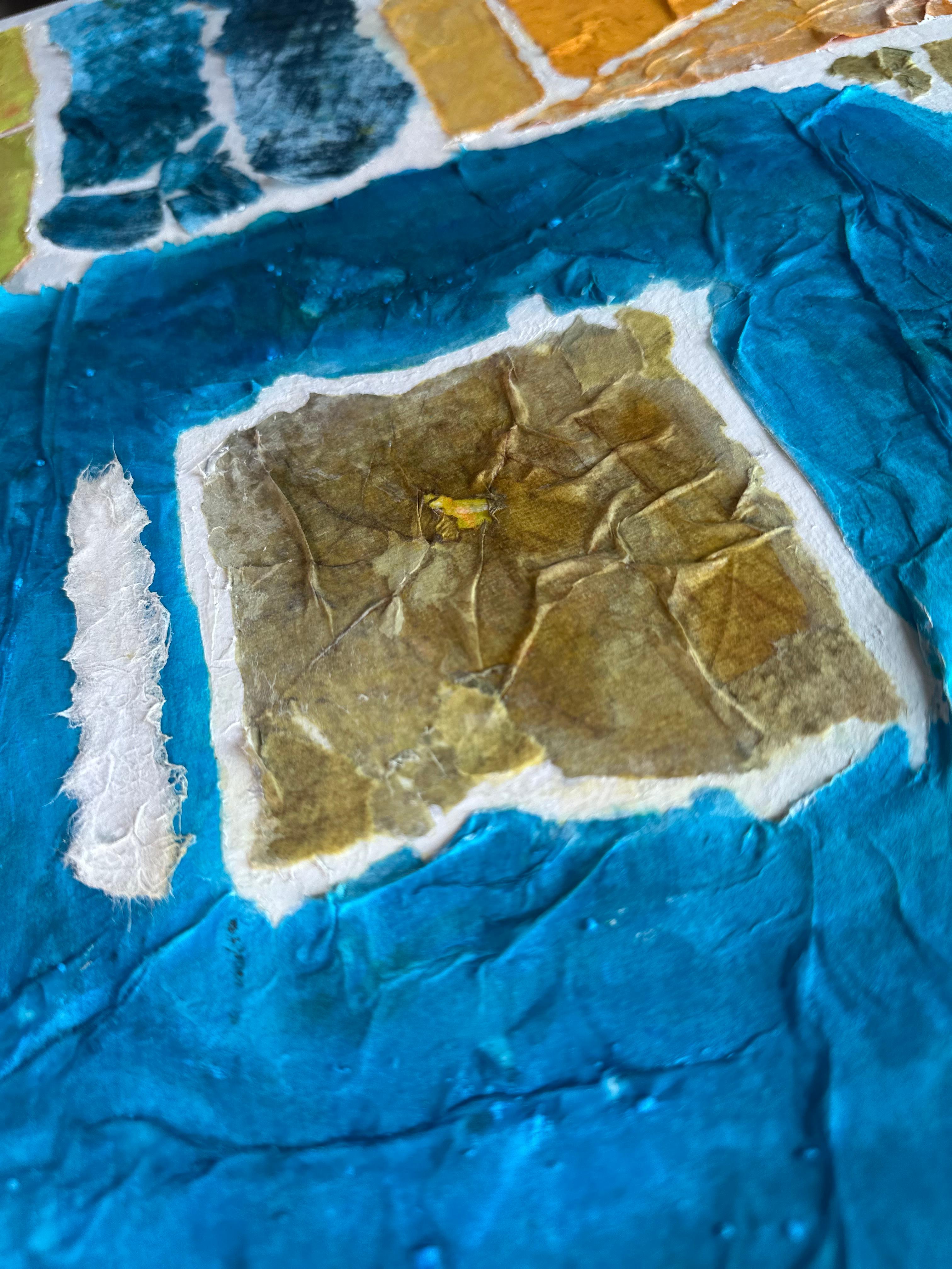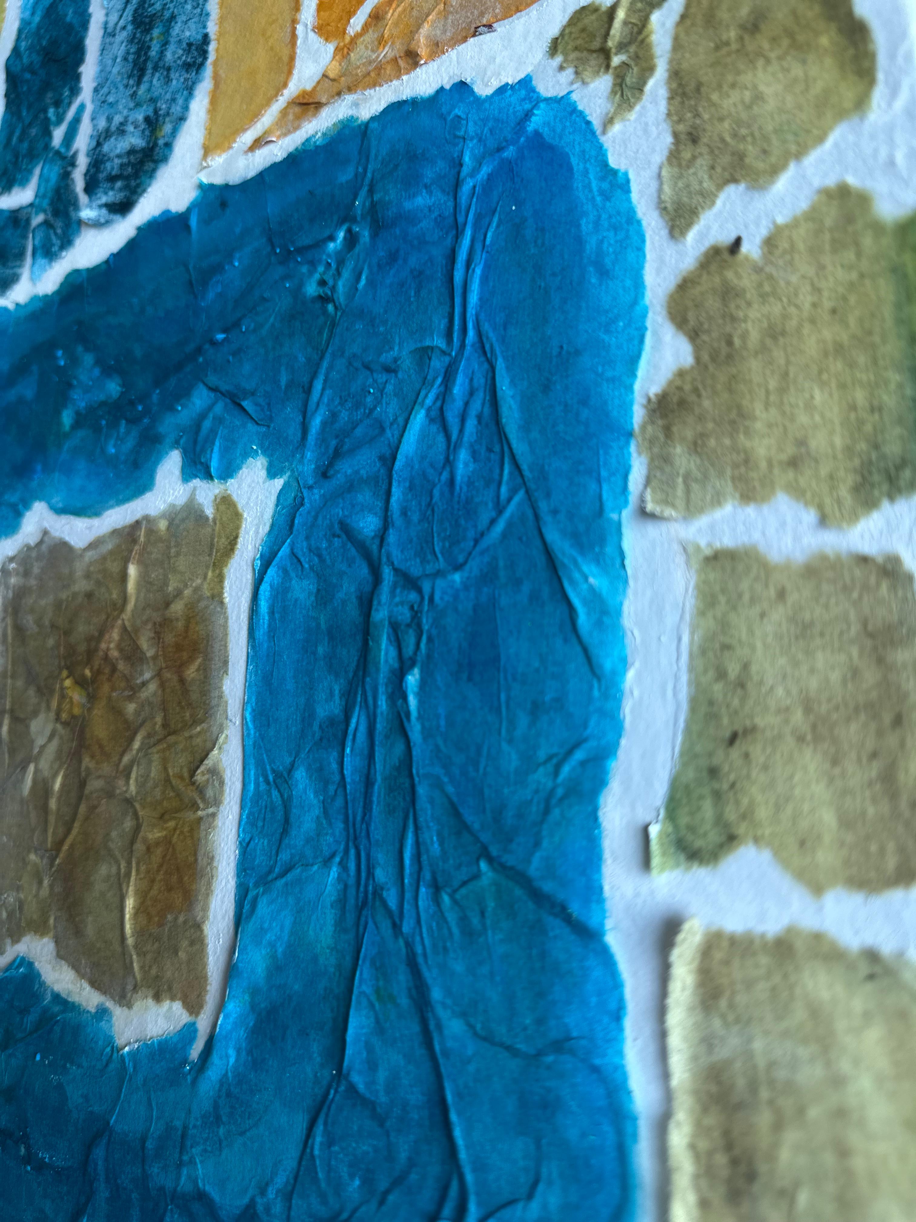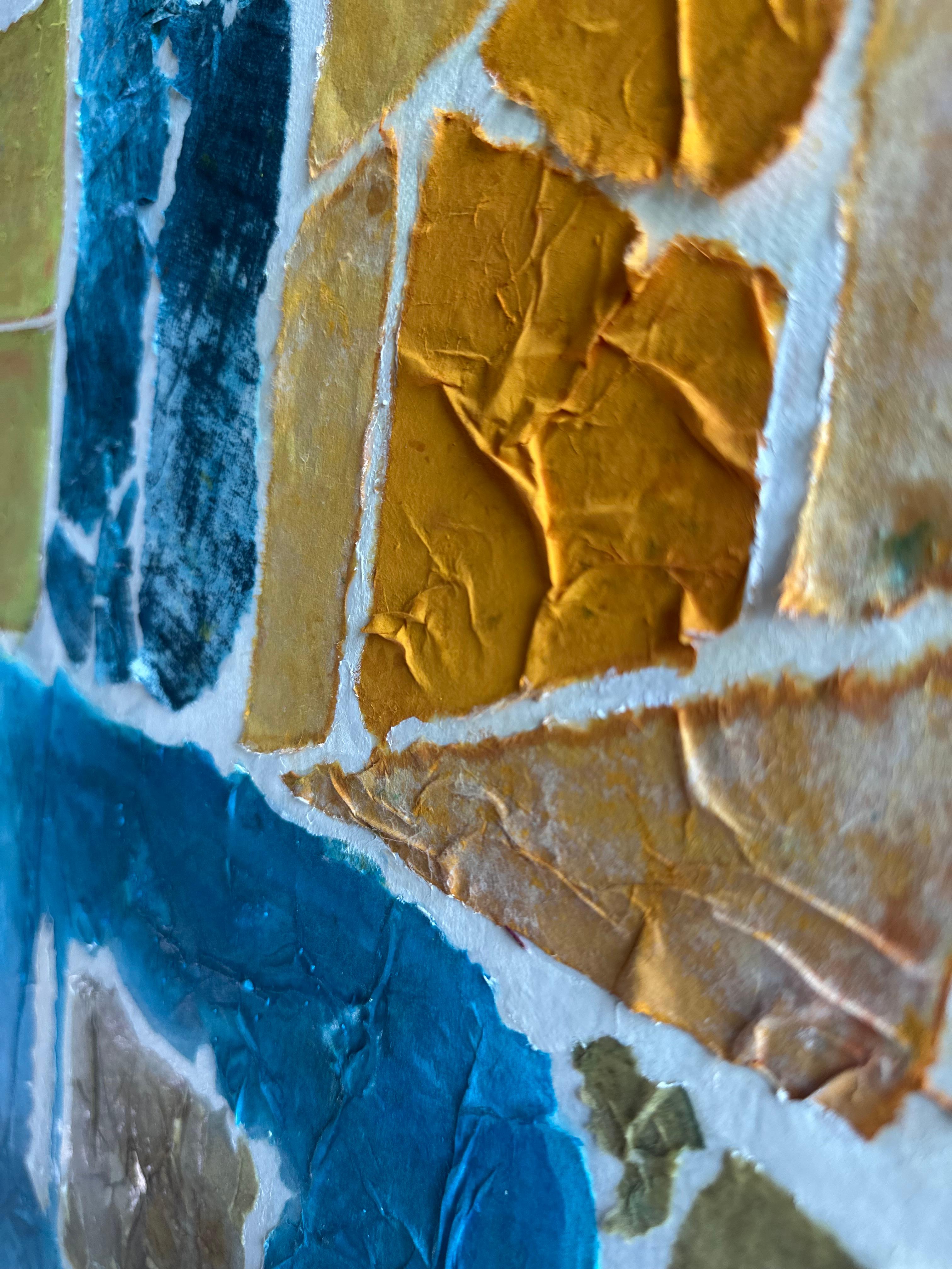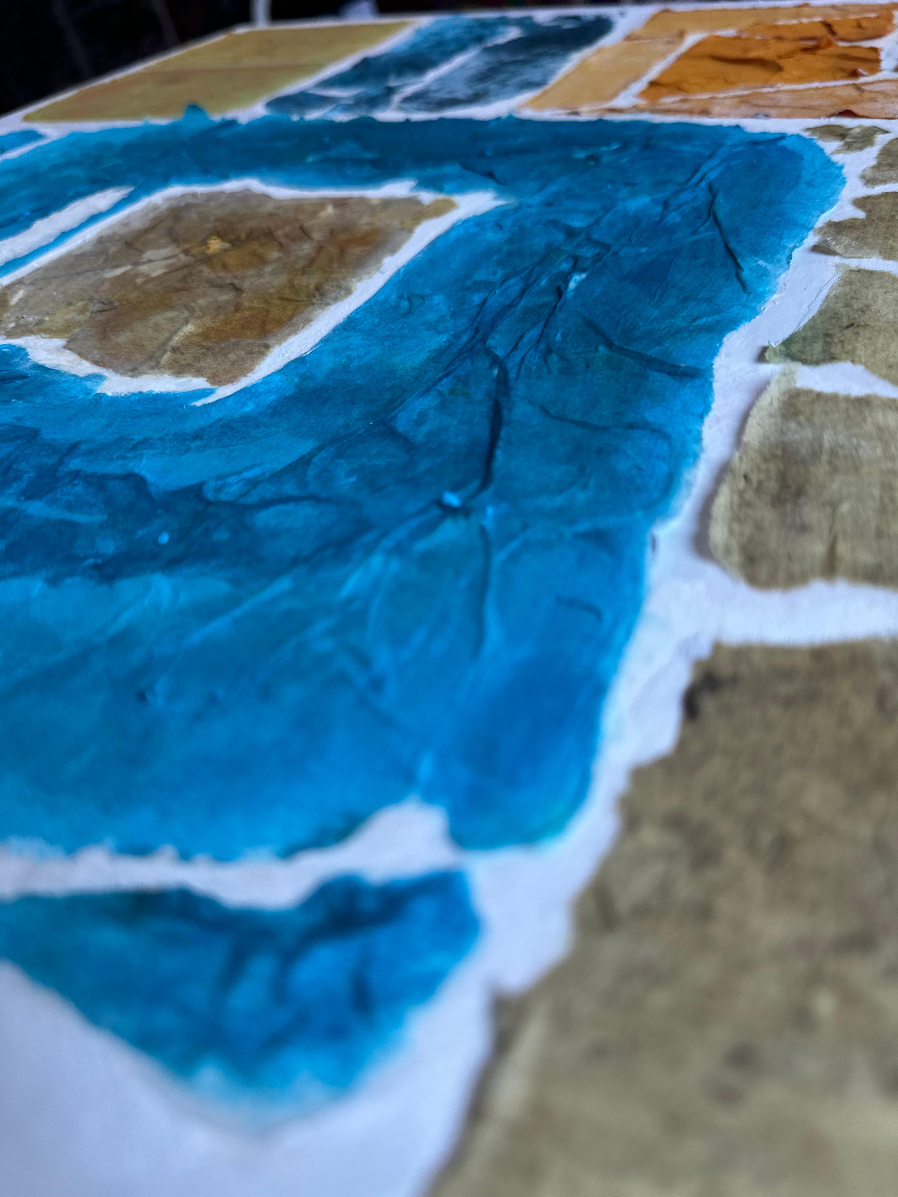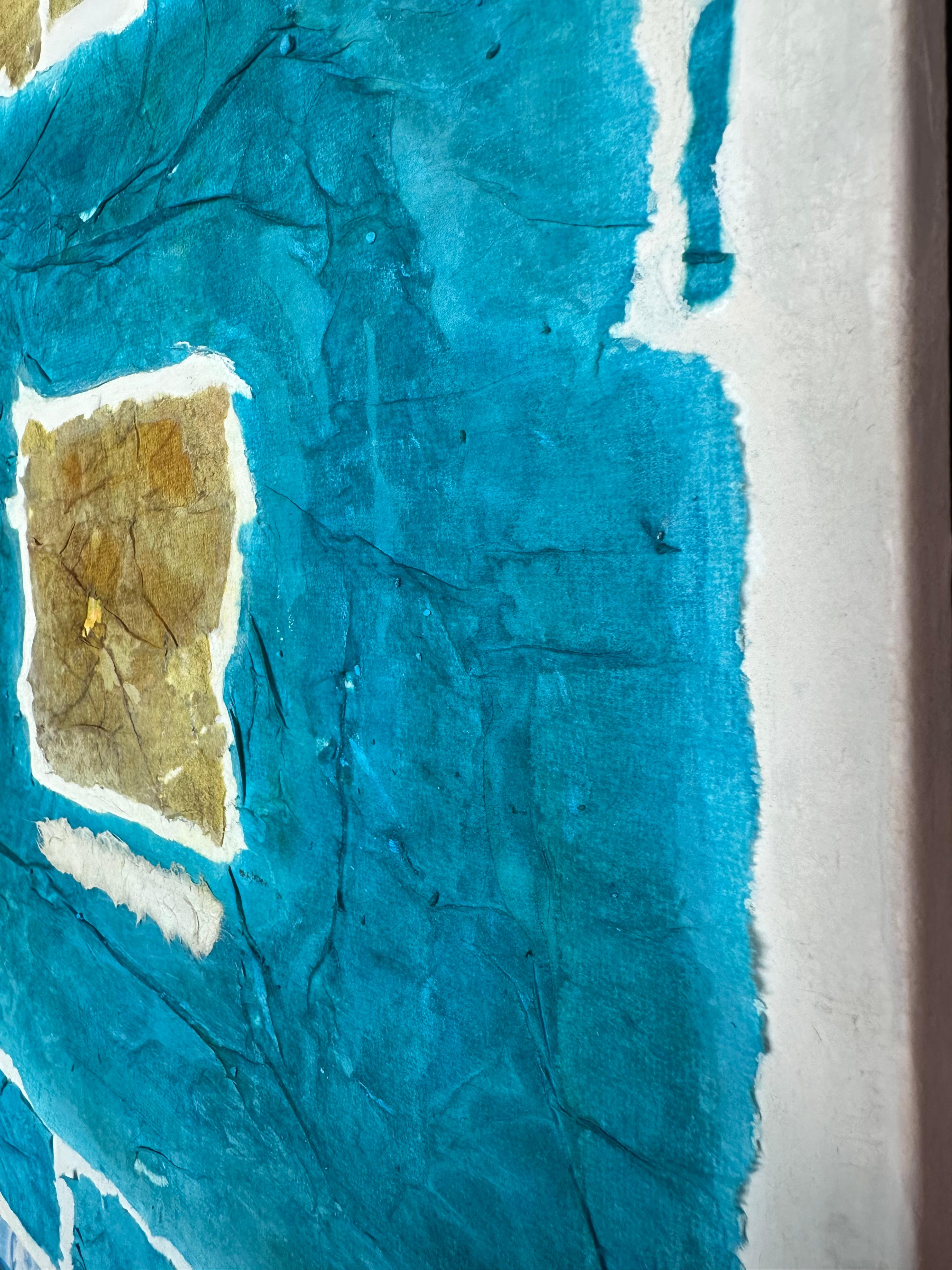 This work operates through material resistance rather than compositional mastery. When torn, hanji determines its own fracture lines—edges emerge as the fiber's autonomous response to tension. Cerulean and turquoise saturate the lower register while cadmium yellow, yellow ochre, and burnt sienna fragment across the upper zone. These are not arranged but deposited through sequential staining and removal. Pigment migrates unevenly into varying paper densities, creating topographical variance—pooling, ridging, cracking. What remains is stratigraphic record: each layer documenting decision, material refusal, and temporal erosion. The white interstices are literal absences where paper was excised—not negative space but actual loss.