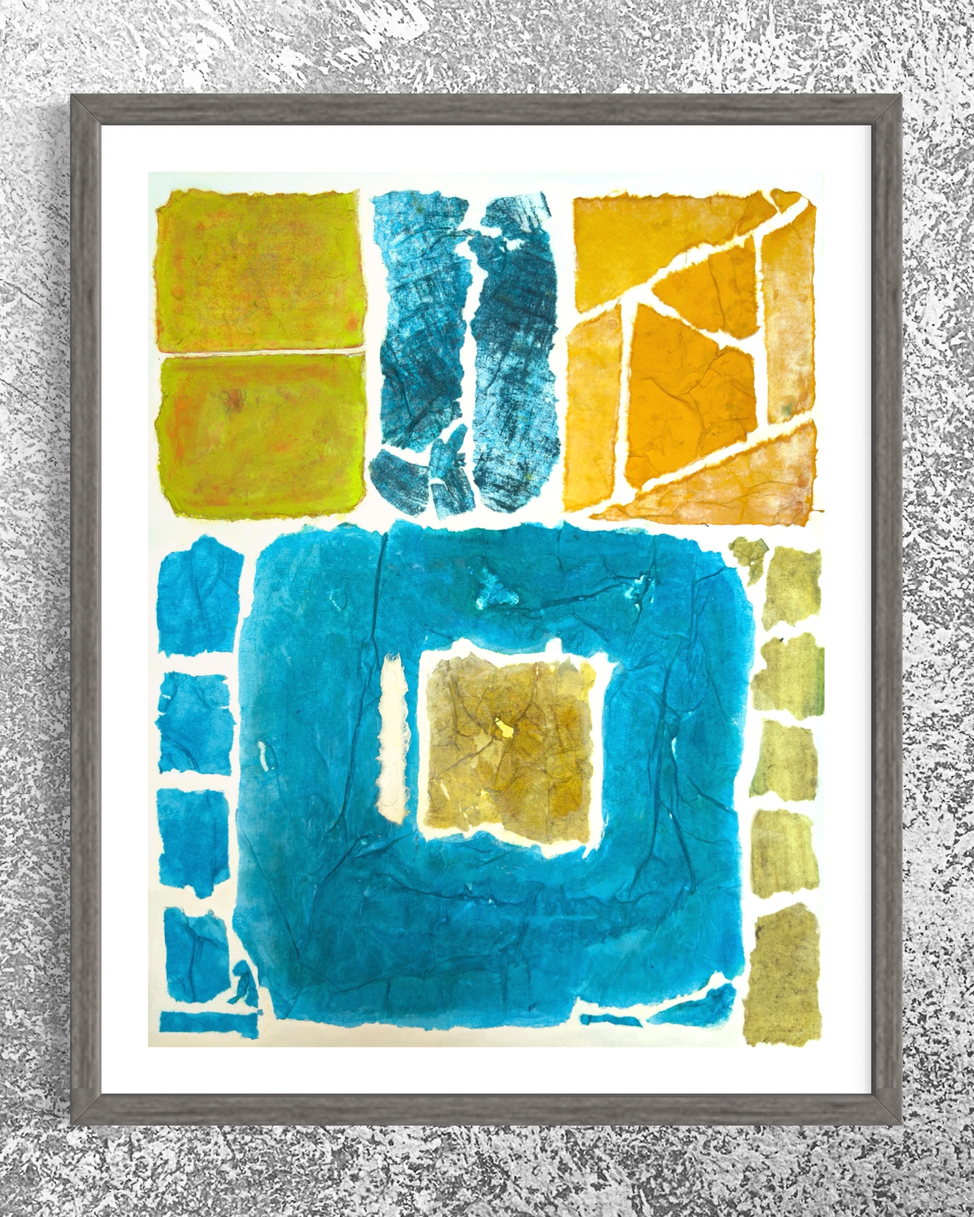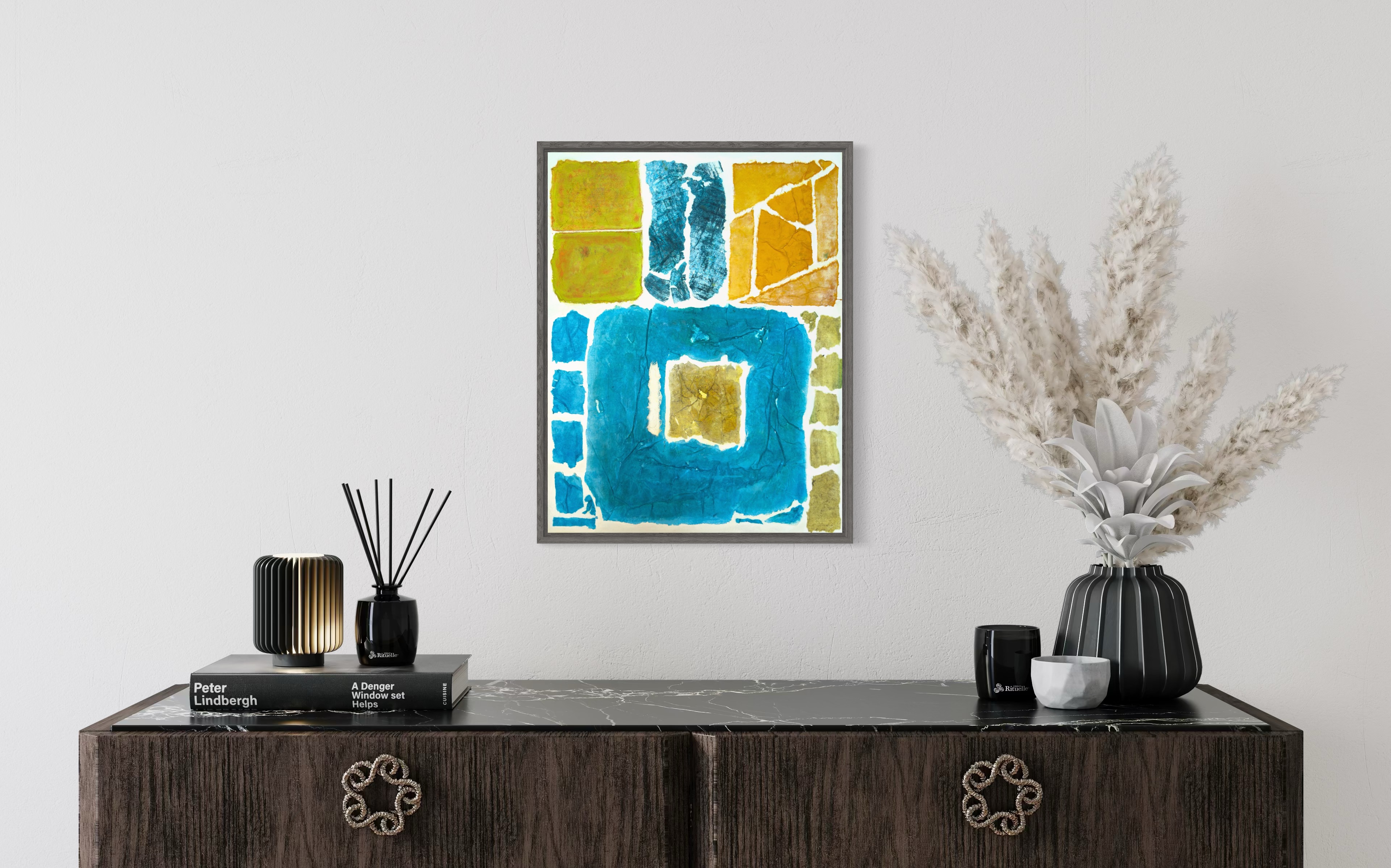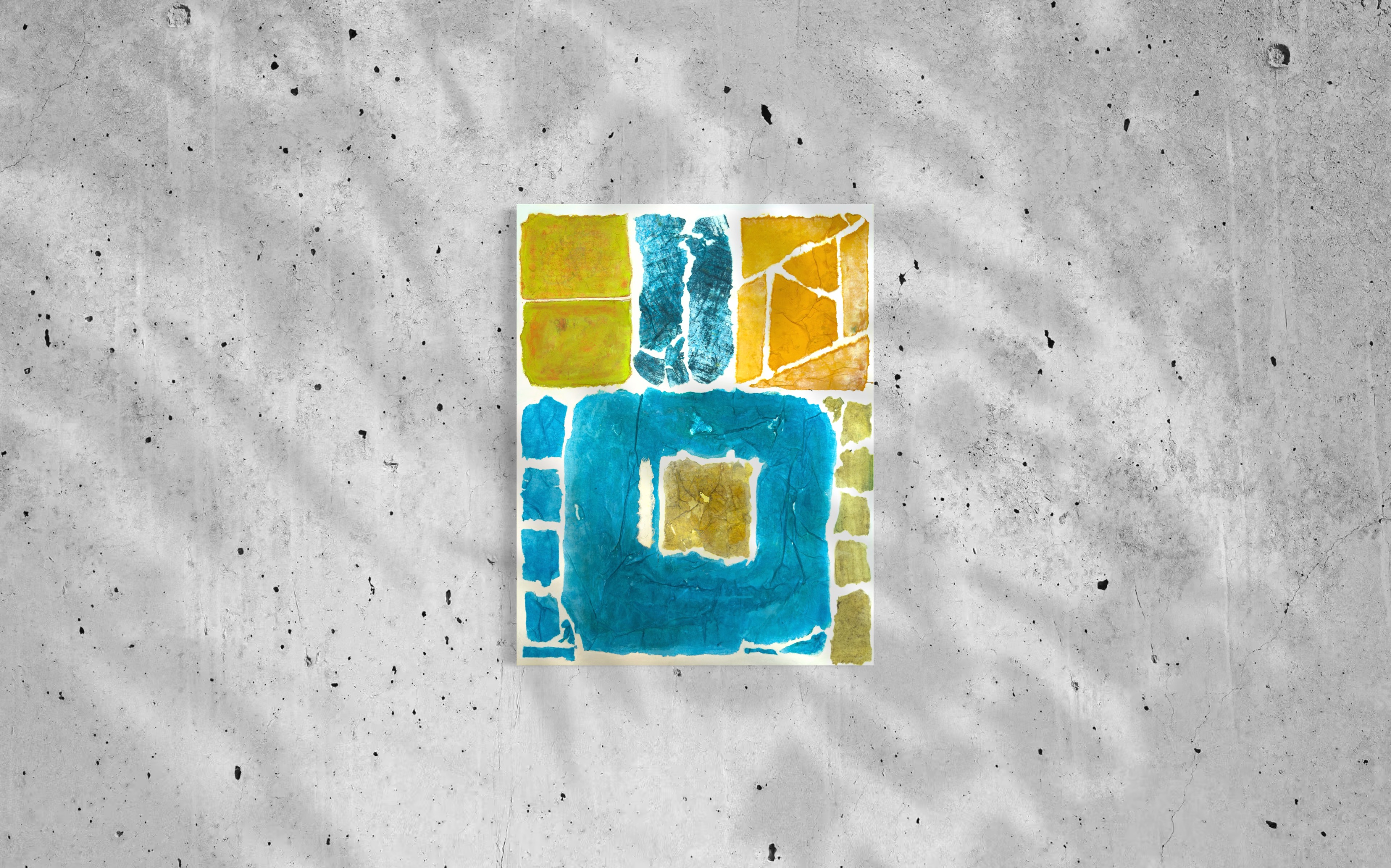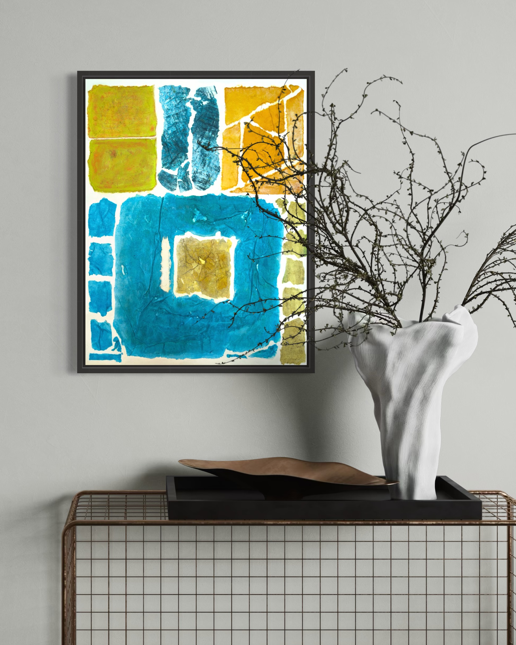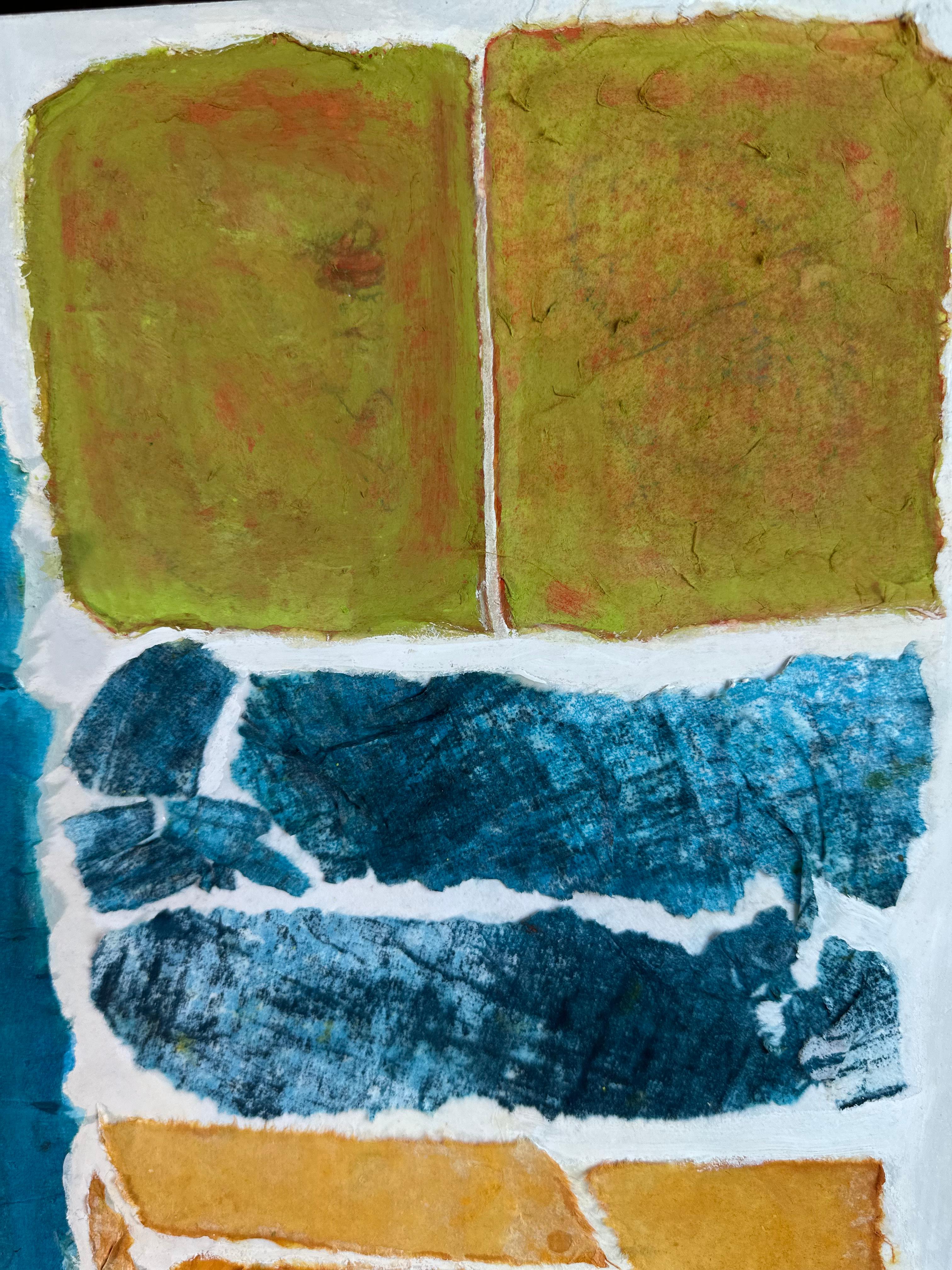 This work operates through material resistance rather than compositional mastery. When torn, hanji determines its own fracture lines—edges emerge as the fiber's autonomous response to tension. Cerulean and turquoise saturate the lower register while cadmium yellow, yellow ochre, and burnt sienna fragment across the upper zone. These are not arranged but deposited through sequential staining and removal. Pigment migrates unevenly into varying paper densities, creating topographical variance—pooling, ridging, cracking. What remains is stratigraphic record: each layer documenting decision, material refusal, and temporal erosion. The white interstices are literal absences where paper was excised—not negative space but actual loss.