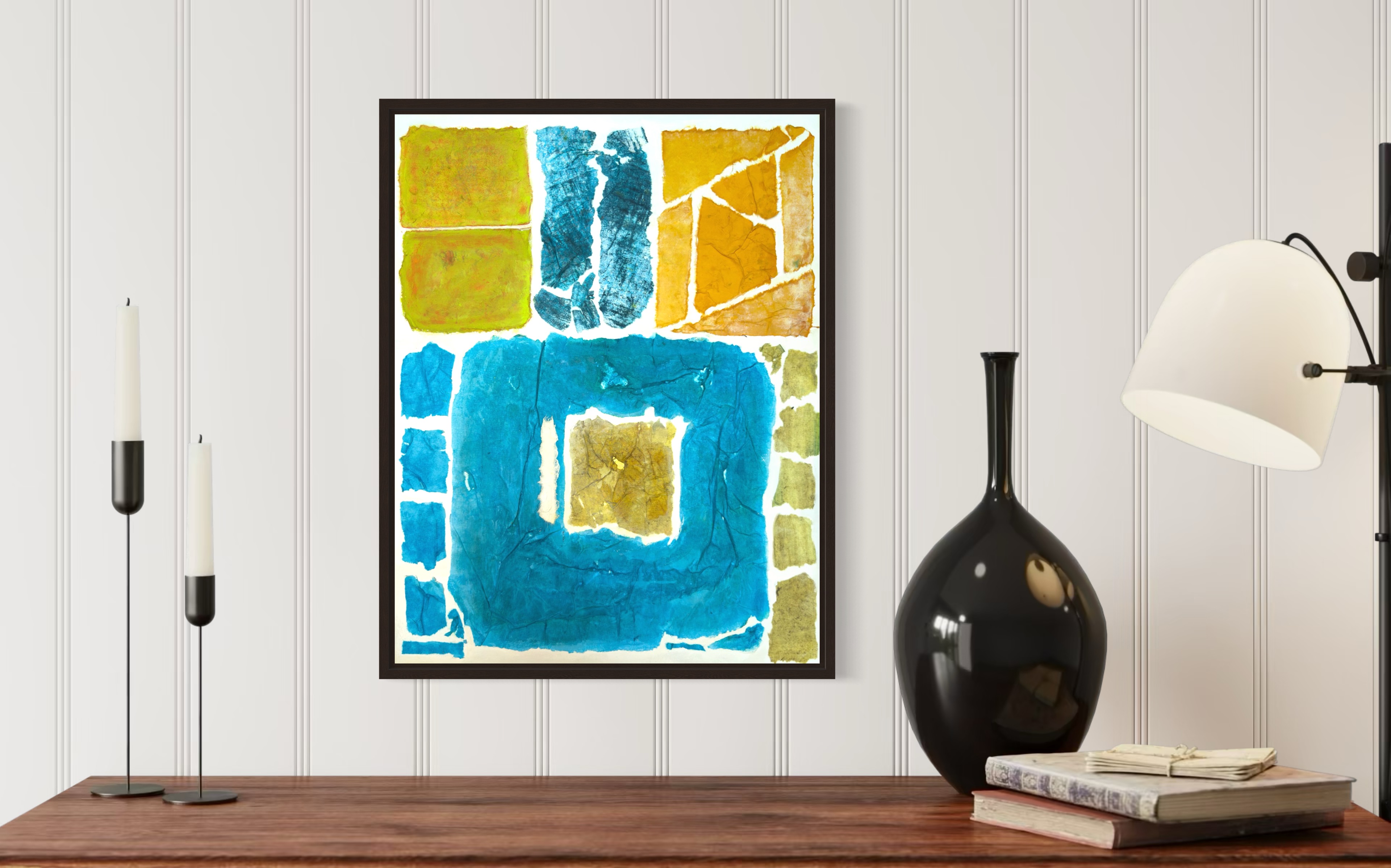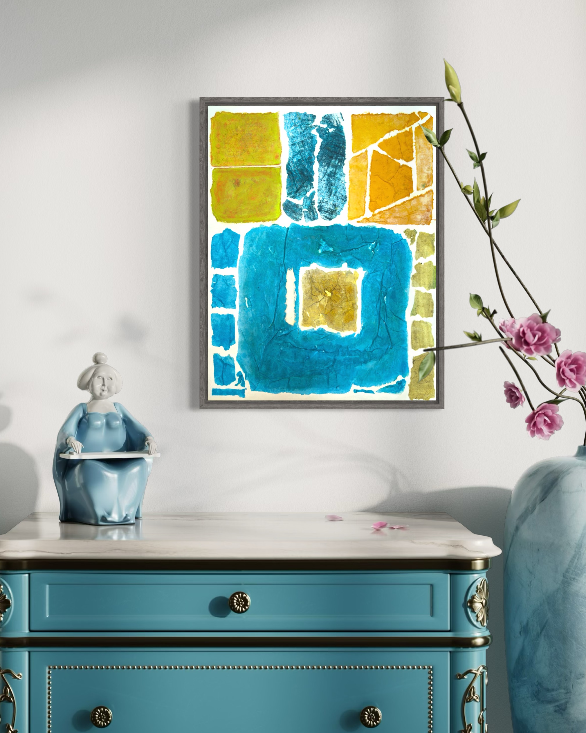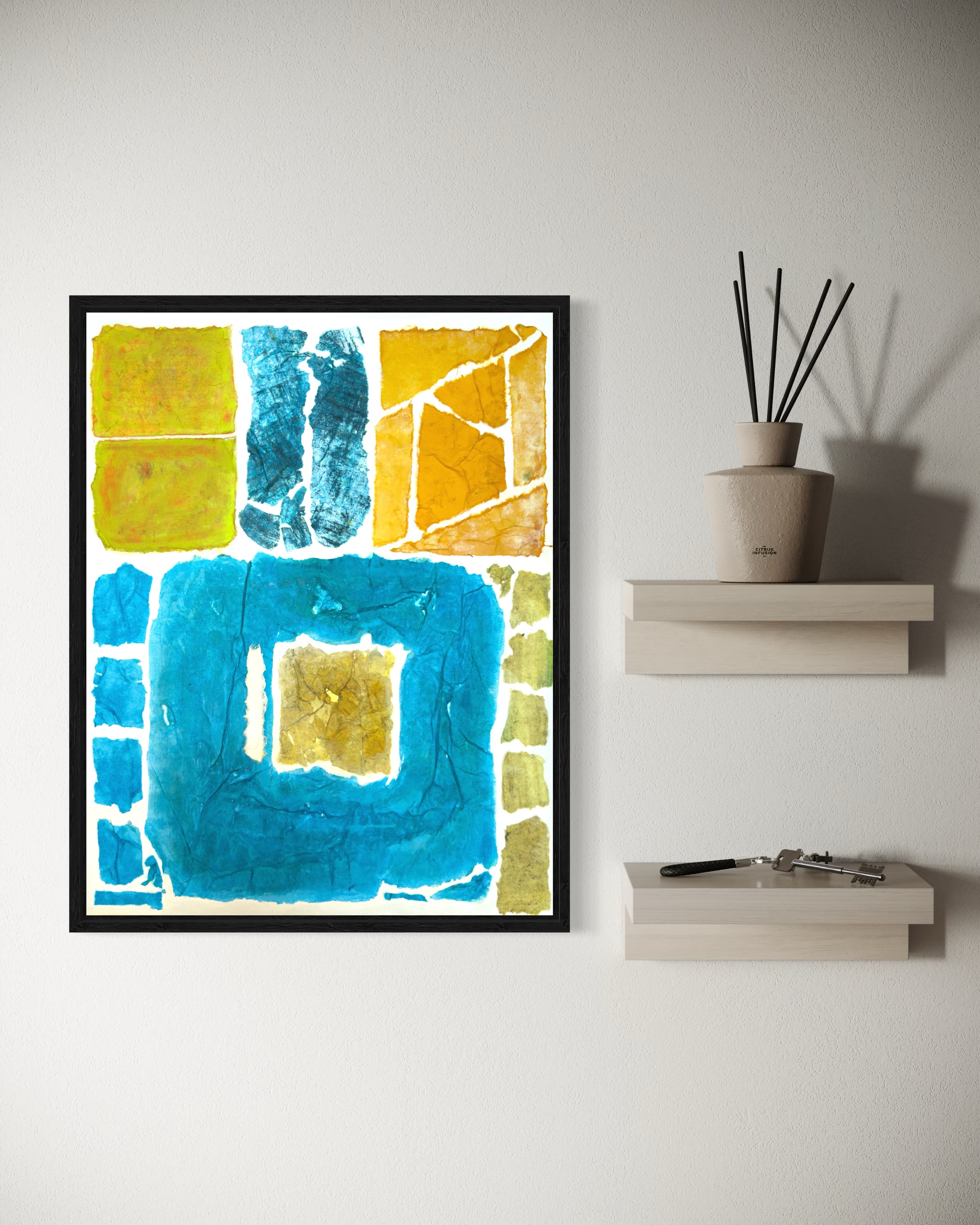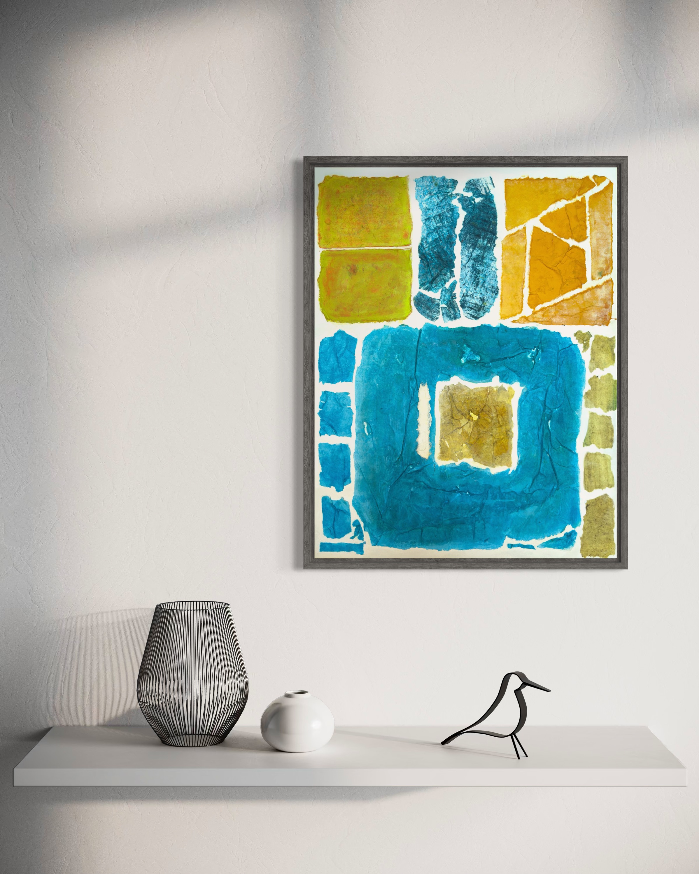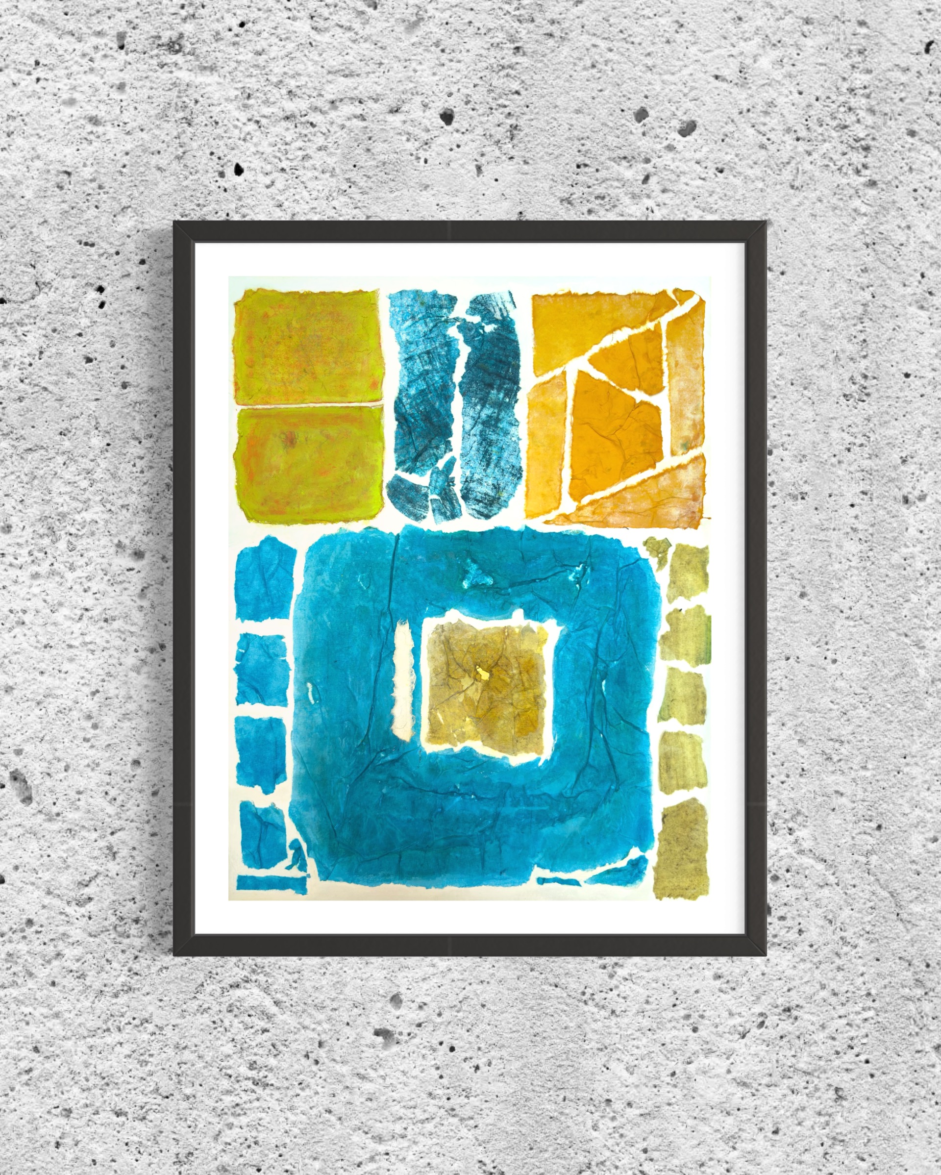 This work operates through material resistance rather than compositional mastery. When torn, hanji determines its own fracture lines—edges emerge as the fiber's autonomous response to tension. Cerulean and turquoise saturate the lower register while cadmium yellow, yellow ochre, and burnt sienna fragment across the upper zone. These are not arranged but deposited through sequential staining and removal. Pigment migrates unevenly into varying paper densities, creating topographical variance—pooling, ridging, cracking. What remains is stratigraphic record: each layer documenting decision, material refusal, and temporal erosion. The white interstices are literal absences where paper was excised—not negative space but actual loss.
