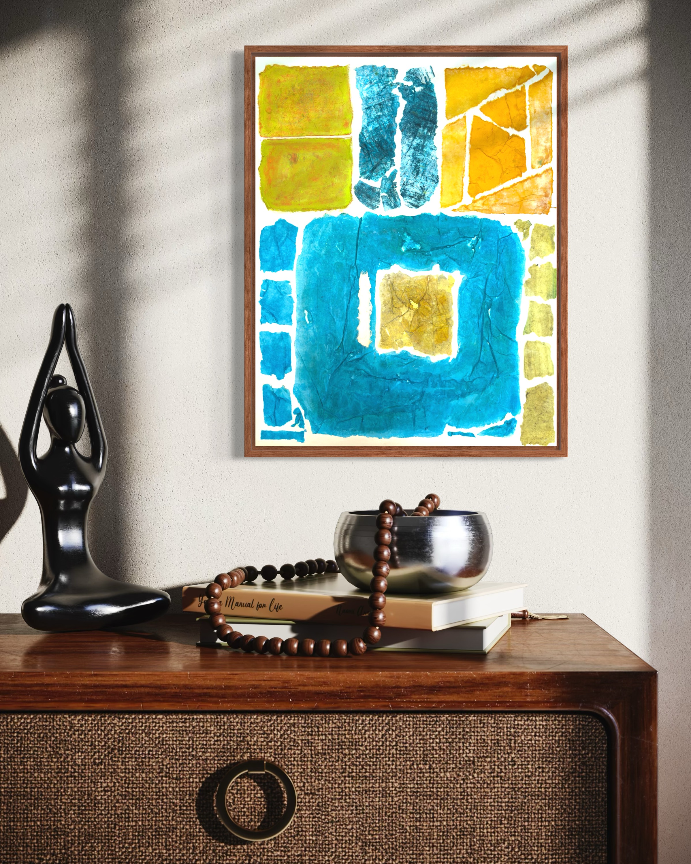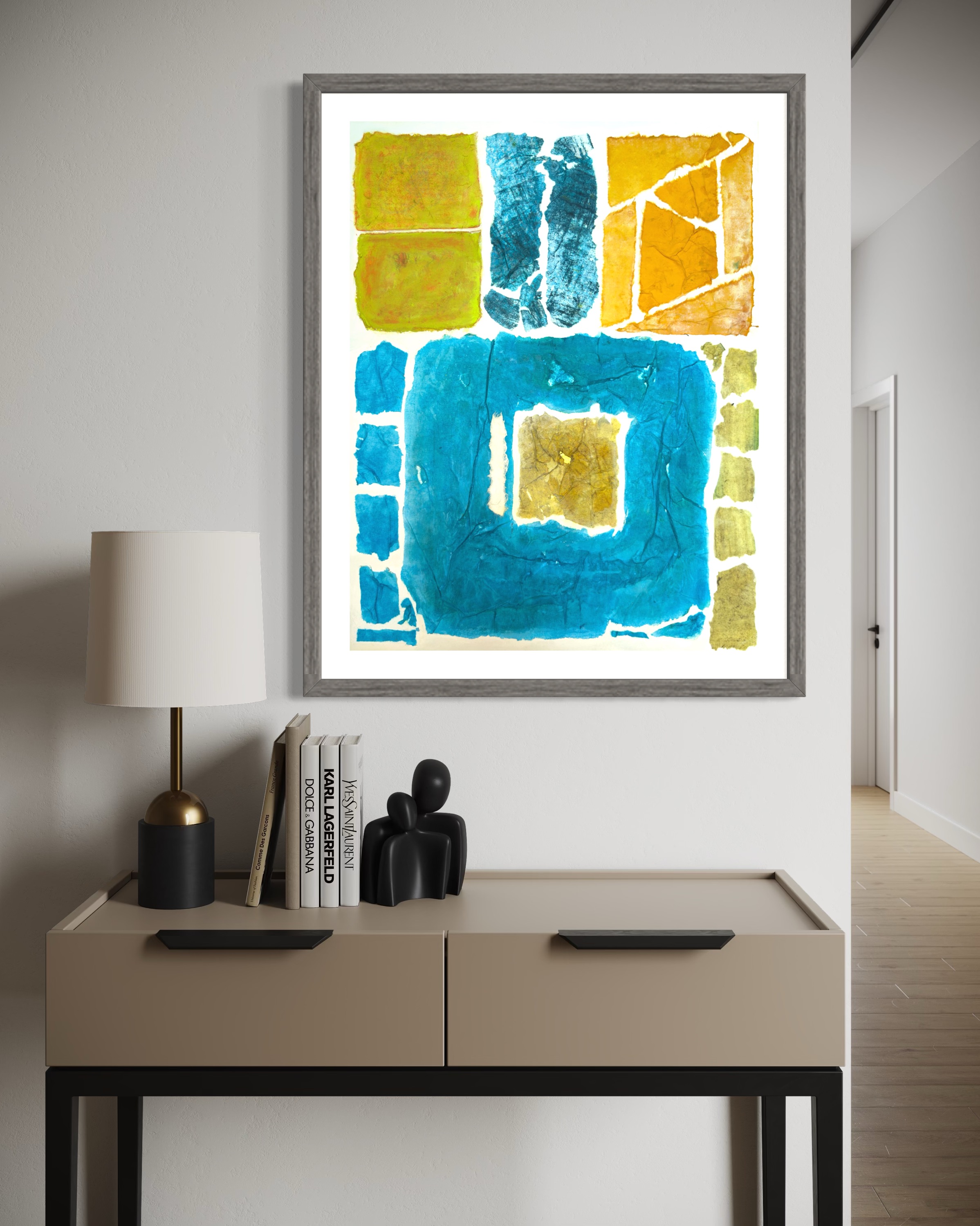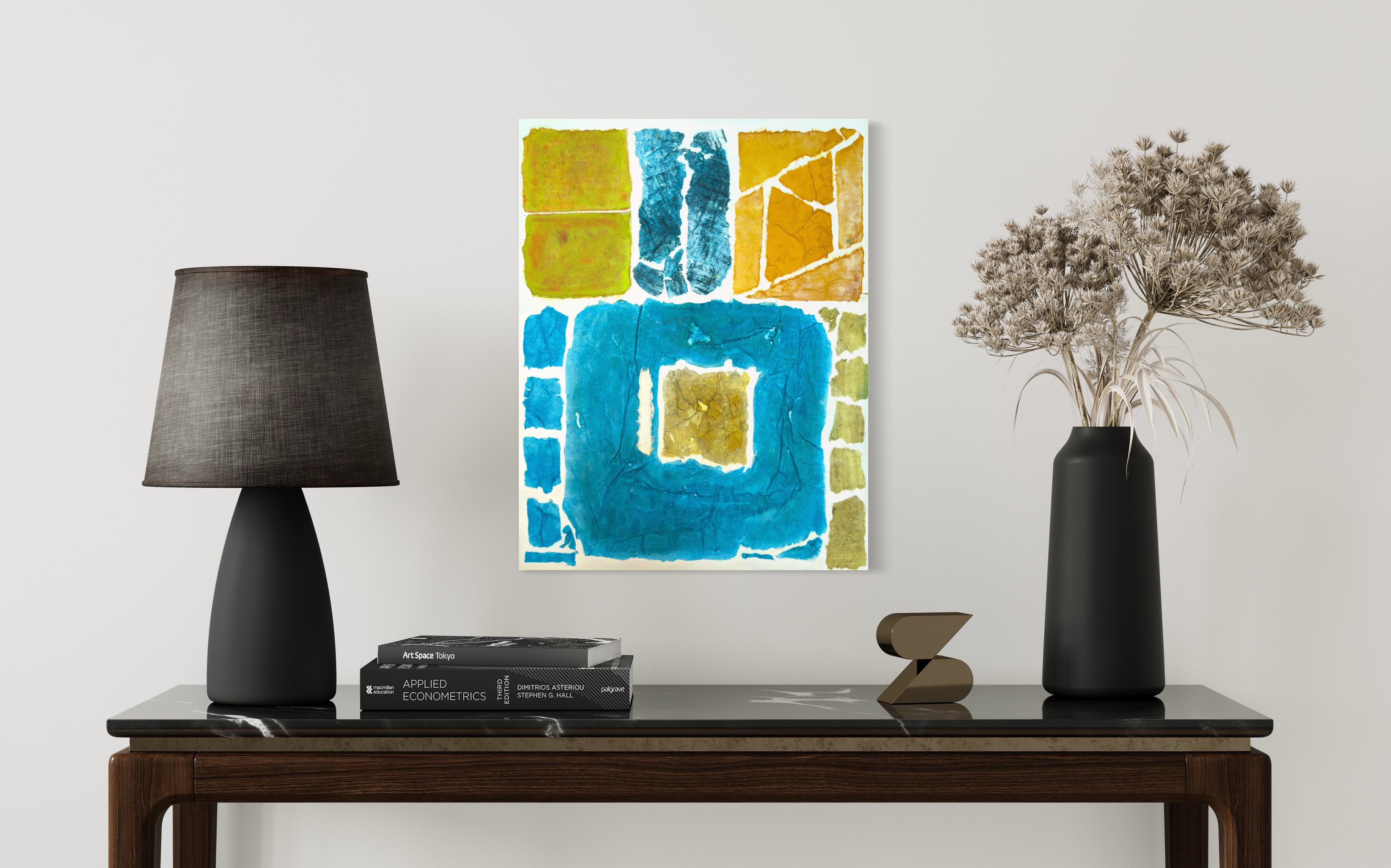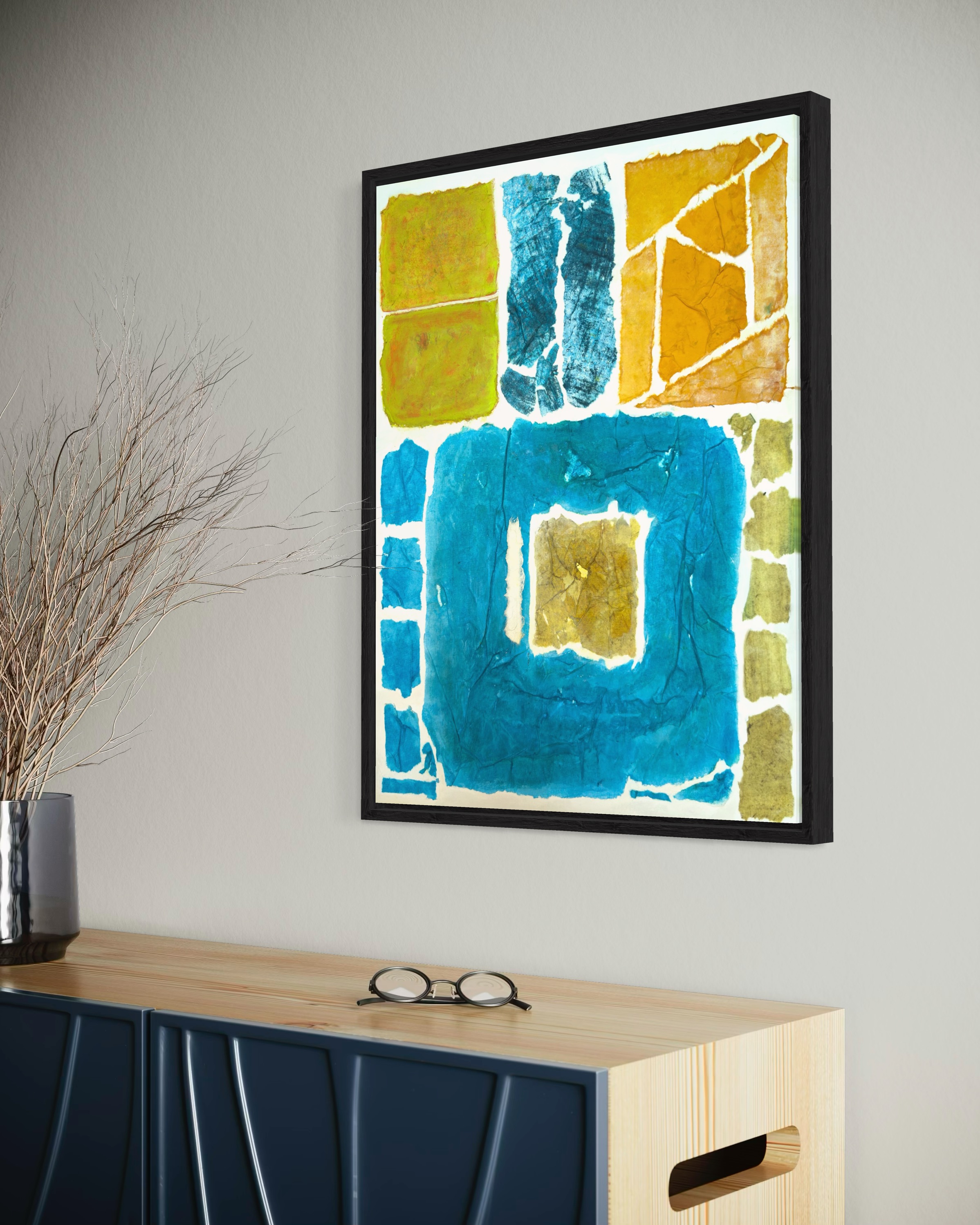 This work operates through material resistance rather than compositional mastery. When torn, hanji determines its own fracture lines—edges emerge as the fiber's autonomous response to tension. Cerulean and turquoise saturate the lower register while cadmium yellow, yellow ochre, and burnt sienna fragment across the upper zone. These are not arranged but deposited through sequential staining and removal. Pigment migrates unevenly into varying paper densities, creating topographical variance—pooling, ridging, cracking. What remains is stratigraphic record: each layer documenting decision, material refusal, and temporal erosion. The white interstices are literal absences where paper was excised—not negative space but actual loss.