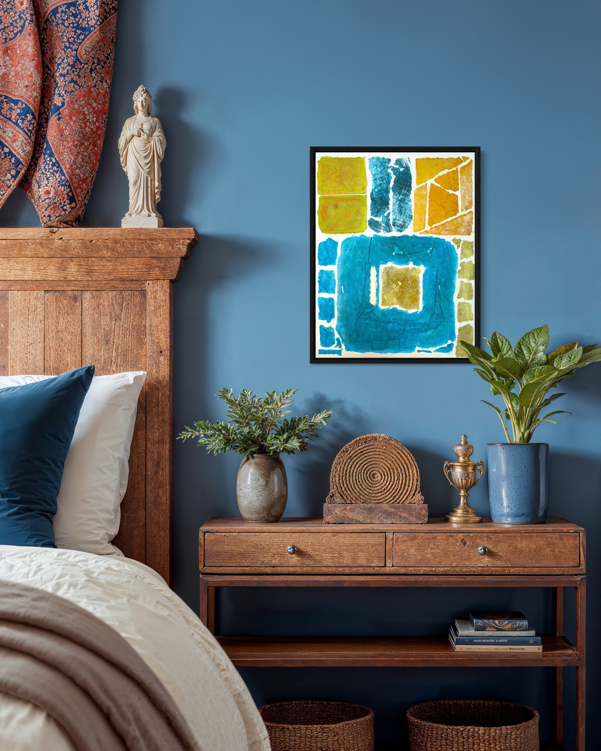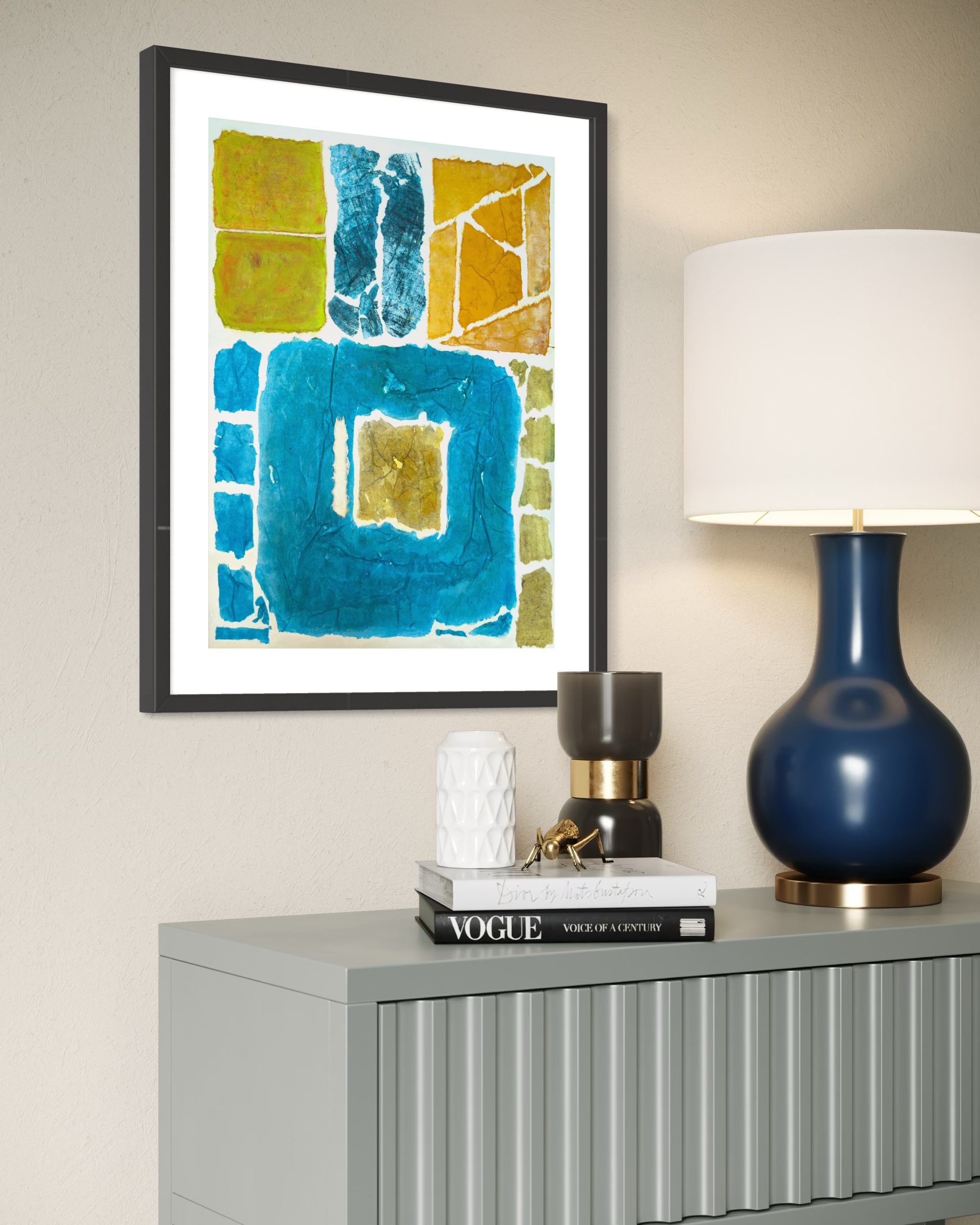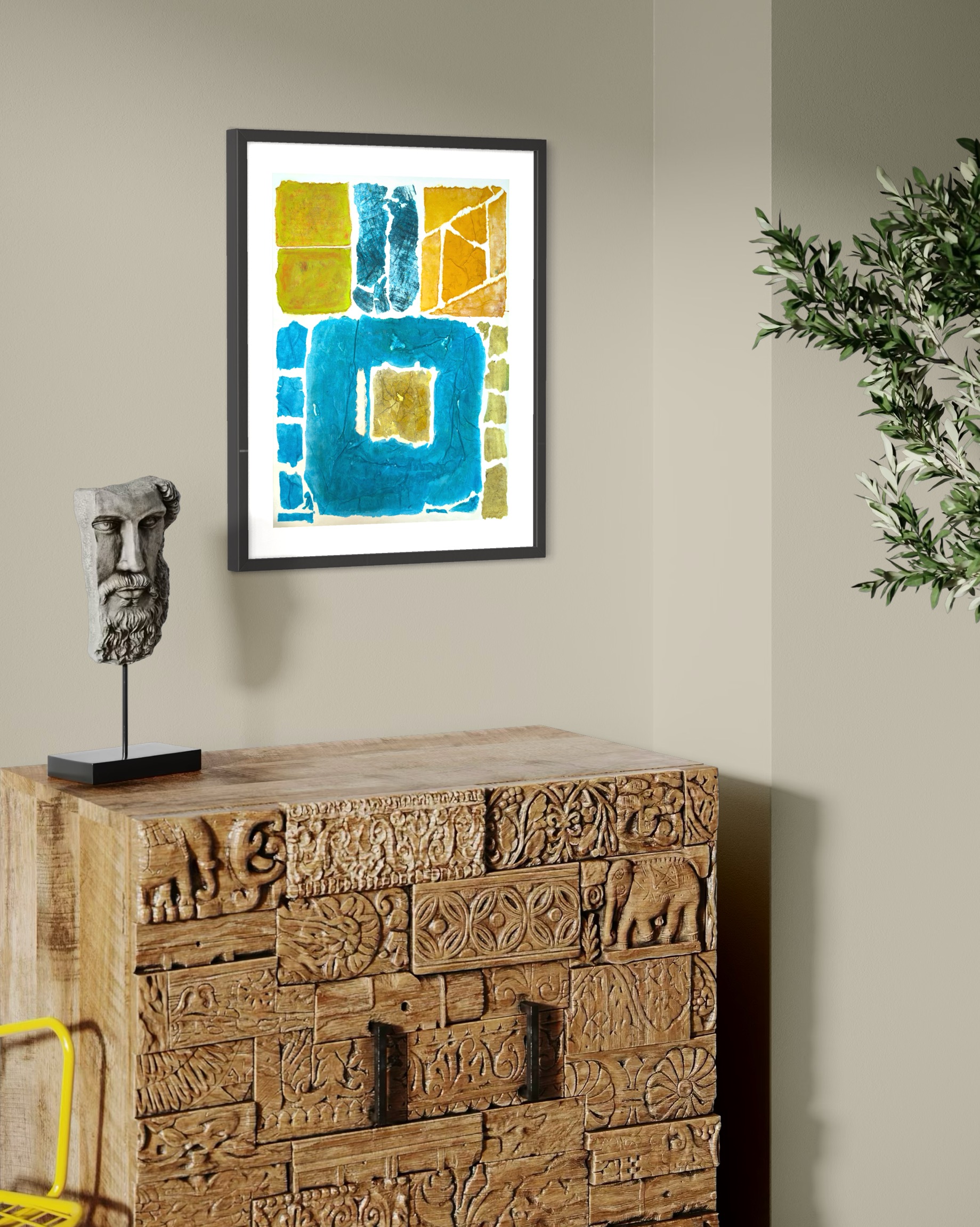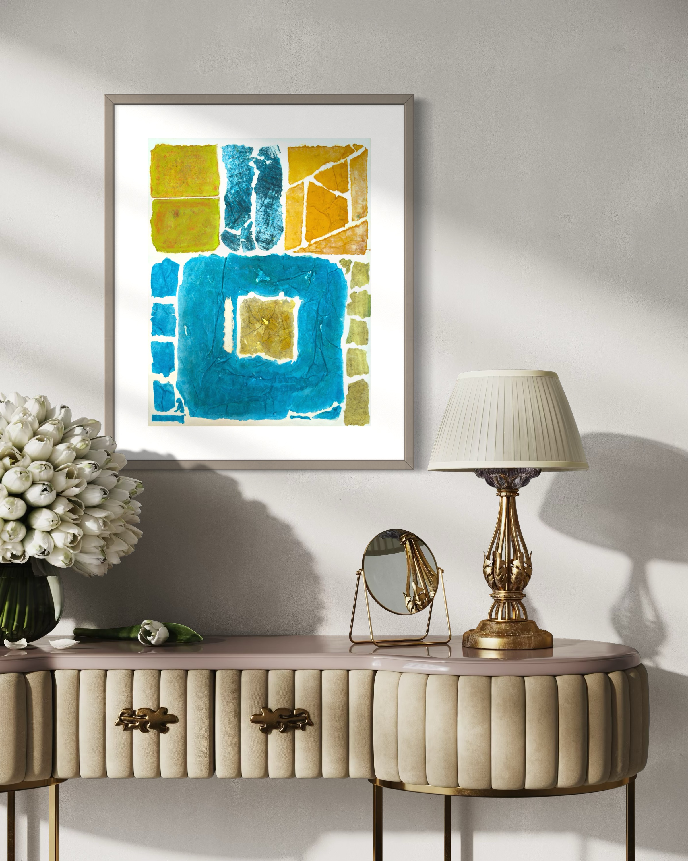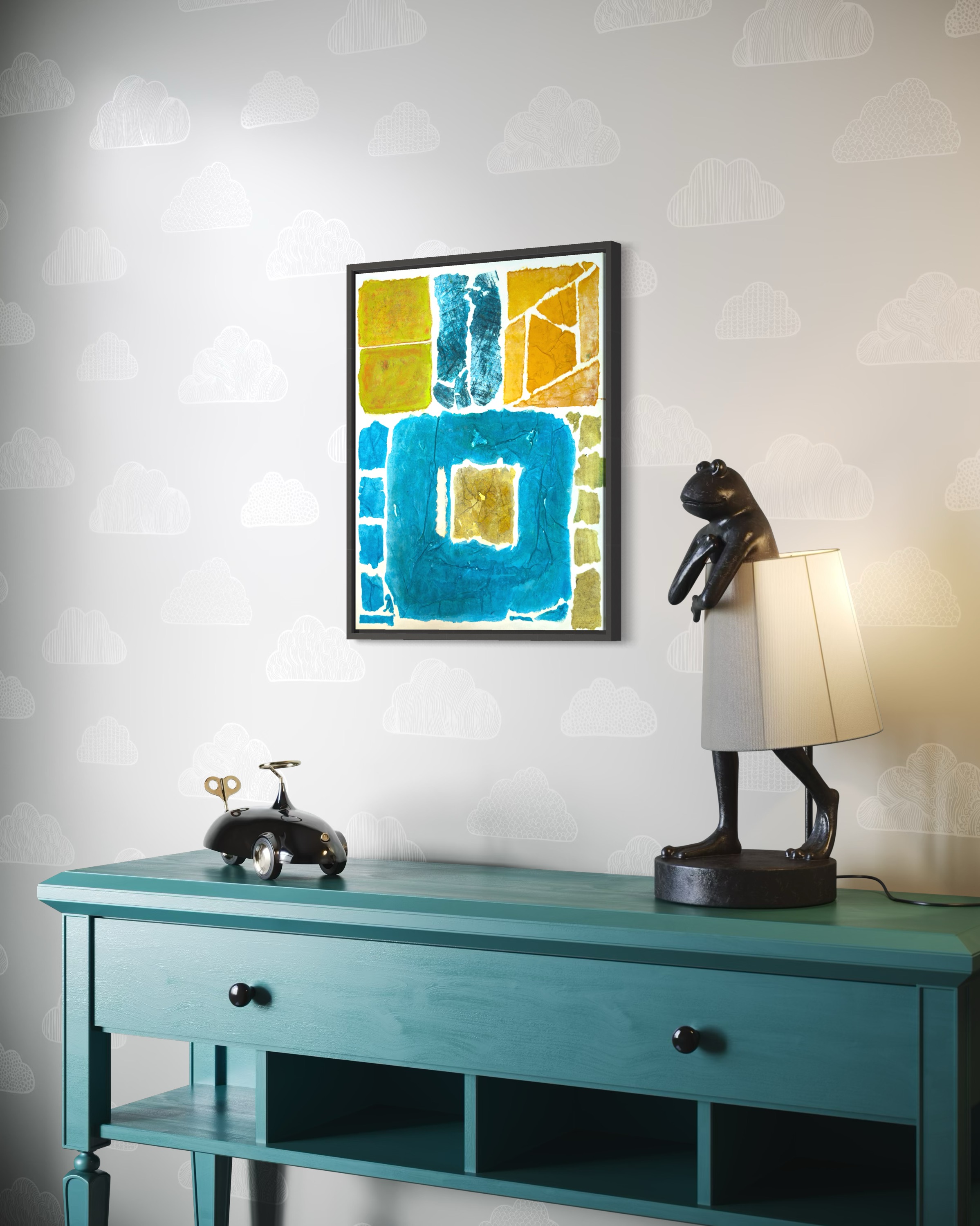 This work operates through material resistance rather than compositional mastery. When torn, hanji determines its own fracture lines—edges emerge as the fiber's autonomous response to tension. Cerulean and turquoise saturate the lower register while cadmium yellow, yellow ochre, and burnt sienna fragment across the upper zone. These are not arranged but deposited through sequential staining and removal. Pigment migrates unevenly into varying paper densities, creating topographical variance—pooling, ridging, cracking. What remains is stratigraphic record: each layer documenting decision, material refusal, and temporal erosion. The white interstices are literal absences where paper was excised—not negative space but actual loss.