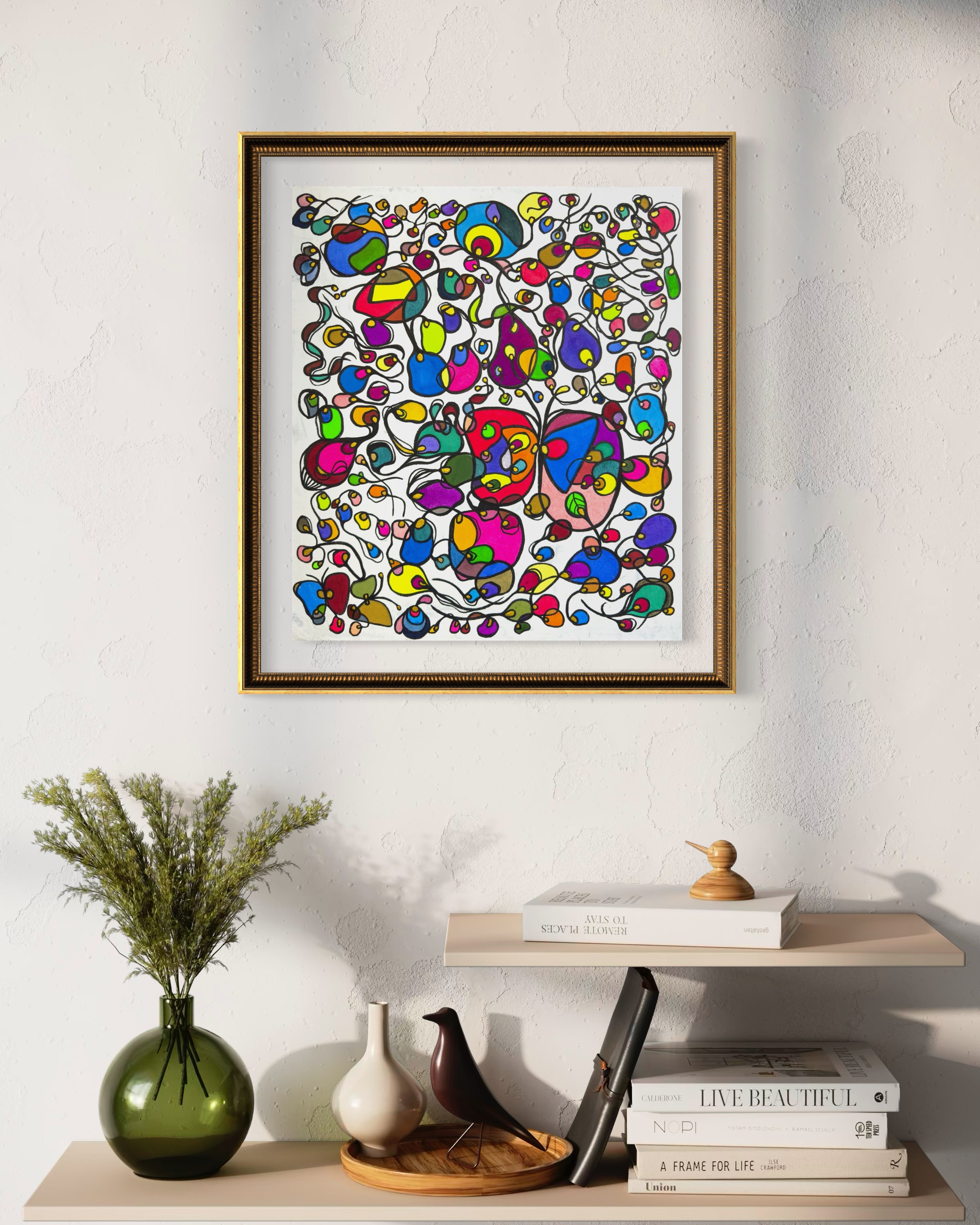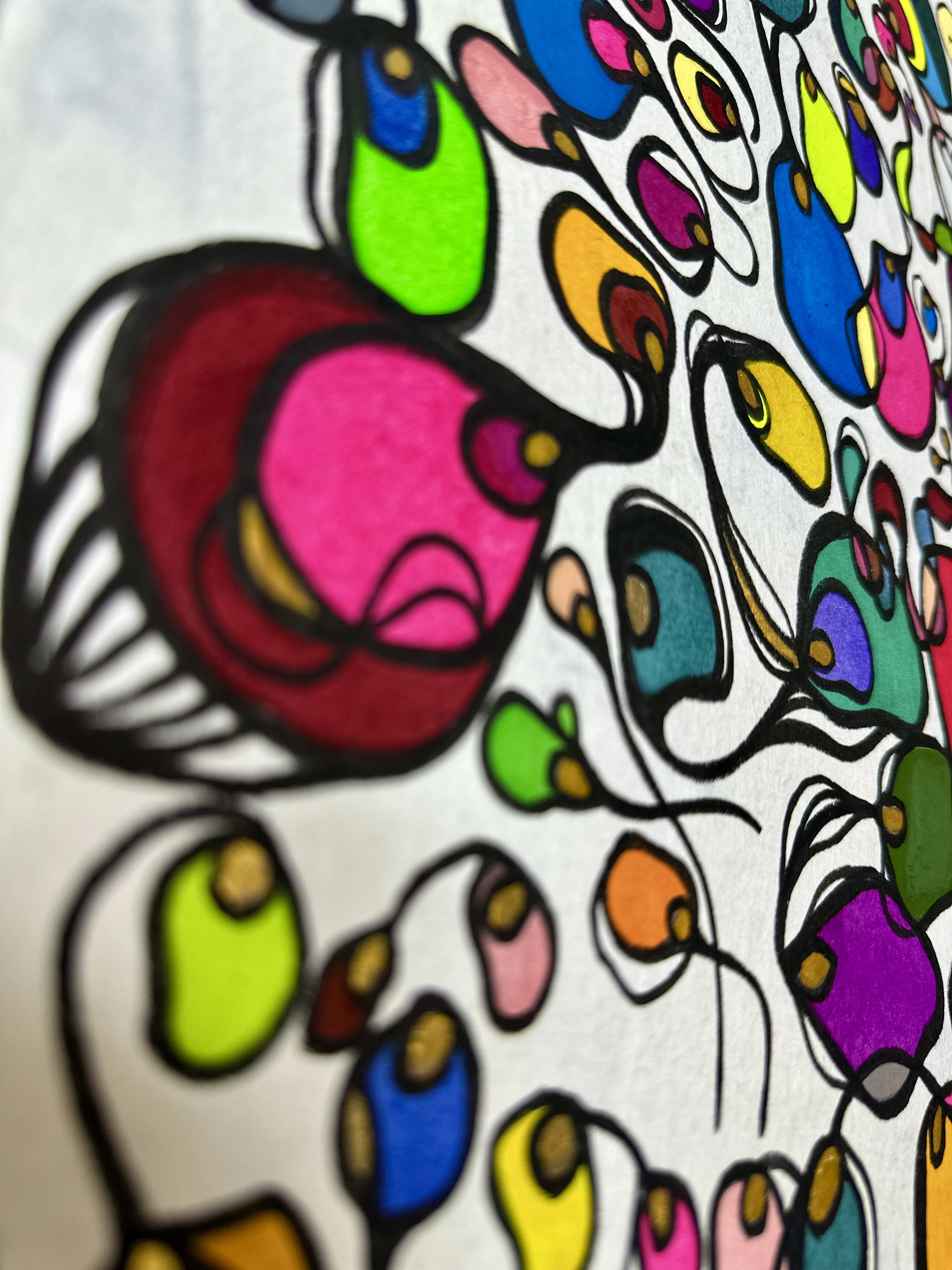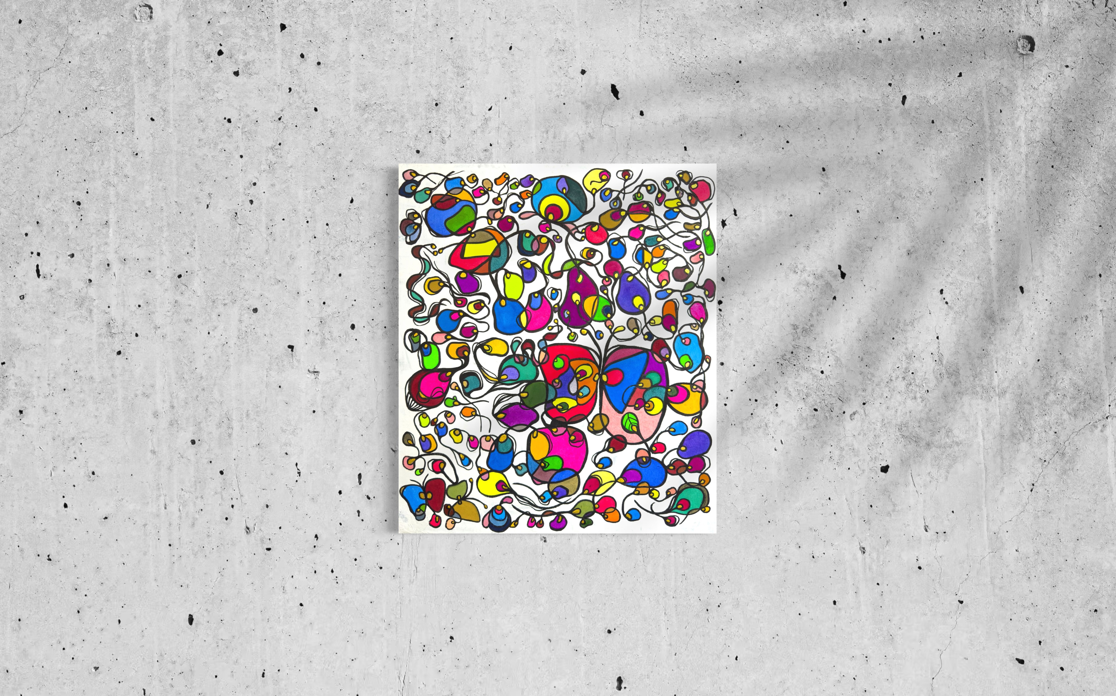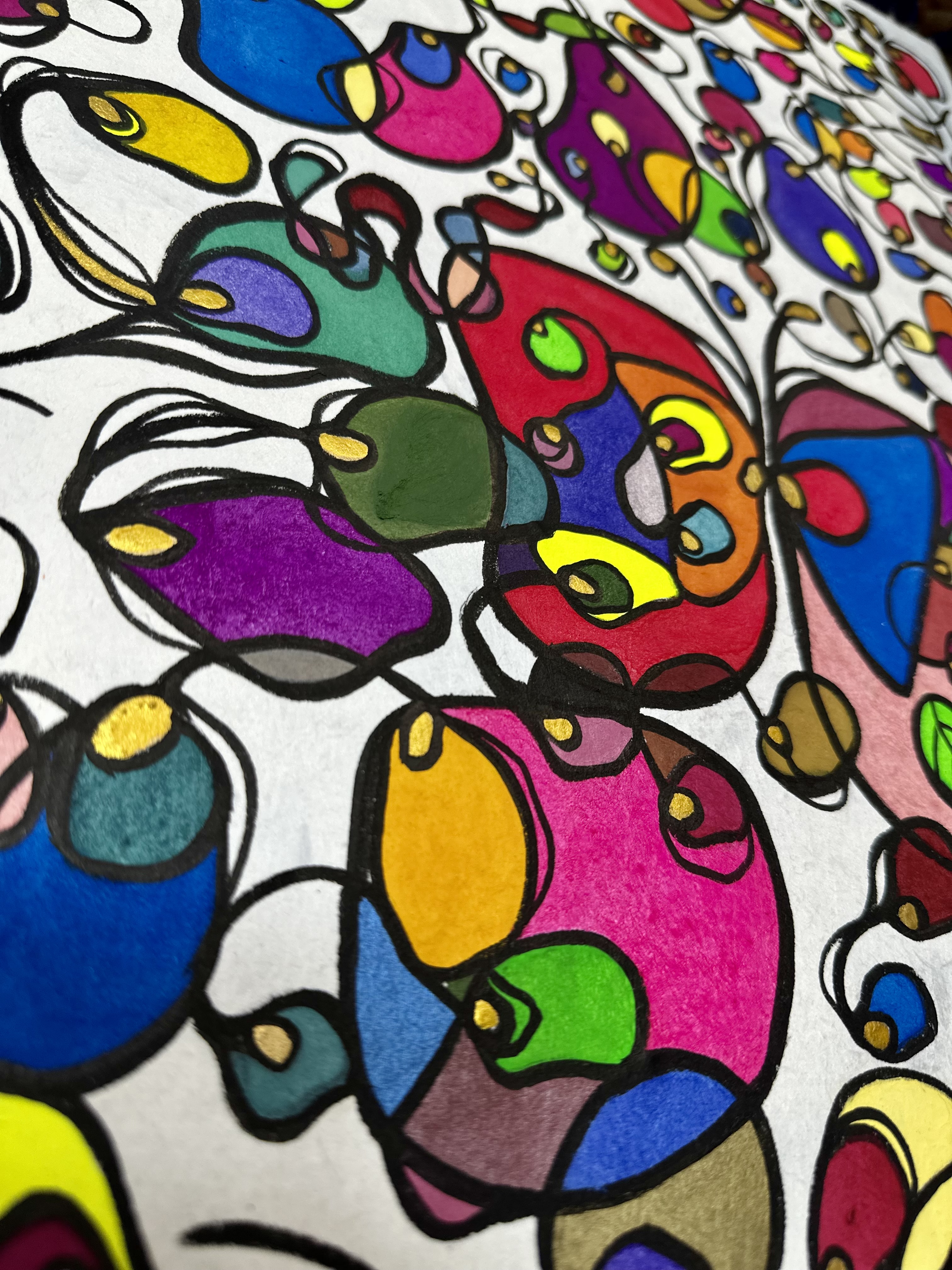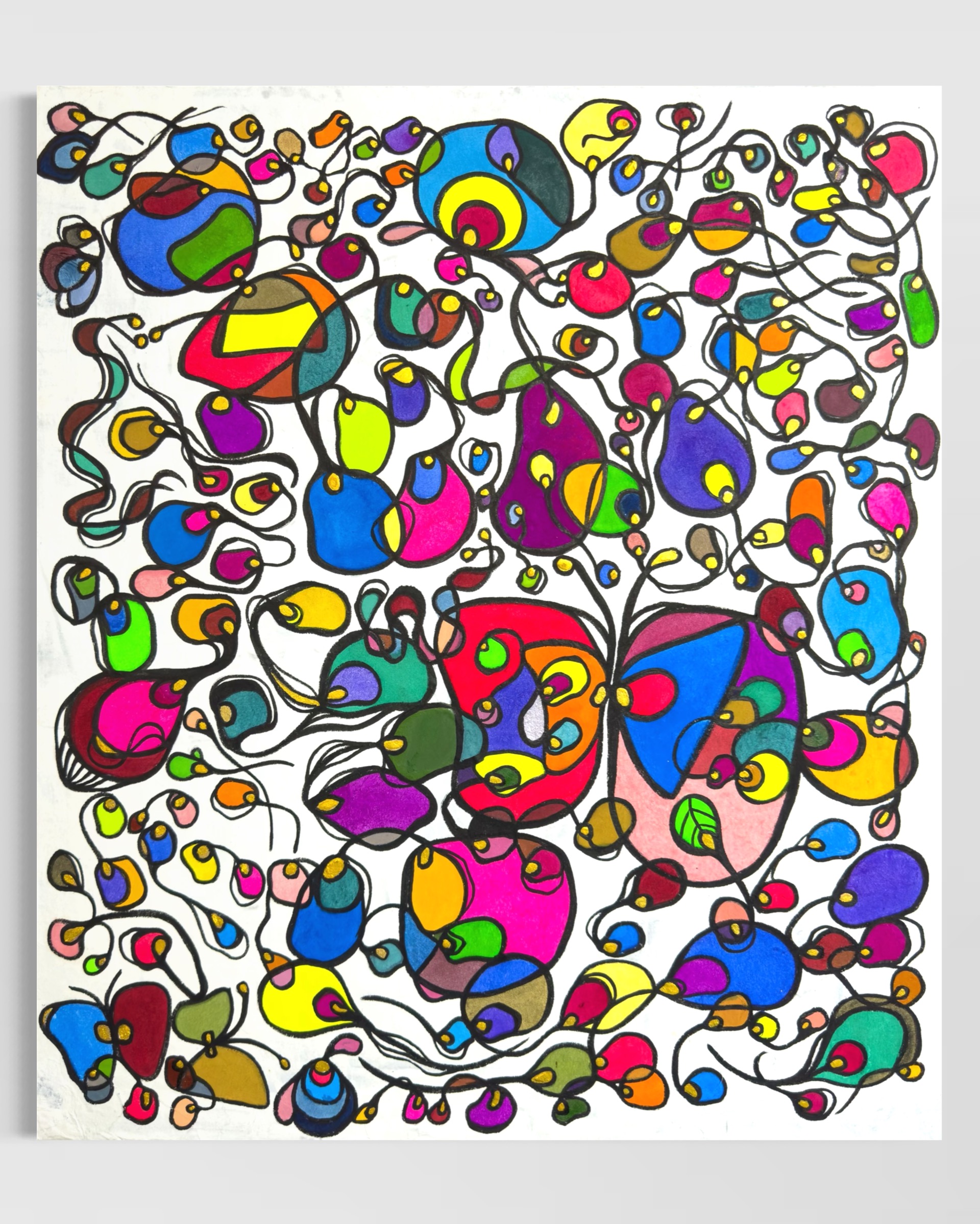 - 변주의 증명: 약 30개의 유기적 형태는 크기, 꼬리의 곡률, 내부 색 구획의 개수 등에서 단 하나도 복제되지 않습니다. 특히 중앙 하단의 대형 형태는 내부에 5개 이상의 색 구획을 포함하며, 이는 '나비로의 변태'—단순성에서 복잡성으로의 존재론적 도약—를 시각적으로 번역한 핵심 형태입니다.