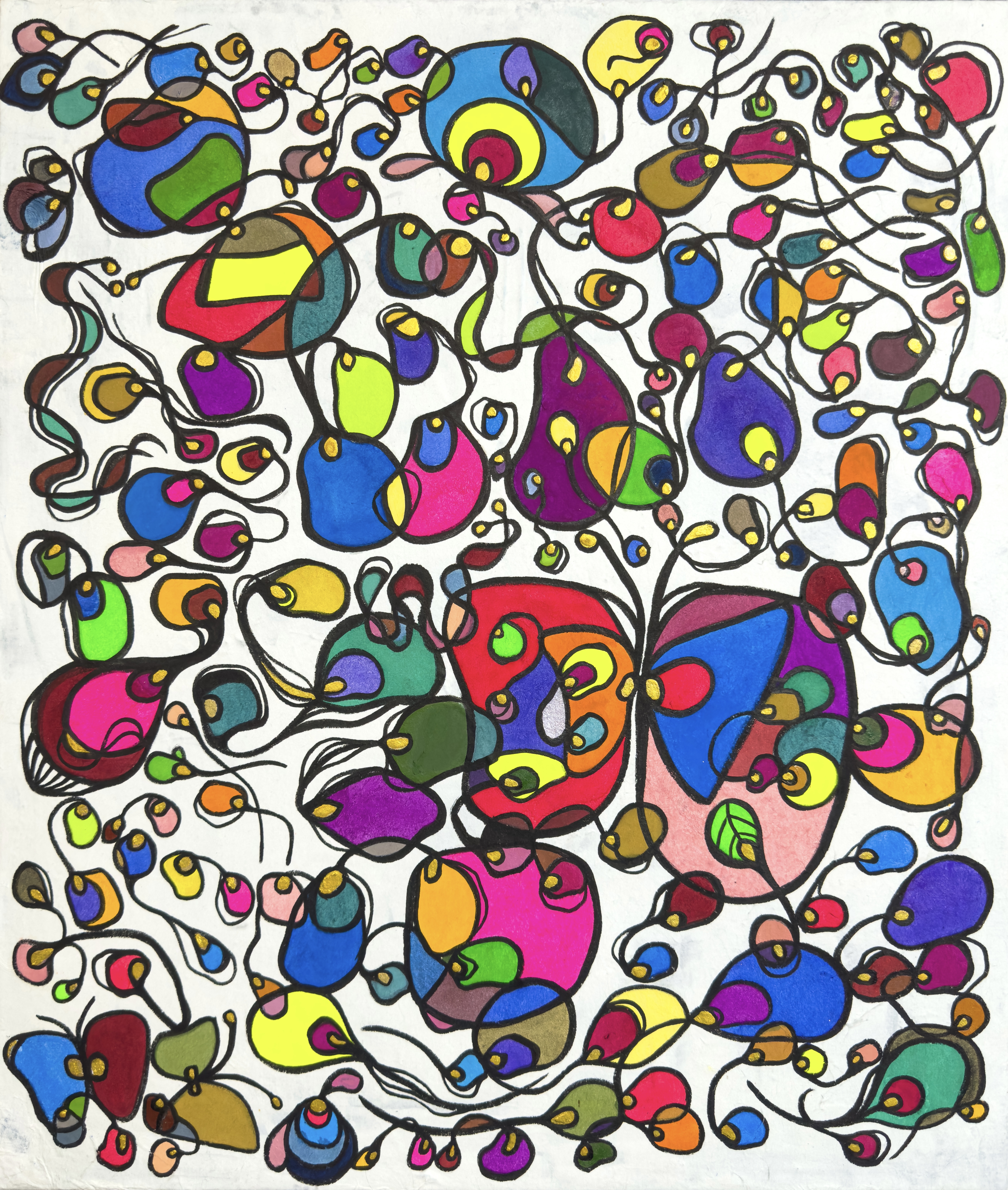 - 침투와 공생의 공간: 형태들이 더 밀집됨에 따라 흰 여백은 축소되었으나, 이는 여백이 사라진 것이 아니라 미세화되고 투명한 막처럼 변모했음을 의미합니다. 이 여백은 선과 색의 스며듦을 허용하며, 개별 존재들이 타자를 받아들이며 자신을 갱신하는 공생의 물리적 조건으로 변모합니다.