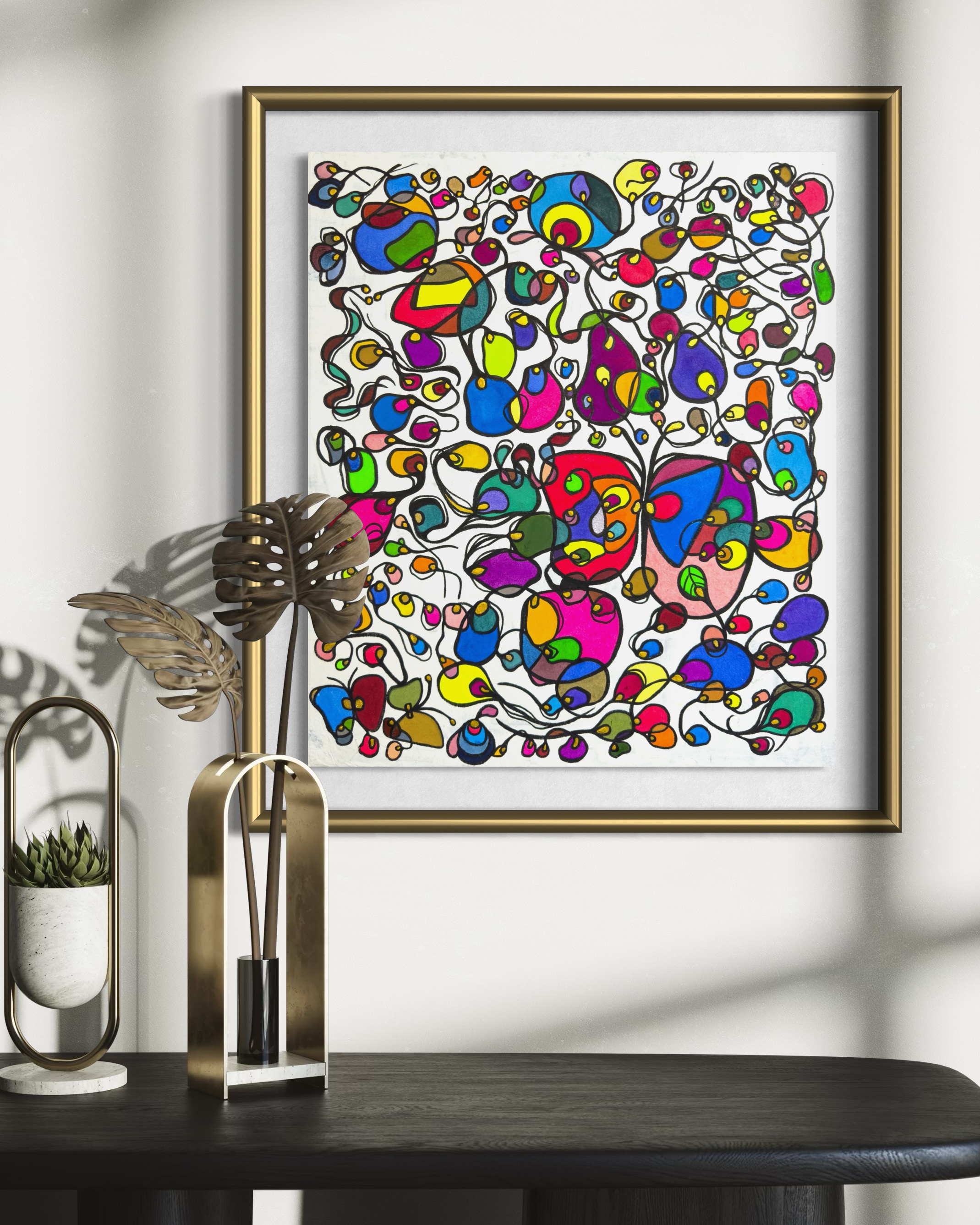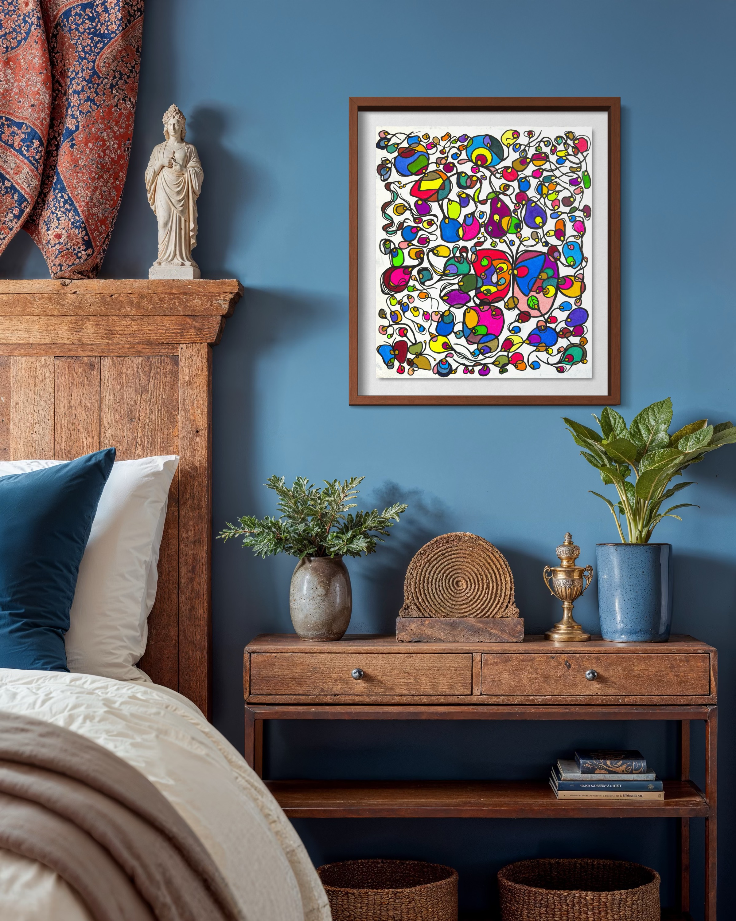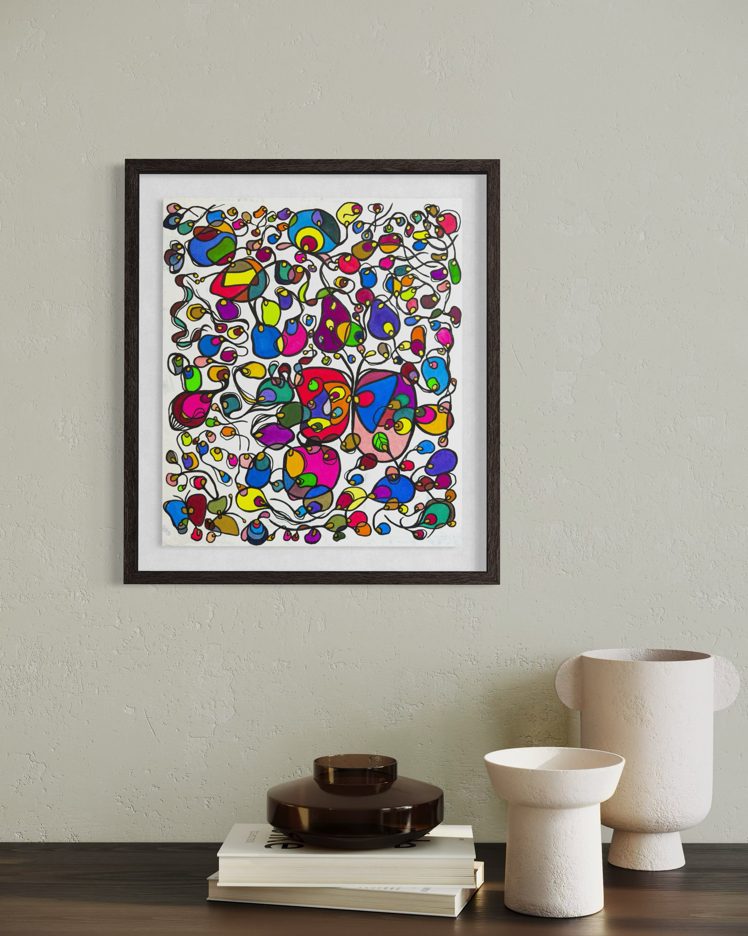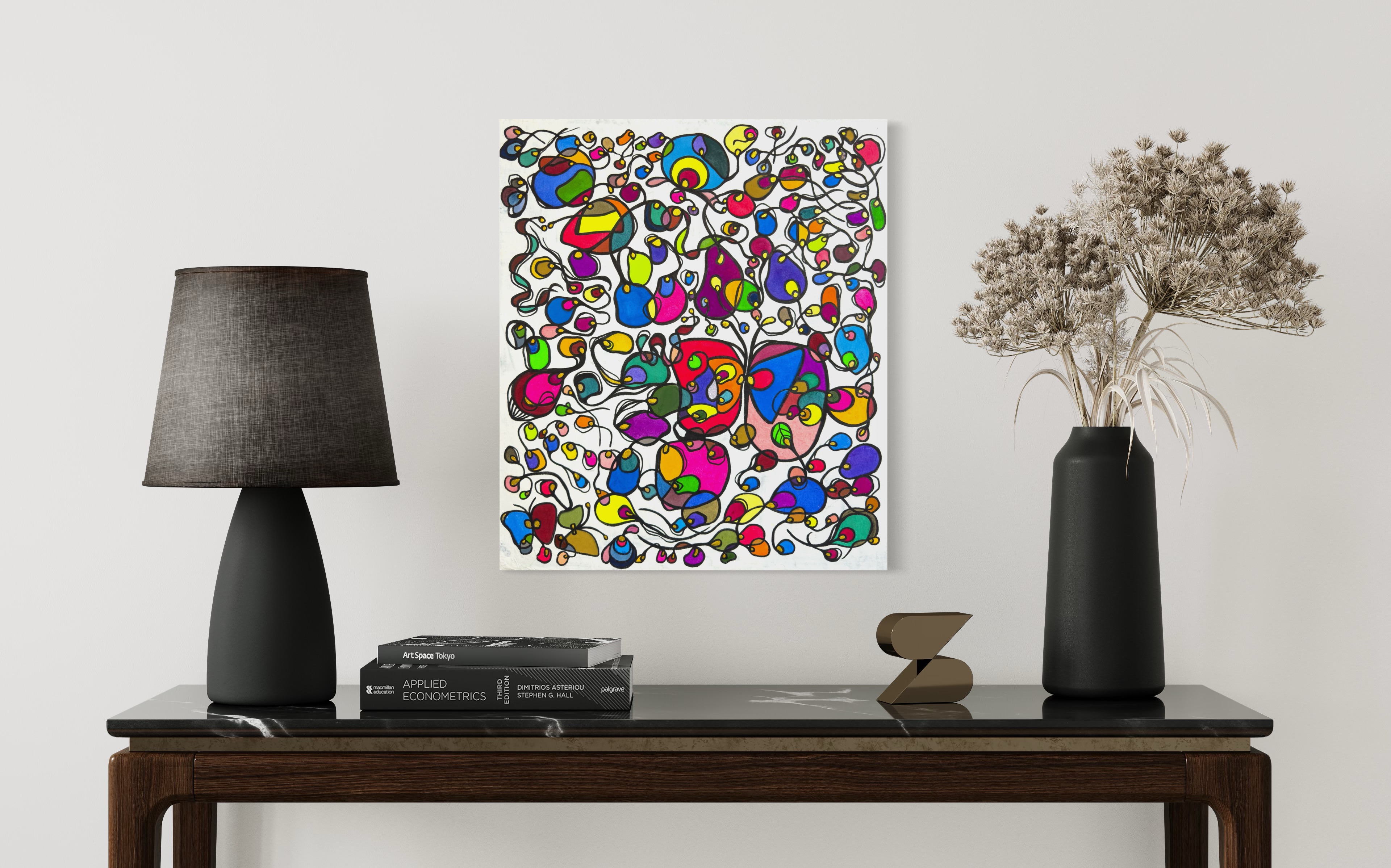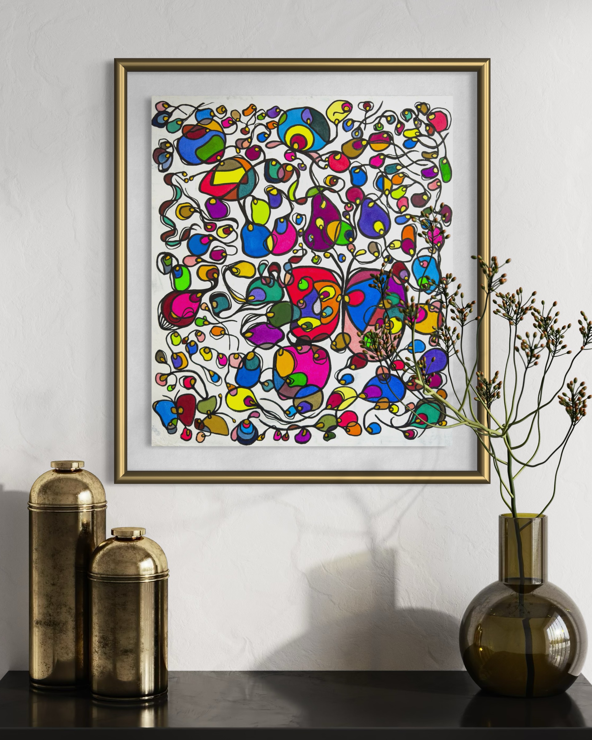 복수화된 선들을 보라. 이는 모든 작고 왜곡된 형태가 자신의 존재를 주장하도록 허락된 복잡한 생존 네트워크이다. 강렬한 형광색은 자기 존재의 거리낌 없는 외침이다. 특히 흰 여백은 단순히 비어있는 공간이 아니다. 그것은 맹렬히 최소화된 자존의 마지막 보루, 즉 자기 주권을 지키기 위해 필사적으로 확보해야 하는 최소한의 간격이다. 이 작품을 소유하는 것은 그 필수적인 고유 에너지의 파편을 갖는 것이다. 이것은 혼돈에 맞서는 당신의 영원한 긍정이다.