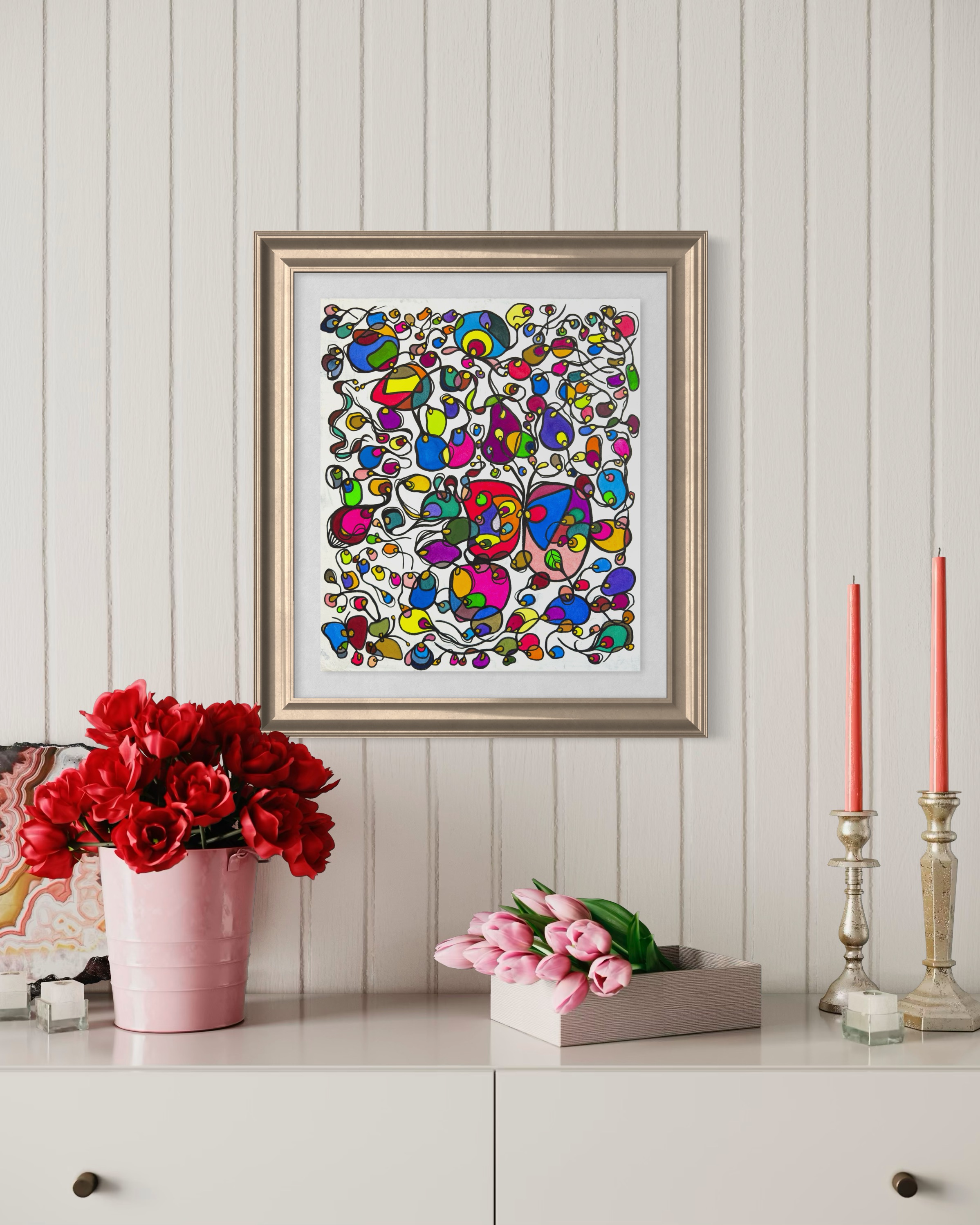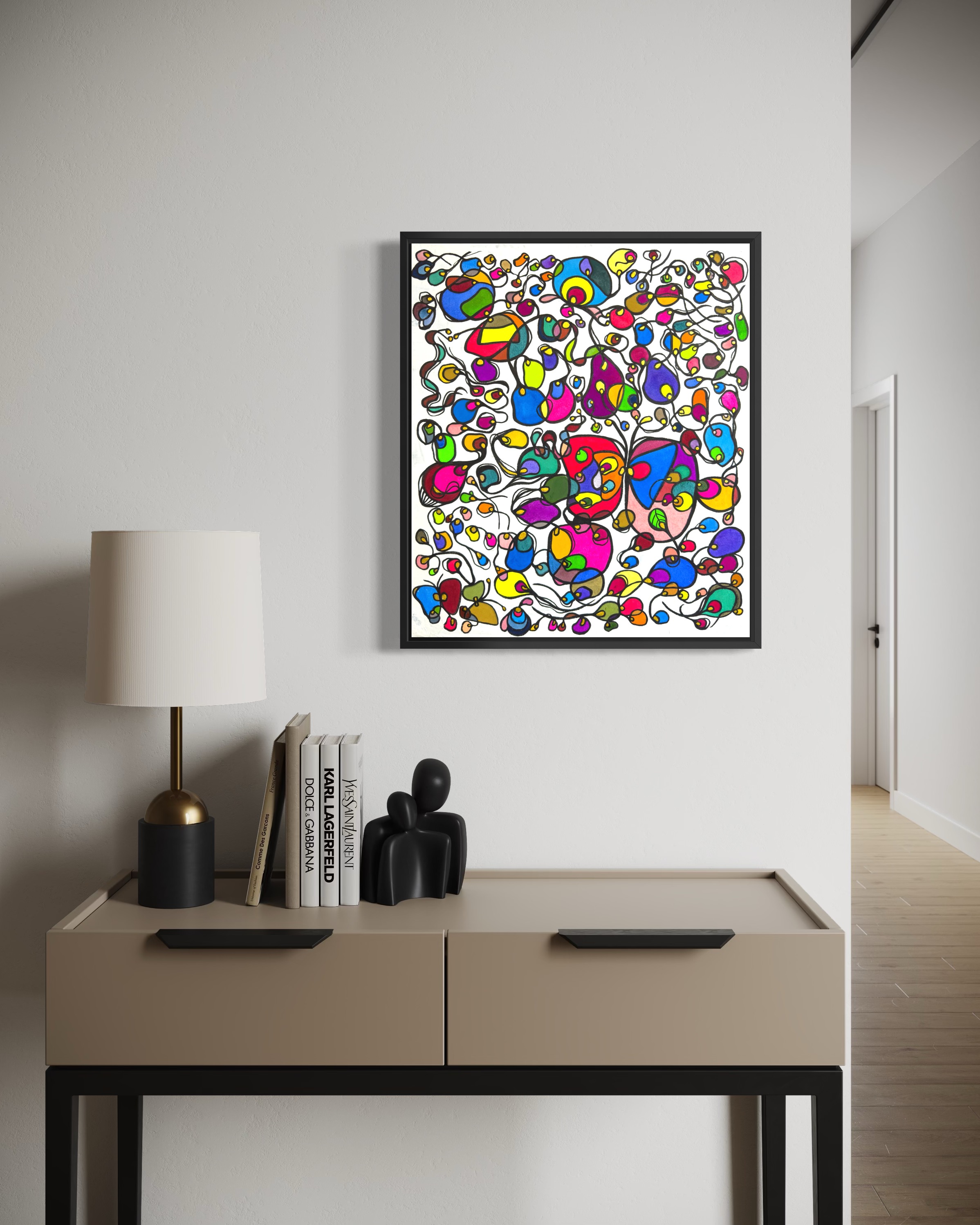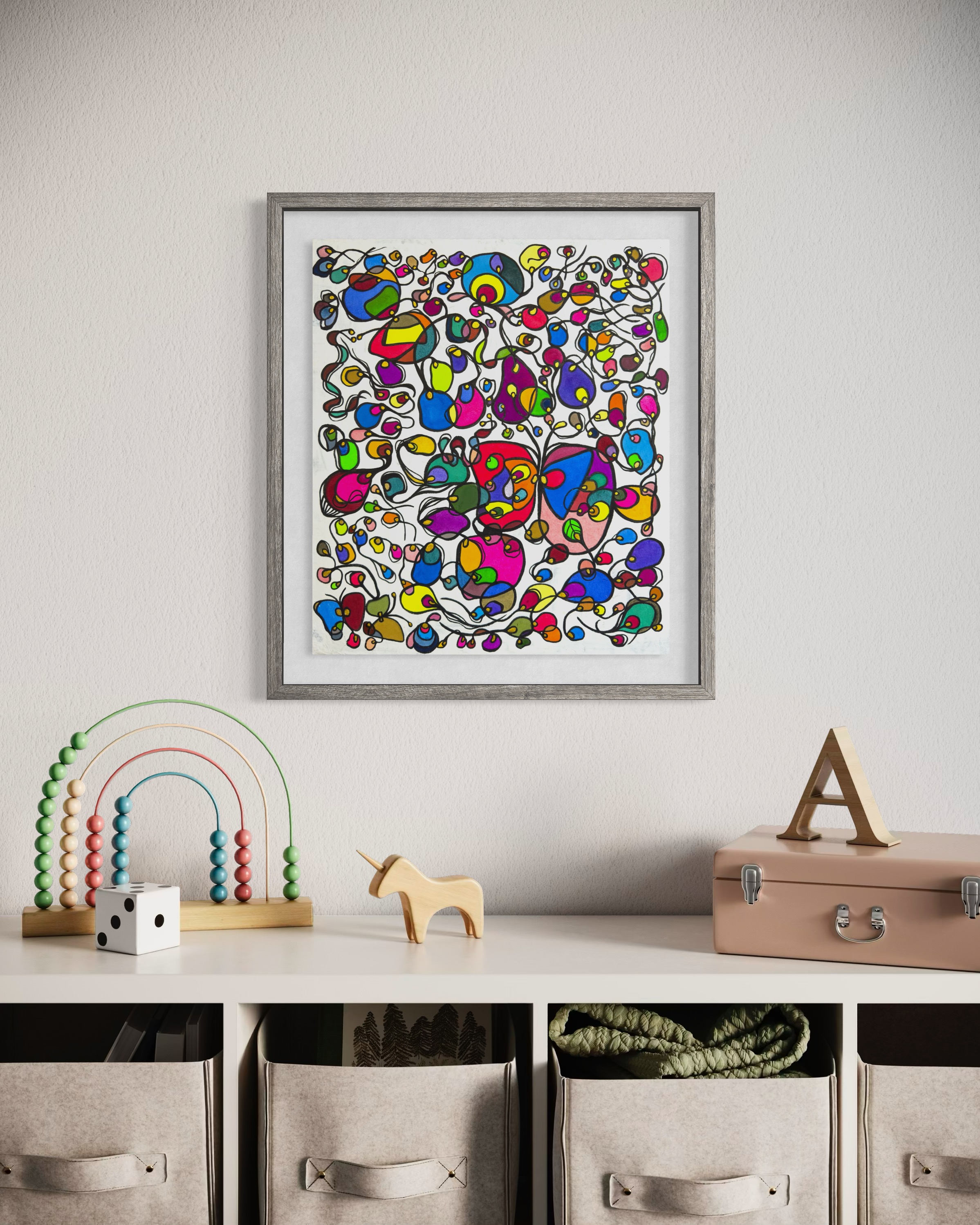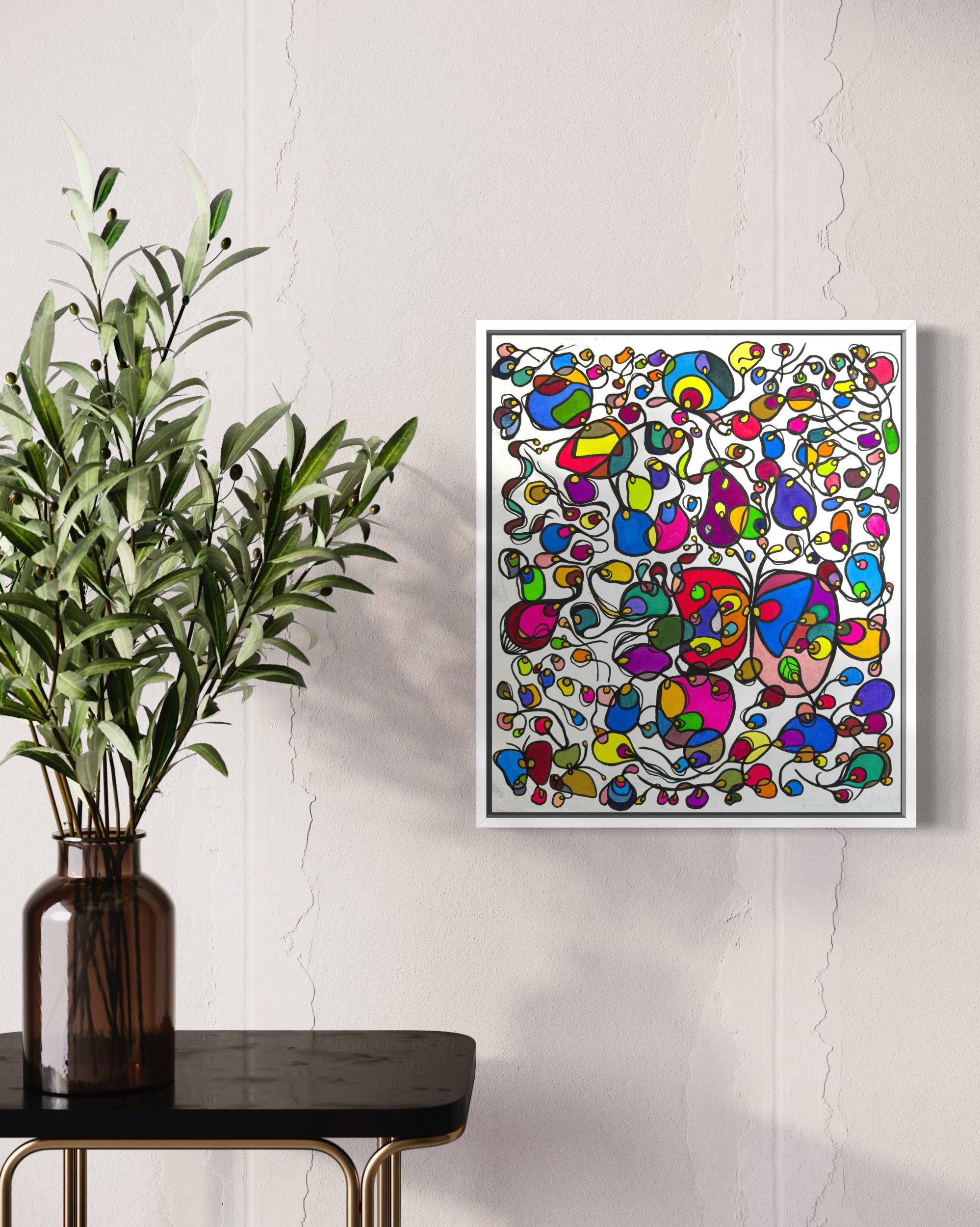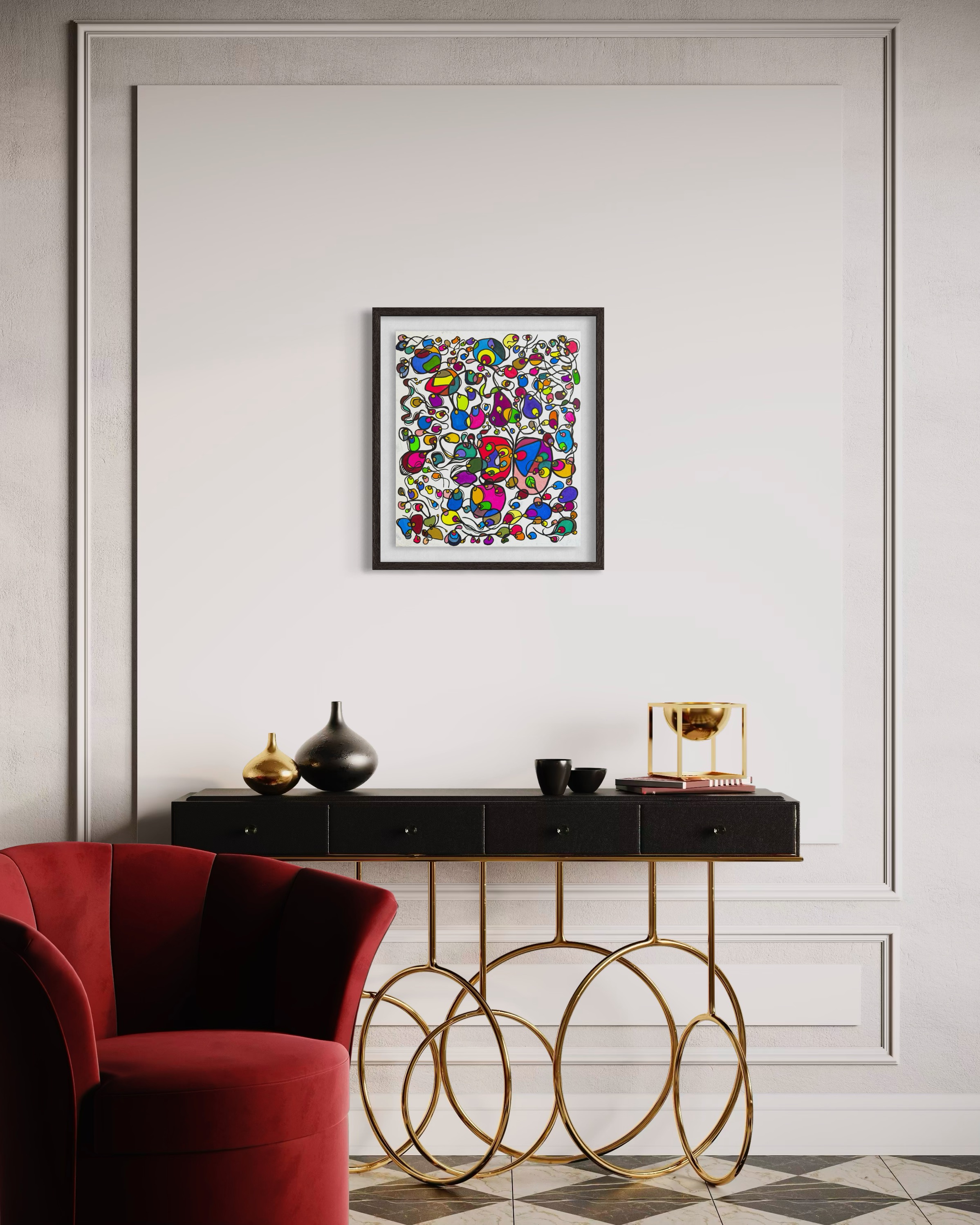복수화된 선들을 보라. 이는 모든 작고 왜곡된 형태가 자신의 존재를 주장하도록 허락된 복잡한 생존 네트워크이다. 강렬한 형광색은 자기 존재의 거리낌 없는 외침이다. 특히 흰 여백은 단순히 비어있는 공간이 아니다. 그것은 맹렬히 최소화된 자존의 마지막 보루, 즉 자기 주권을 지키기 위해 필사적으로 확보해야 하는 최소한의 간격이다. 이 작품을 소유하는 것은 그 필수적인 고유 에너지의 파편을 갖는 것이다. 이것은 혼돈에 맞서는 당신의 영원한 긍정이다.