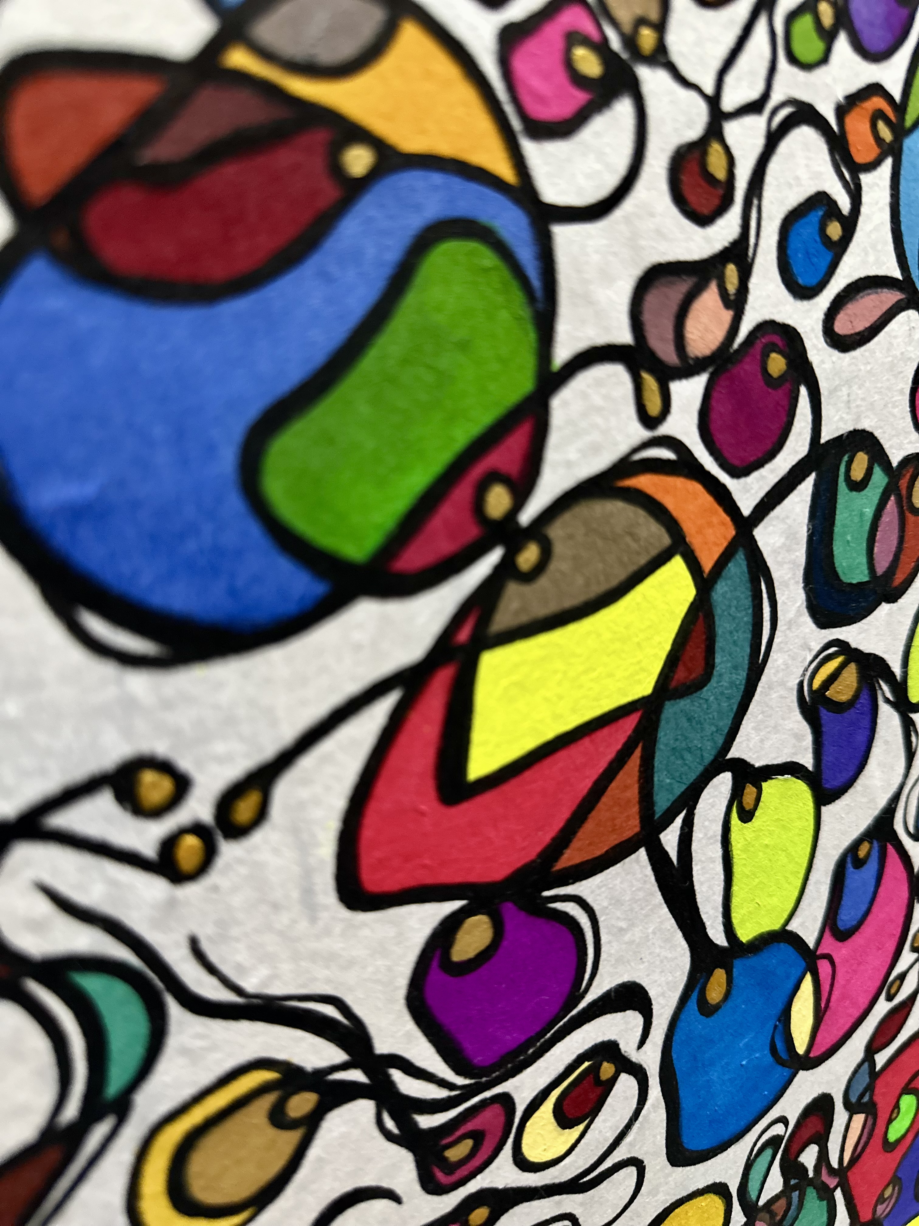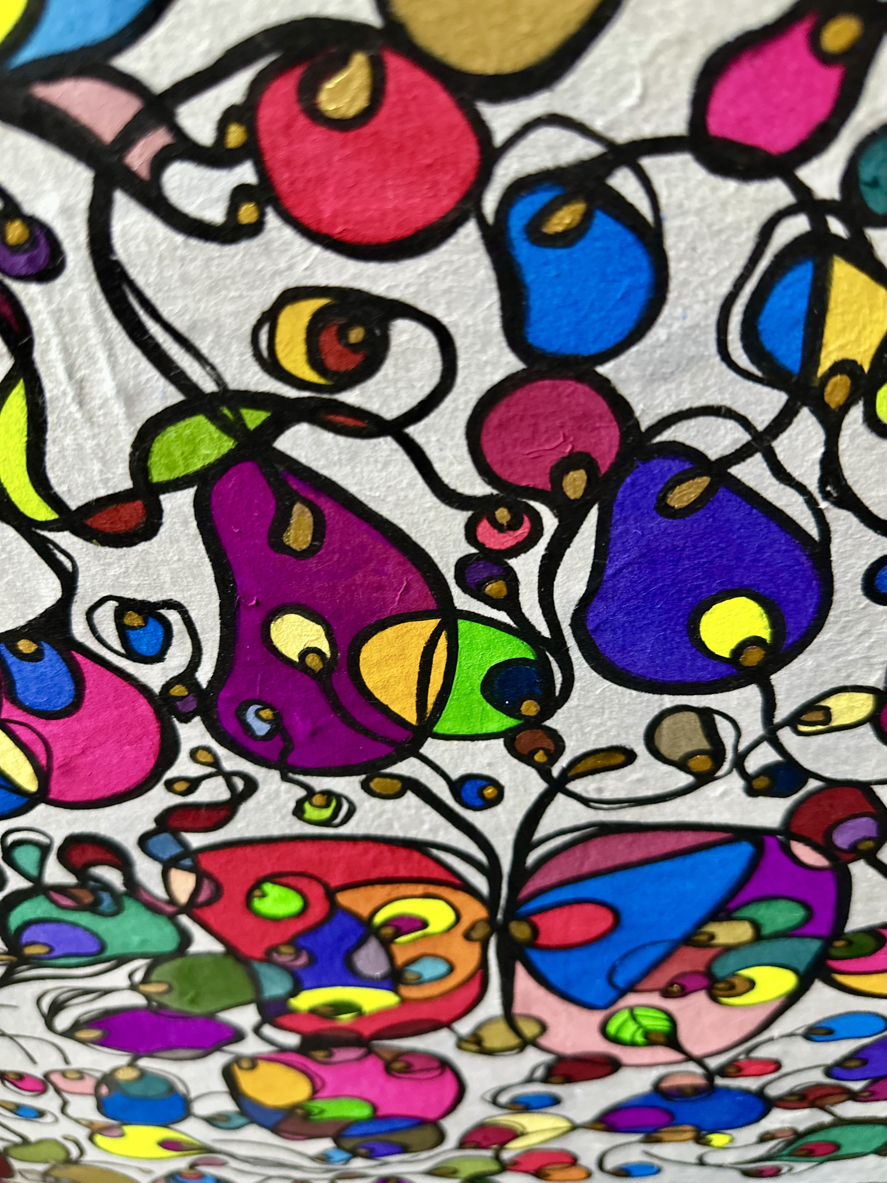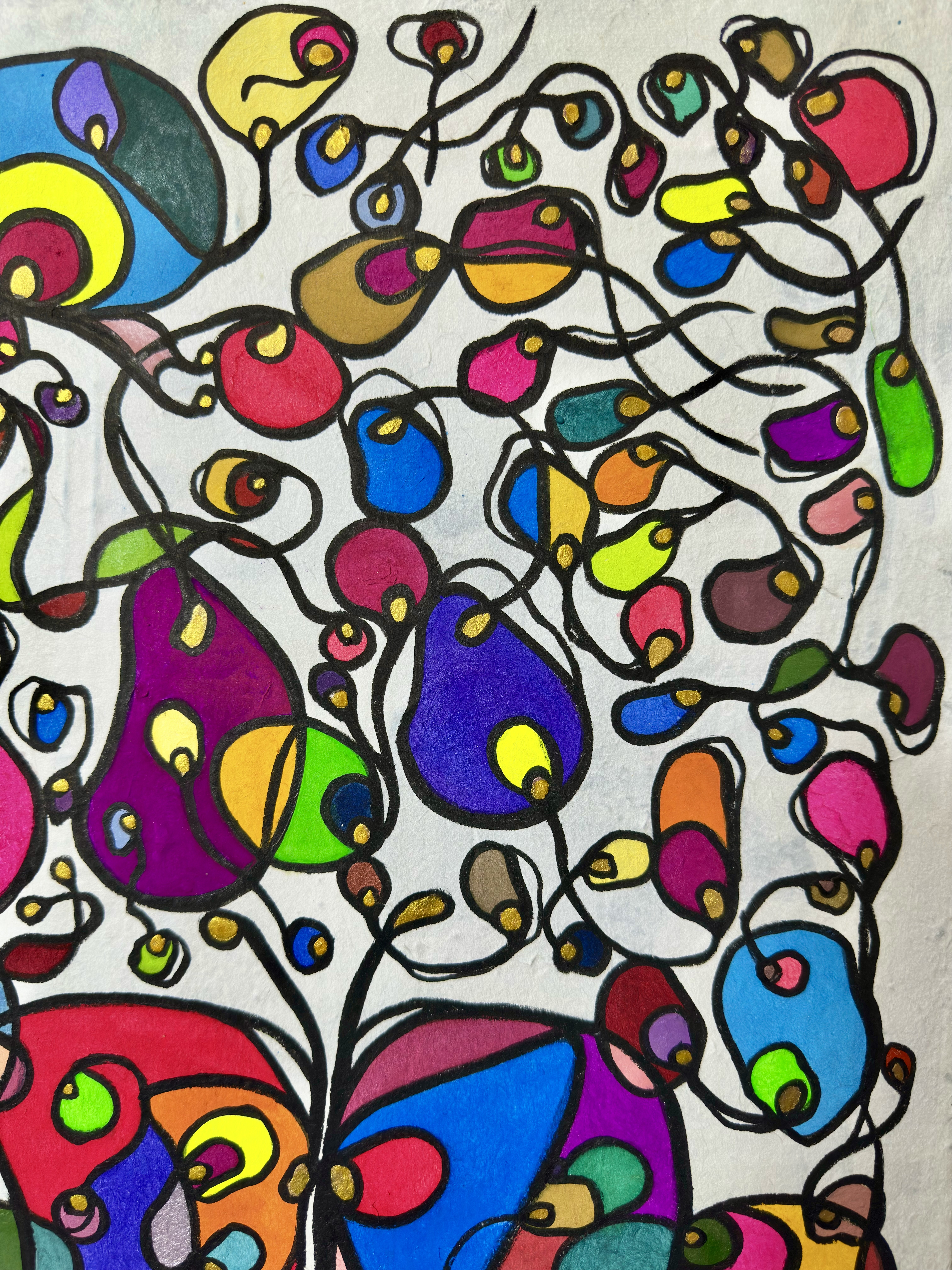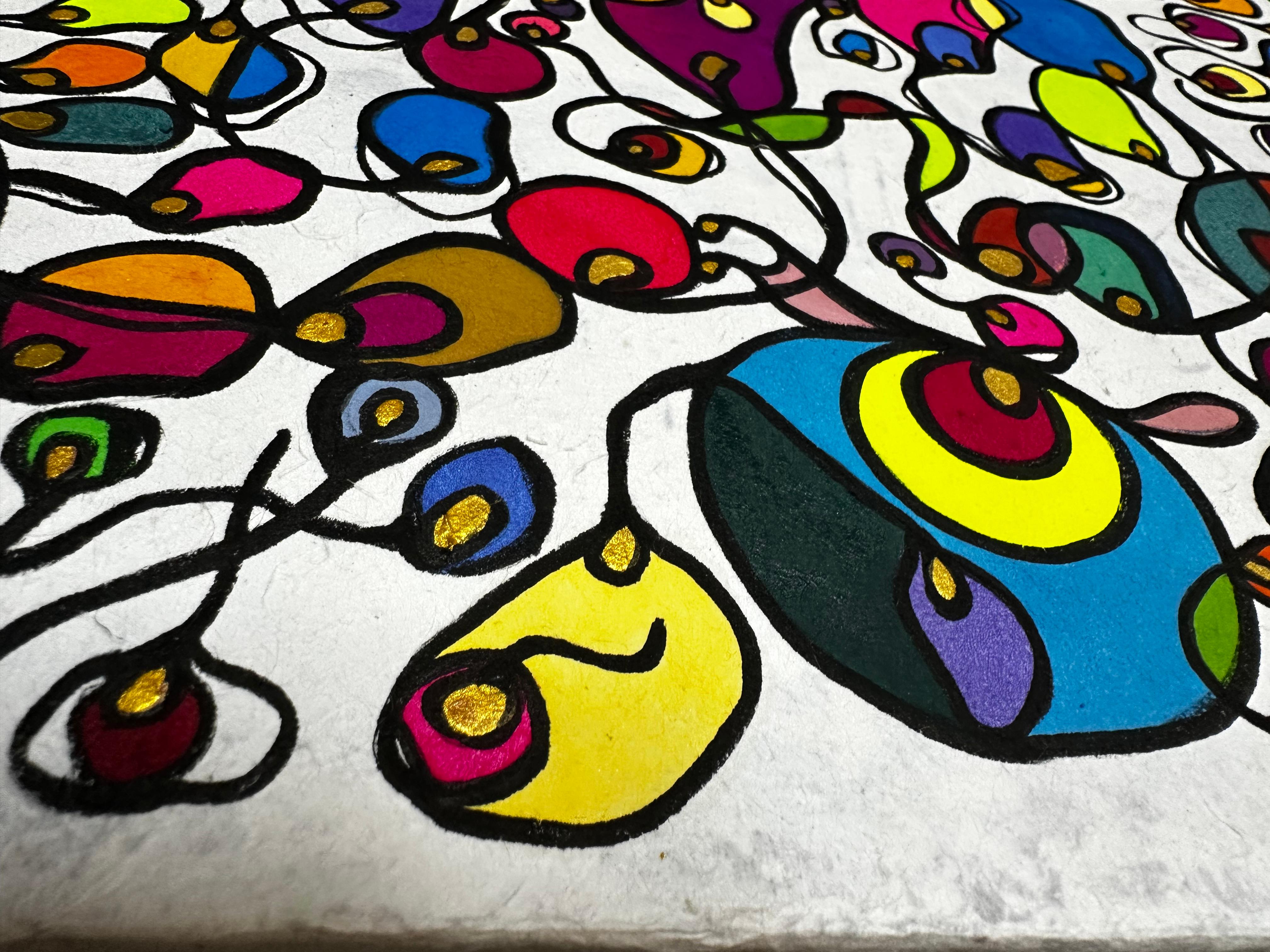 - 색채의 비(非)복제성: 작가는 채도 높은 원색과 혼색을 사용하여 각 형태에 대체 불가능한 정체성을 부여합니다. 동양화 안료의 물성은 색이 한지 섬유 속으로 스며들어 존재와 지지체가 불가분하게 결합하게 함으로써, **'나는 복제될 수 없다'**는 철학을 물질적으로 입증합니다.