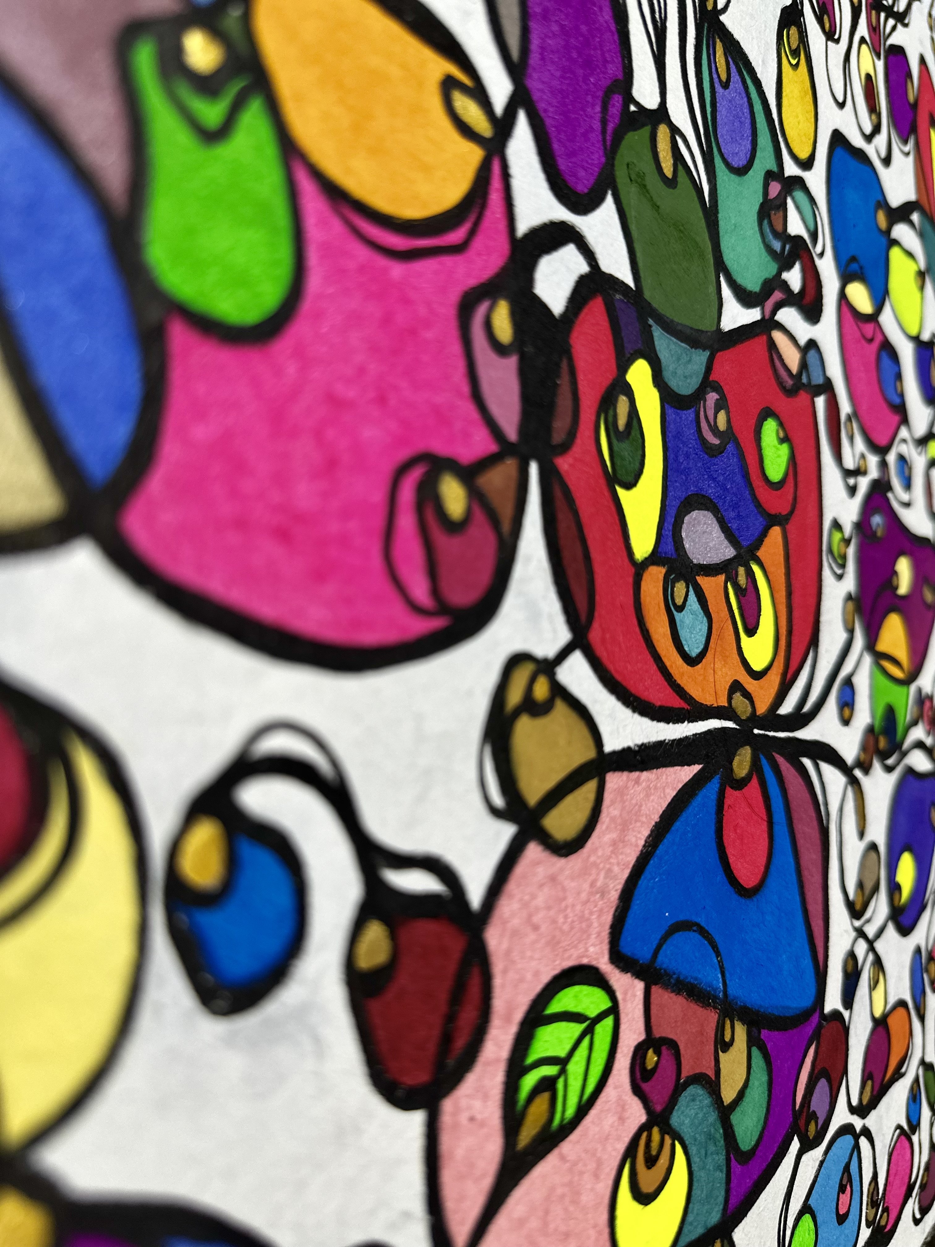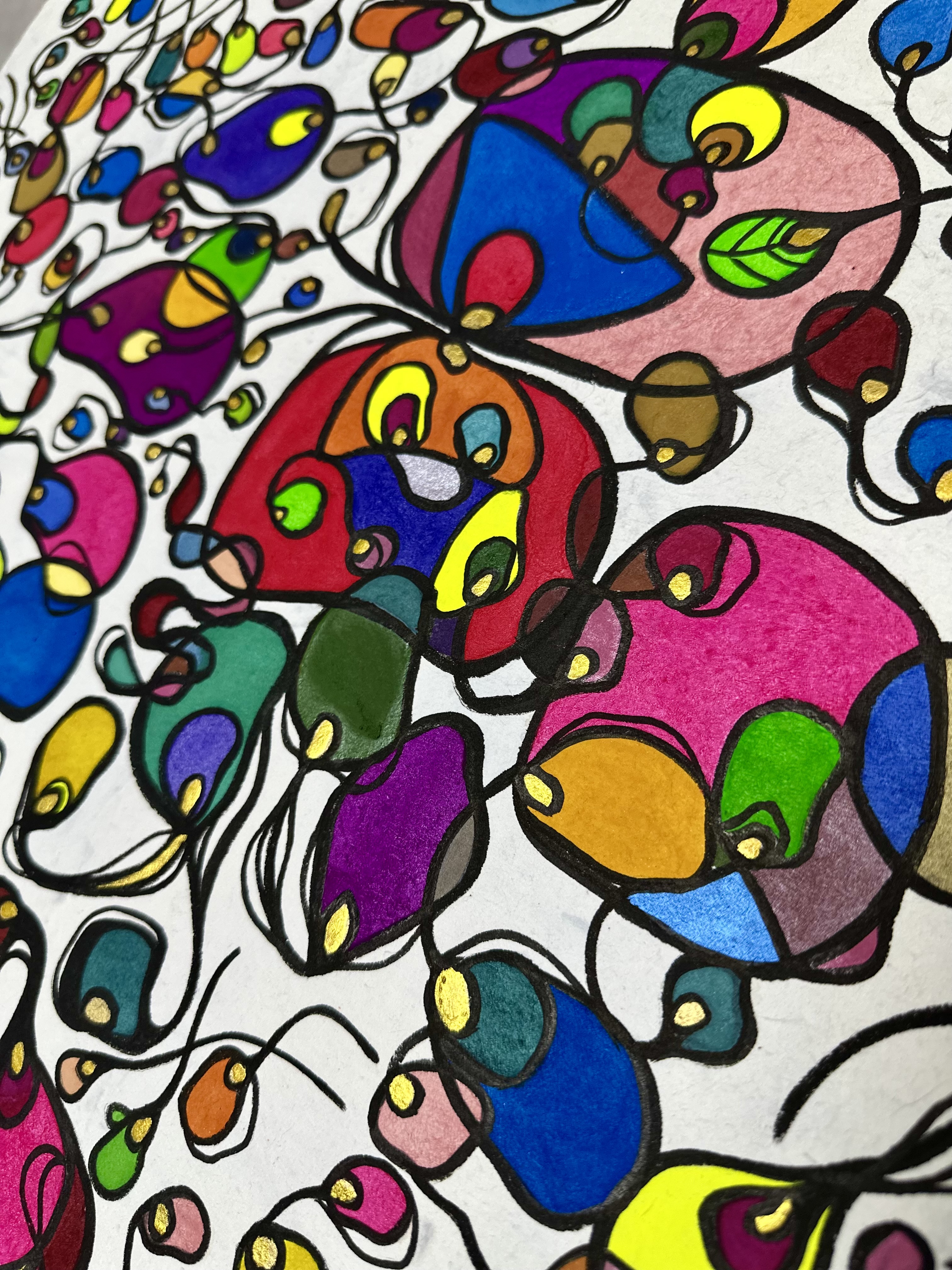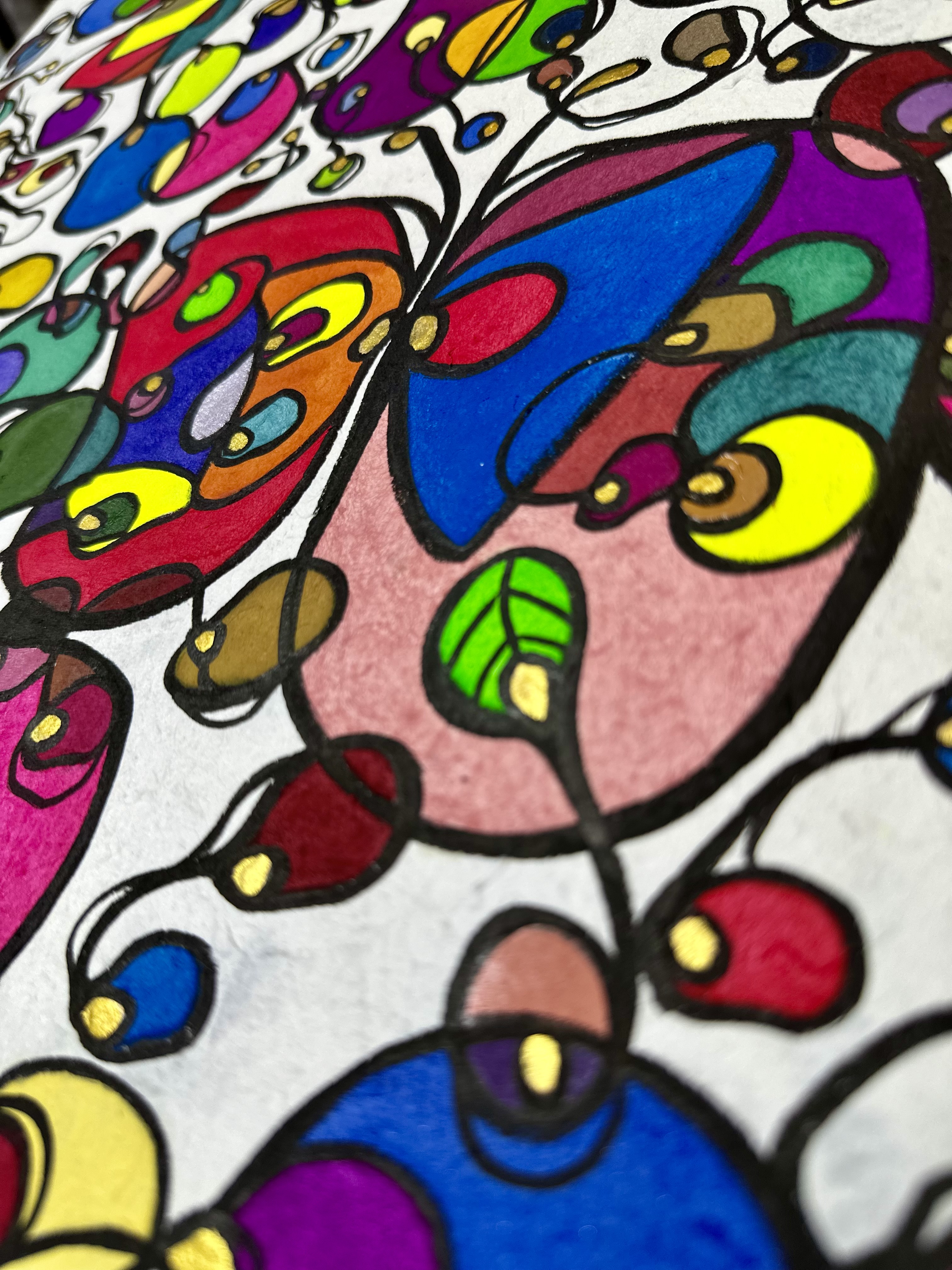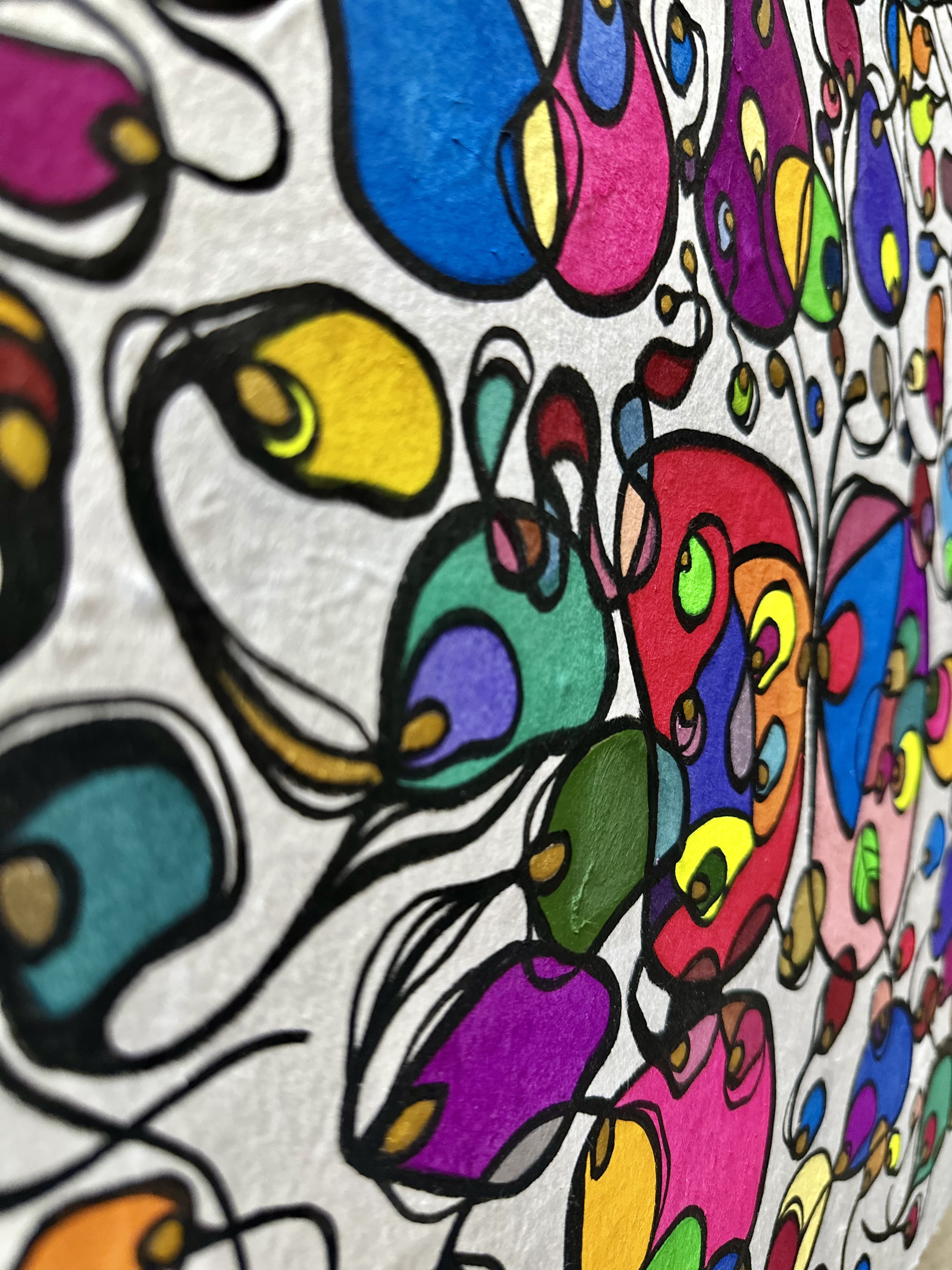 - 색채의 비(非)복제성: 작가는 채도 높은 원색과 혼색을 사용하여 각 형태에 대체 불가능한 정체성을 부여합니다. 동양화 안료의 물성은 색이 한지 섬유 속으로 스며들어 존재와 지지체가 불가분하게 결합하게 함으로써, **'나는 복제될 수 없다'**는 철학을 물질적으로 입증합니다.