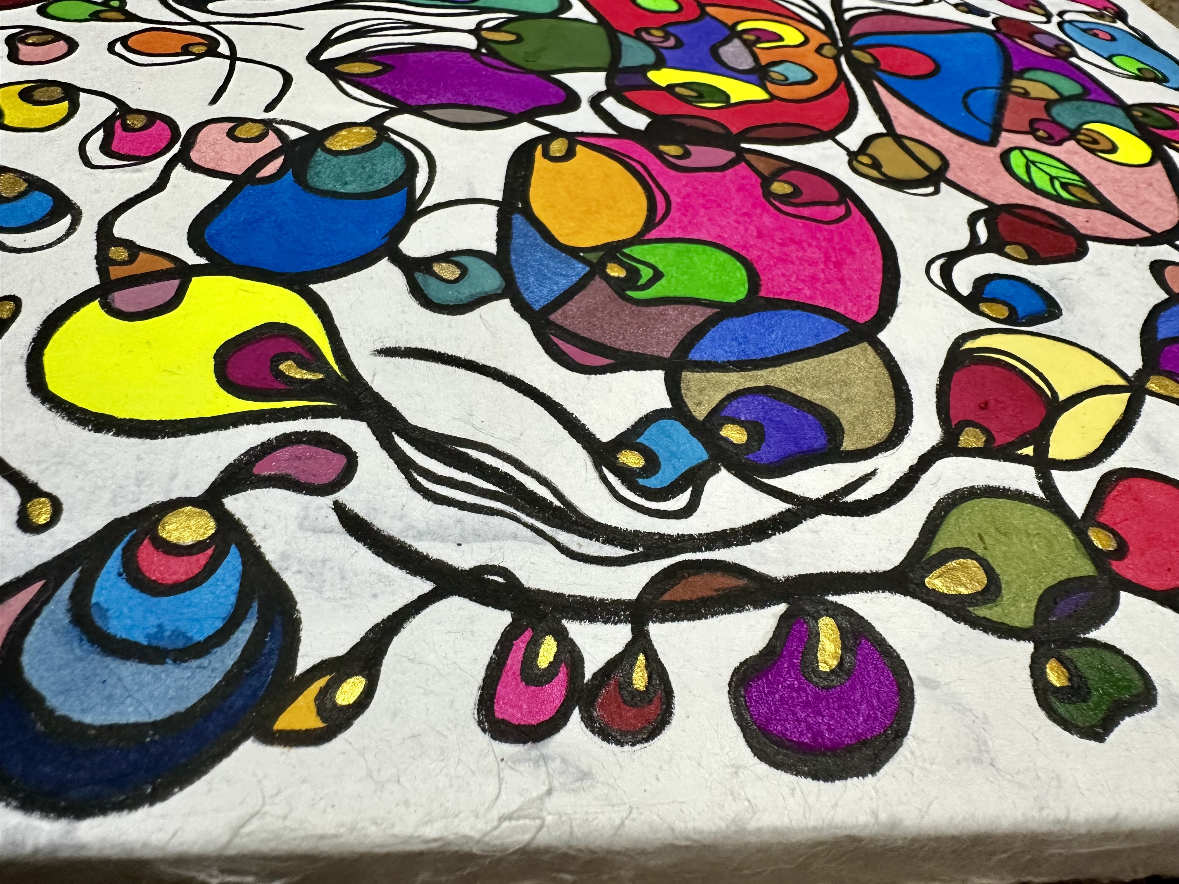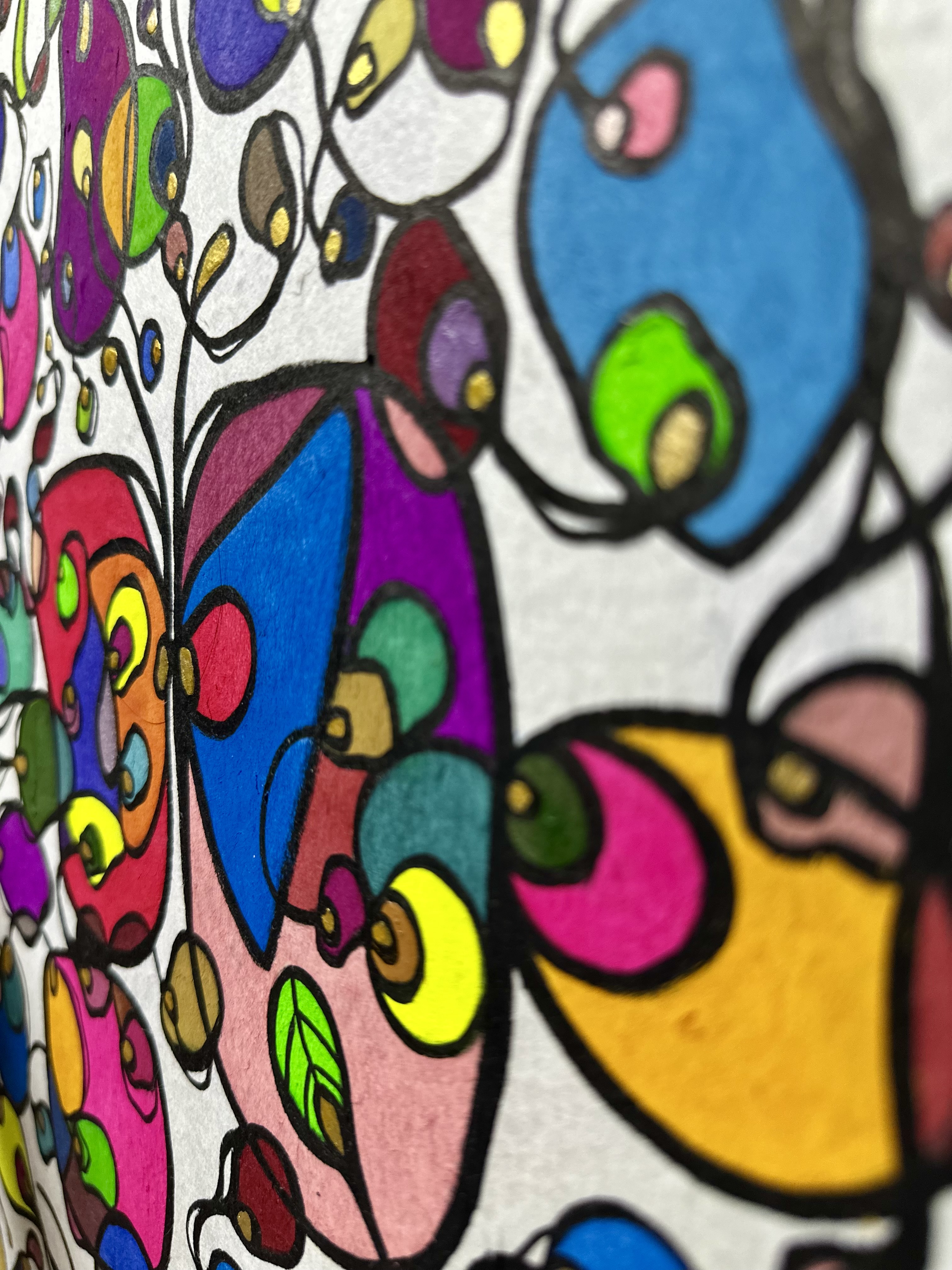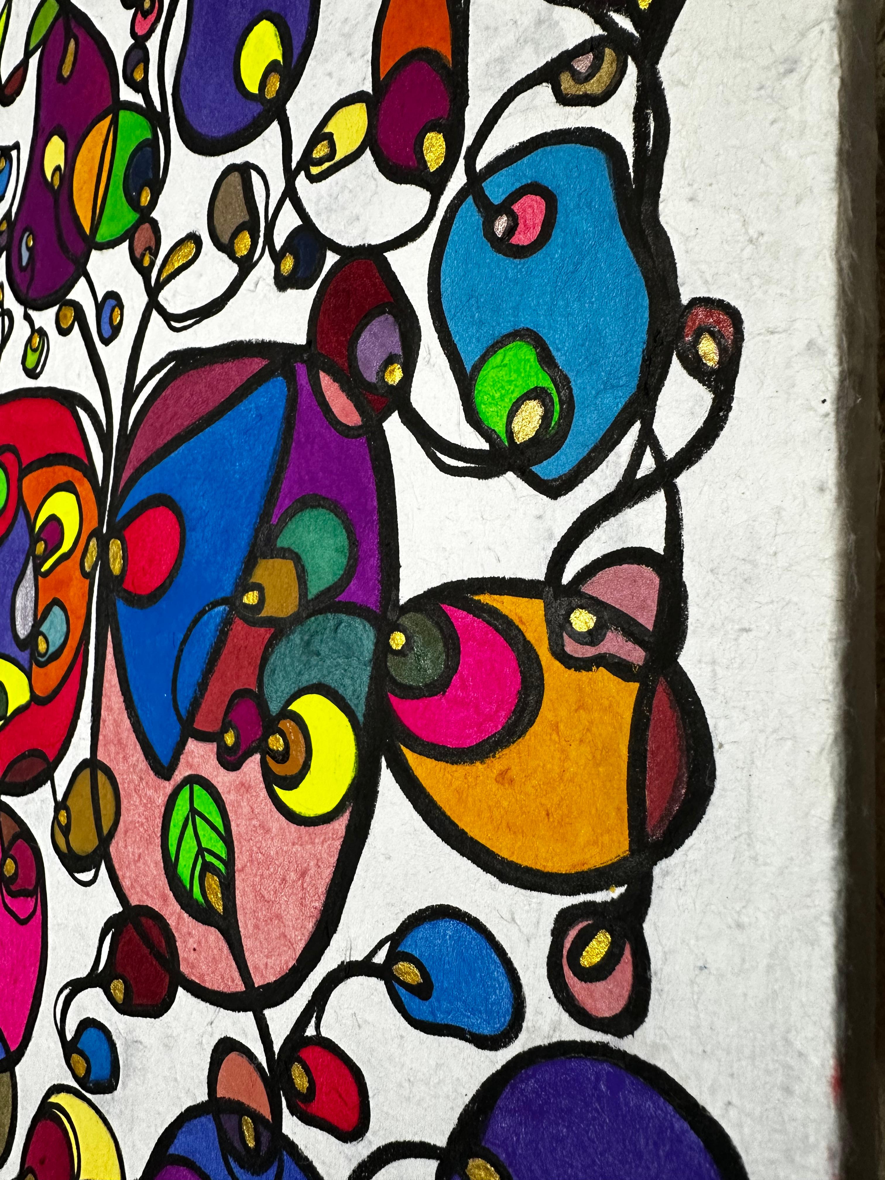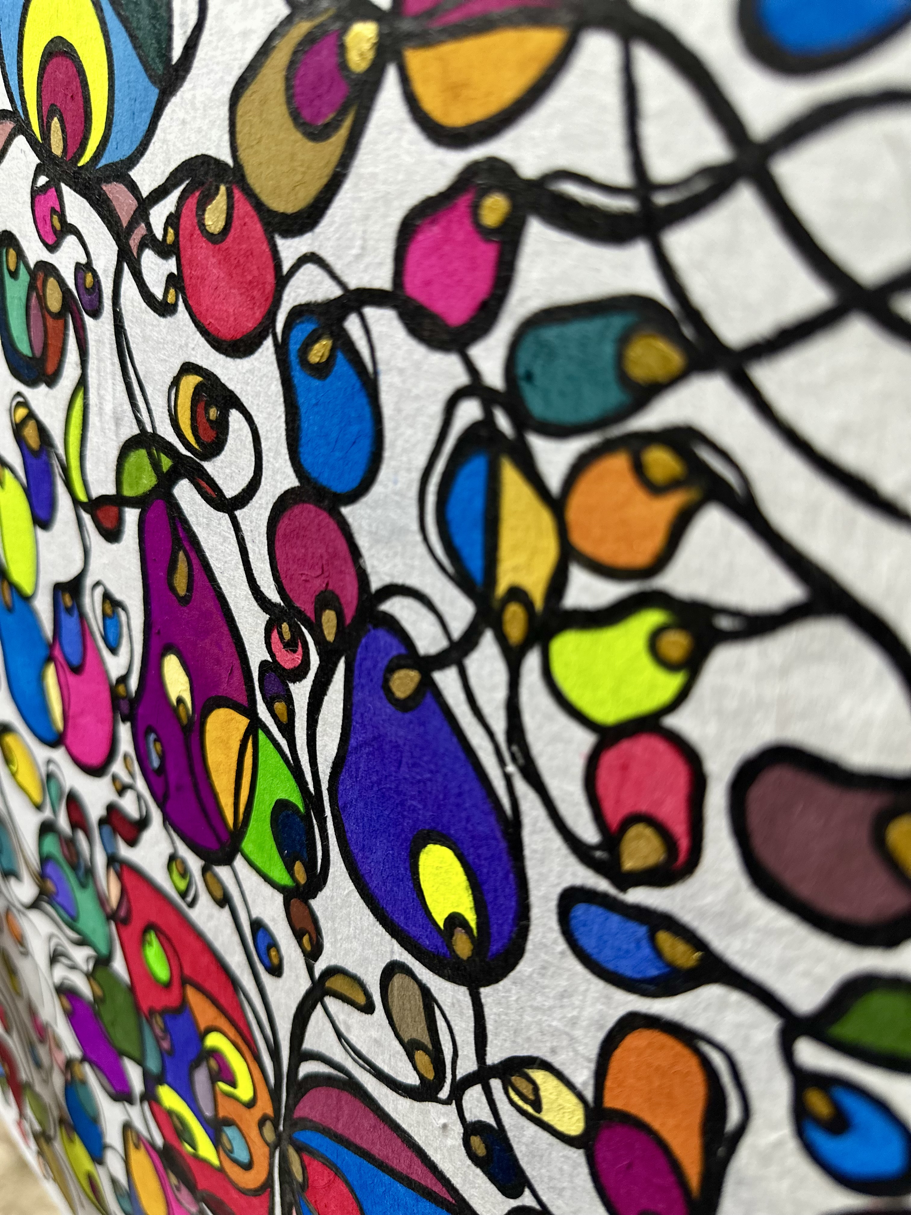 - 색채의 비(非)복제성: 작가는 채도 높은 원색과 혼색을 사용하여 각 형태에 대체 불가능한 정체성을 부여합니다. 동양화 안료의 물성은 색이 한지 섬유 속으로 스며들어 존재와 지지체가 불가분하게 결합하게 함으로써, **'나는 복제될 수 없다'**는 철학을 물질적으로 입증합니다.