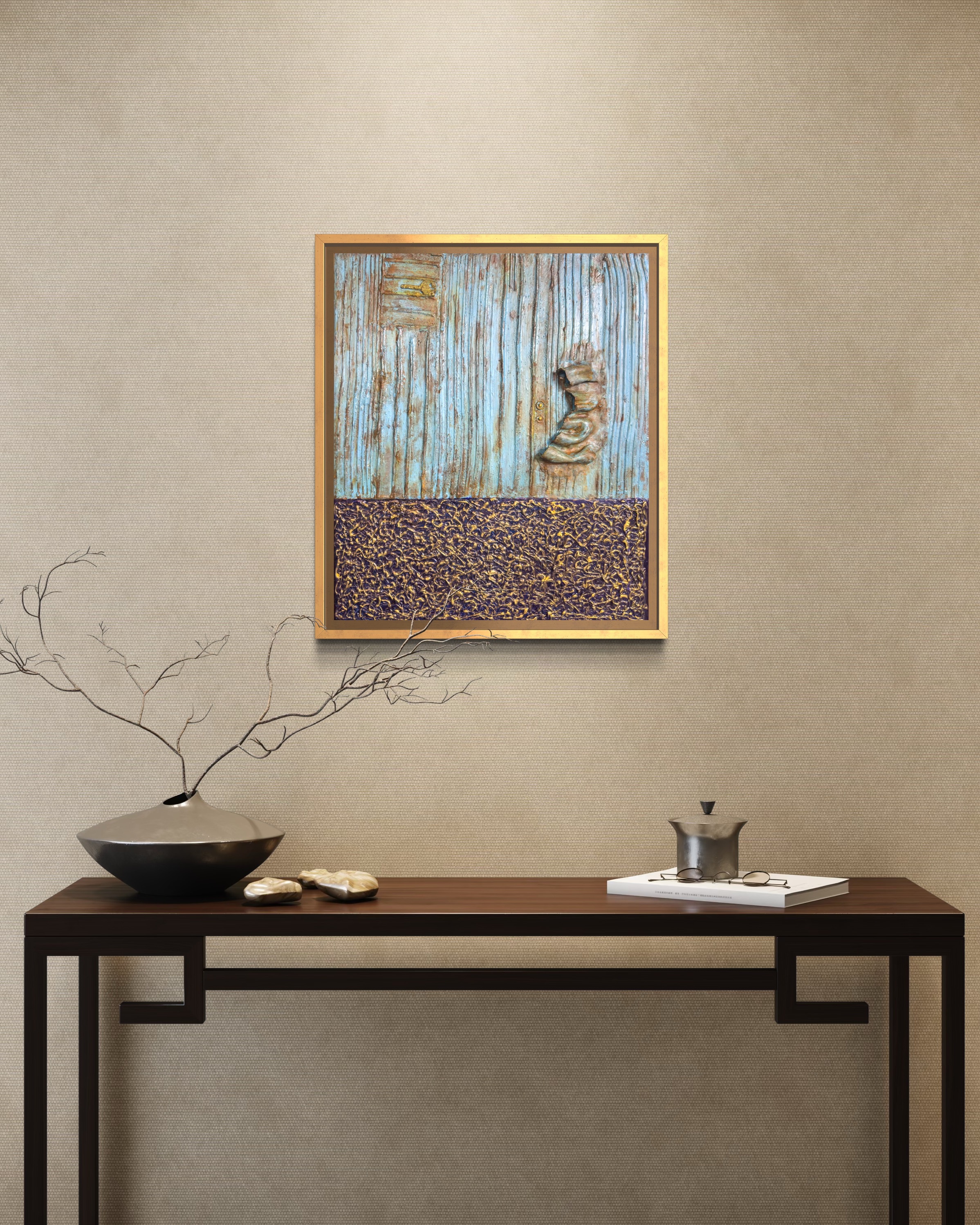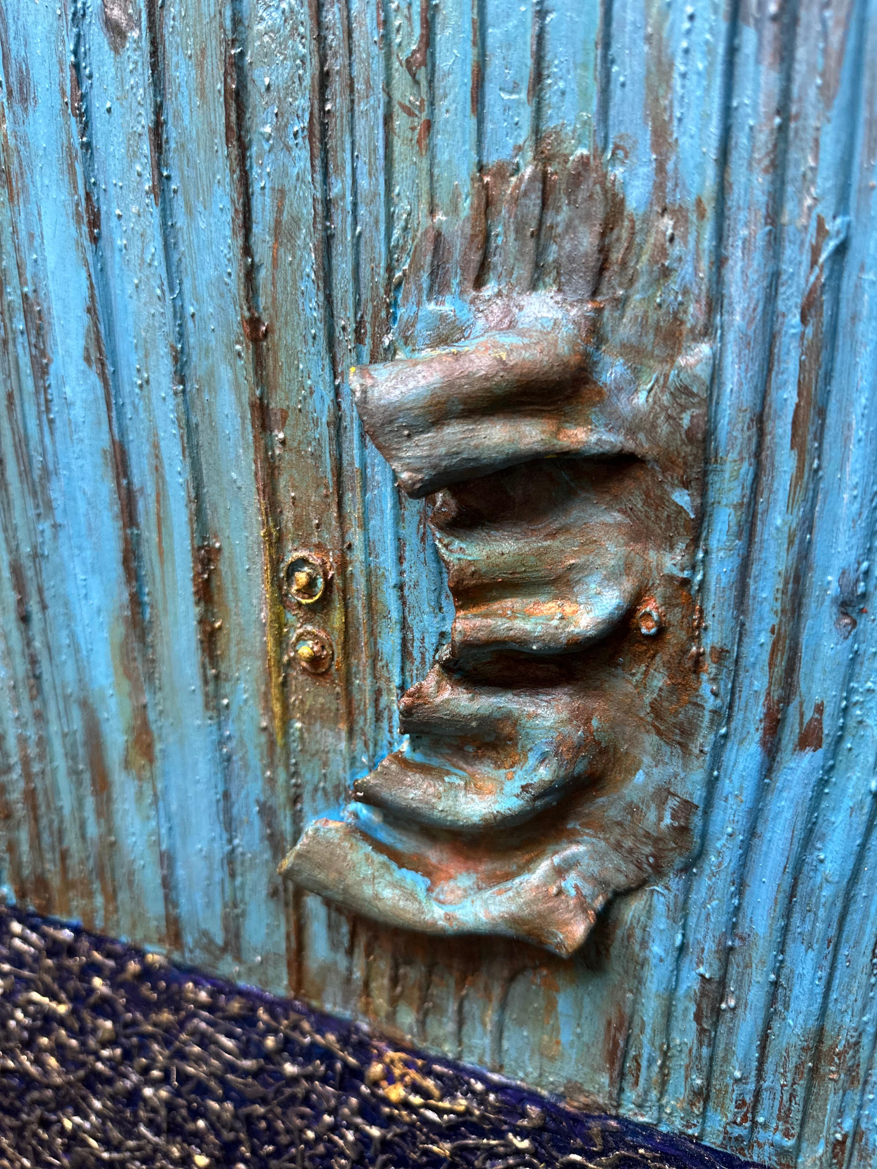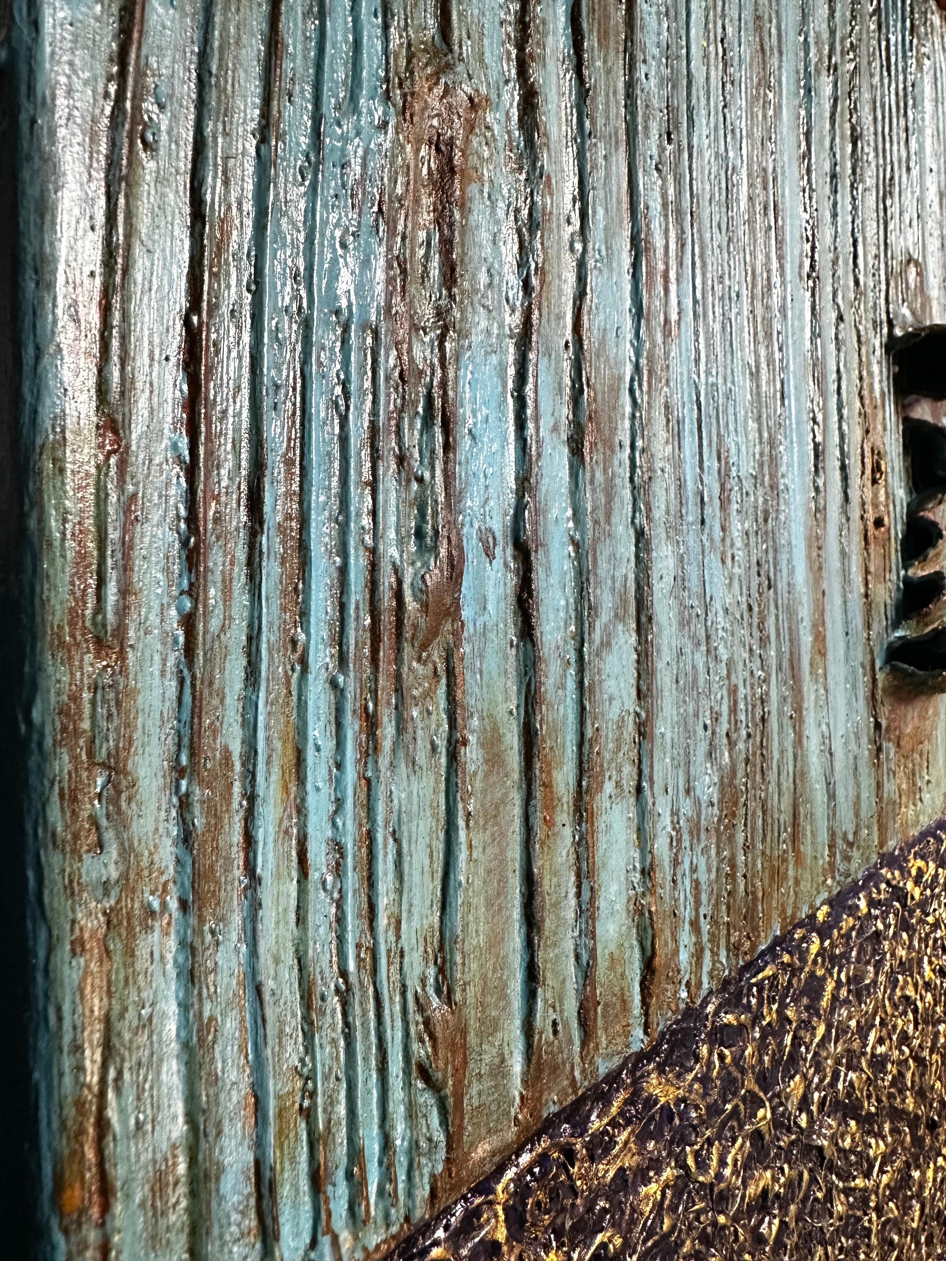 가. 상단 턱들: 구조적 장벽 상단 70%는 모델링 페이스트에 새겨진 깊은 수직 홈으로 채워져 있으며, 커피가루로 채워지고 젯소로 봉인되었습니다. 이 “턱들”은 편향된 청각, 경제적 질식, 도덕적 검열이라는 사회적 장애물의 거칠고 해진 가장자리를 떠올리게 합니다. 질감이 거칠고 고르지 않아, 작가의 설명처럼 무시된 목소리가 통합된 느낌을 줍니다. 좌상단의 직사각형 틀(창문이나 열쇠구멍일 가능성)은 차단된 인식을 암시하며, 다른 곳의 촉각적 밀도와 극명한 대비를 이룹니다. 이 영역은 심리적·정치적 문을 설정하며, 관람자에게 강요된 제약에 맞서 대면하라고 촉구합니다.