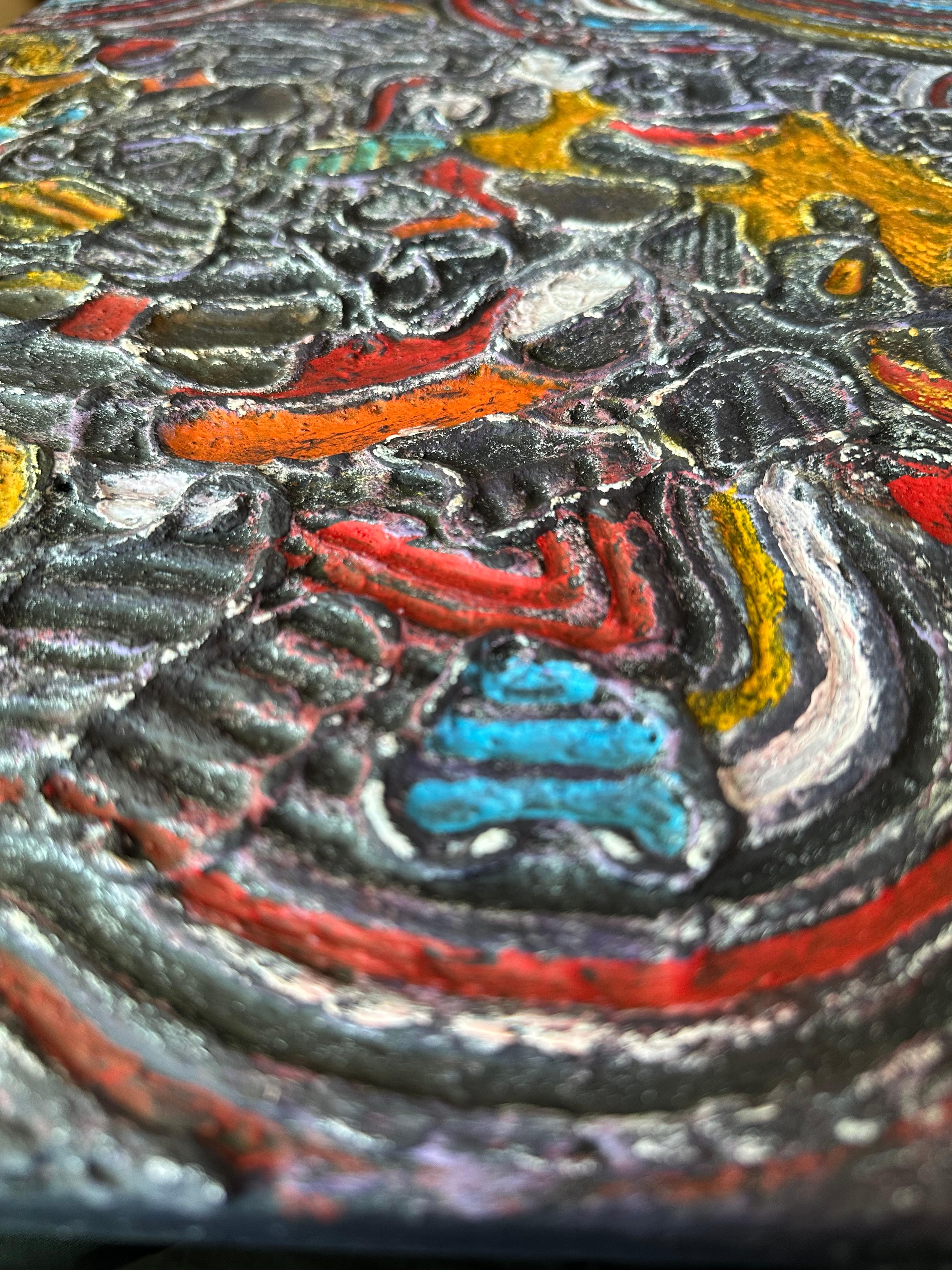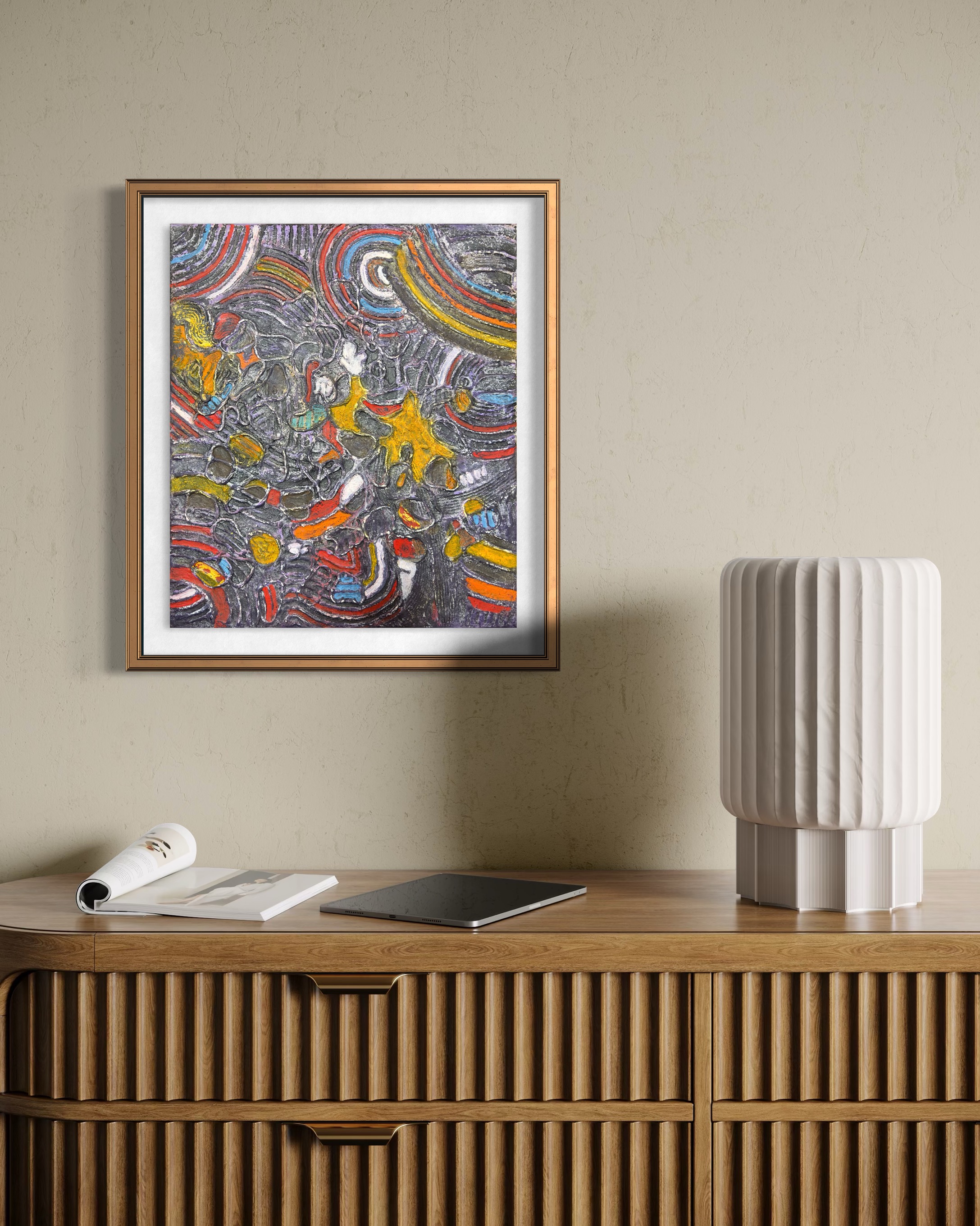 Upon this corroded ground, the artist fixes intensely saturated pigments that appear not as colors but as events: deep yellow erupting like sudden clarity, orange like alarm signals, red like irreversible consequence, sky blue like fleeting hope or momentary respite, white like the breath held before collision. These pigments are not blended or nuanced into smooth transitions. They appear as concentrated eruptions—raw pigments locked onto corrupted substrate, each carrying explicit psychological weight in the artist's vocabulary of meaning.