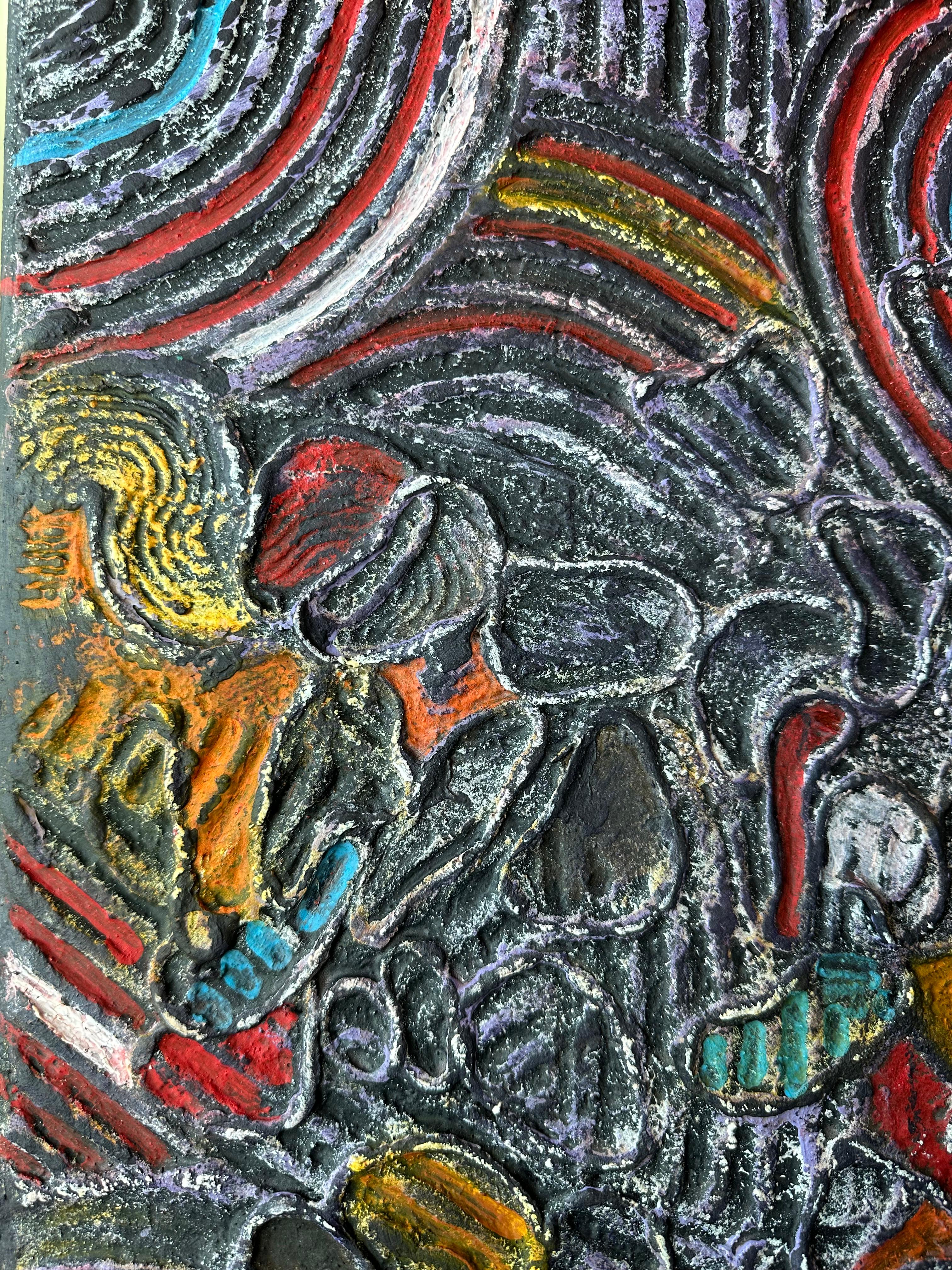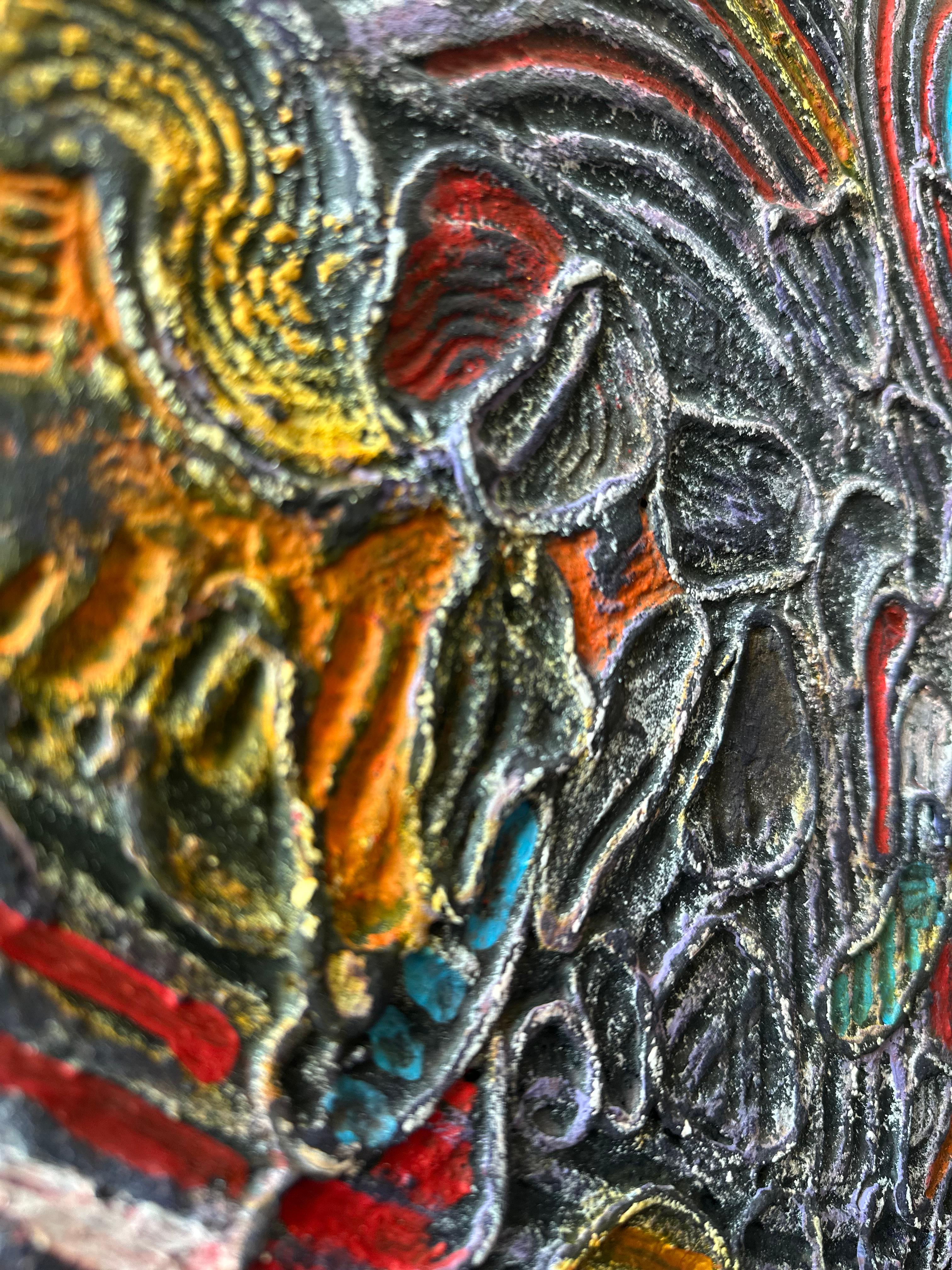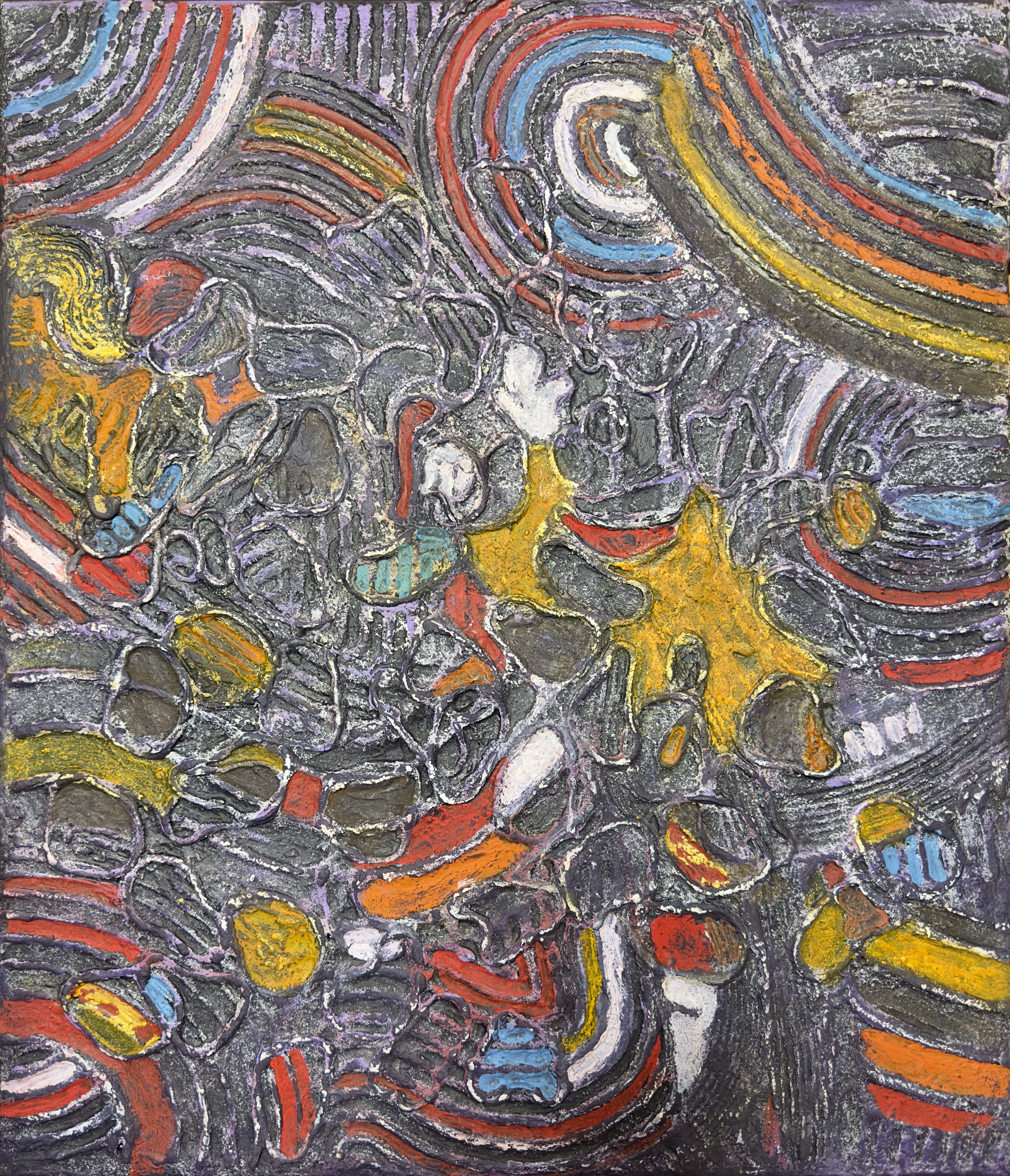 Mixed media on canvas (acrylic pigment, oil pastel, rubber bands, modeling paste, corrosion paint )