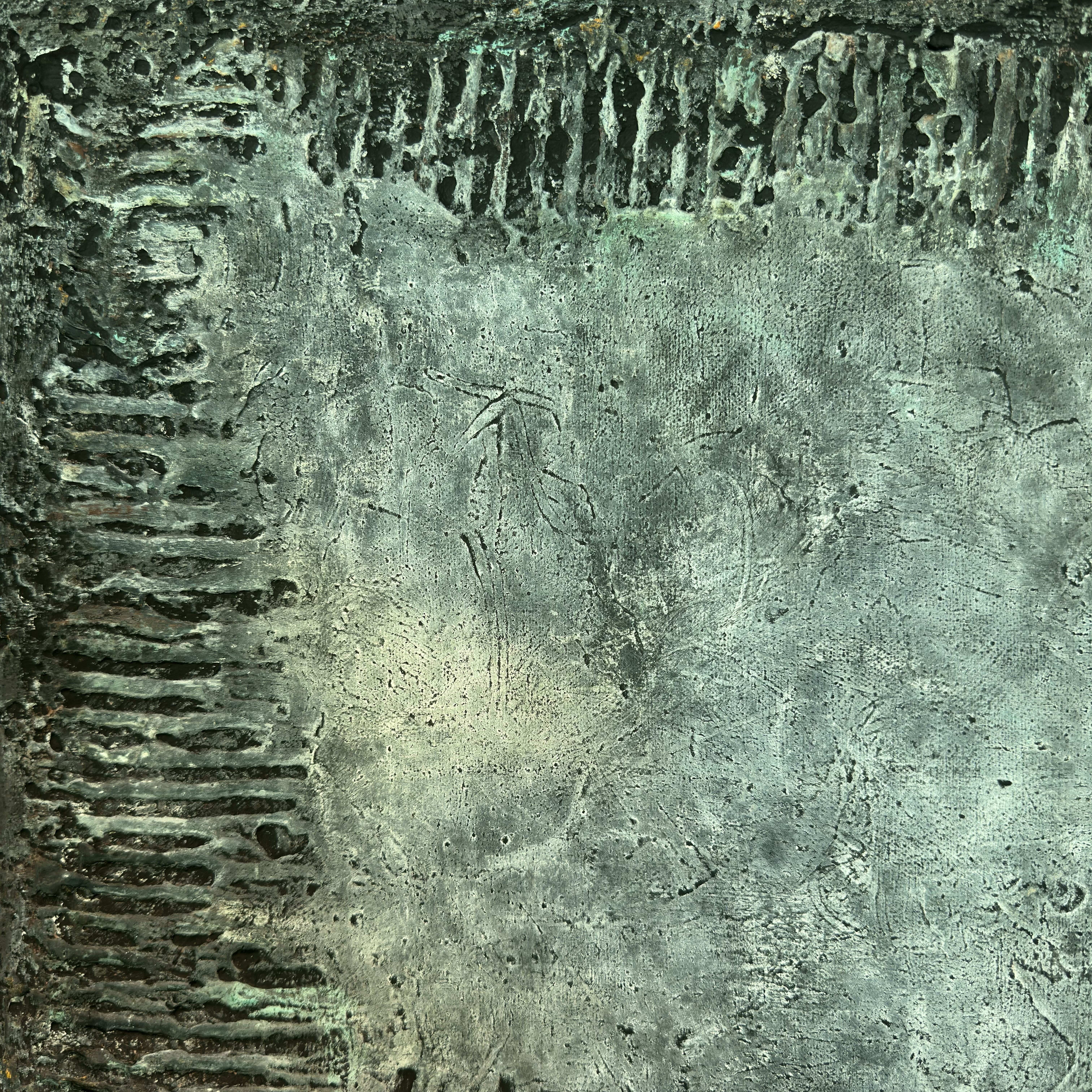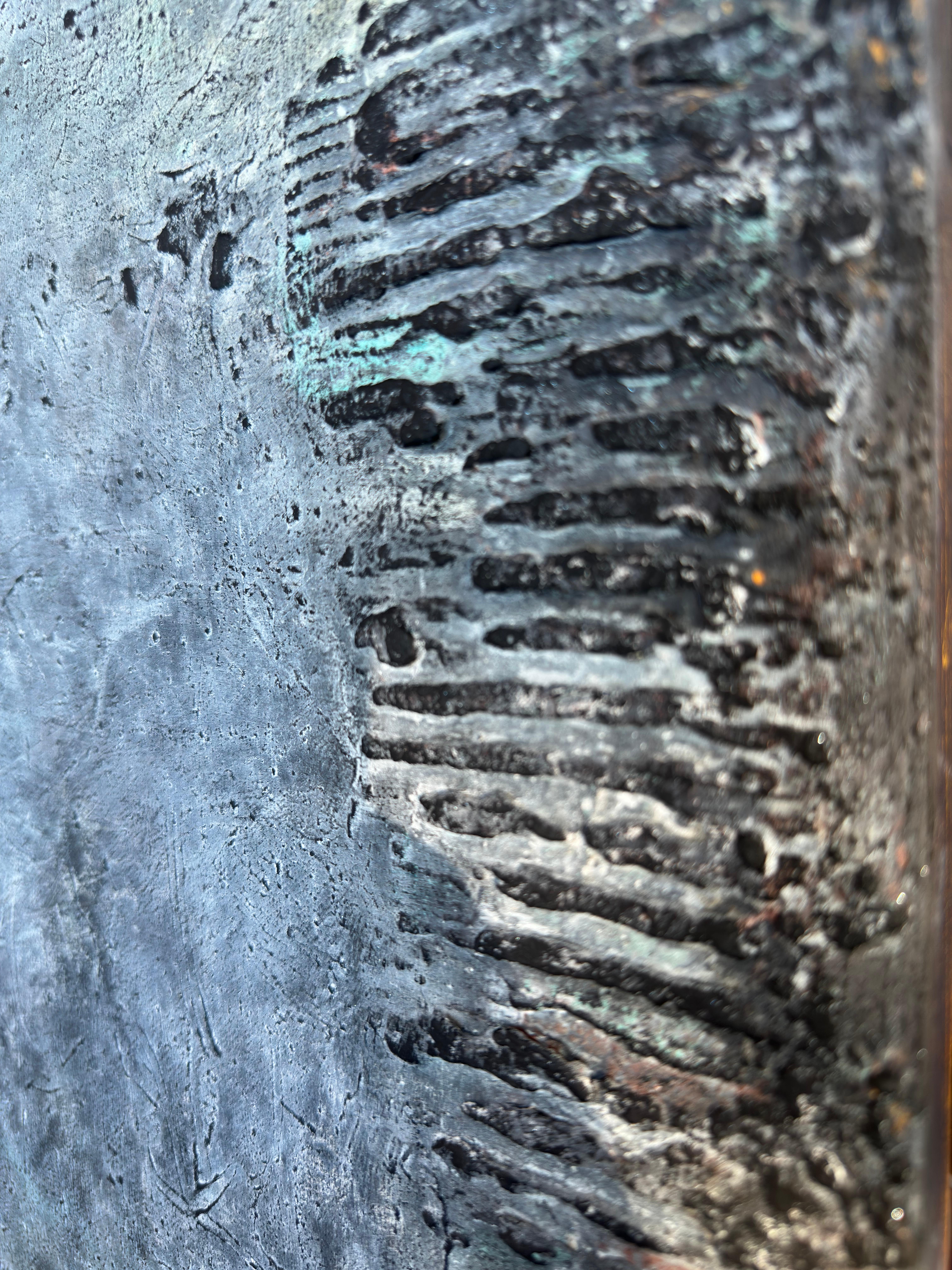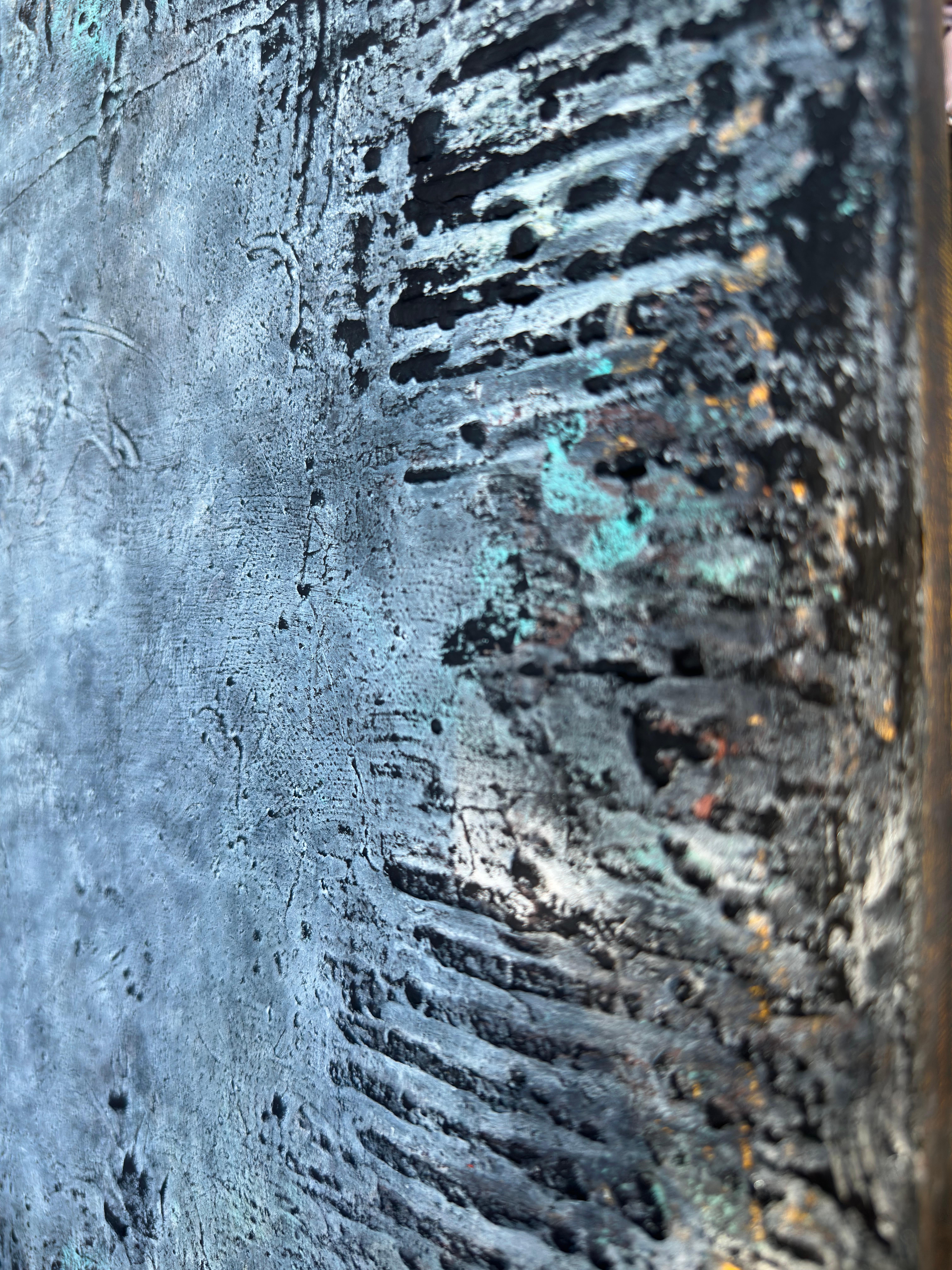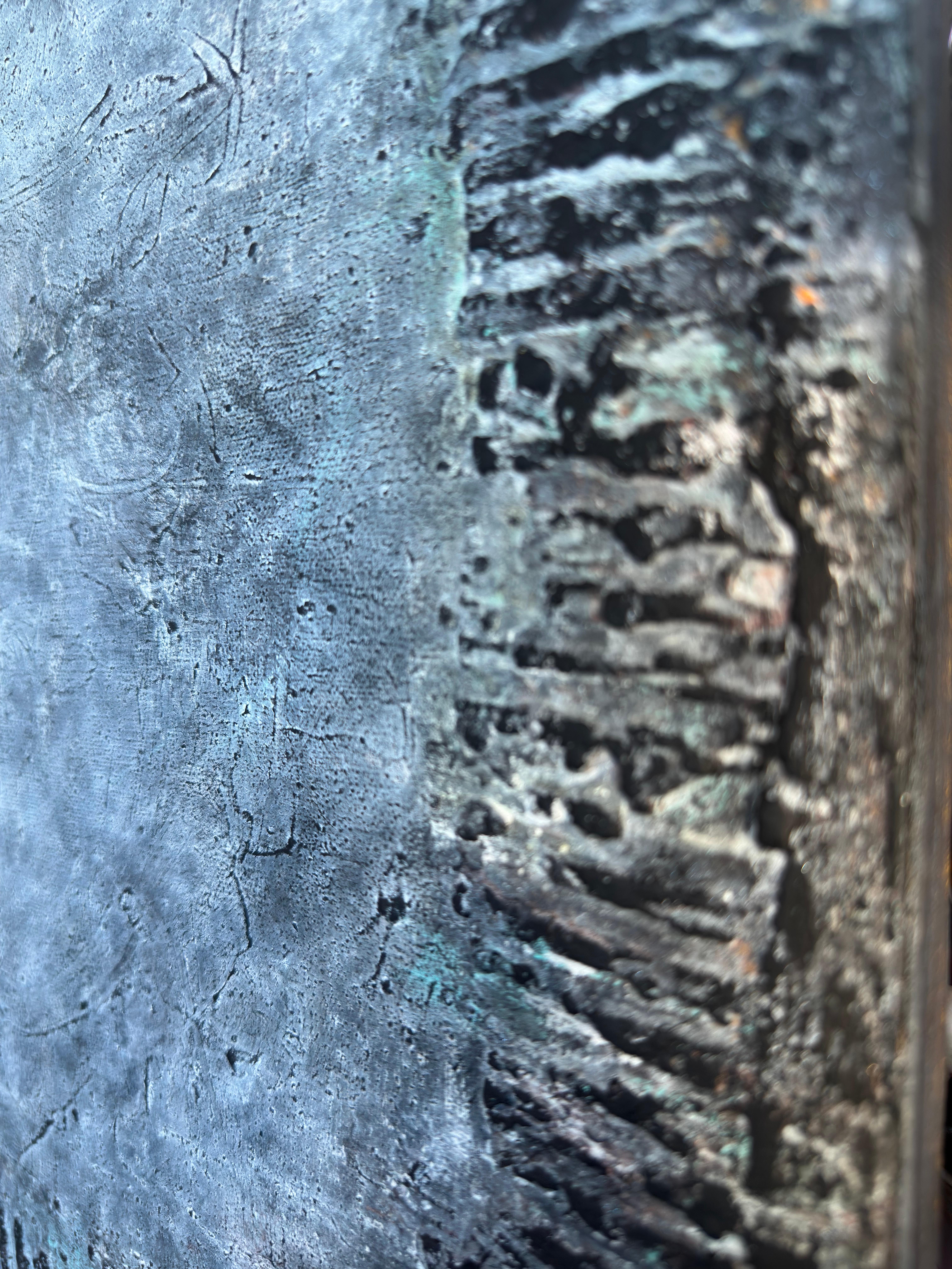 Mixed media on canvas (modeling paste, acrylics, layered oxidation)
