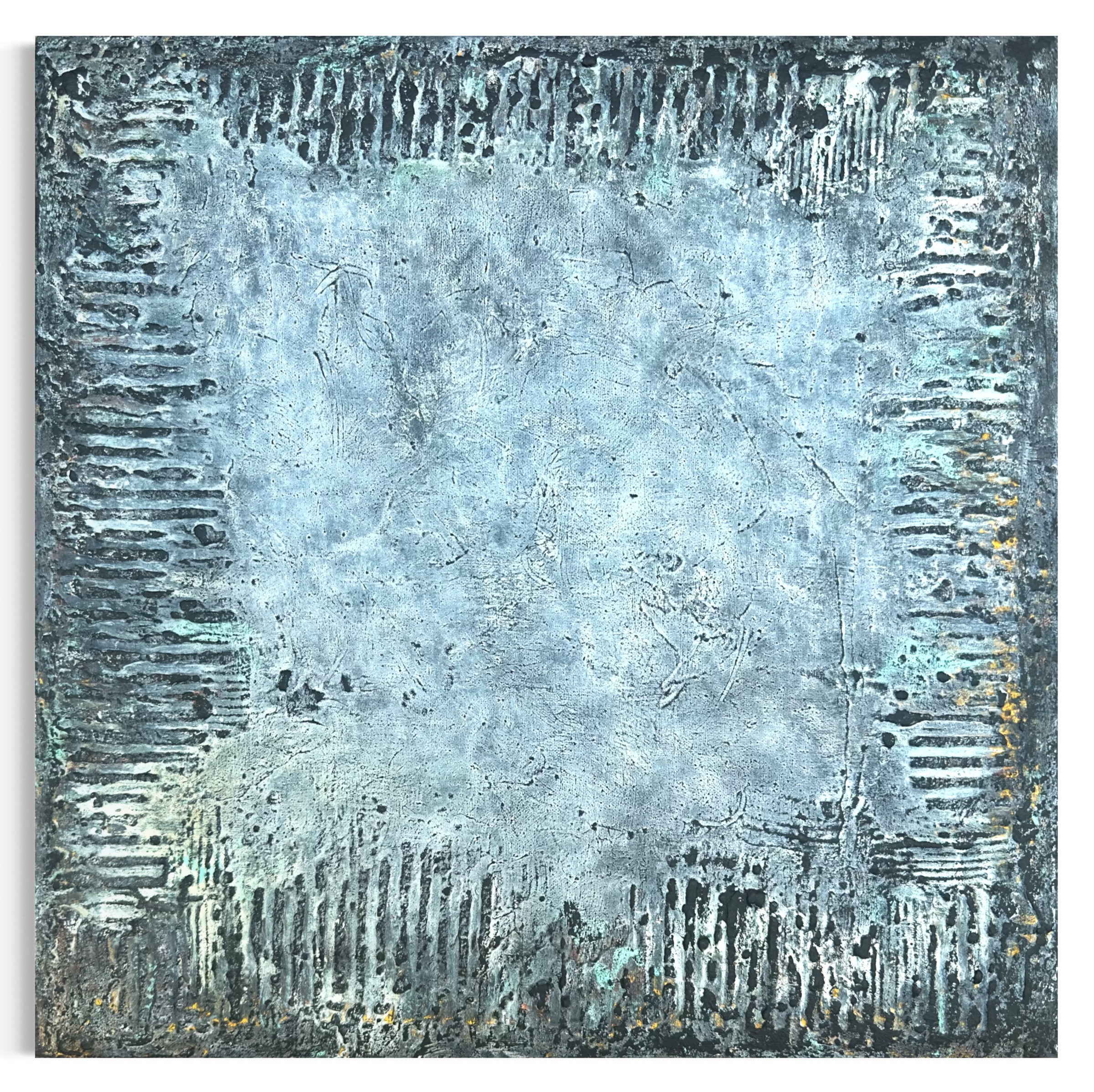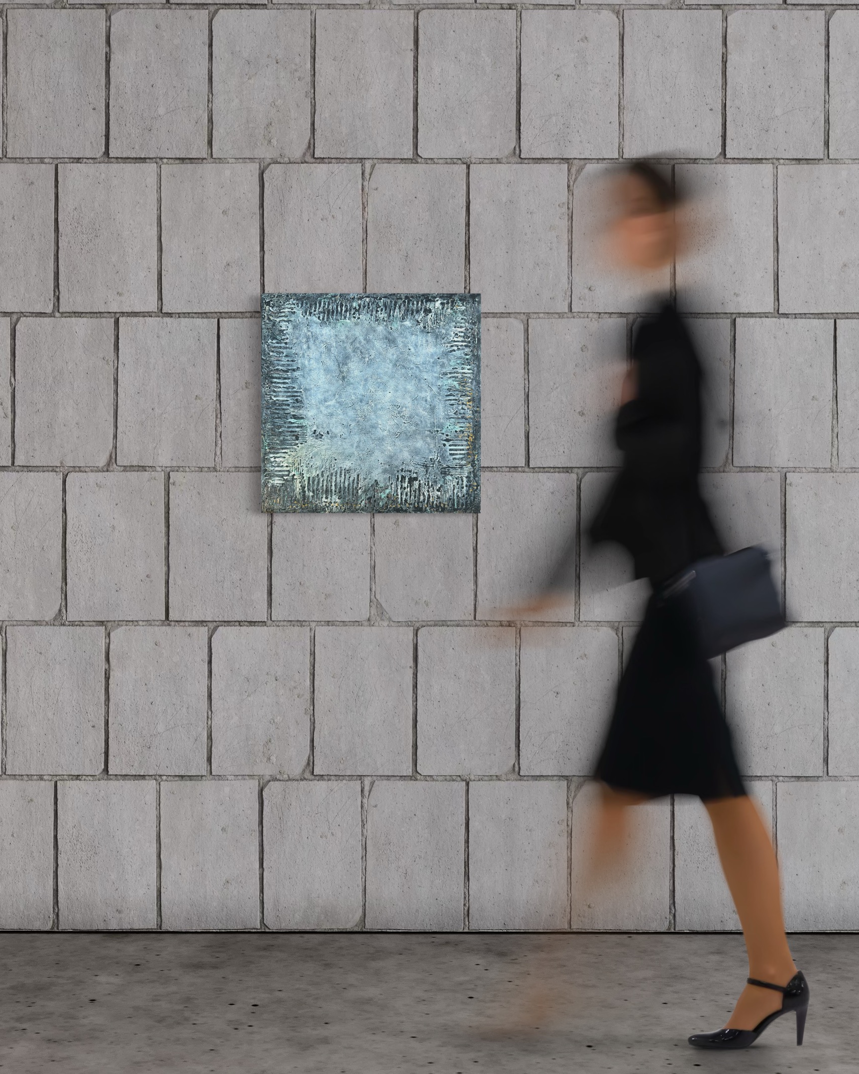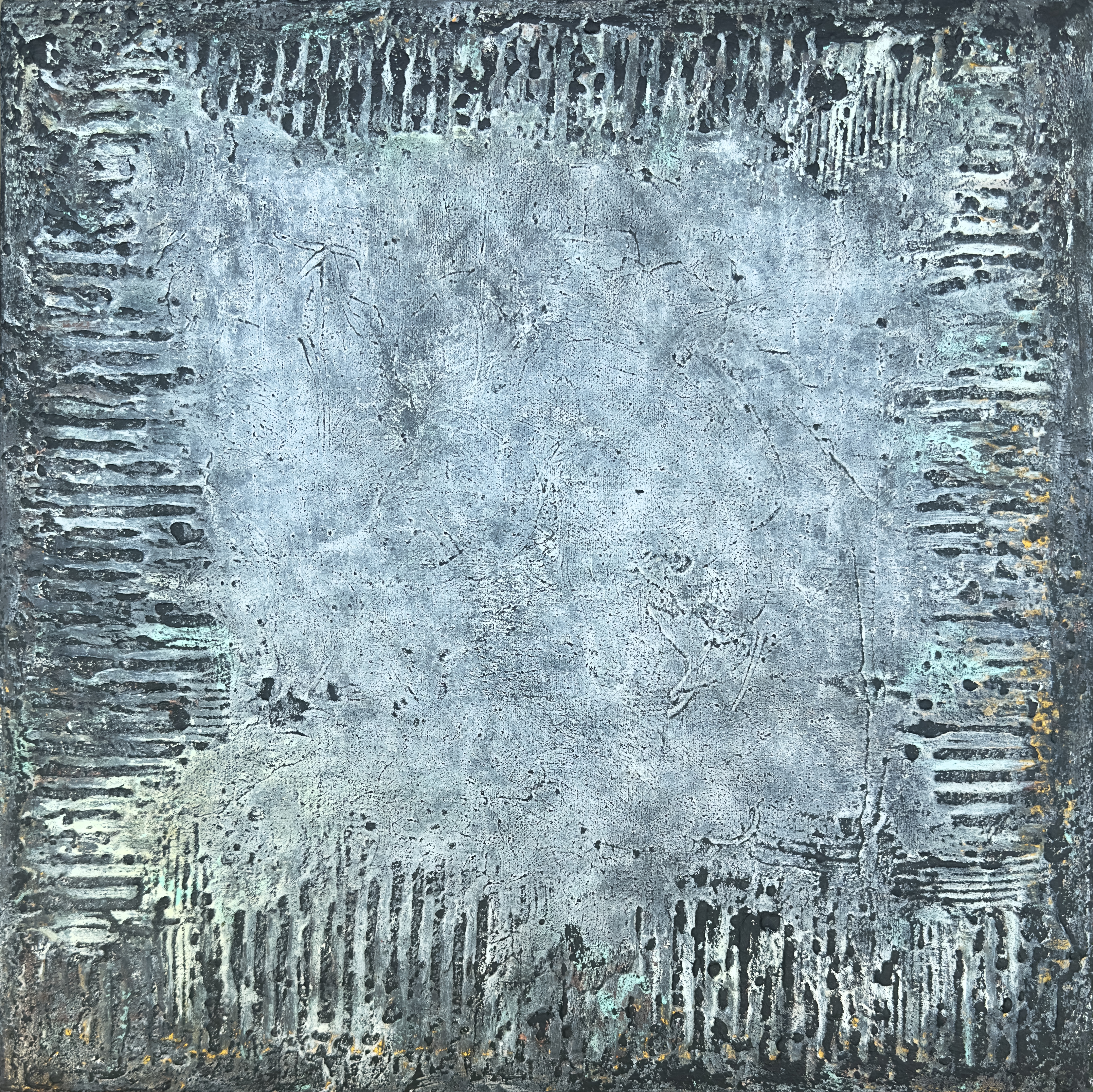 The 45×45cm square establishes a non-hierarchical space. Within this democratic container, the artist performs a "technique of entombment." A yellow base coat—representing youthful passion—is deliberately buried beneath white (idealism), cement gray (doubt), and oxidizing patina (adaptation). Each layer remains partially visible through the next, creating "stratigraphic opacity." The carved borders function as a tally system, marking the erosion of certainty not as a loss, but as an accumulation of texture.
