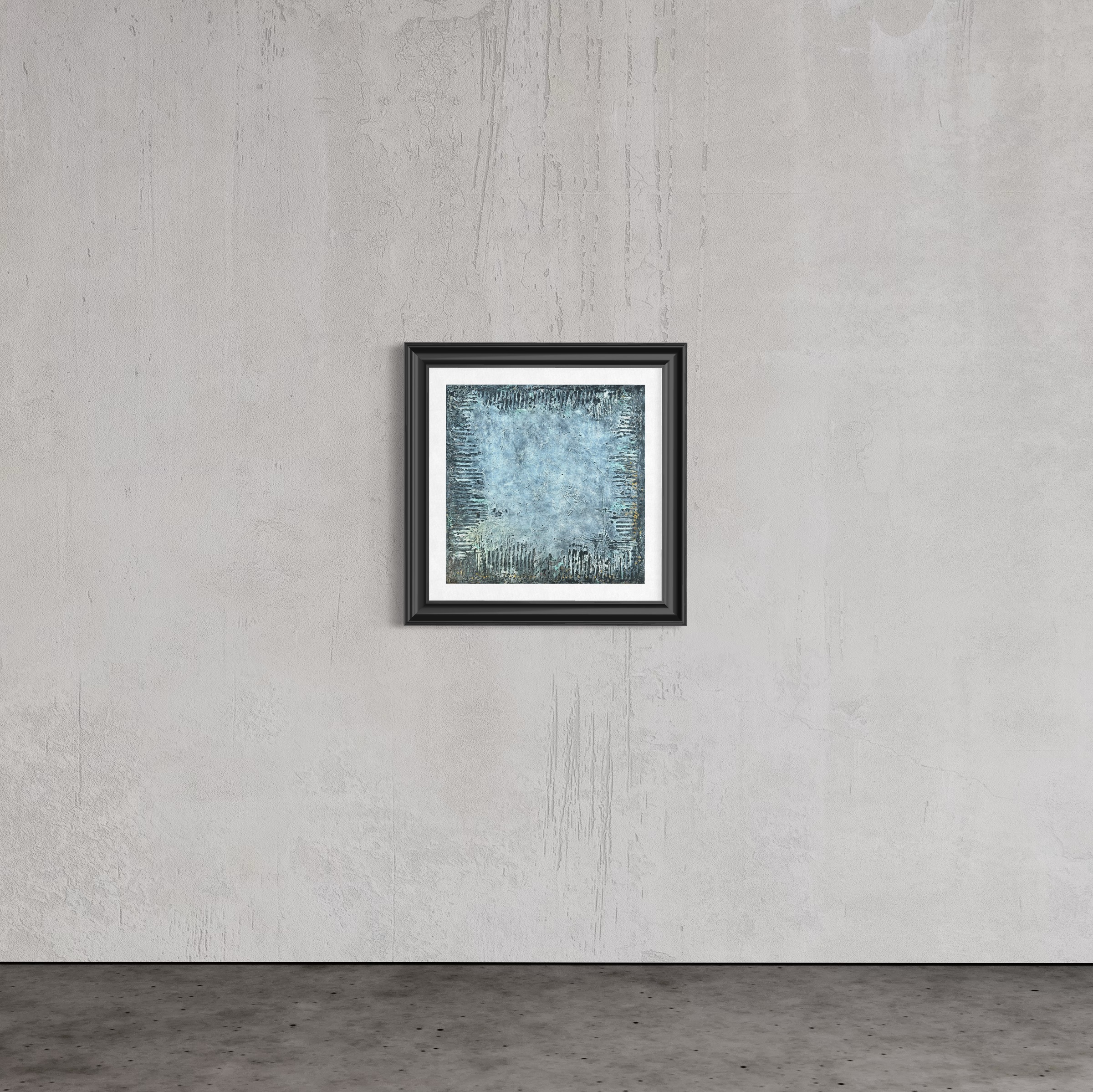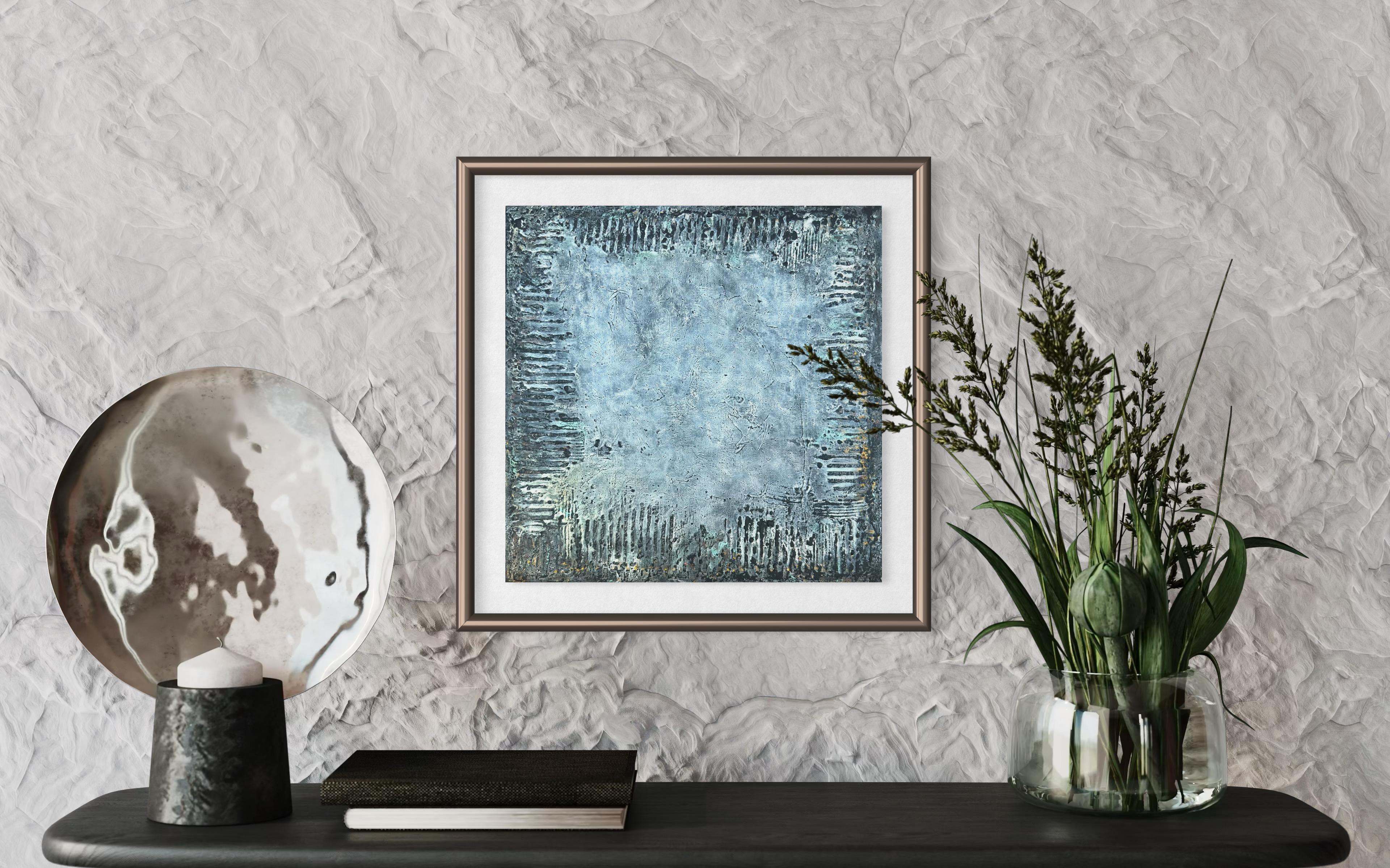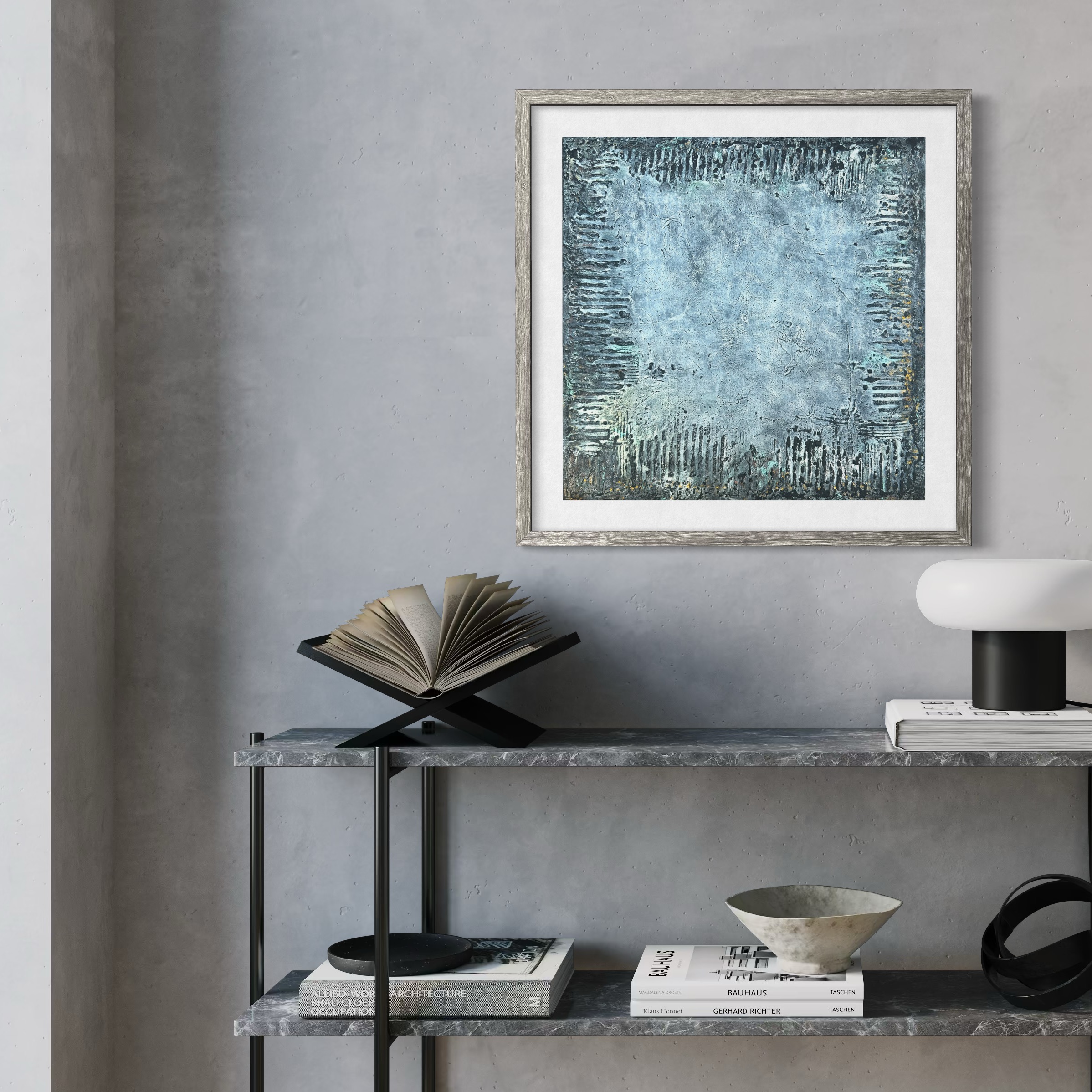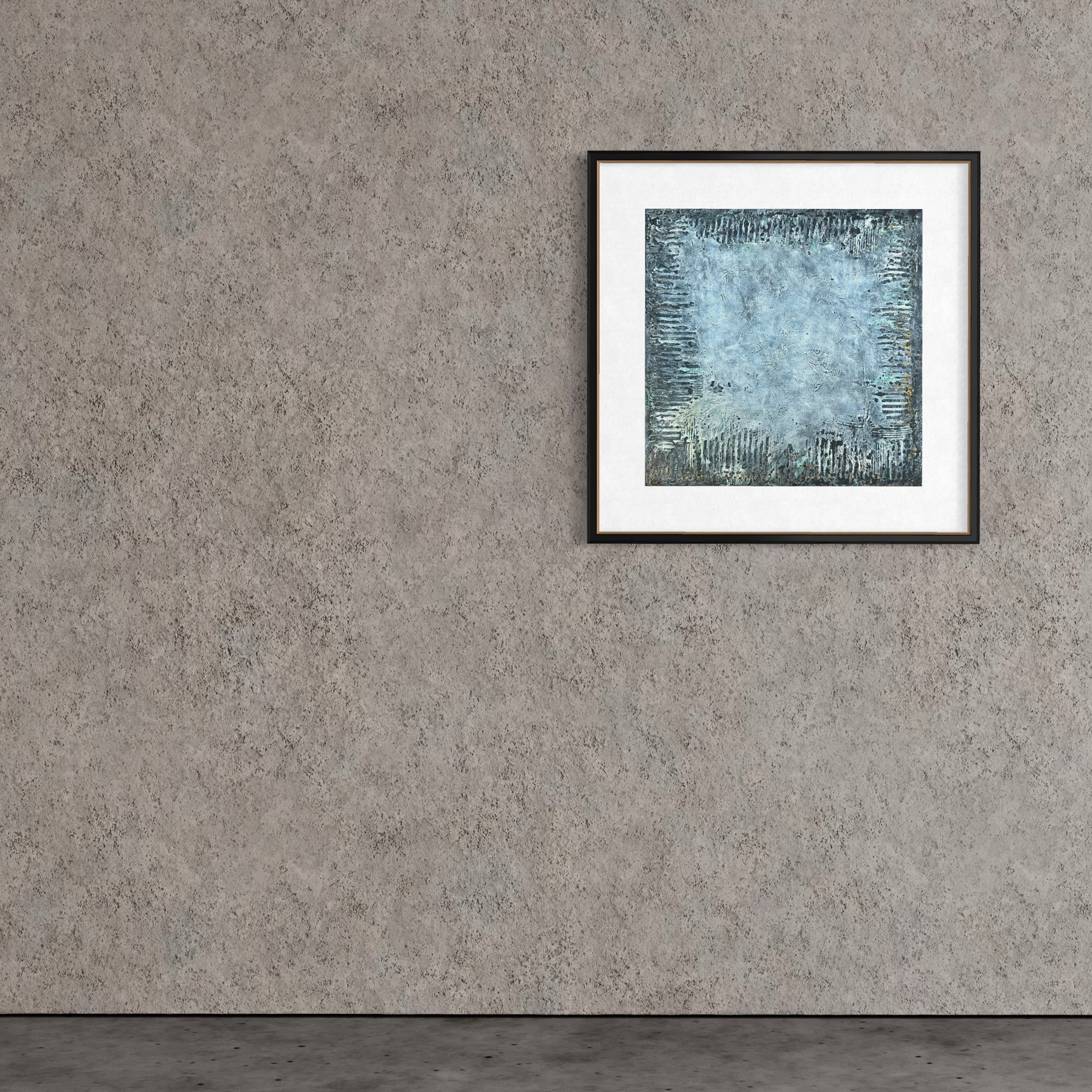 The 45×45cm square establishes a non-hierarchical space. Within this democratic container, the artist performs a "technique of entombment." A yellow base coat—representing youthful passion—is deliberately buried beneath white (idealism), cement gray (doubt), and oxidizing patina (adaptation). Each layer remains partially visible through the next, creating "stratigraphic opacity." The carved borders function as a tally system, marking the erosion of certainty not as a loss, but as an accumulation of texture.