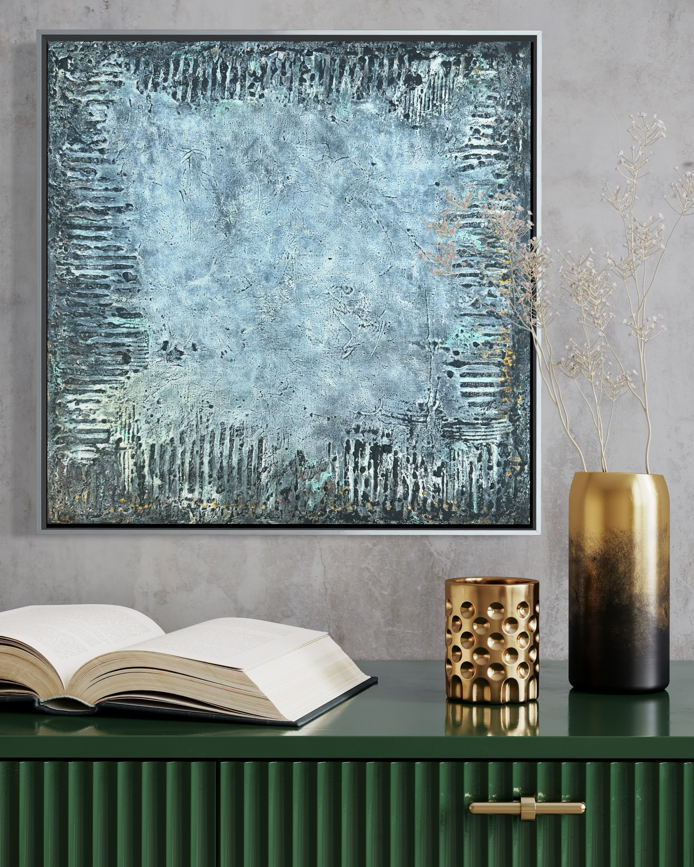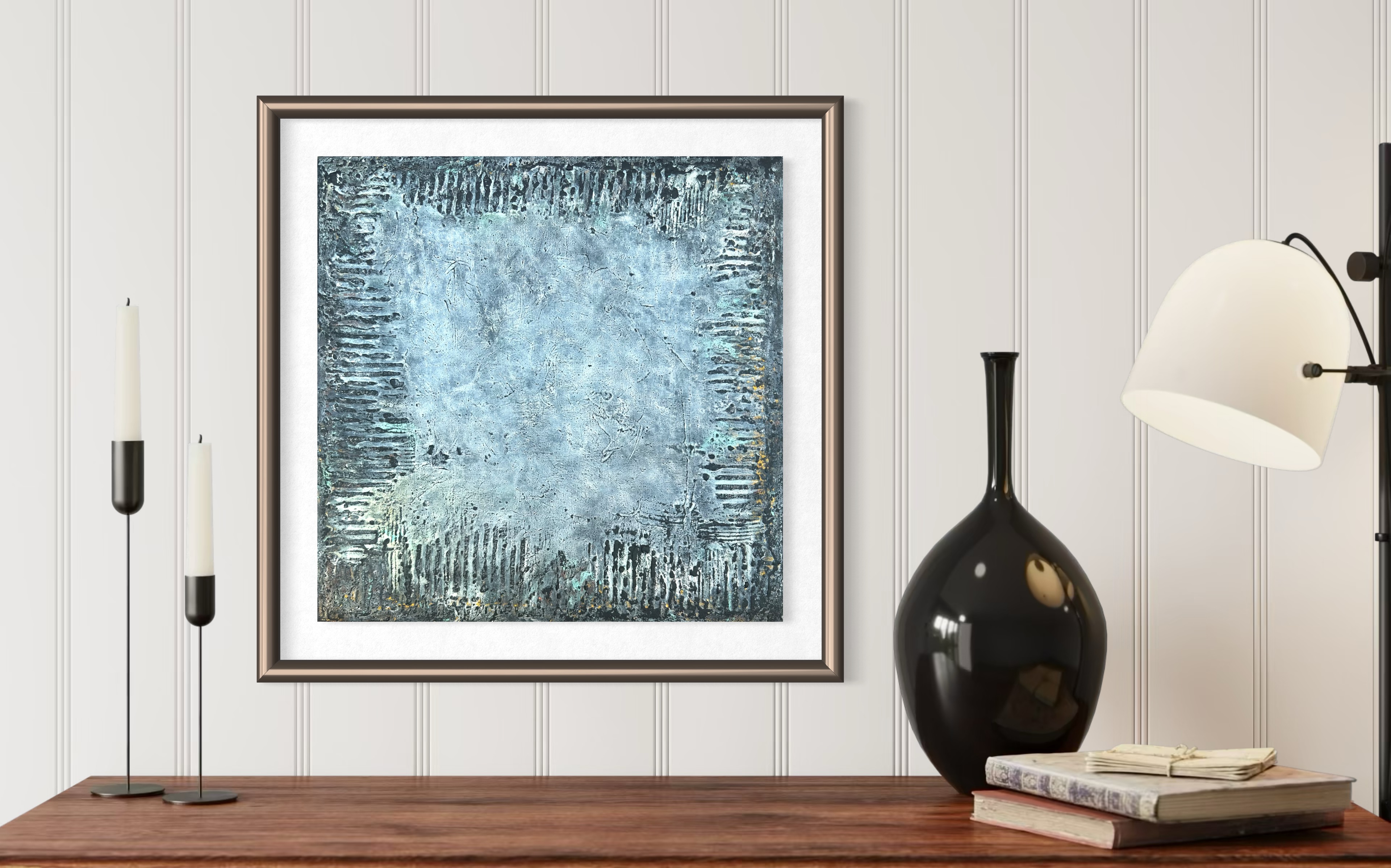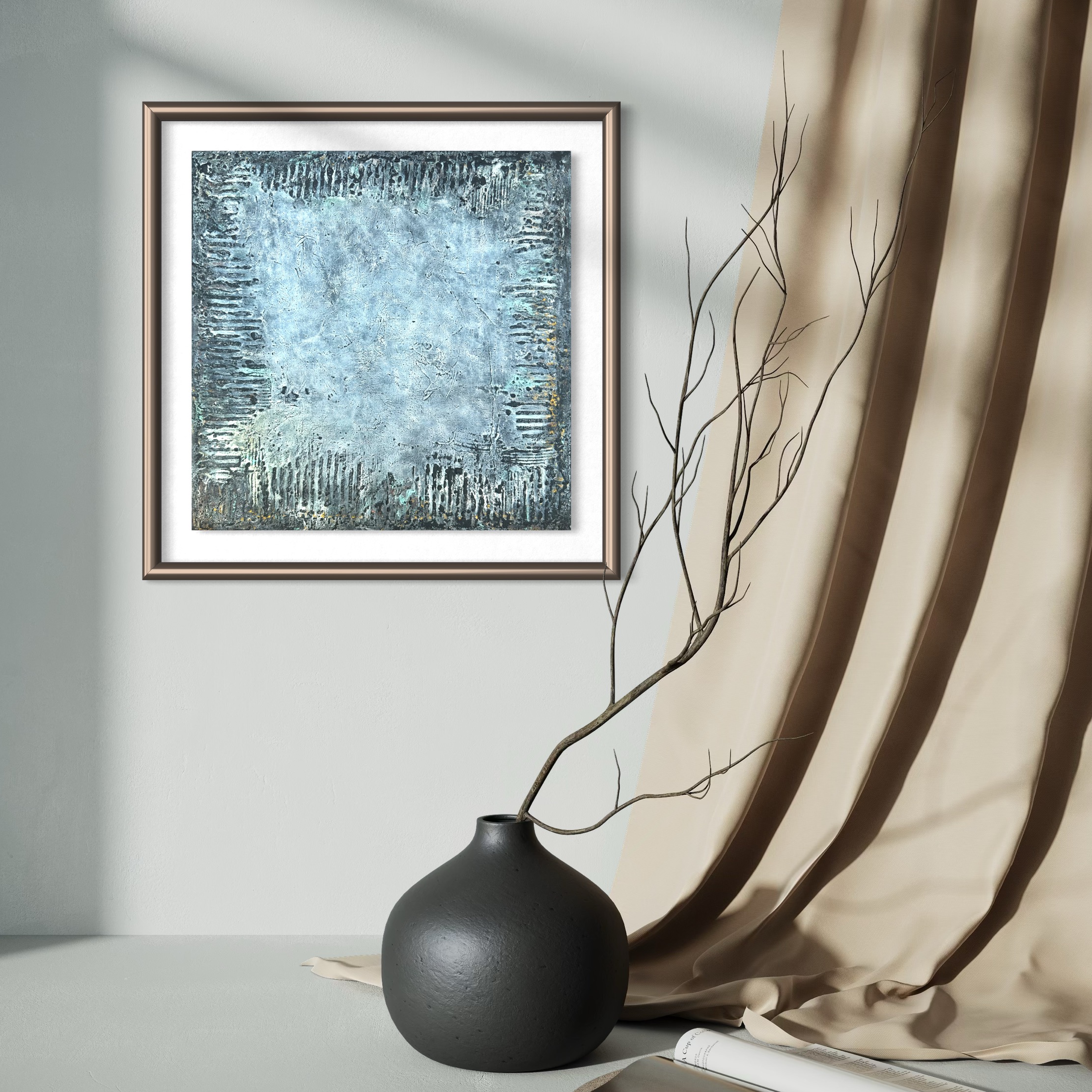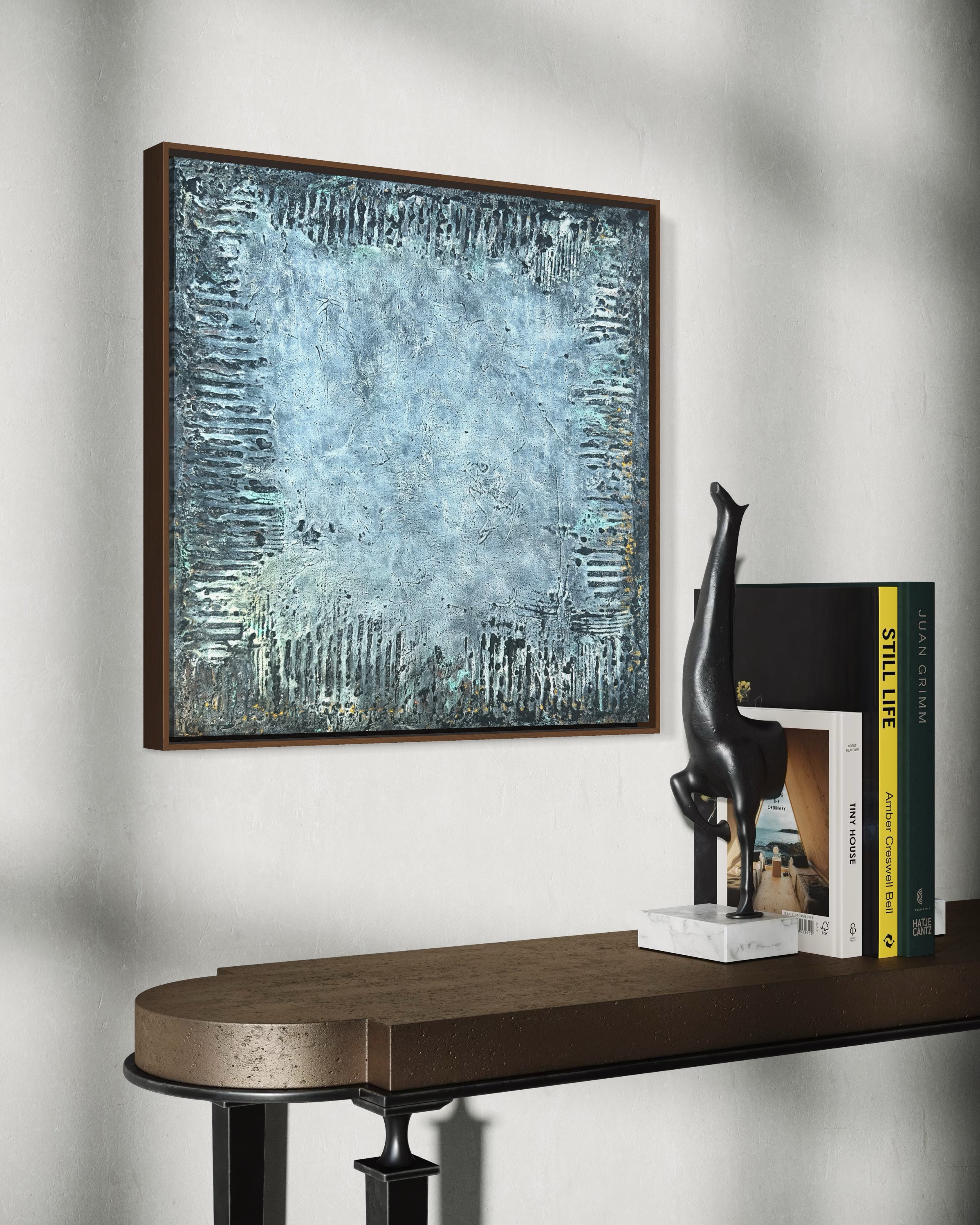 The work does not symbolize aging; it undergoes it. The blue-green oxidation emerges from actual chemical processes rather than applied pigment. Time acts as an active collaborator. Fine cracks spider across the surface, not as flaws, but as "involuntary honesty"—fissures where the buried warmth of the underlayer reasserts itself. The painting creates a foundation of trust: it does not pretend, it simply is what its making made it become.