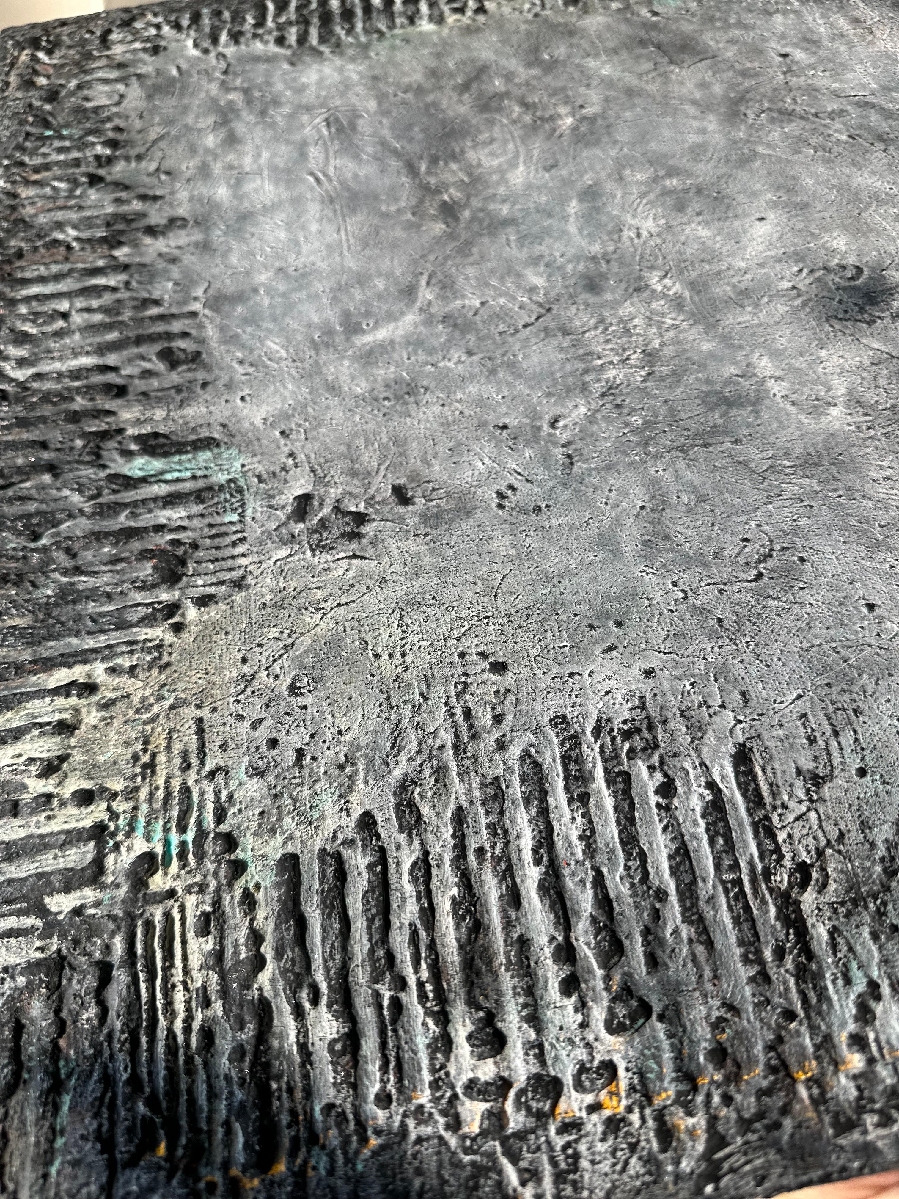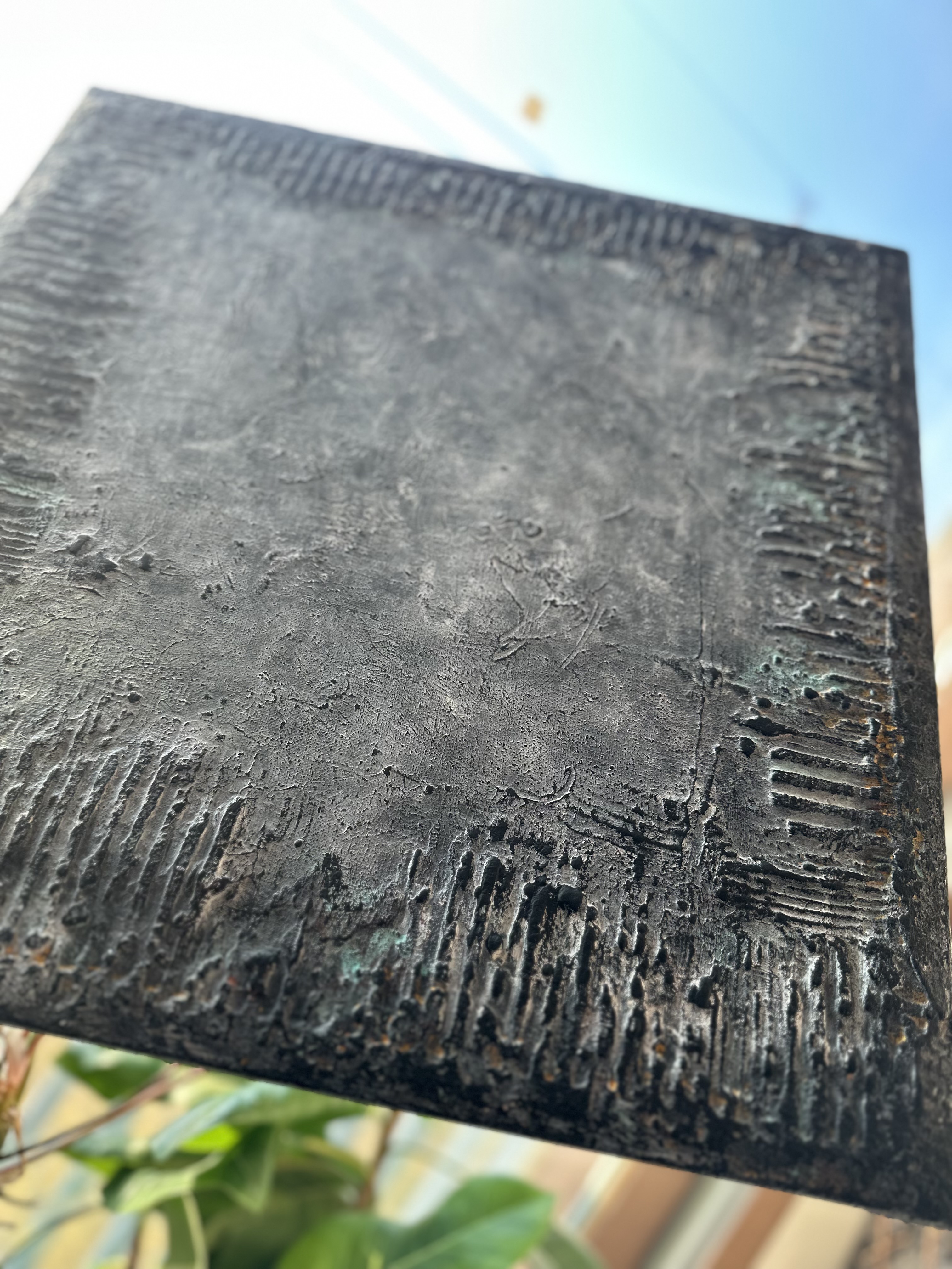 Youth sees the world in black and white—absolute and certain. Age reveals the infinite terrain between them. In this 45cm square, I systematically buried yellow passion beneath white ideals, cement doubts, and oxidizing patina. The surface is a geological record: borders carved with rhythmic striations tally the passage of time, while chemical oxidation blooms unpredictably like memory breaking through. This work resists the world’s push toward binary extremes. It asserts that truth dwells not in simple answers but in the "spectrum"—the distinct, demanding grays that require us to question rather than conclude. To age well is to resist becoming a single-celled extremist, learning instead to navigate the density of the undefined.