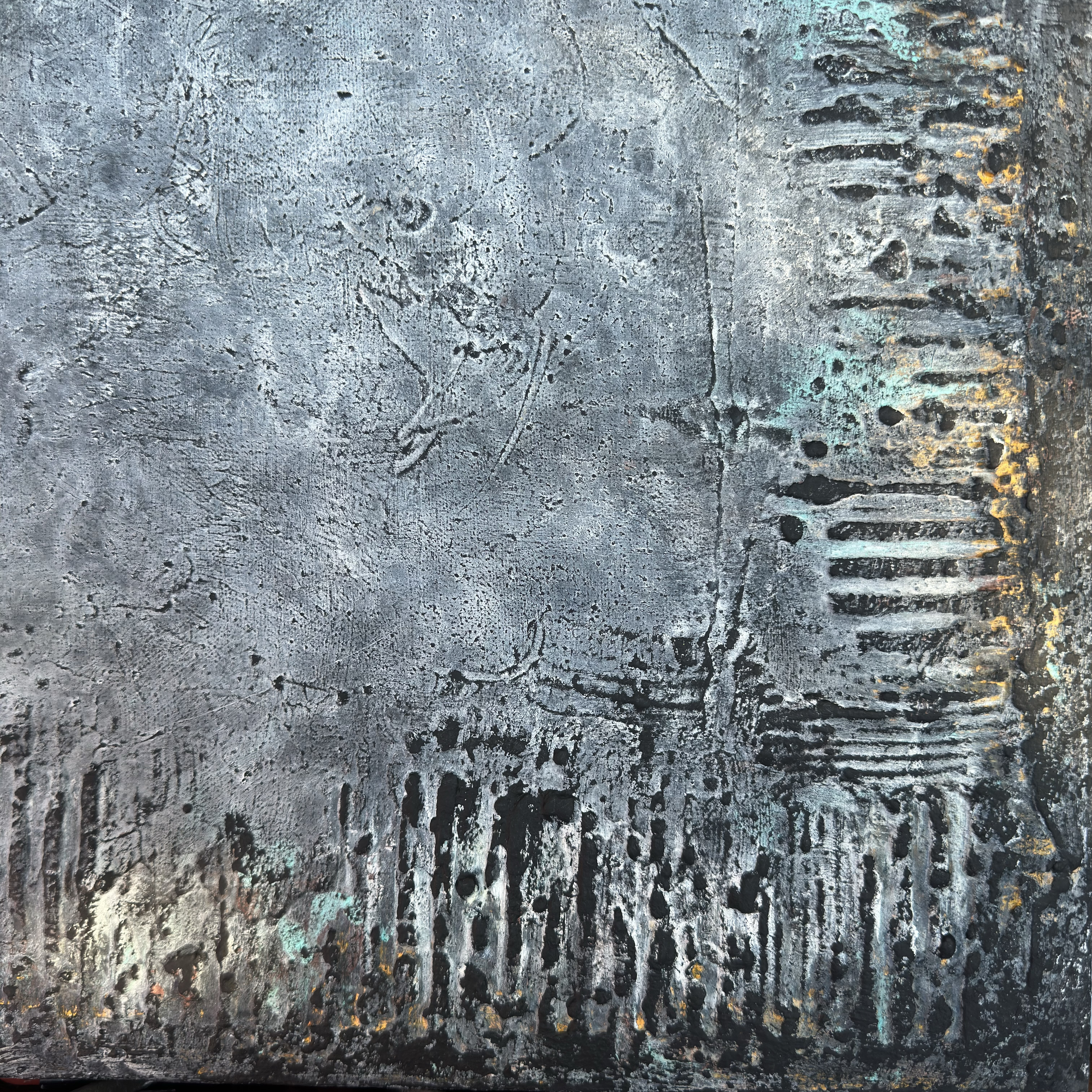 Beneath the surface lies a foundation of yellow, a buried archive of youthful warmth. I covered it systematically: first with white, then with cement grays and tones approaching black. Along the borders, I carved vertical striations into wet modeling paste—a ritual of tallying accumulated days and doubts. The surface breathes through fine cracks, involuntary openings that reveal the underlayers.