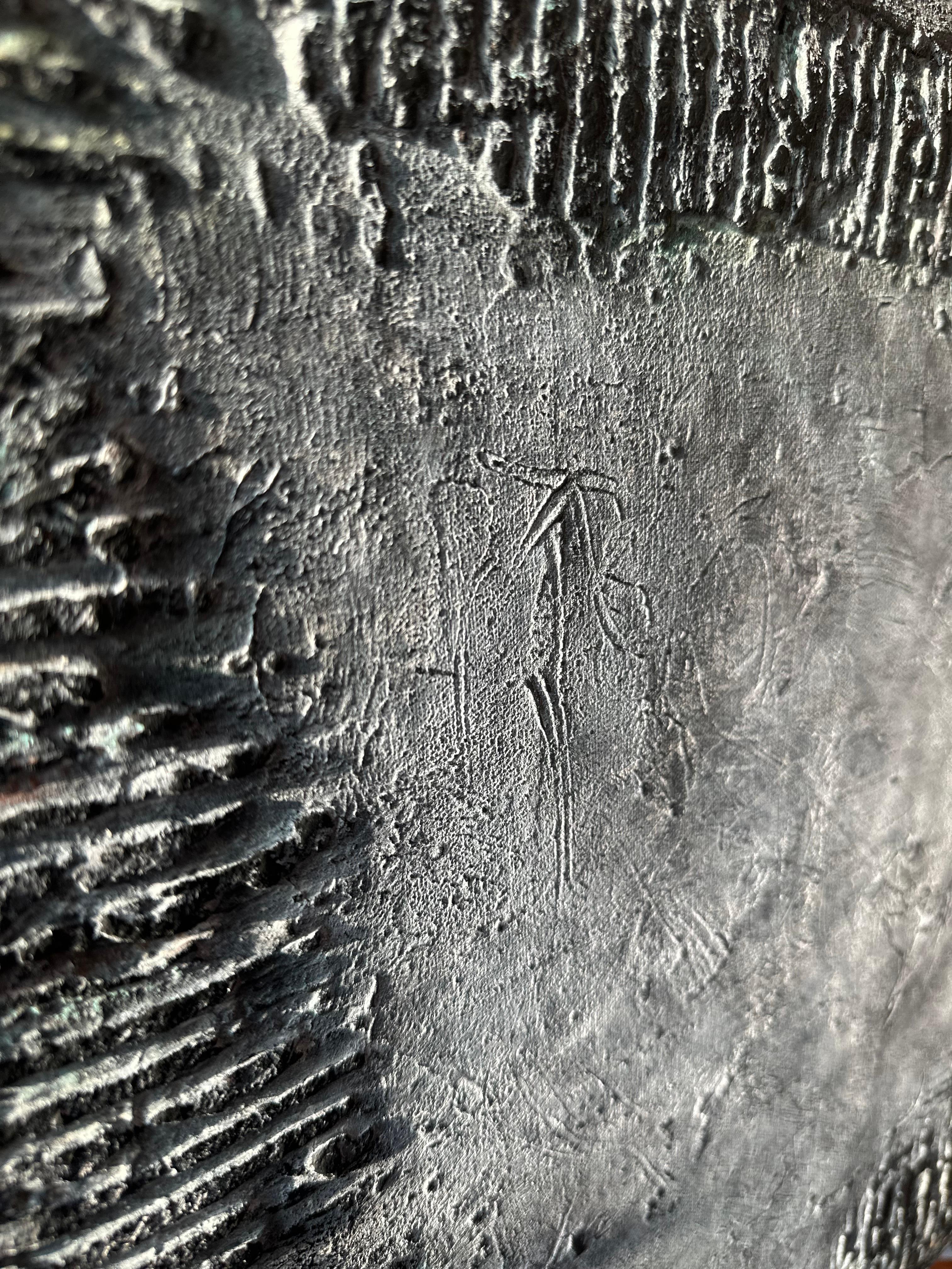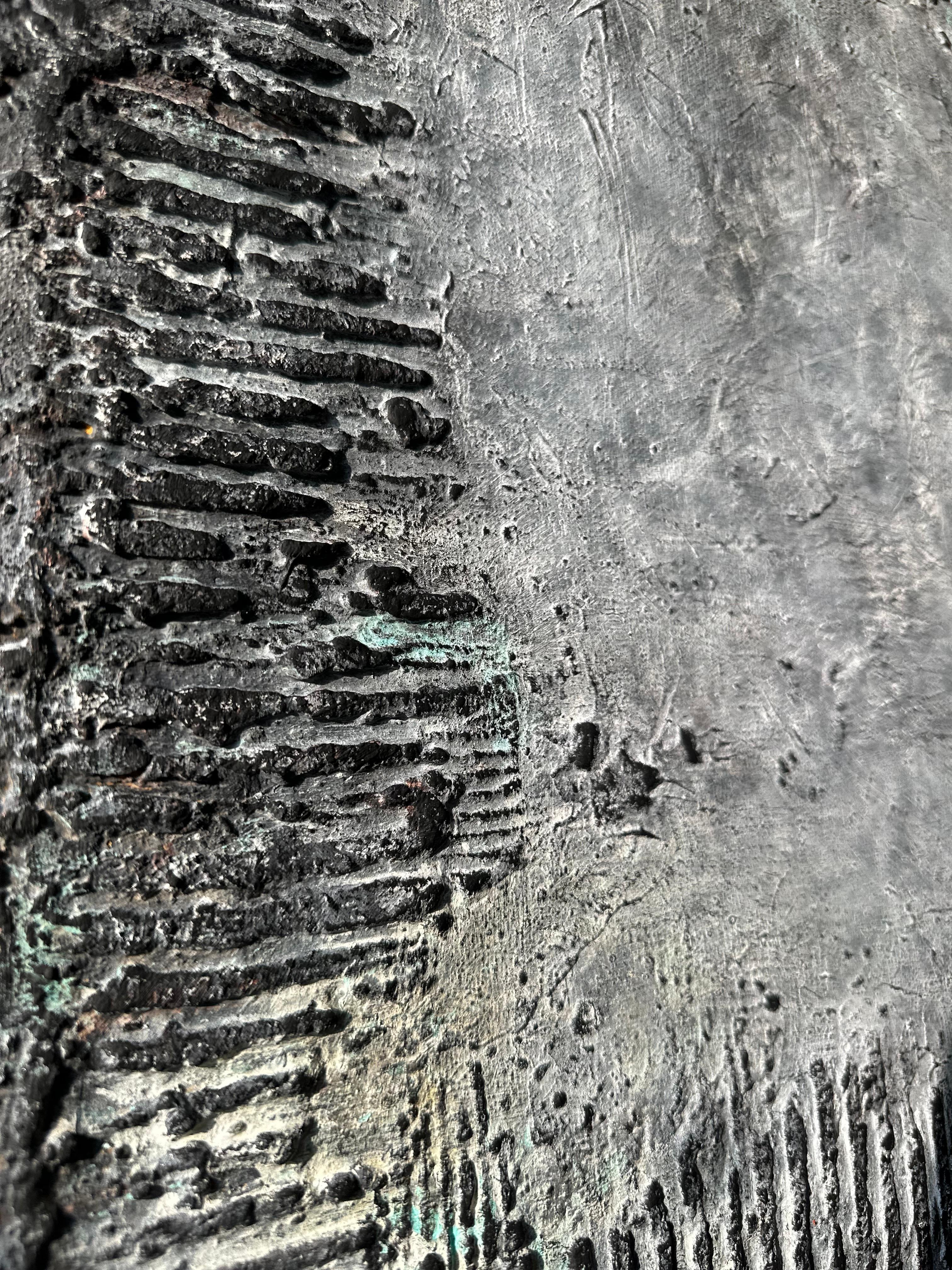 표면 아래에는 젊은 날의 온기인 노란색이 매장되어 있다. 나는 그것을 흰색, 시멘트 회색, 그리고 흑에 가까운 톤으로 체계적으로 덮었다. 가장자리의 젖은 모델링 페이스트에는 수직 줄무늬를 새겼다. 그것은 쌓여가는 날들과 의심을 세는 제의적 행위다. 표면은 미세한 균열을 통해 숨을 쉬며, 그 비자발적인 틈새로 아래 층의 기억을 드러낸다.