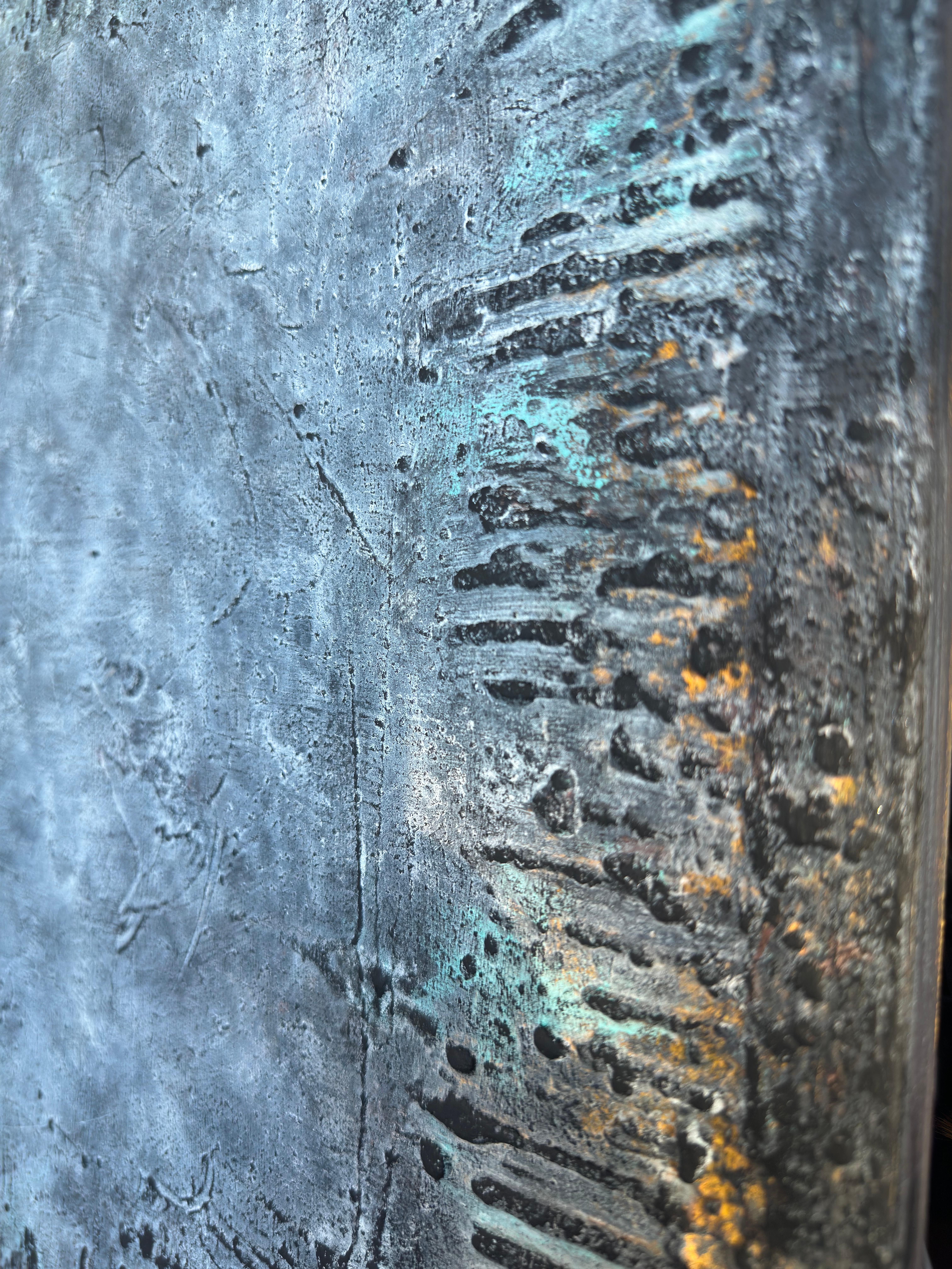 Crucially, the title is Spectrum of Gray, not merely Gray. This demands discrimination. As we age, the world encourages a retreat into binary thinking, but this work insists on specificity. Which gray? How gray? Why this shade? The blue-green oxidation acts as a collaborator, time painting itself onto the canvas through real chemical reactions.