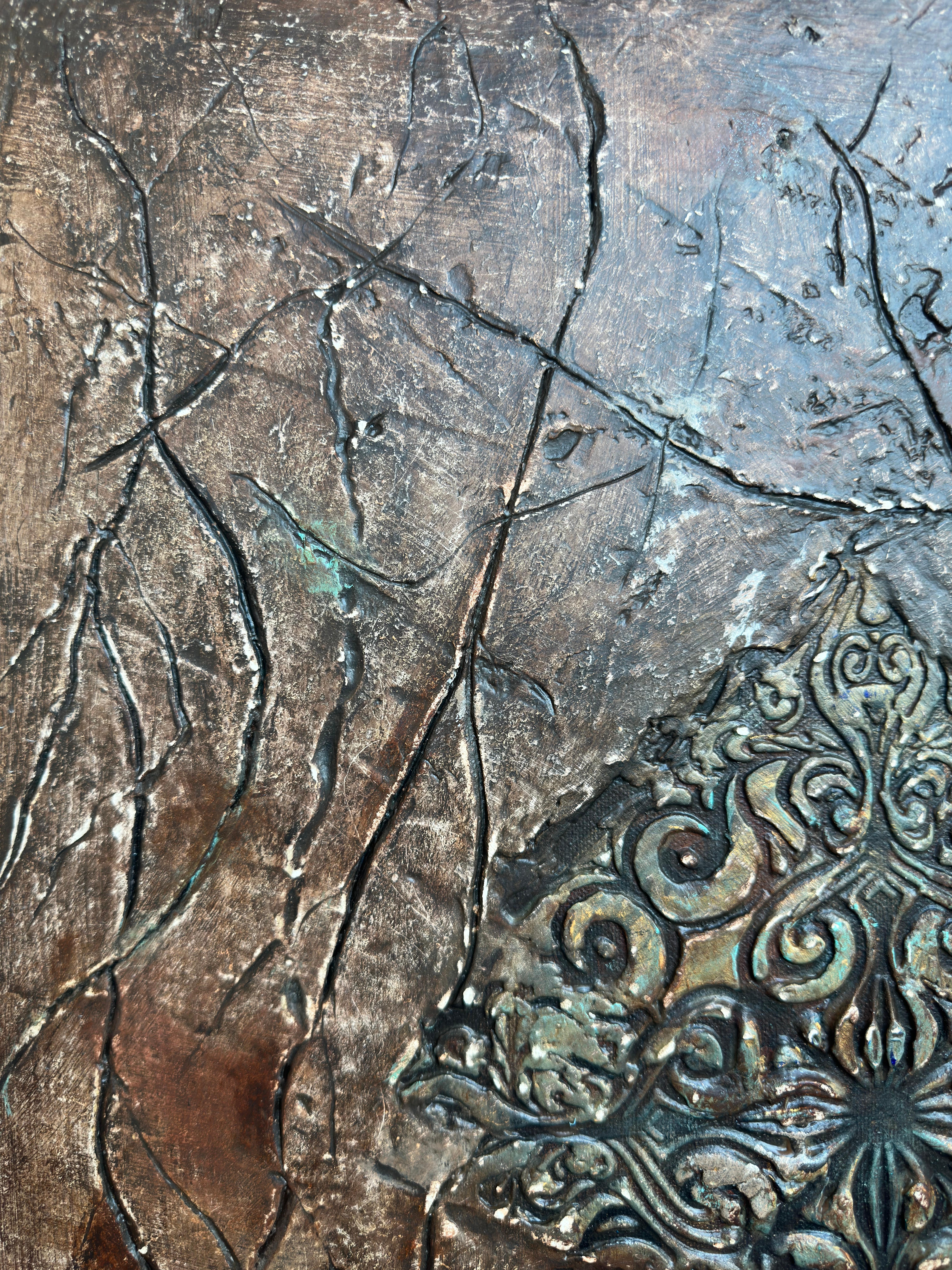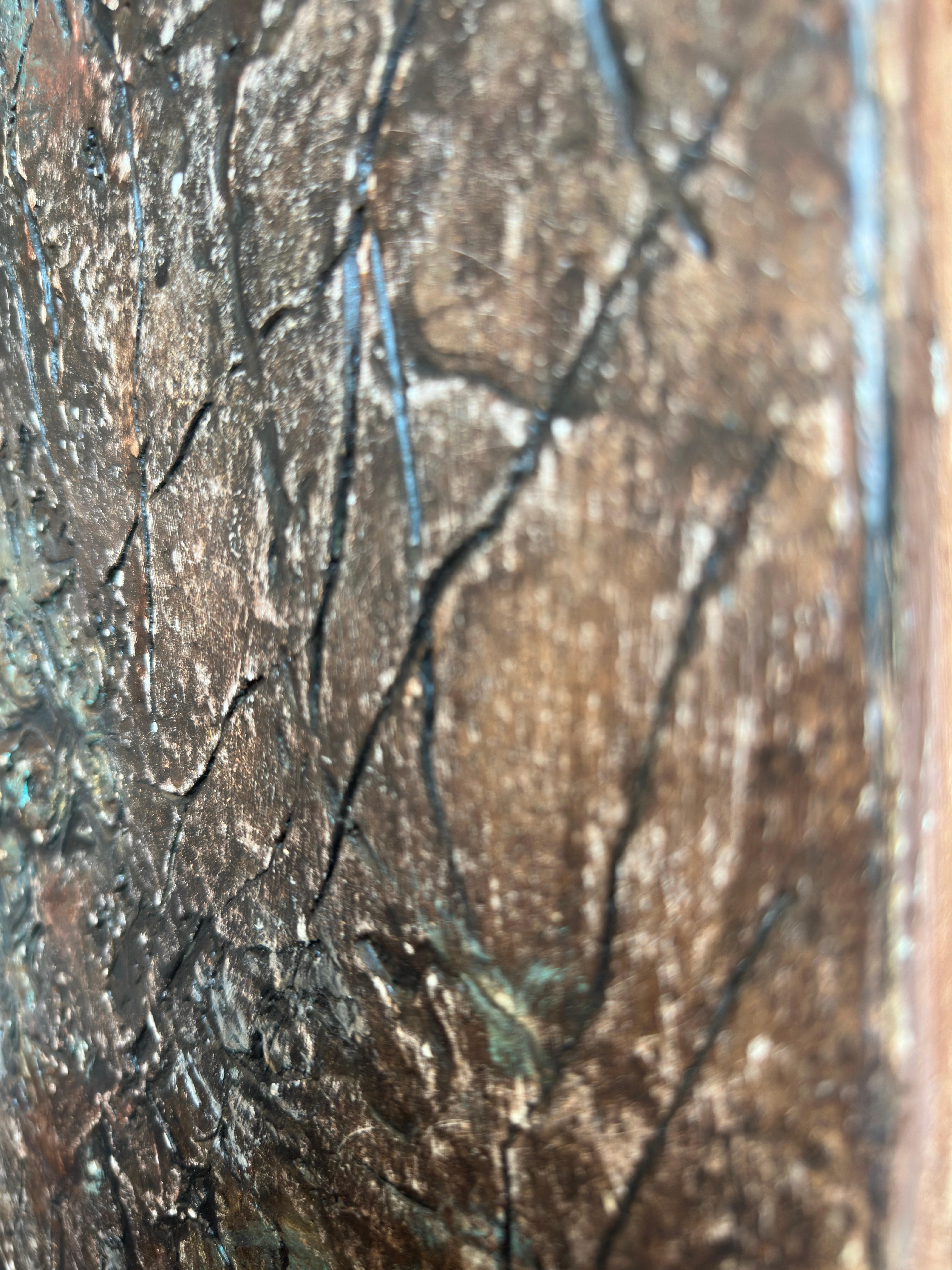 Stand before the canvas and what registers first is texture as violence. The bronze and umber field reads as terrain that has been worked, abandoned, then savagely reworked. Modeling paste built up in 2023 was ground down in 2025—not gently smoothed but abraded, leaving scratches that catch light like scars. This is not the dignified patina of age but evidence of the artist's hand returning, compulsively, to what remained unresolved.