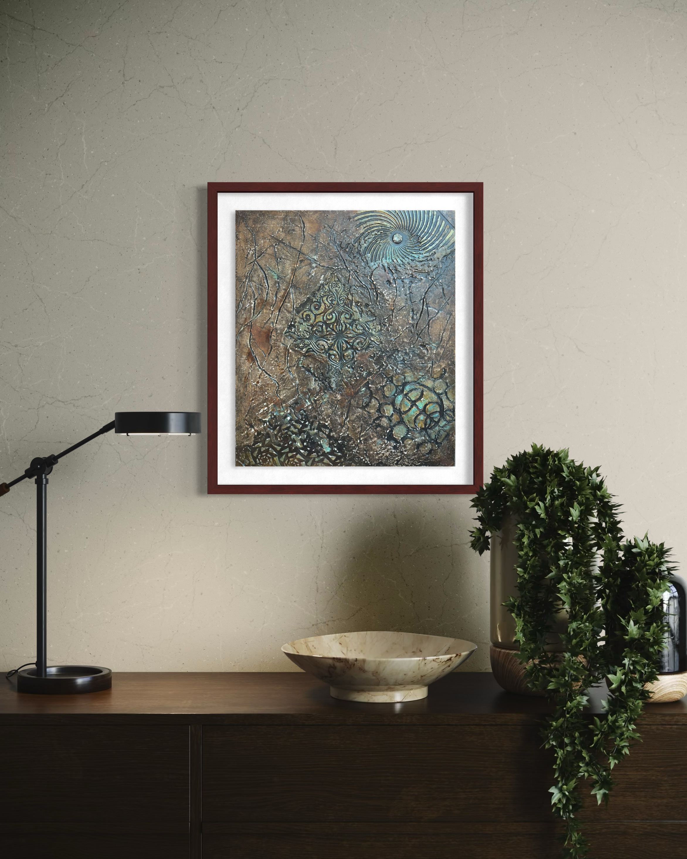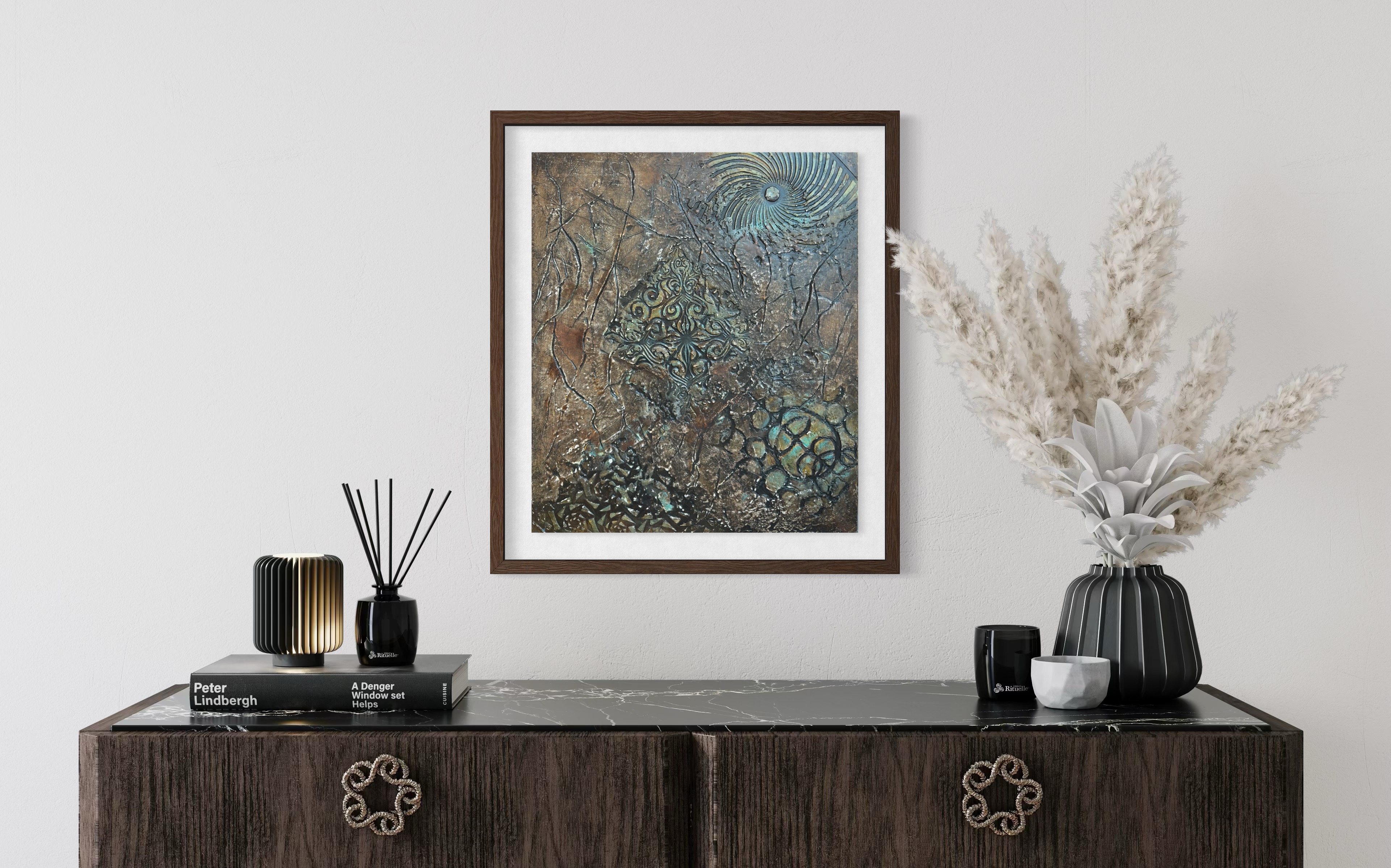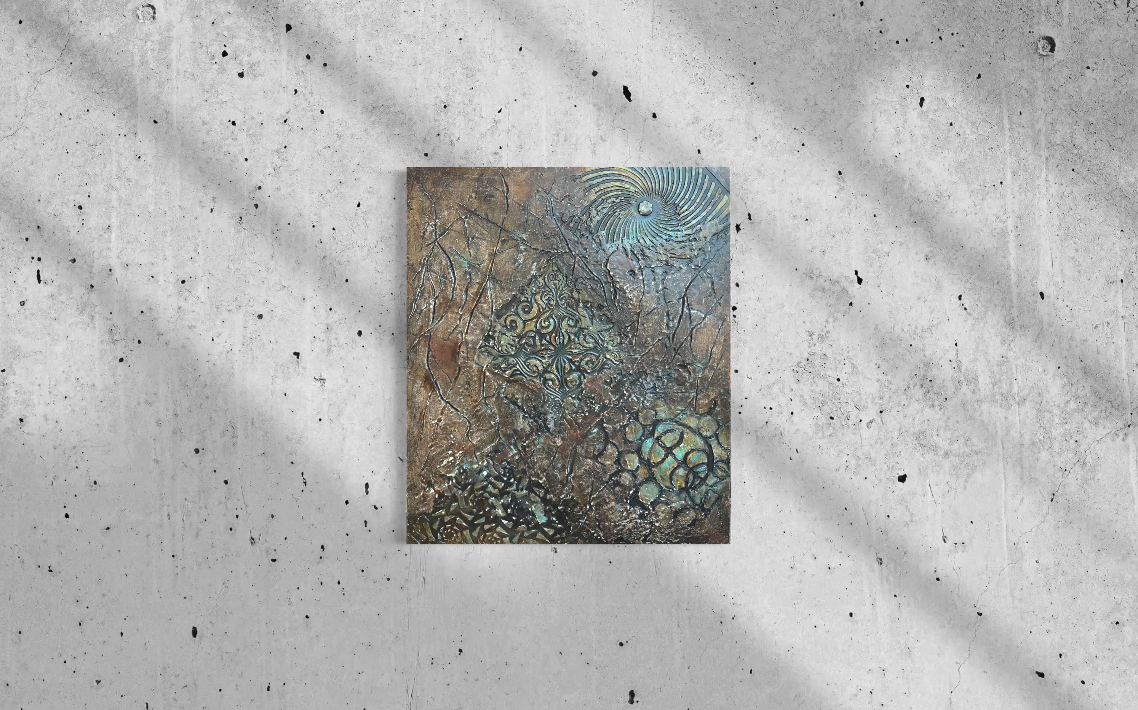 그리고 중앙: 메달리온. 화려한 스텐실 형태들—바로크 스크롤워크, 대칭적 아라베스크—금빛 광채로 닦이고 바니시 아래 봉인되어. 산화와 균열의 주변 들판에 대비하여, 이 중앙 구조는 고고학적으로 느껴지는 기하학적 무결성을 소유한다. 장식이 아니라 발굴의 전리품: 그 위에 세워진 모든 것이 무너질 때 견뎌내는 형태.