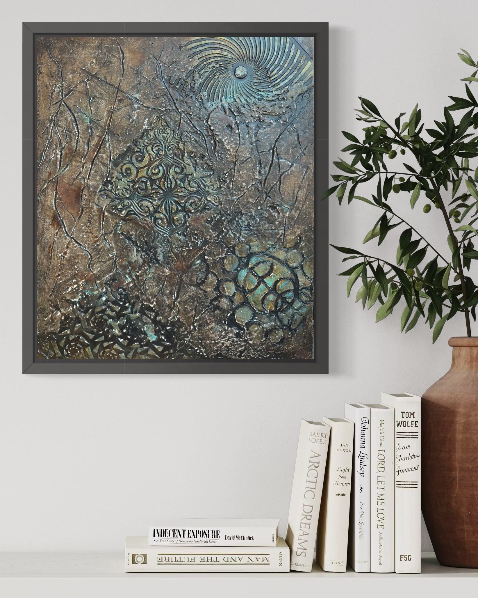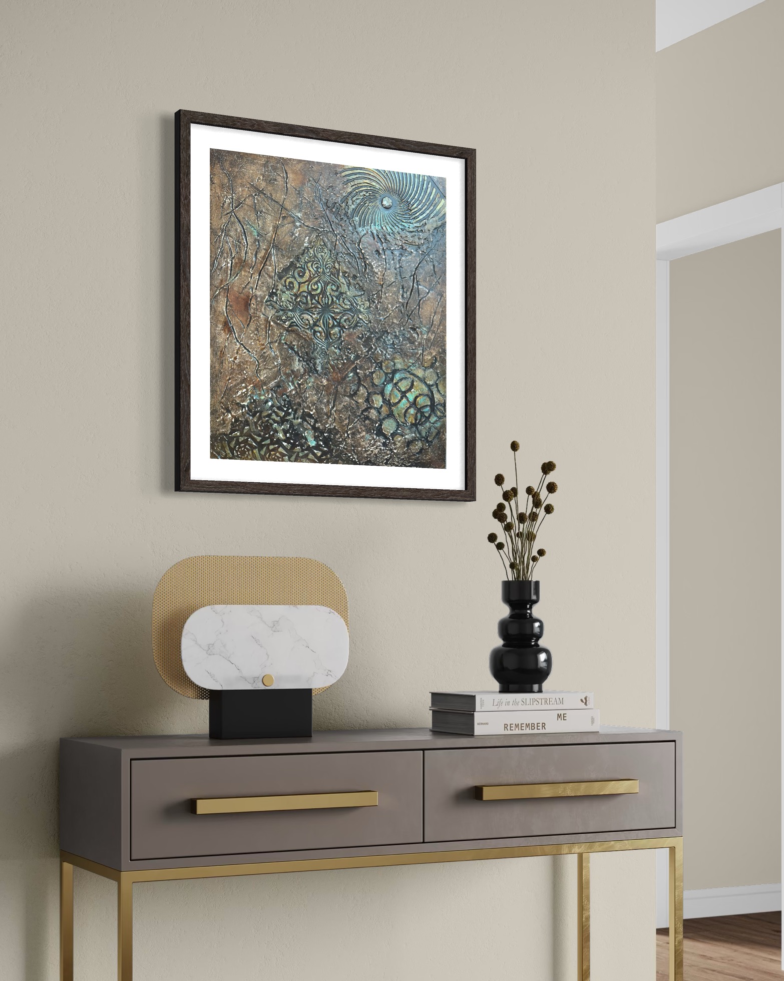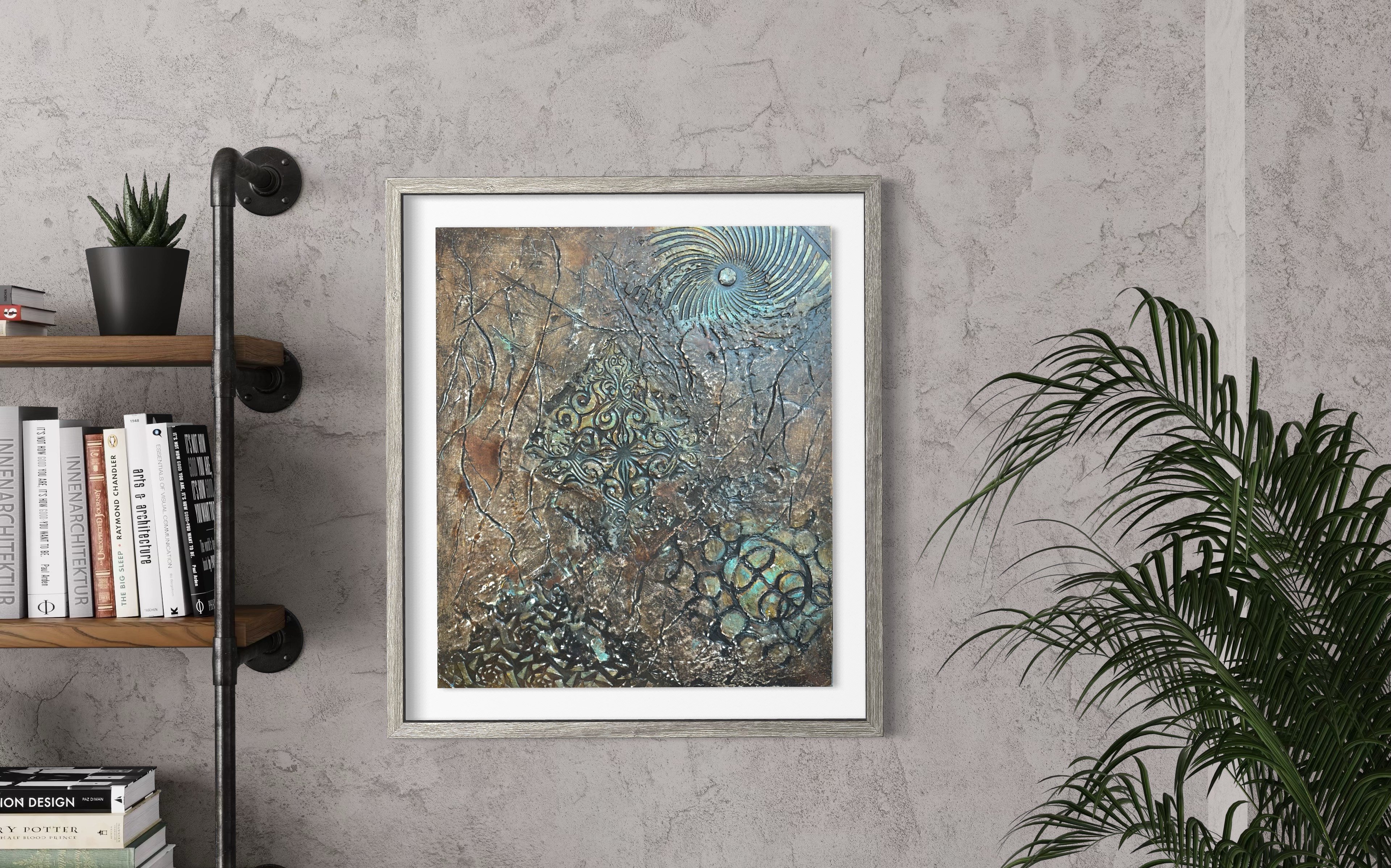 그리고 중앙: 메달리온. 화려한 스텐실 형태들—바로크 스크롤워크, 대칭적 아라베스크—금빛 광채로 닦이고 바니시 아래 봉인되어. 산화와 균열의 주변 들판에 대비하여, 이 중앙 구조는 고고학적으로 느껴지는 기하학적 무결성을 소유한다. 장식이 아니라 발굴의 전리품: 그 위에 세워진 모든 것이 무너질 때 견뎌내는 형태.