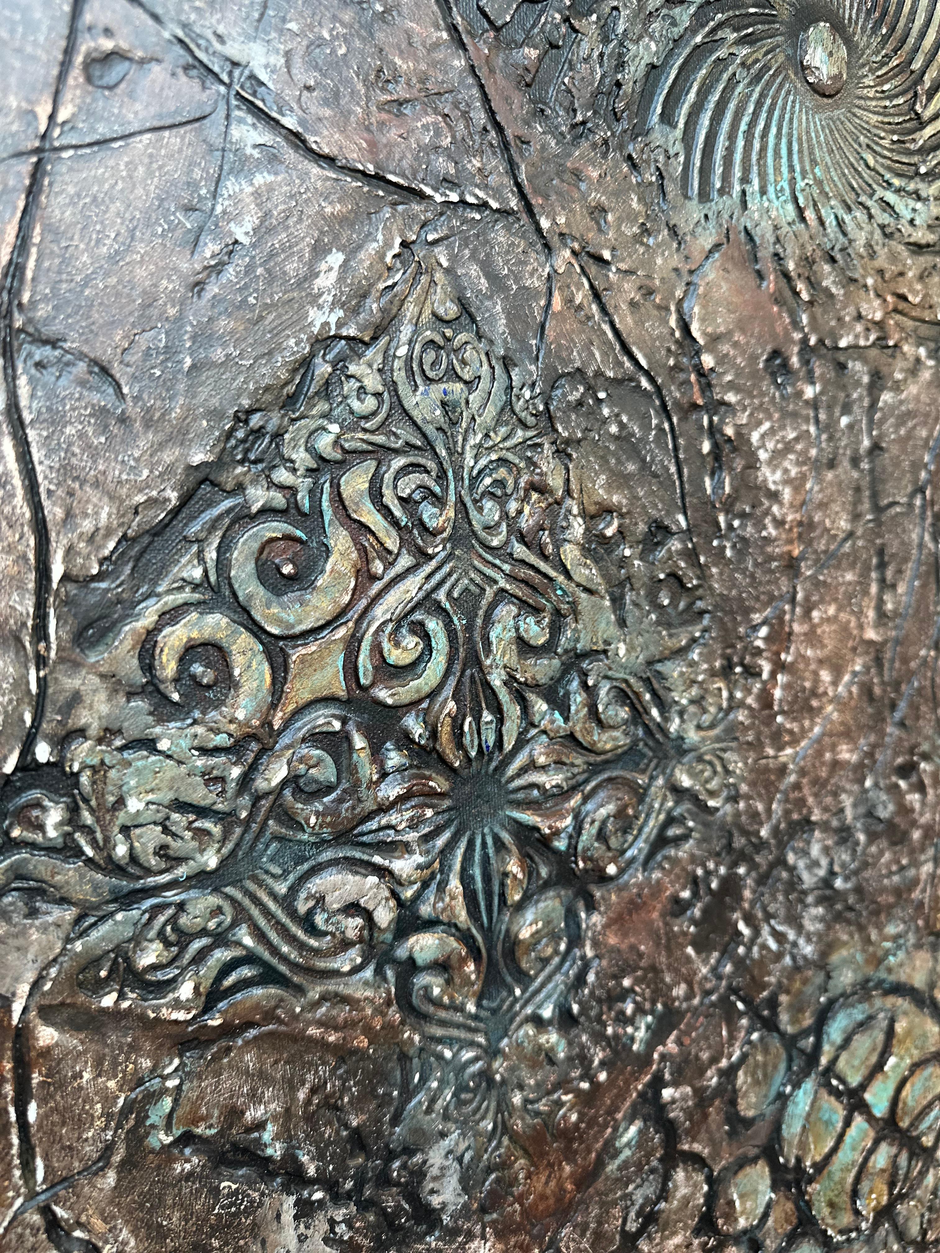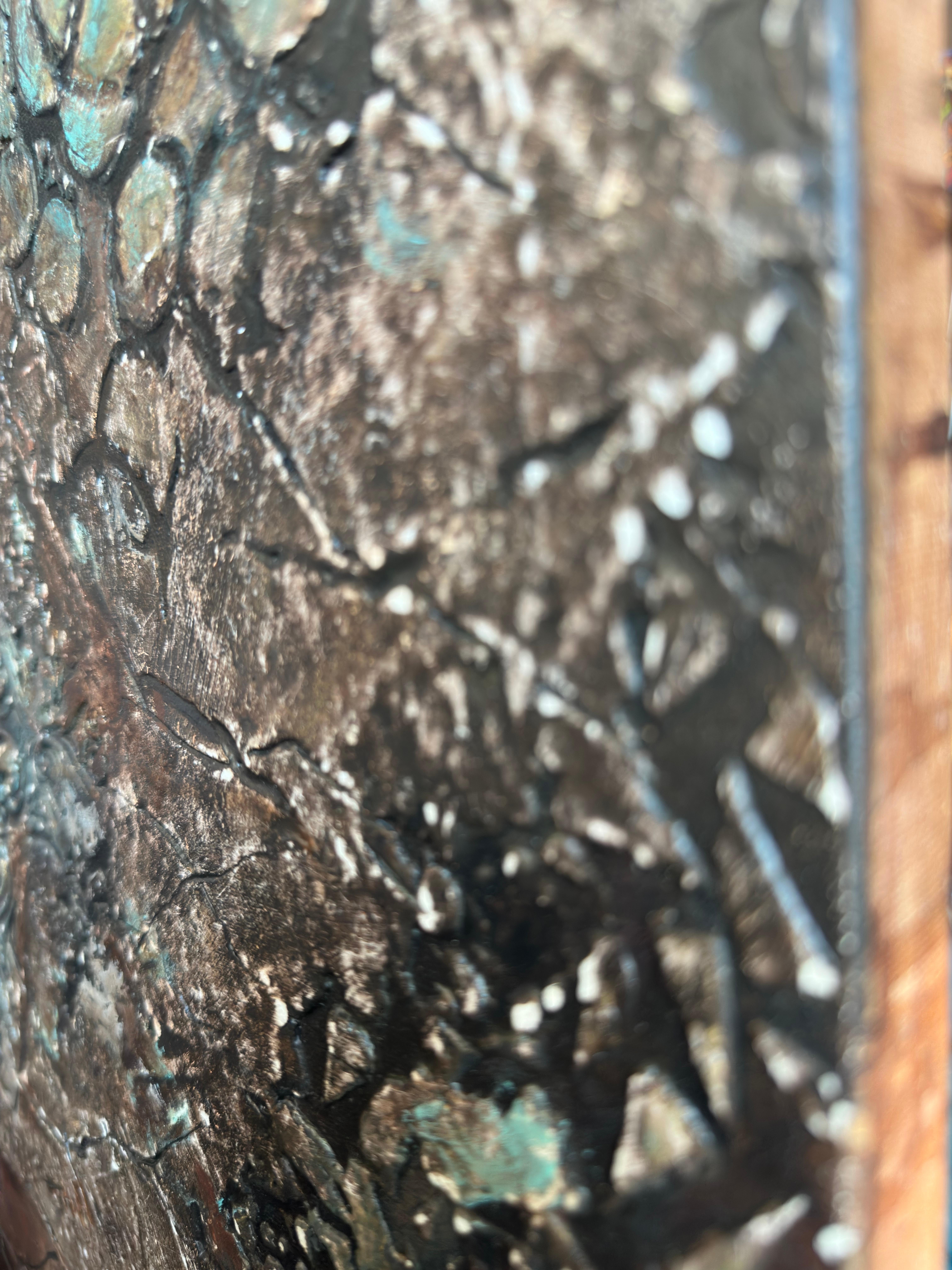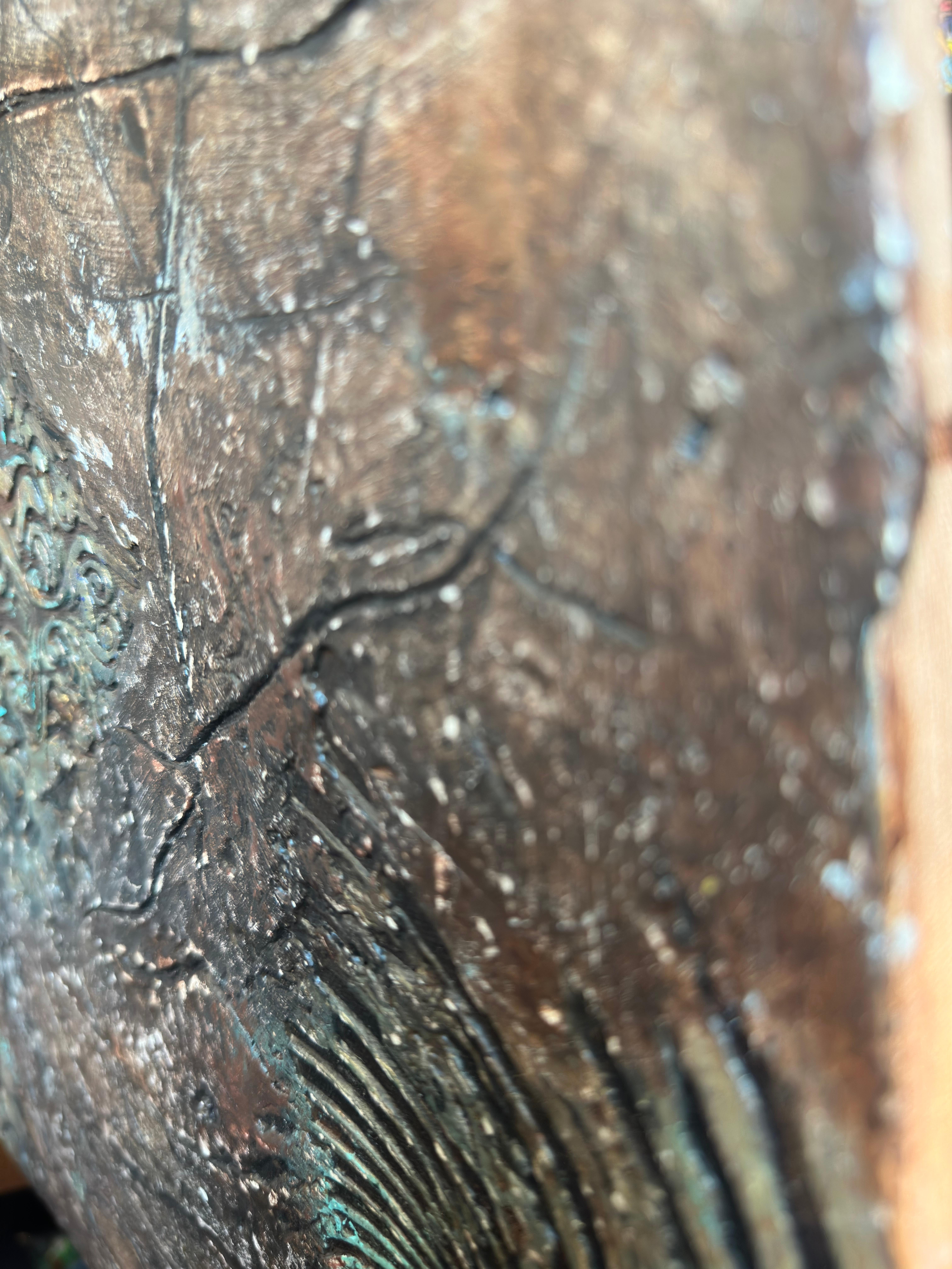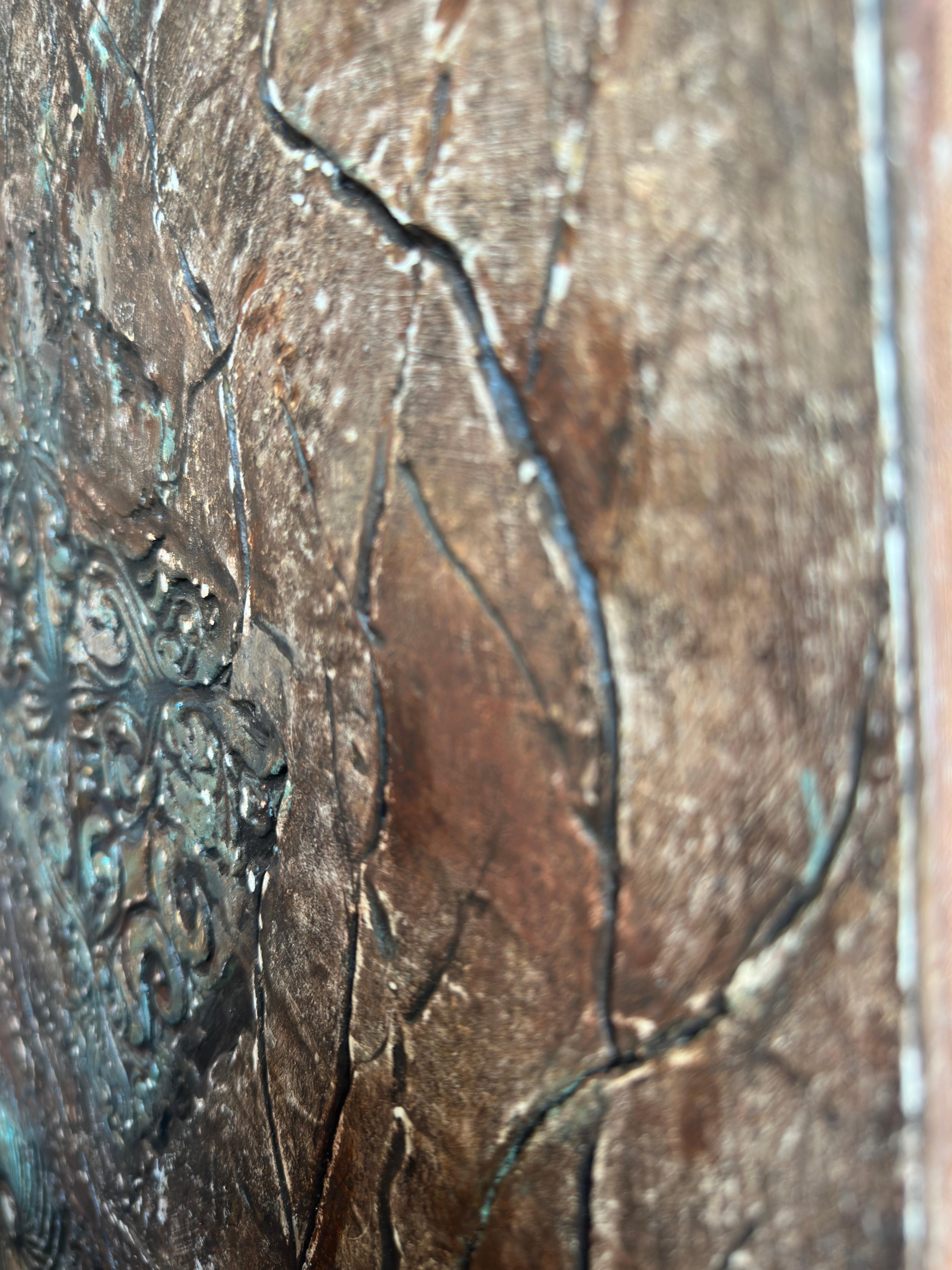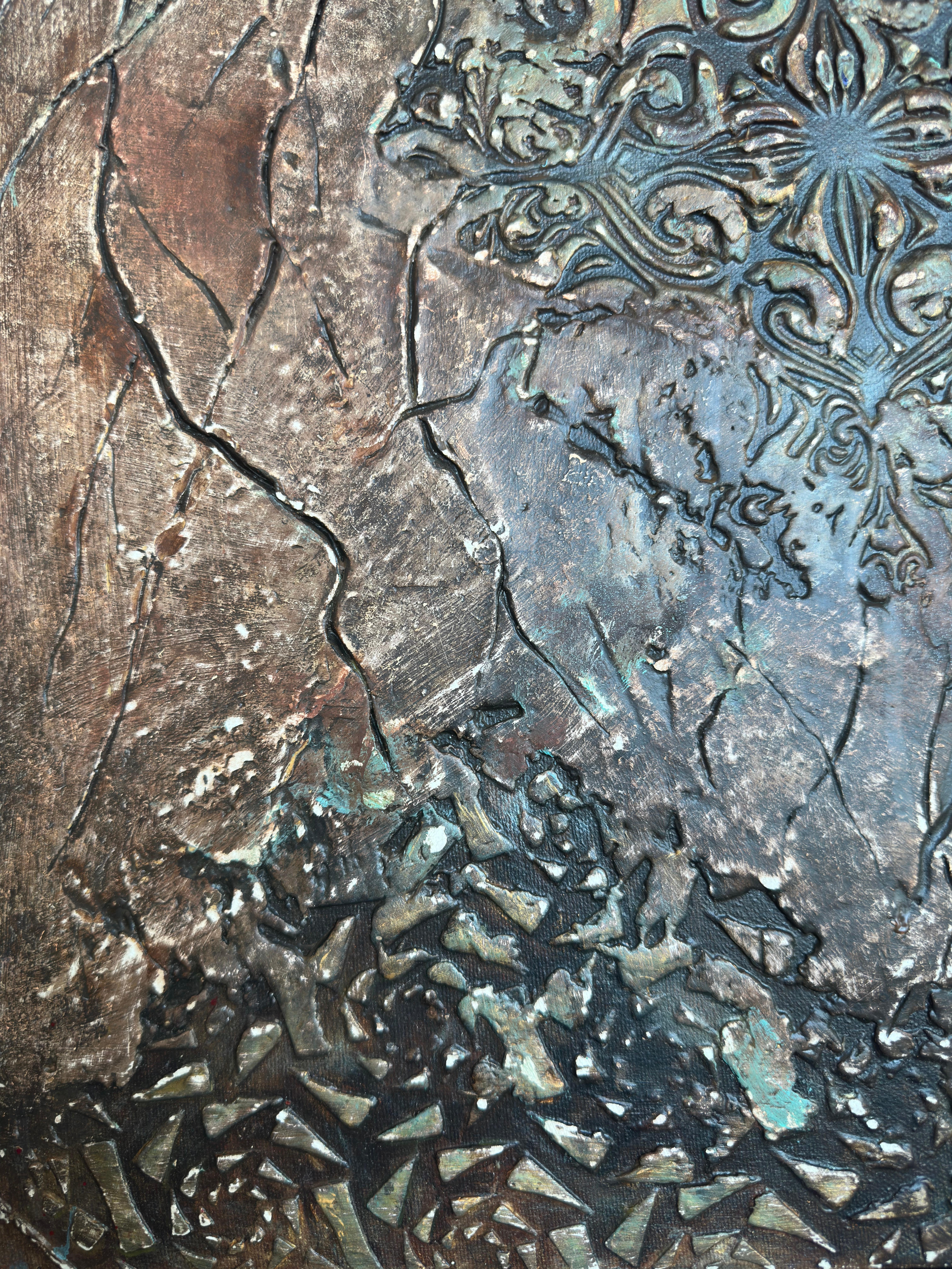 The artist treats the canvas like an excavation site. The bronze and umber tones dominate the background, feeling ancient and weathered. The blue-green verdigris blooming in the crevices suggests a long period of neglect—a visual metaphor for a state of affairs that has been allowed to corrode. The viewer gets the sense that the artist is digging through layers of sediment—rhetoric, distortion, and moral confusion—to find something solid underneath.