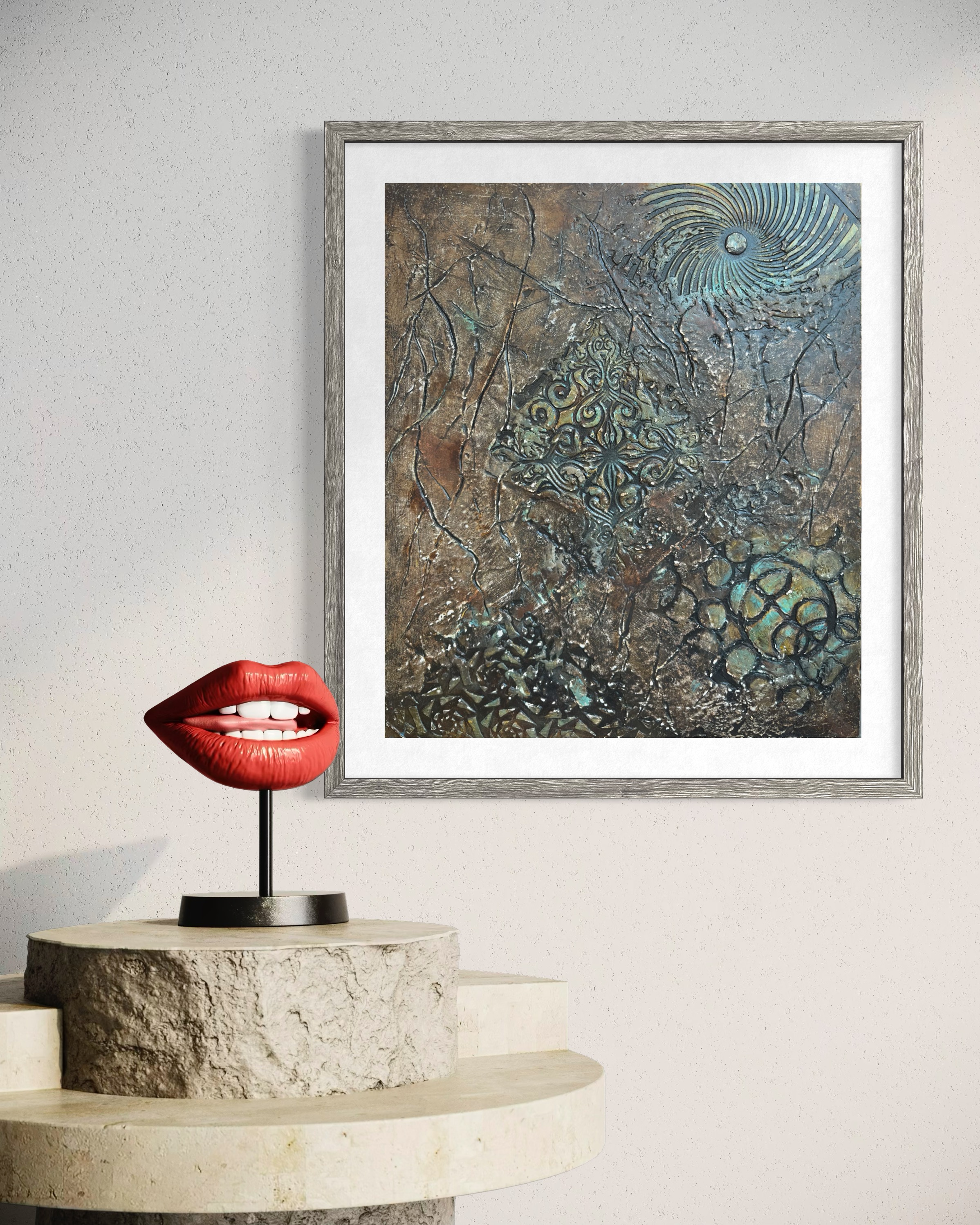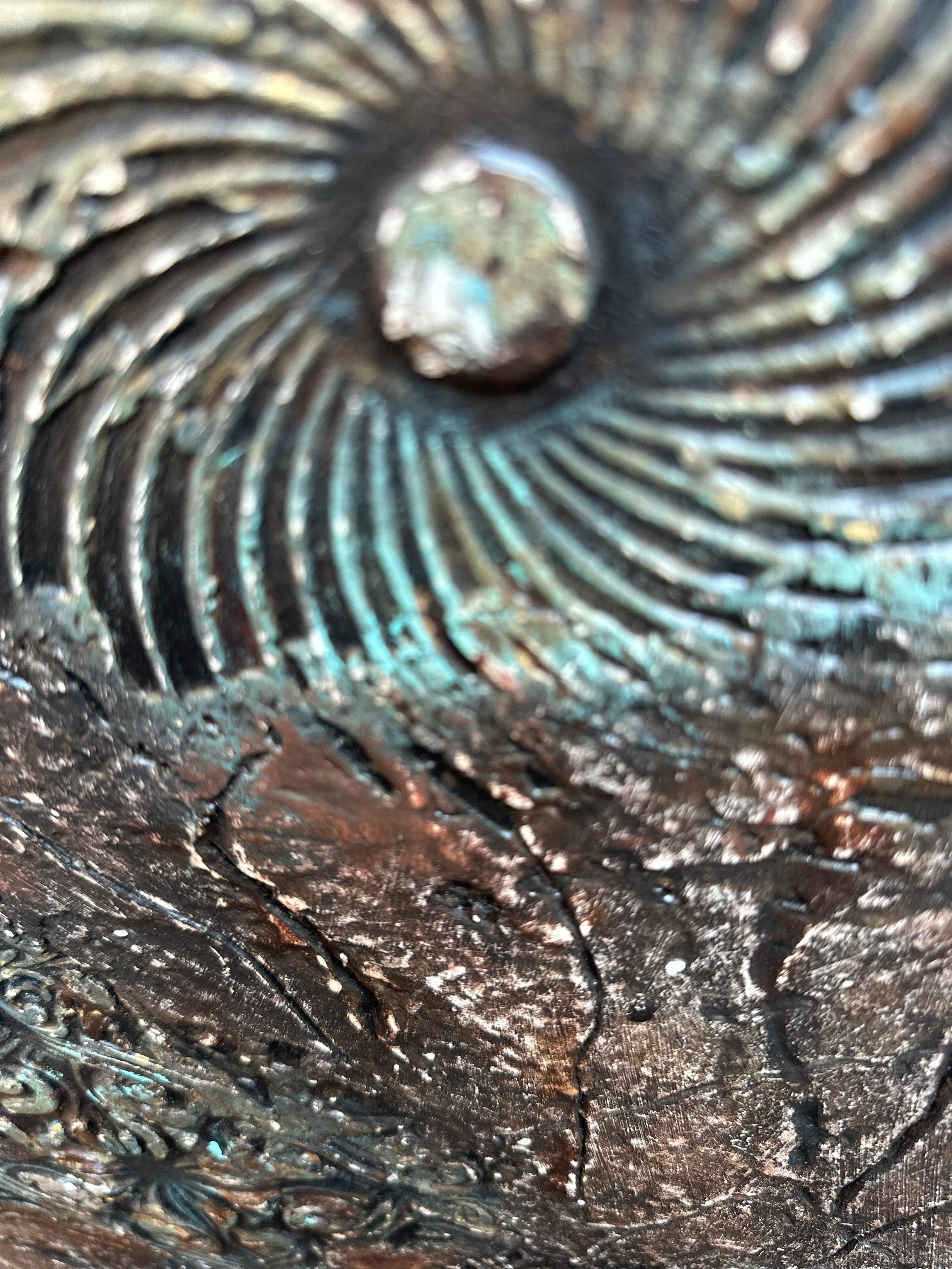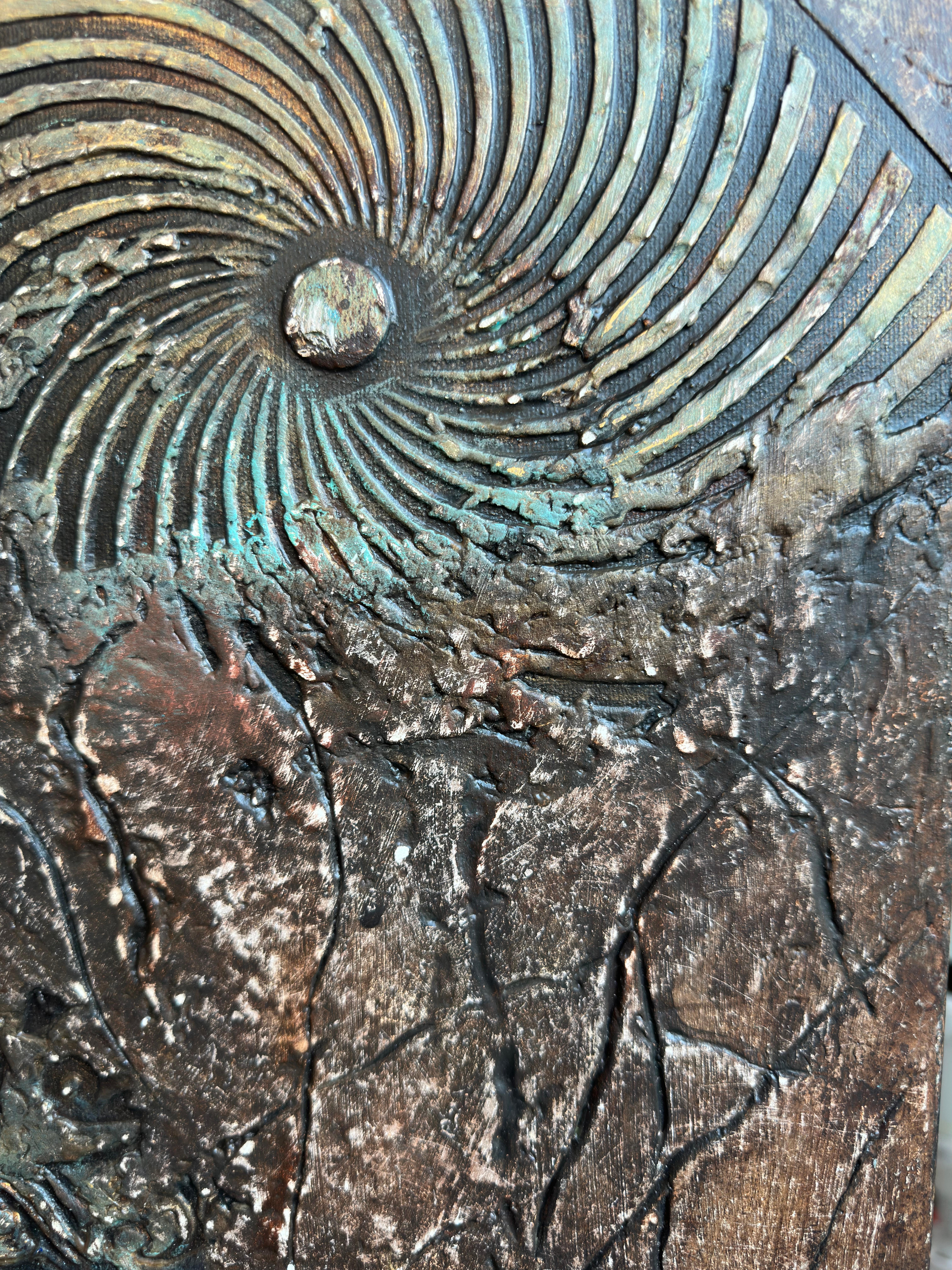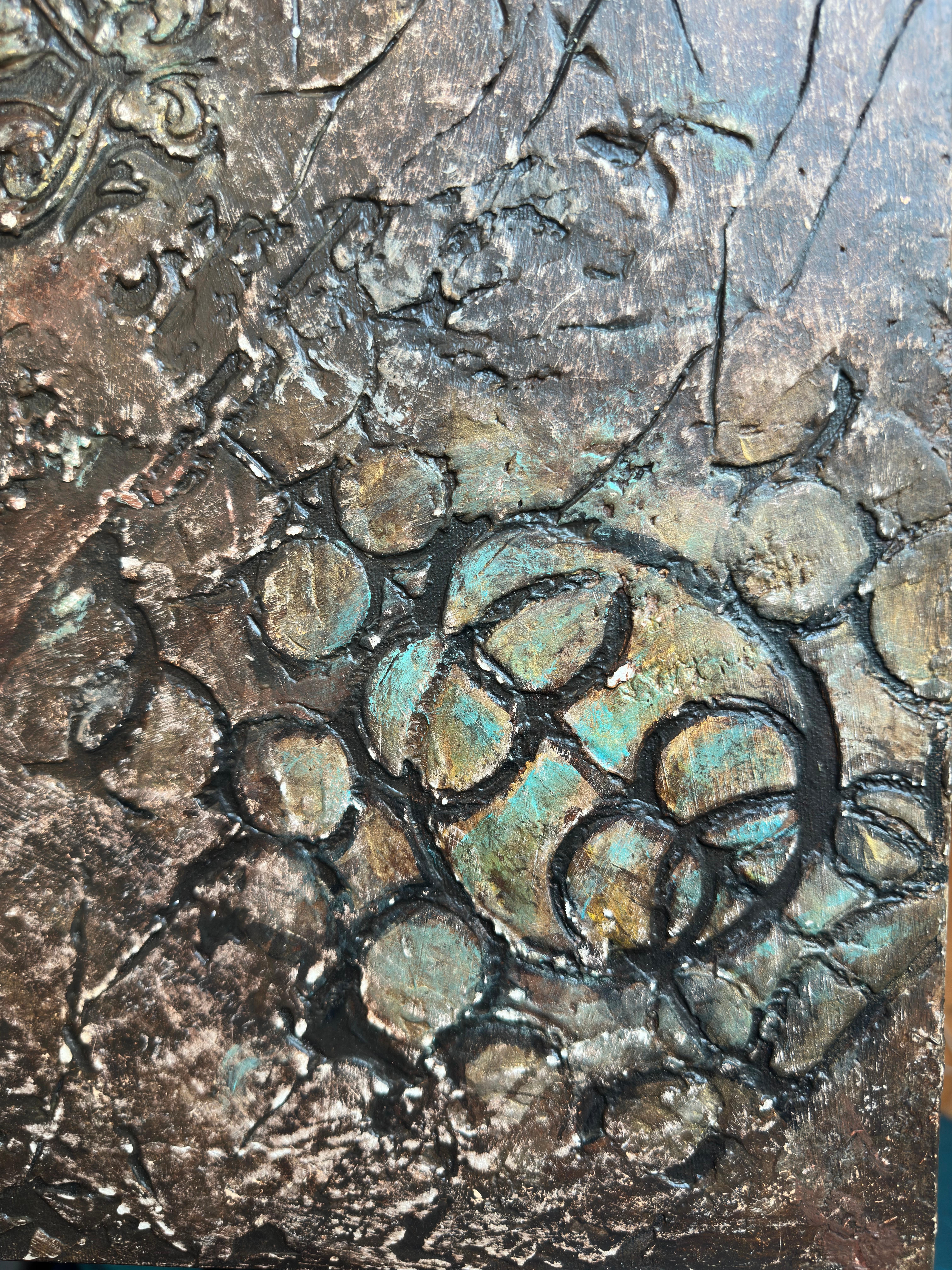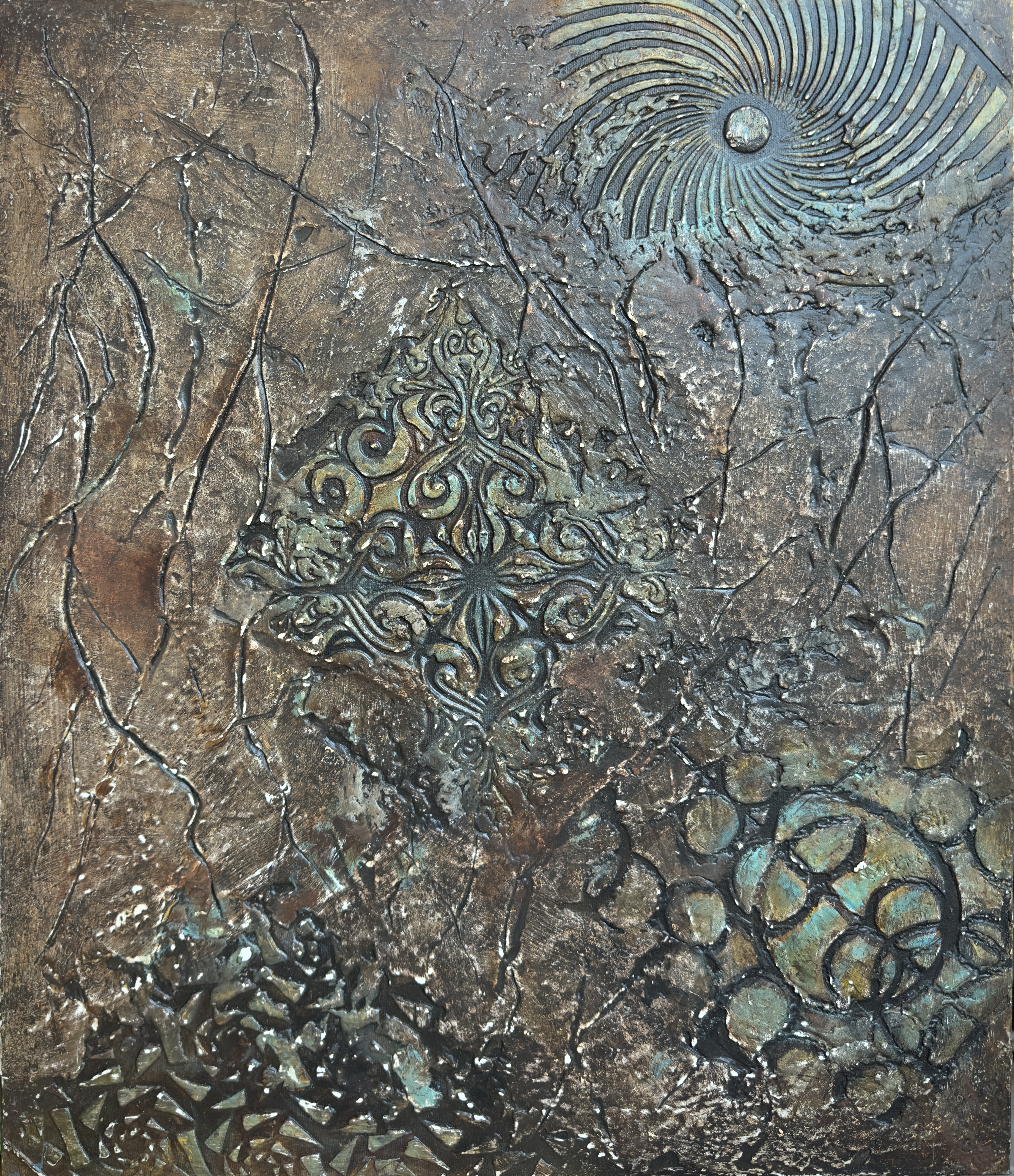 The artist treats the canvas like an excavation site. The bronze and umber tones dominate the background, feeling ancient and weathered. The blue-green verdigris blooming in the crevices suggests a long period of neglect—a visual metaphor for a state of affairs that has been allowed to corrode. The viewer gets the sense that the artist is digging through layers of sediment—rhetoric, distortion, and moral confusion—to find something solid underneath.