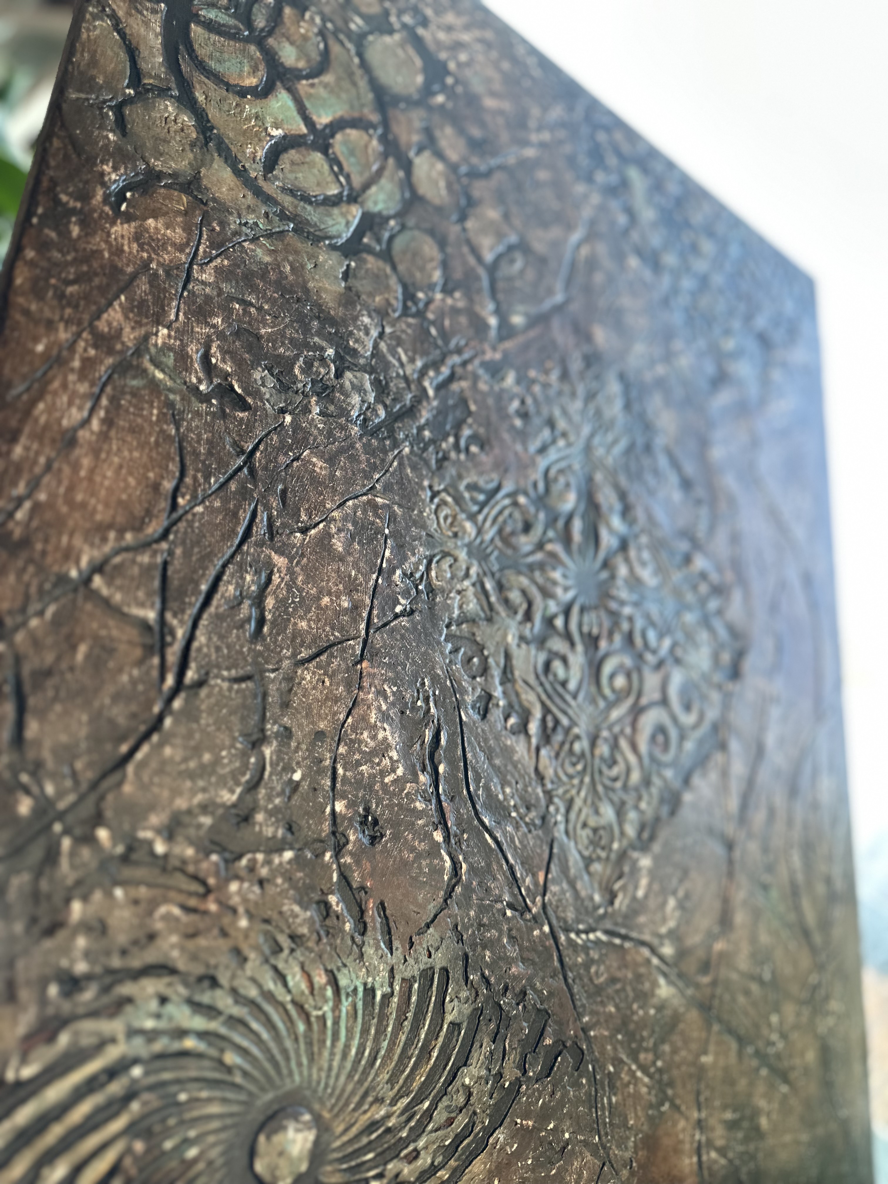The work resists this reading through material honesty. The sanding marks remain visible. The cracks propagate unpredictably. The oxidation refuses containment. Even the golden medallion, for all its clarity, sits within rather than above the eroded field. It has been excavated, not imported. The work insists: restoration is not return to pristine origins but recovery of structures that bear marks of burial.