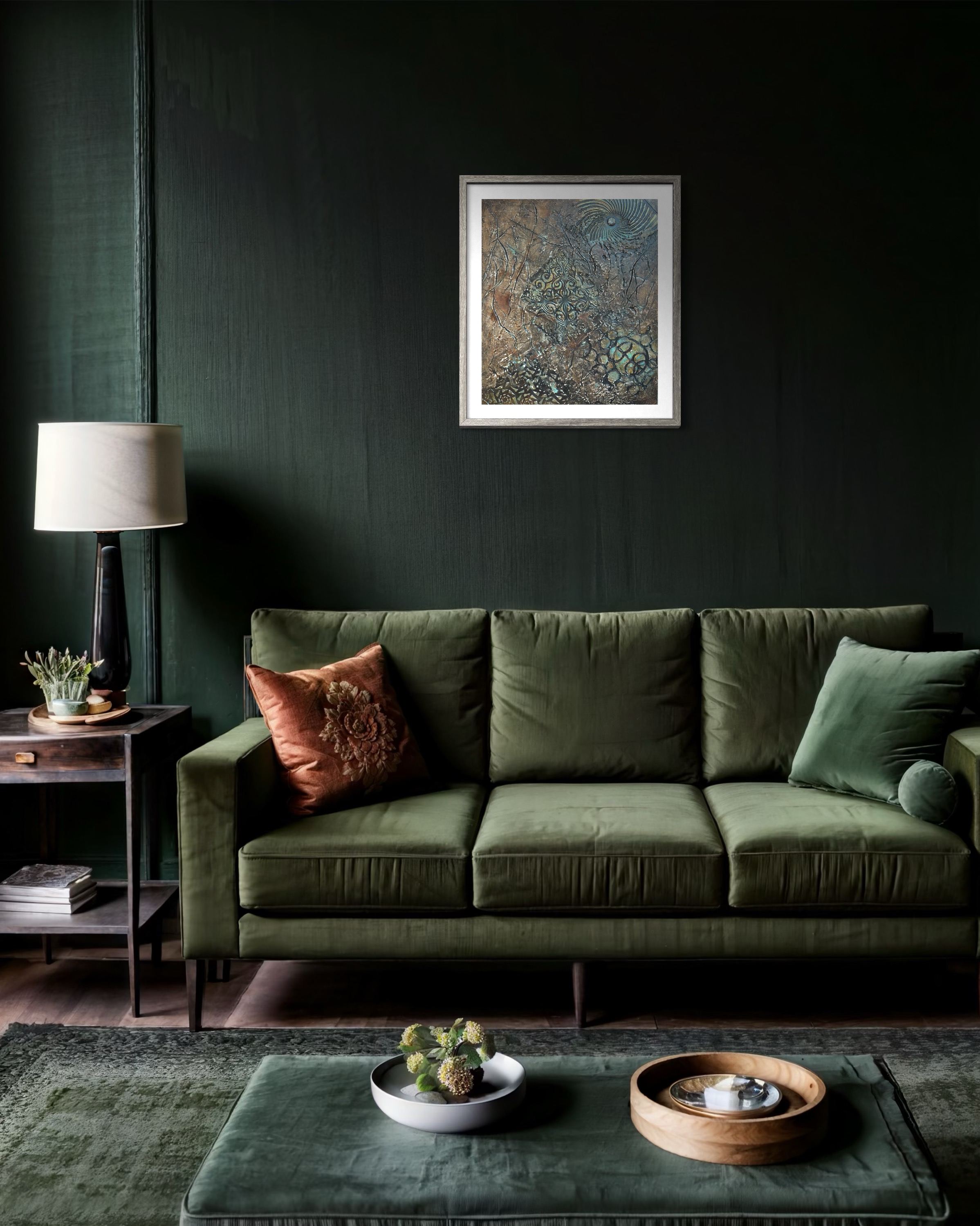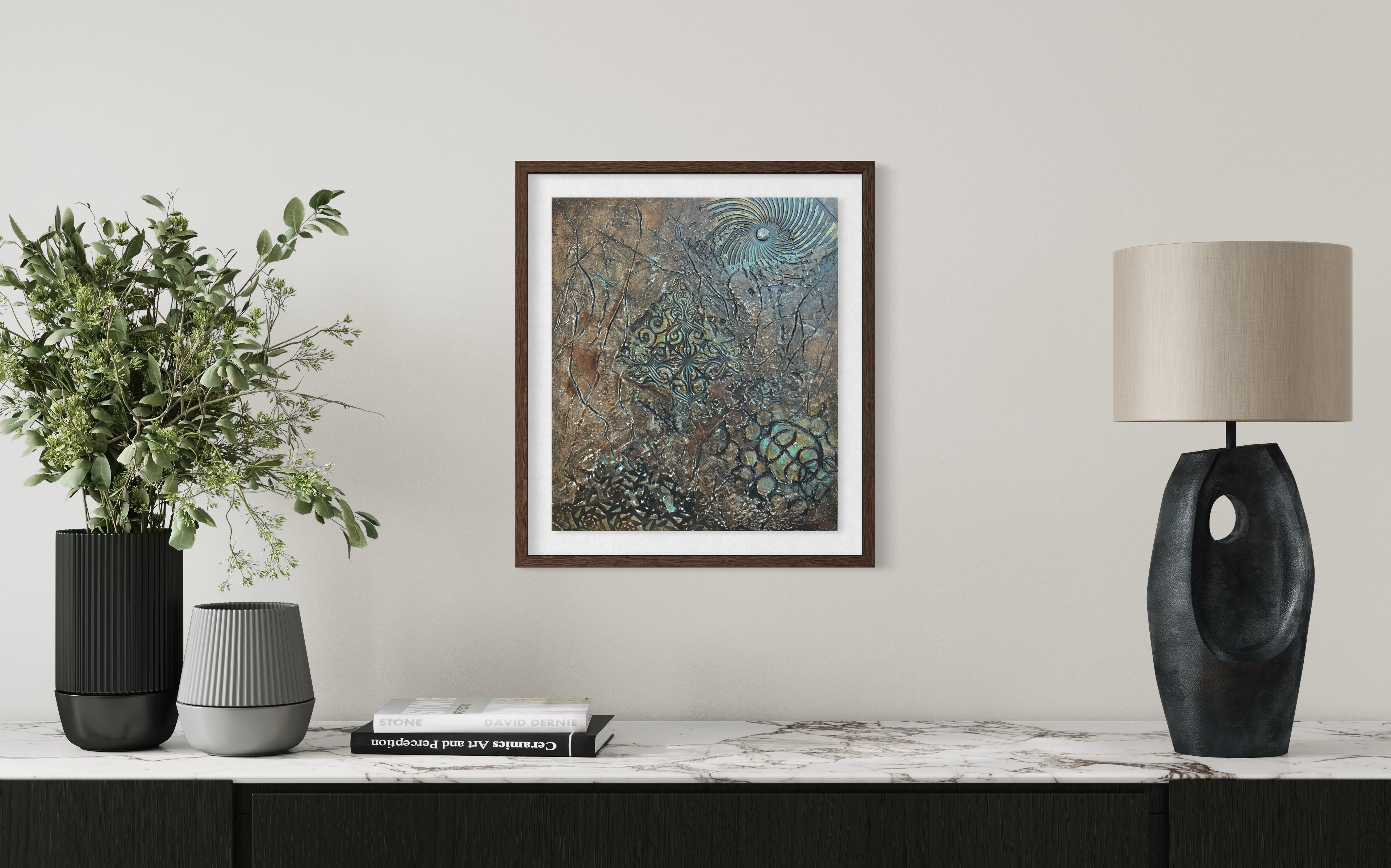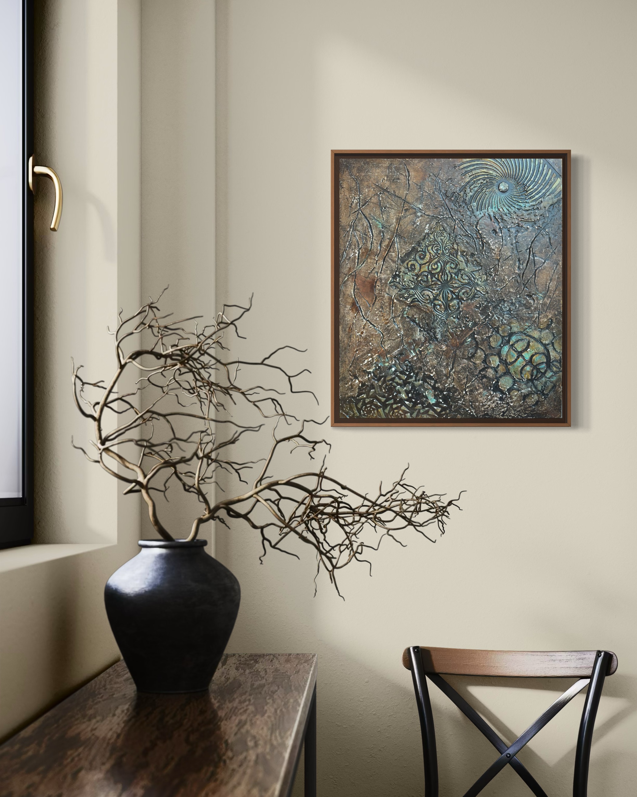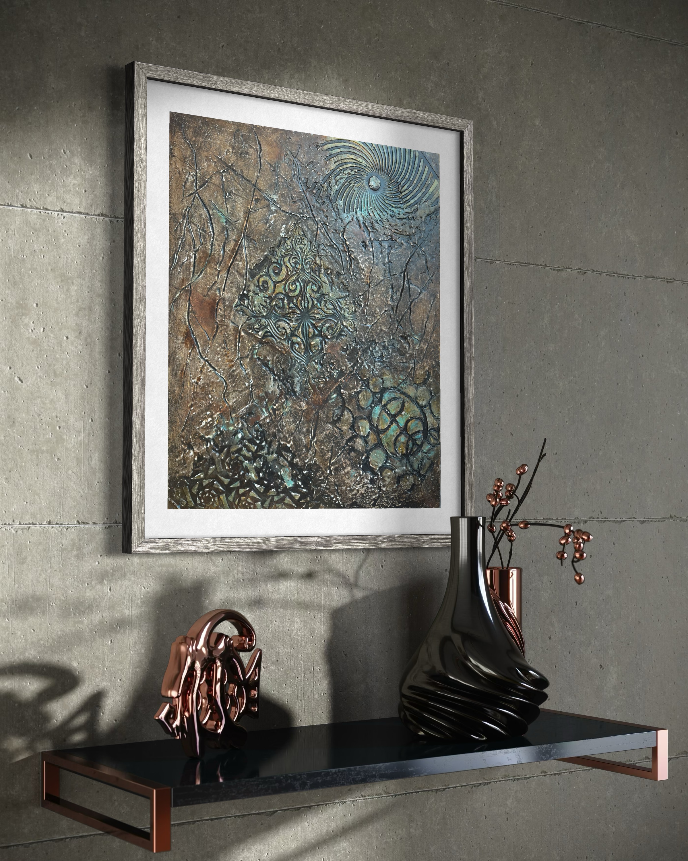 작가는 캔버스를 발굴 현장처럼 다룬다. 브론즈와 암갈색이 지배하는 배경은 오래되고 풍화된 느낌을 준다. 틈새에서 피어오르는 청록색 녹(Verdigris)은 오랜 방치의 시간을 암시하며, 부식되도록 내버려 둔 어떤 상태에 대한 시각적 은유로 읽힌다. 관객은 작가가 혼란과 소음, 궤변의 퇴적층을 파헤쳐 그 아래 단단한 무언가를 찾으려 했다는 인상을 받게 될 것이다.