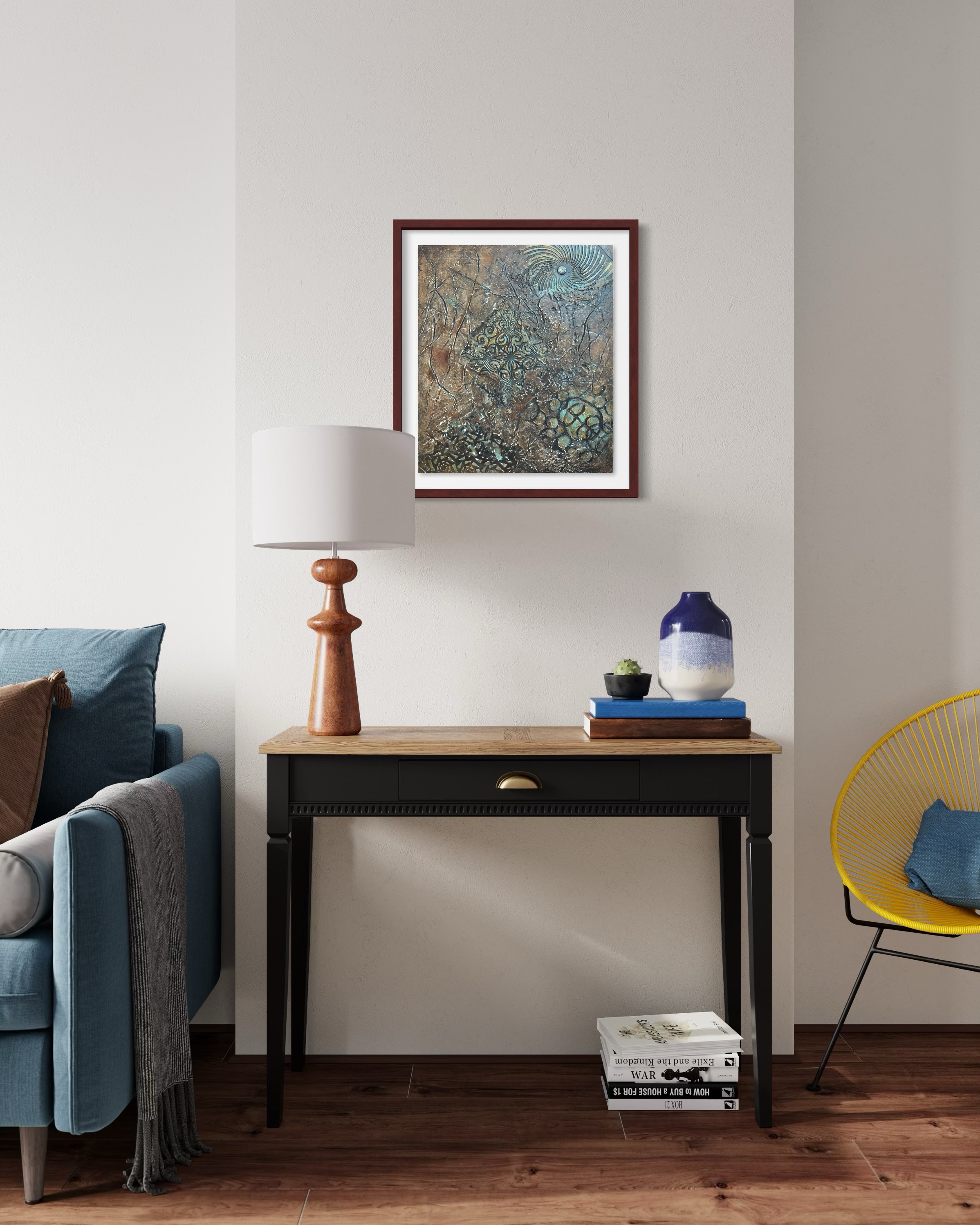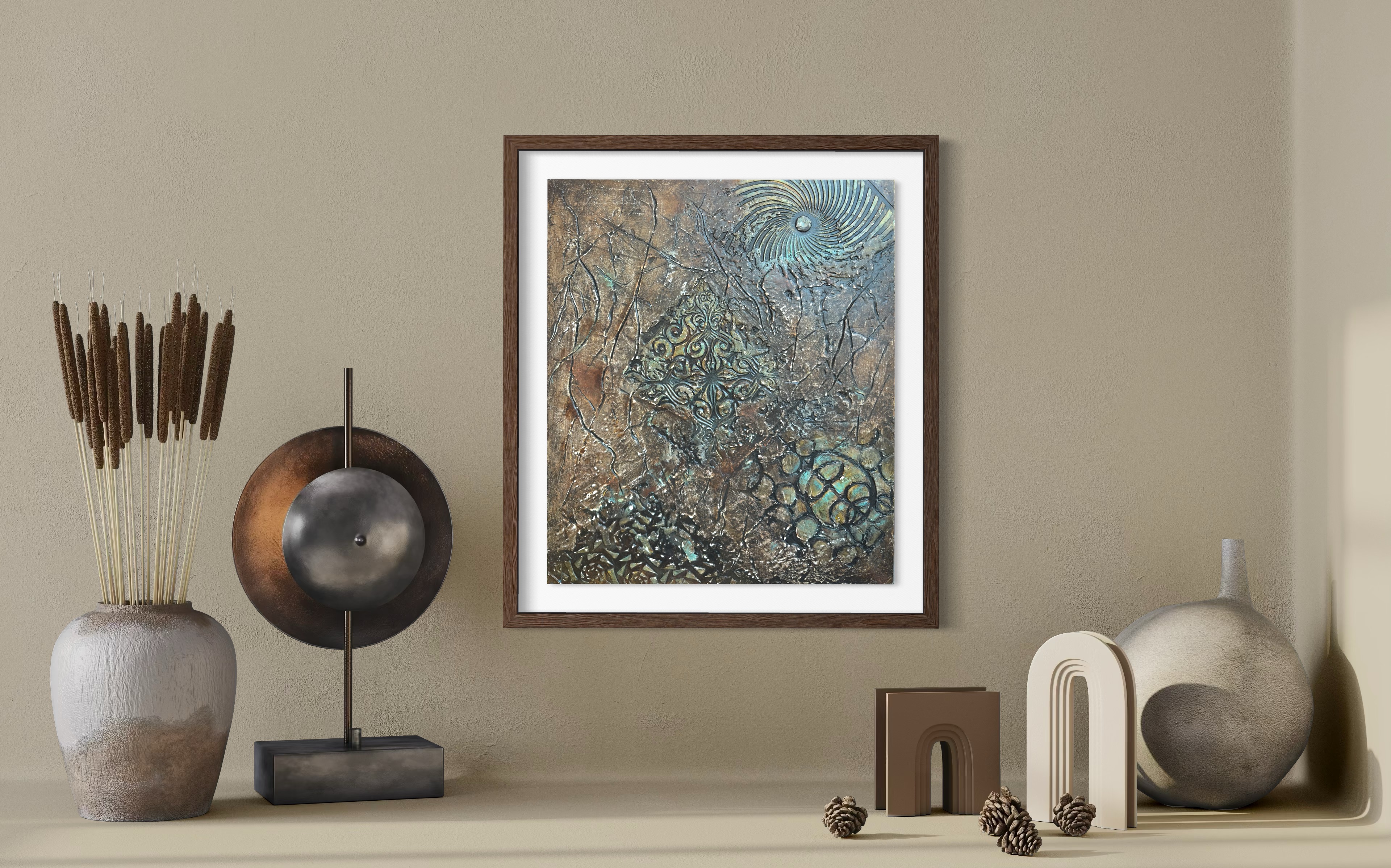 There is nothing new under the sun. While the world clamors for novelty, I returned to this canvas to excavate something firm that seems to be slipping away. I reworked it by rigorously sanding down layers laid years ago. The bronze tones and oxidizing patina suggest a landscape weathered by historical confusion, while the golden varnish on the central structure hints at an enduring value we have neglected. This work is a quiet resistance against a world losing its center. It is an attempt to polish the foundational agreements and democratic spirit, proving that the future is found not by invention, but by recovering the unbroken foundation we have allowed to decay.