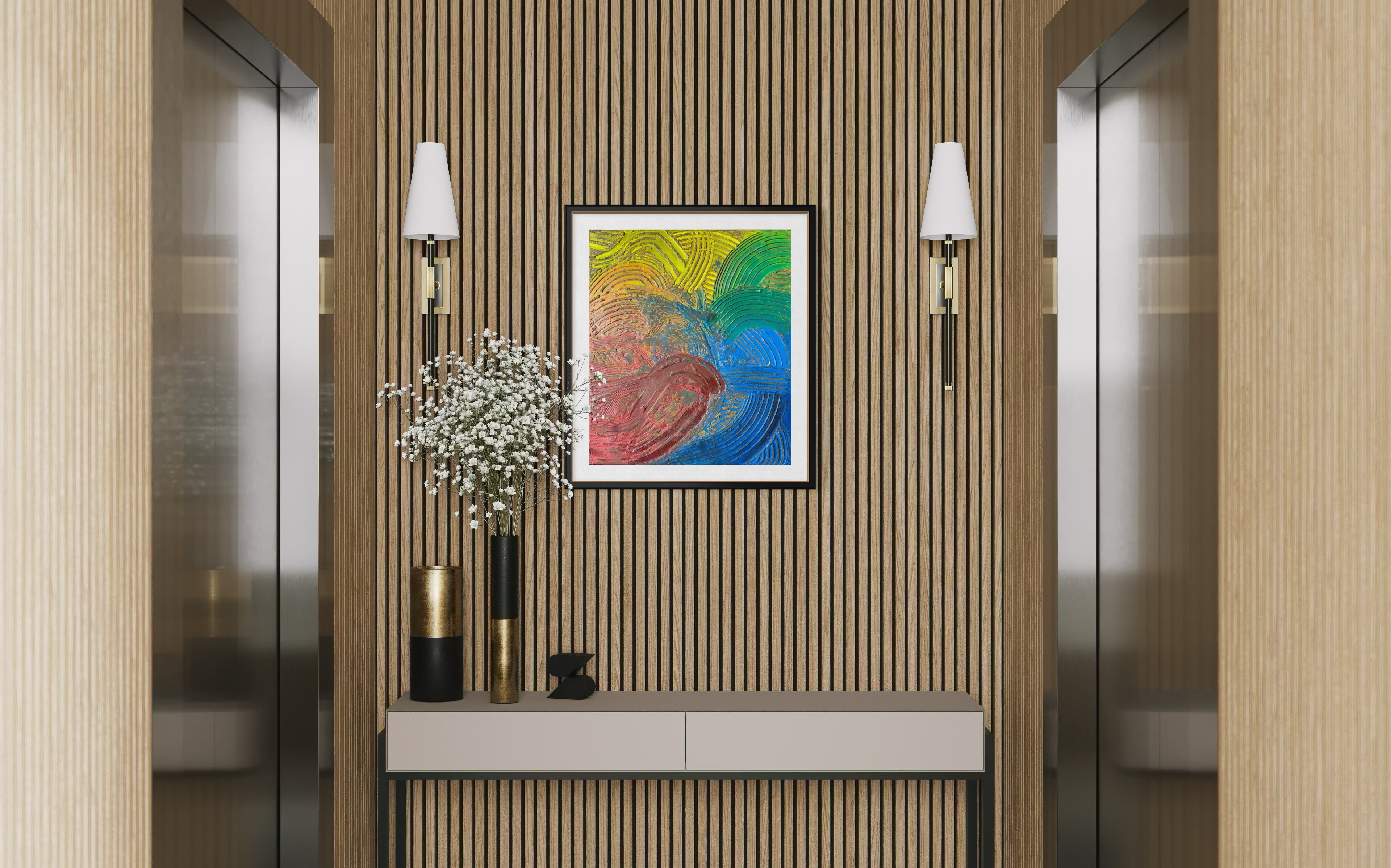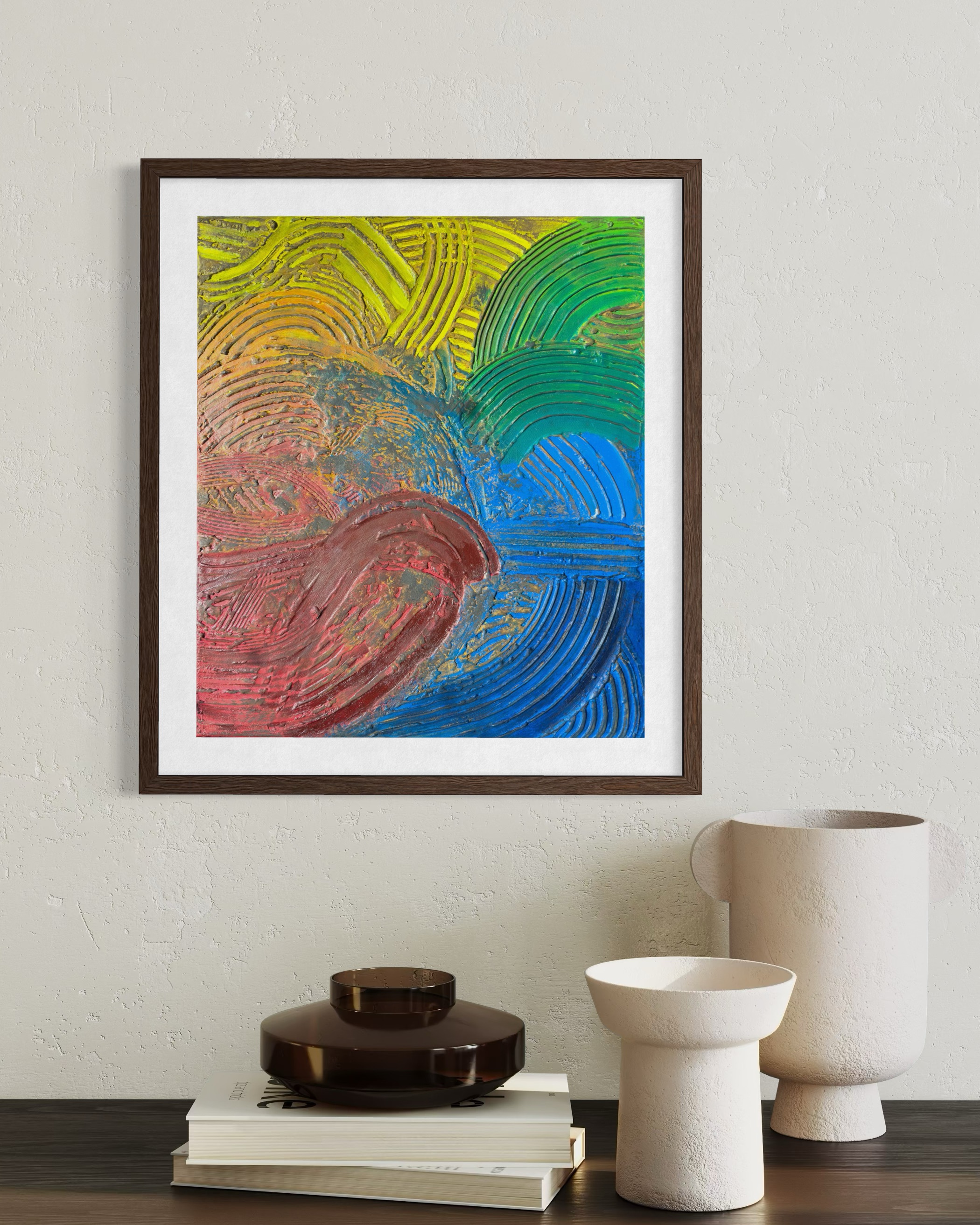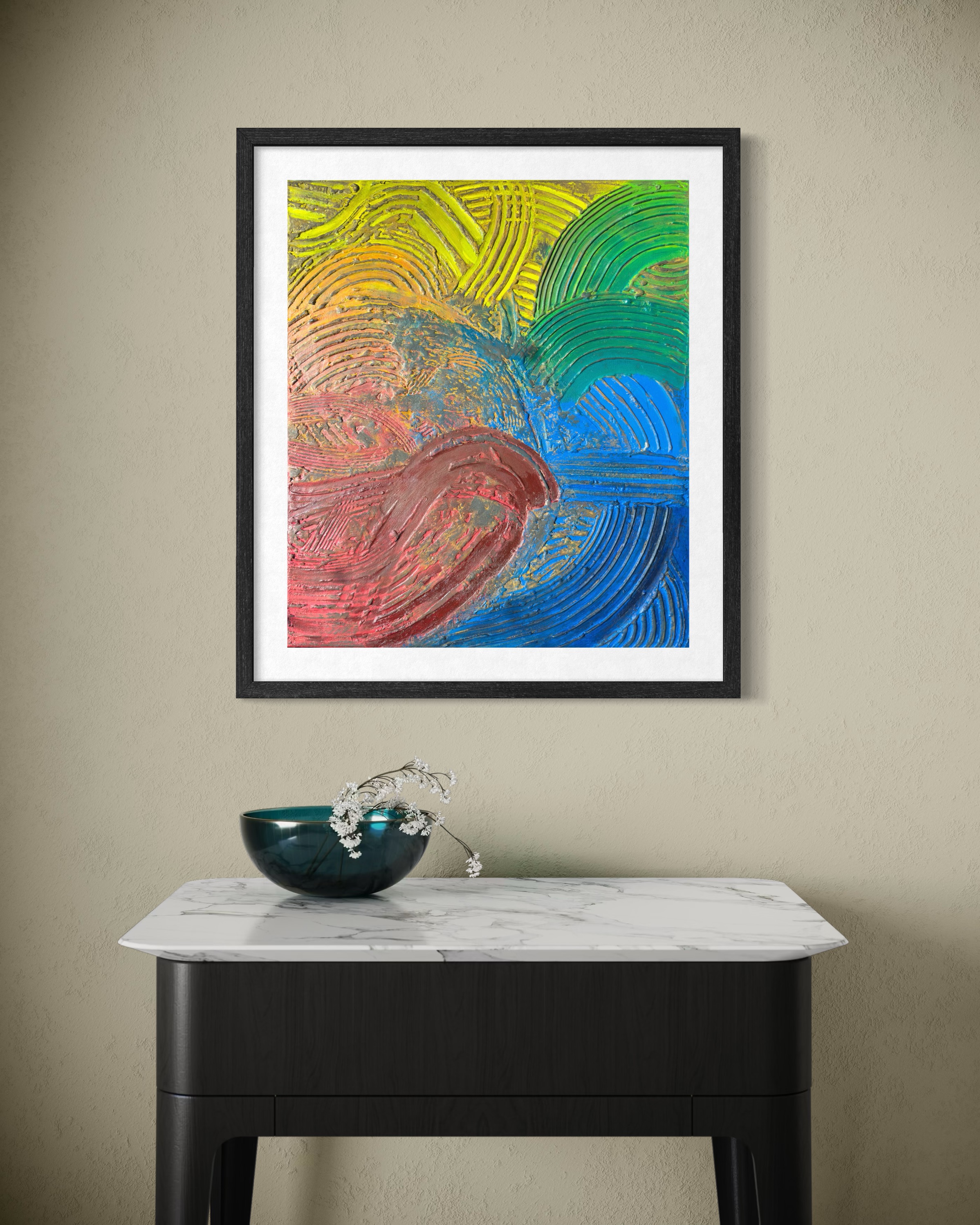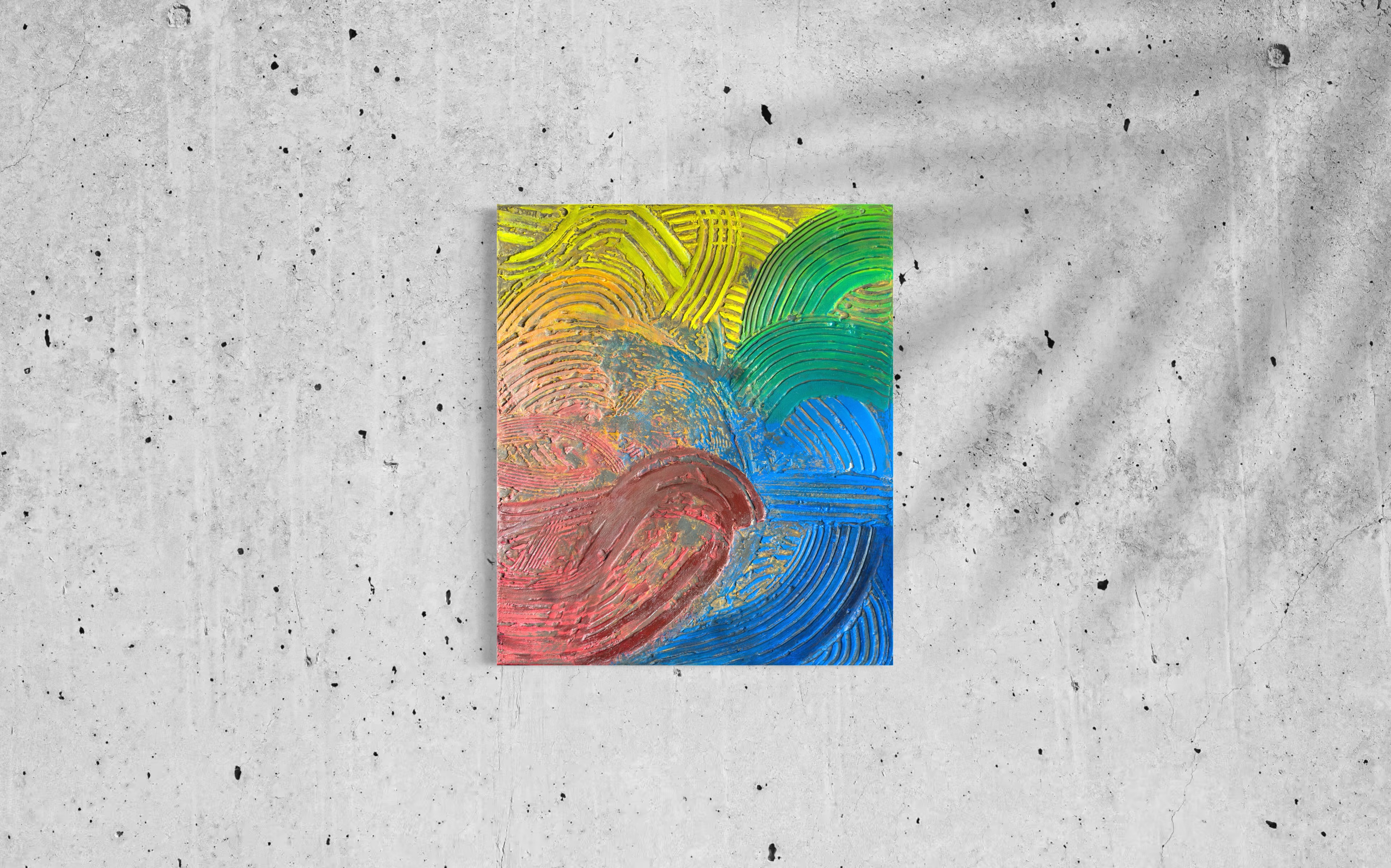 The topography is defined by the Groove. Deep, recessed, and shielded from the light, these valleys function as reservoirs of interiority. Here, acrylic pigment does not sit on the surface; it sinks, settles, and impregnates the material. This is the aesthetics of sedimentation. Color here is memory—protected, dense, and fluid—hiding in the depths to survive the erosion of time.
