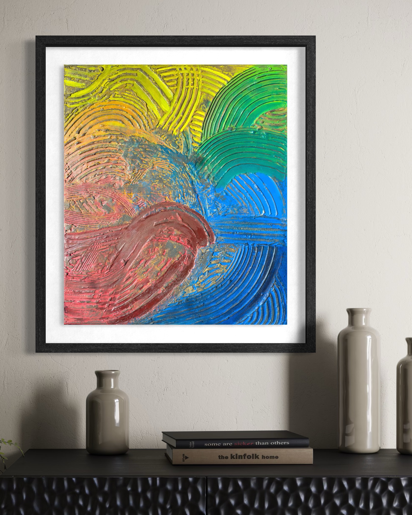 Mixed media on canvas (modeling paste, acrylics)