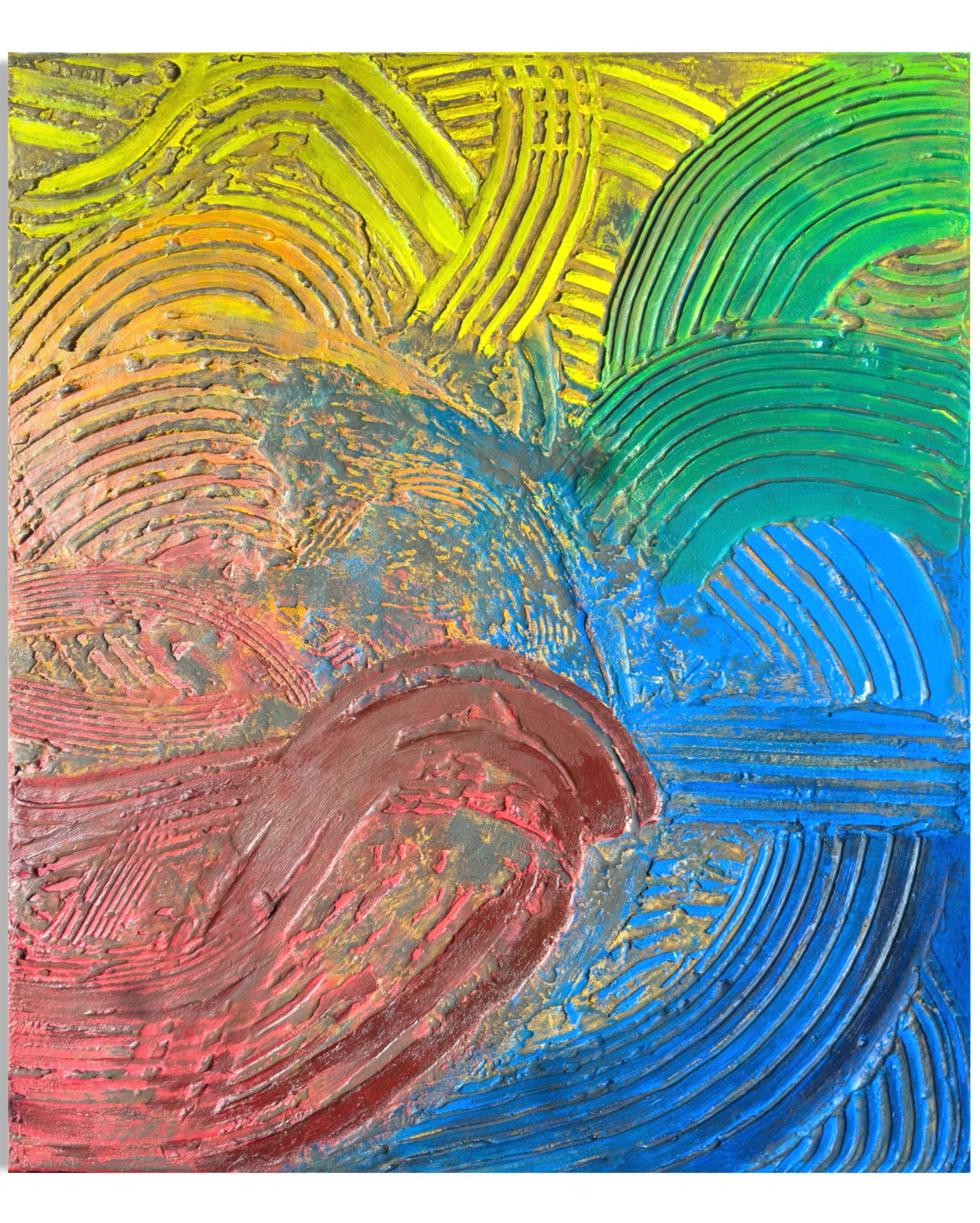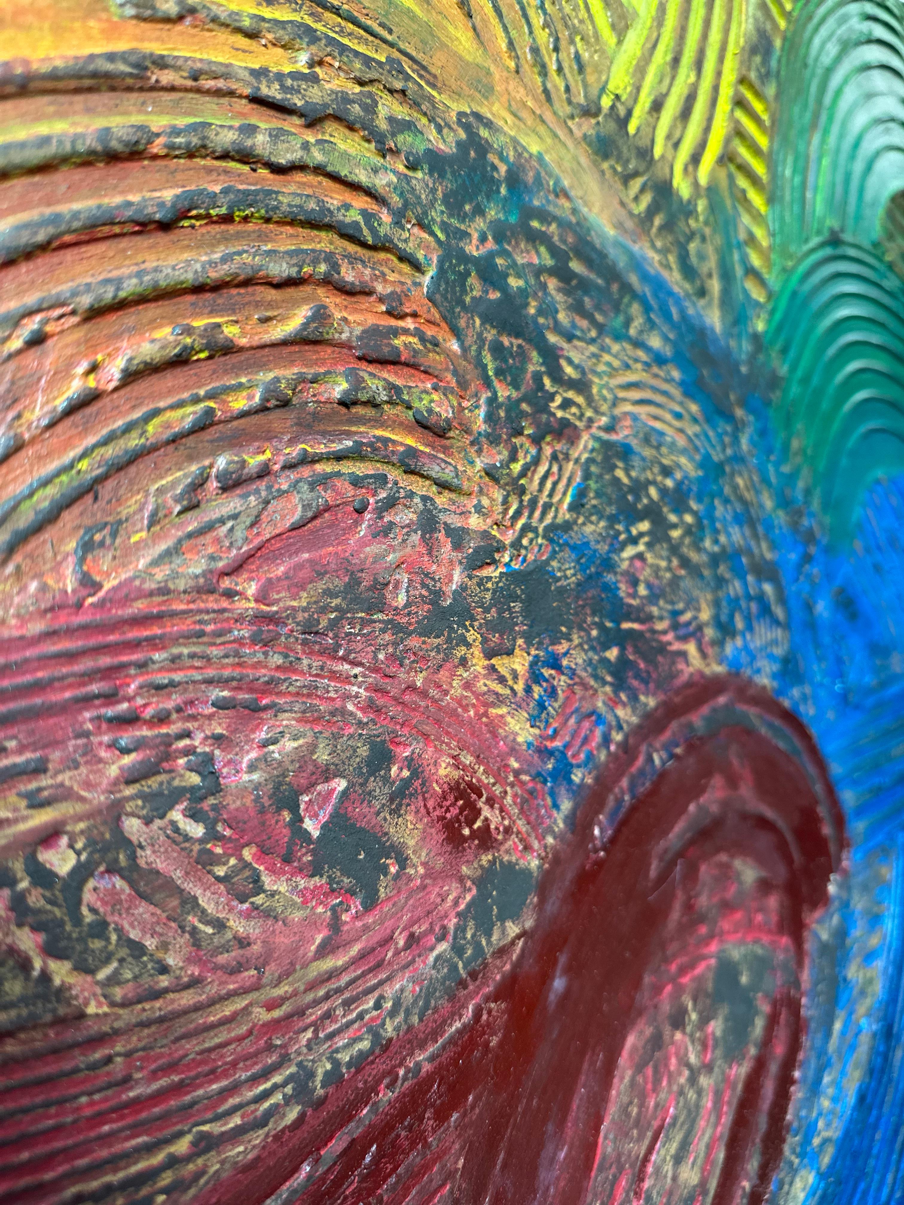 The canvas operates as geological cross-section. Six radial zones—yellow through orange, green through turquoise, blue through violet-brown—explode outward from an invisible center, each carved with concentric grooves that create a topography of peaks (ridges) and valleys (grooves). This is not the smooth surface rhetoric of Color Field painting, nor the gestural heroics of Abstract Expressionism, but something architecturally precise yet ontologically unstable: a terrain that refuses to settle.