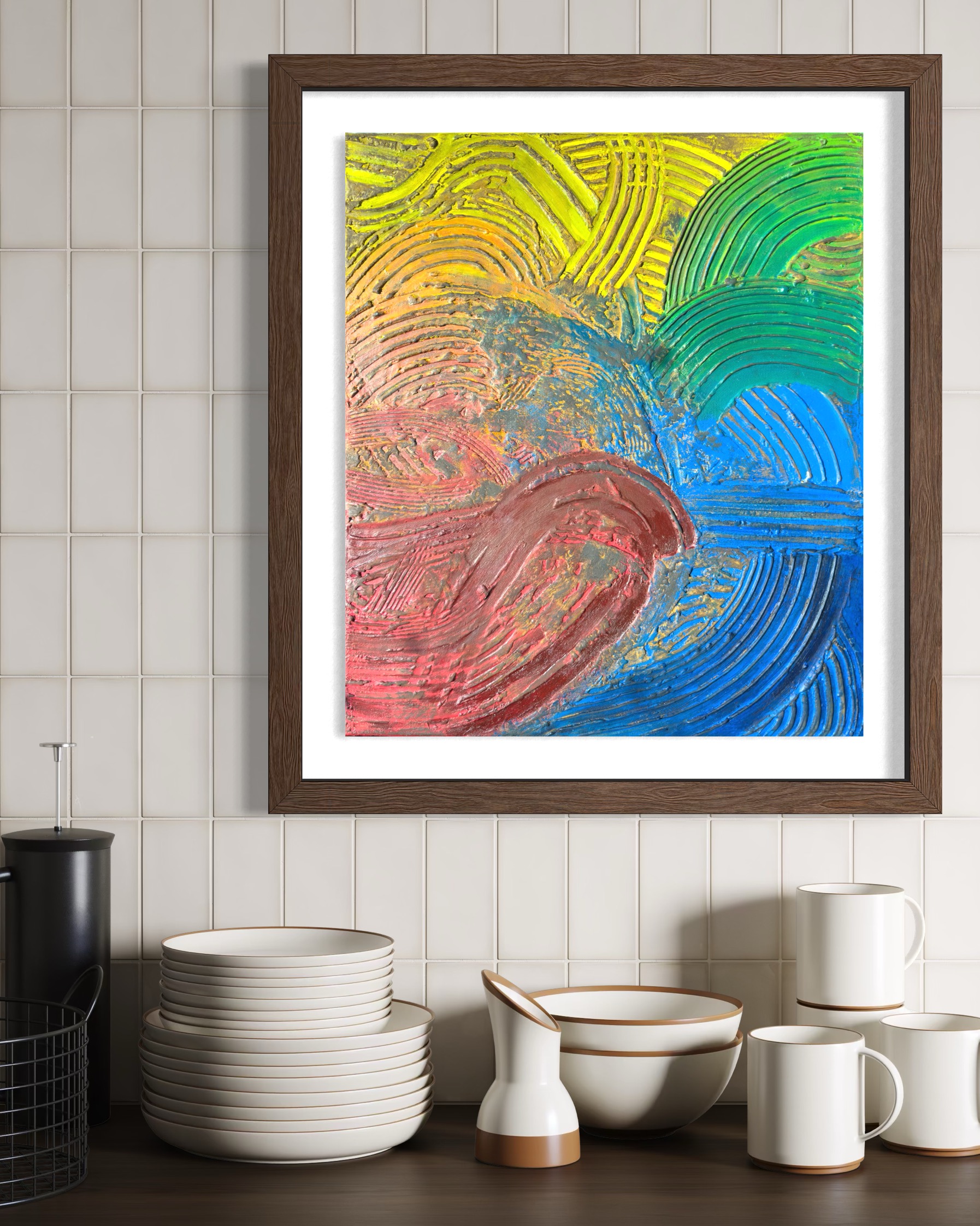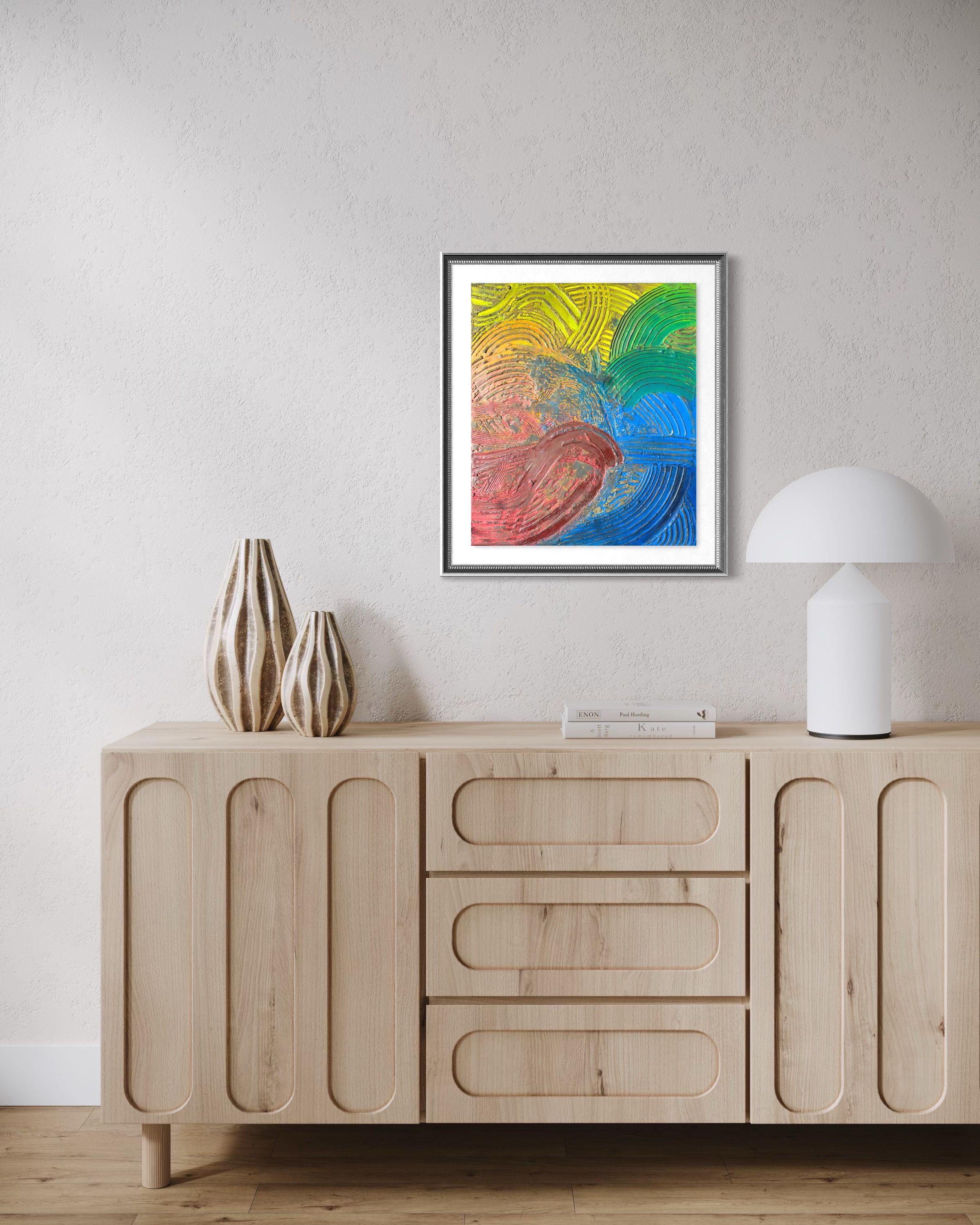 This canvas is not a record, but a living scar. The ridge, exposed to the world's friction, burns with actual rust. The groove, deep and silent, swallows color to keep it pure, following the logic of dyeing (染). Fragments of yellow, green, and blue scatter across the surface—emotions that refused to fade. This work captures the moment when time stops flowing and starts sedimenting. It is beautiful because it endures.