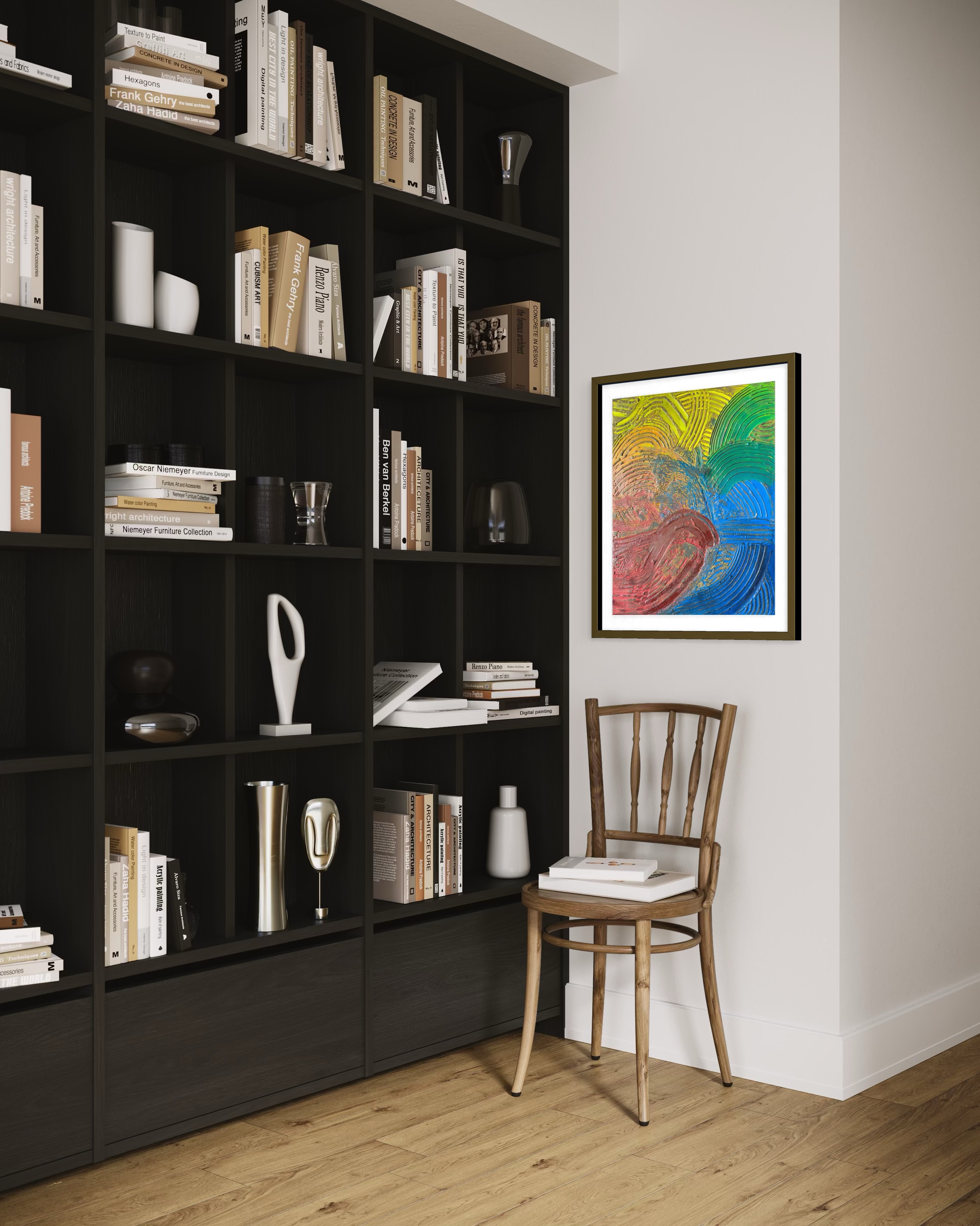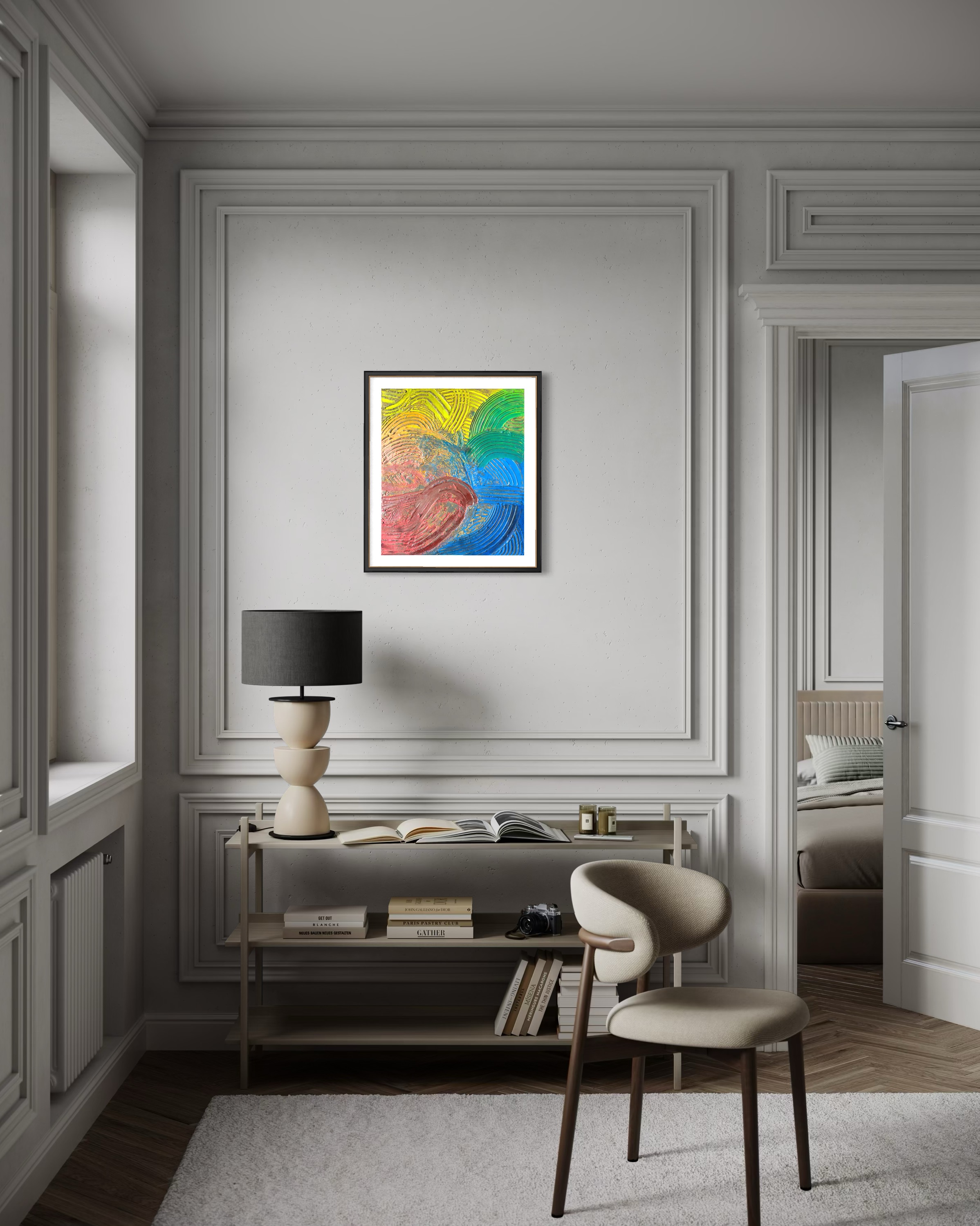 The six radial zones of yellow, green, and blue do not map a political agenda, but rather chart the fractured landscape of the human psyche. These are shards of emotion—rage, hope, melancholy—that have splintered under pressure yet remain tethered to a single center. The artist offers no grand resolution to this fragmentation. Instead, he presents a geology of poly-affective states, where conflicting emotions are forced to coexist within one body and one timeline. It is a portrait of a mind holding itself together against the centrifugal force of entropy.