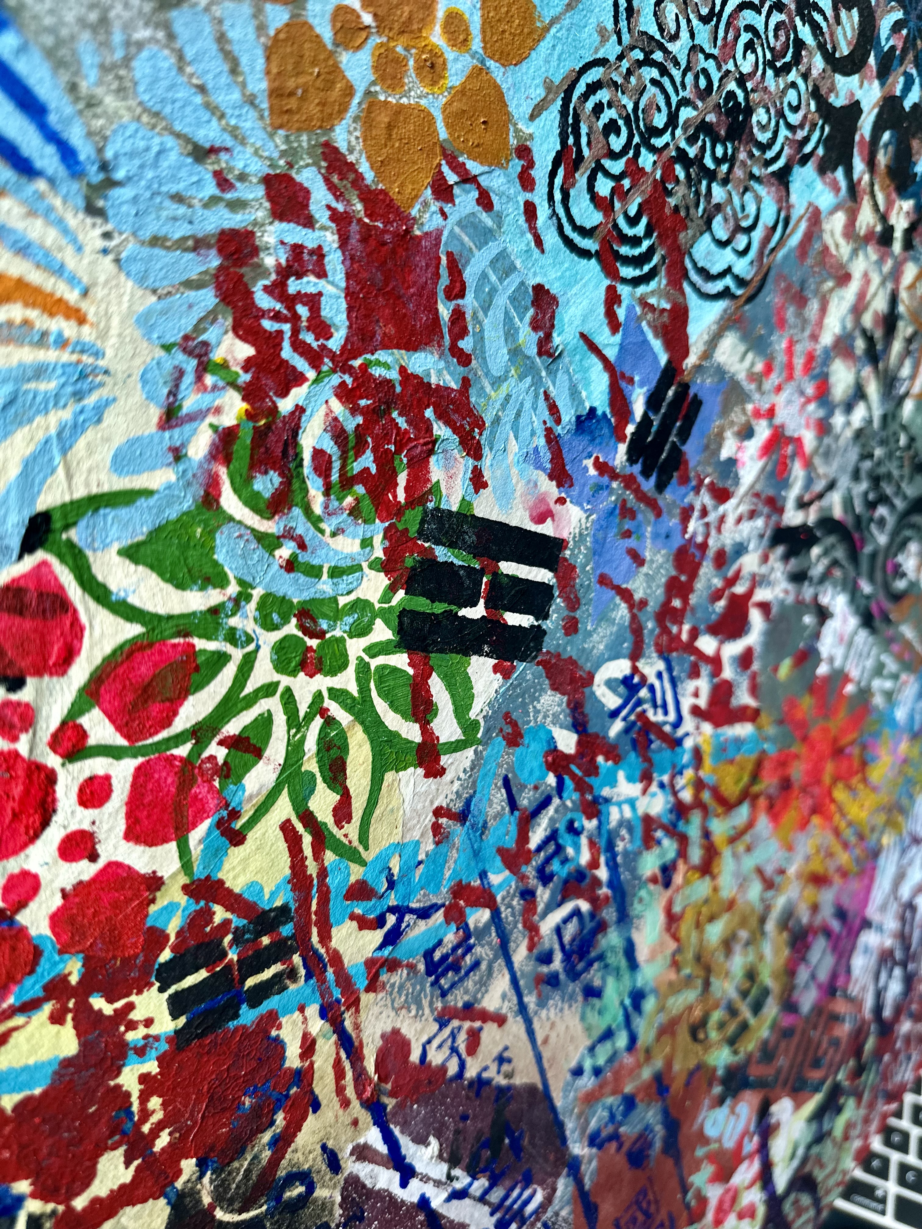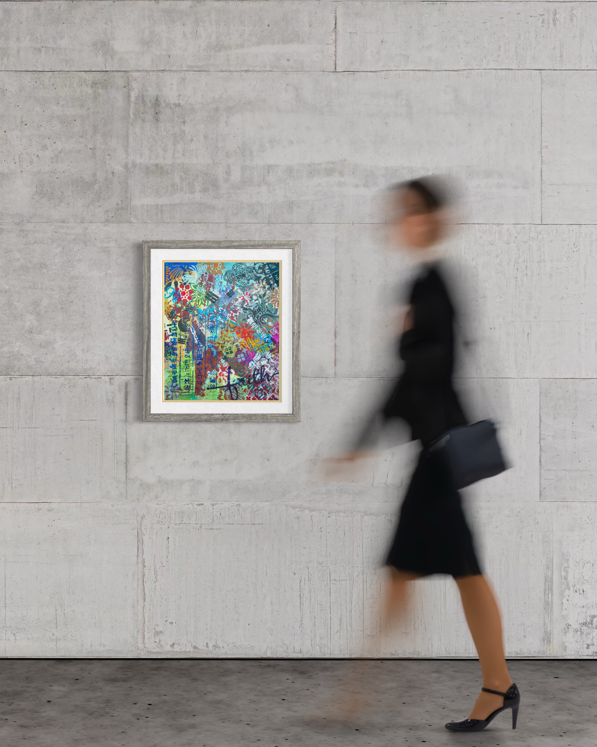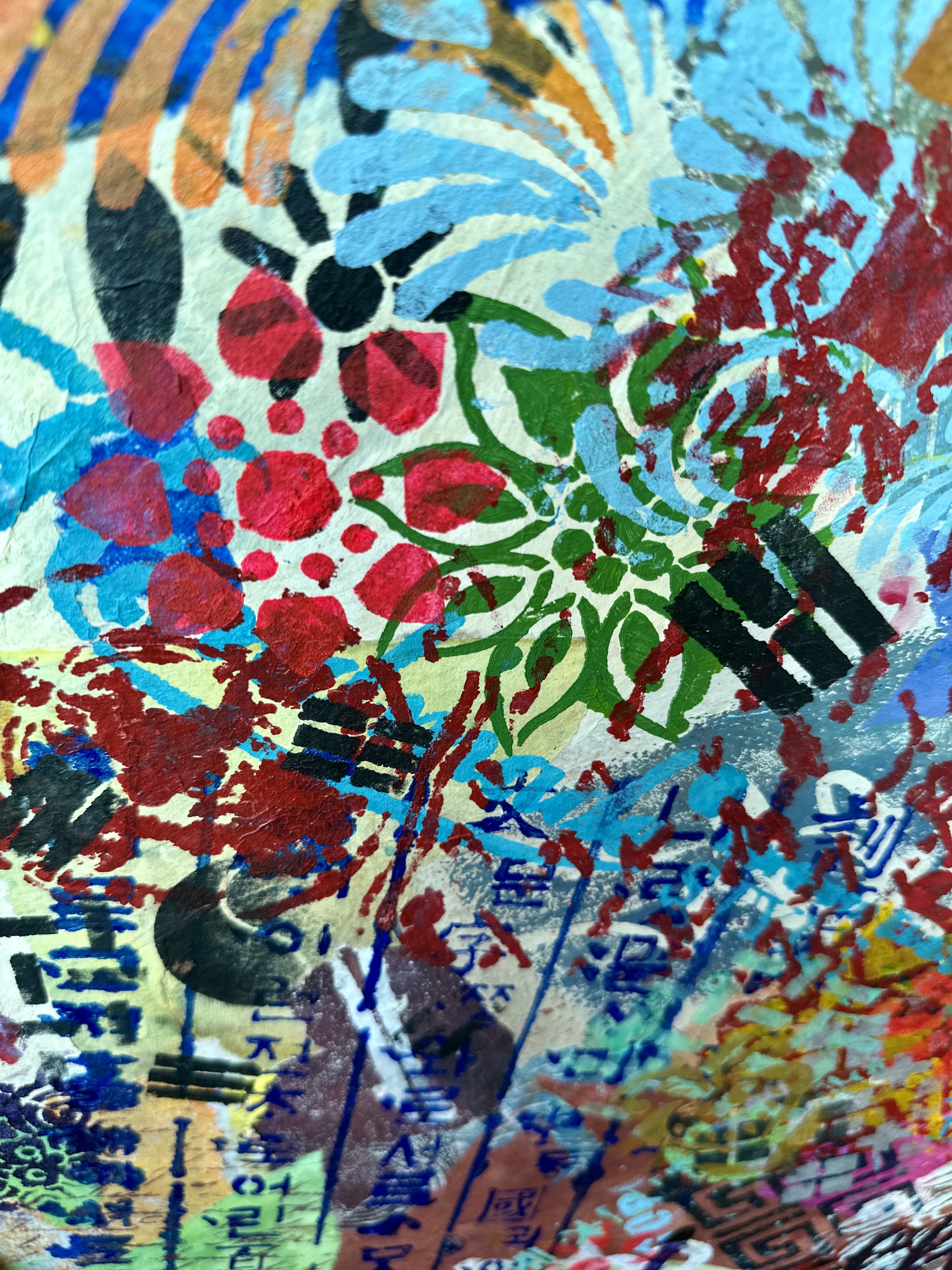What distinguishes this work from many contemporaries is restraint. There is no didactic impulse, no symbolic overload. The painting trusts its materials. Hanji absorbs pigment and holds depth. Stencil imposes structure. Overlaps create friction without drama. The result is a surface that feels lived-in rather than performed.
