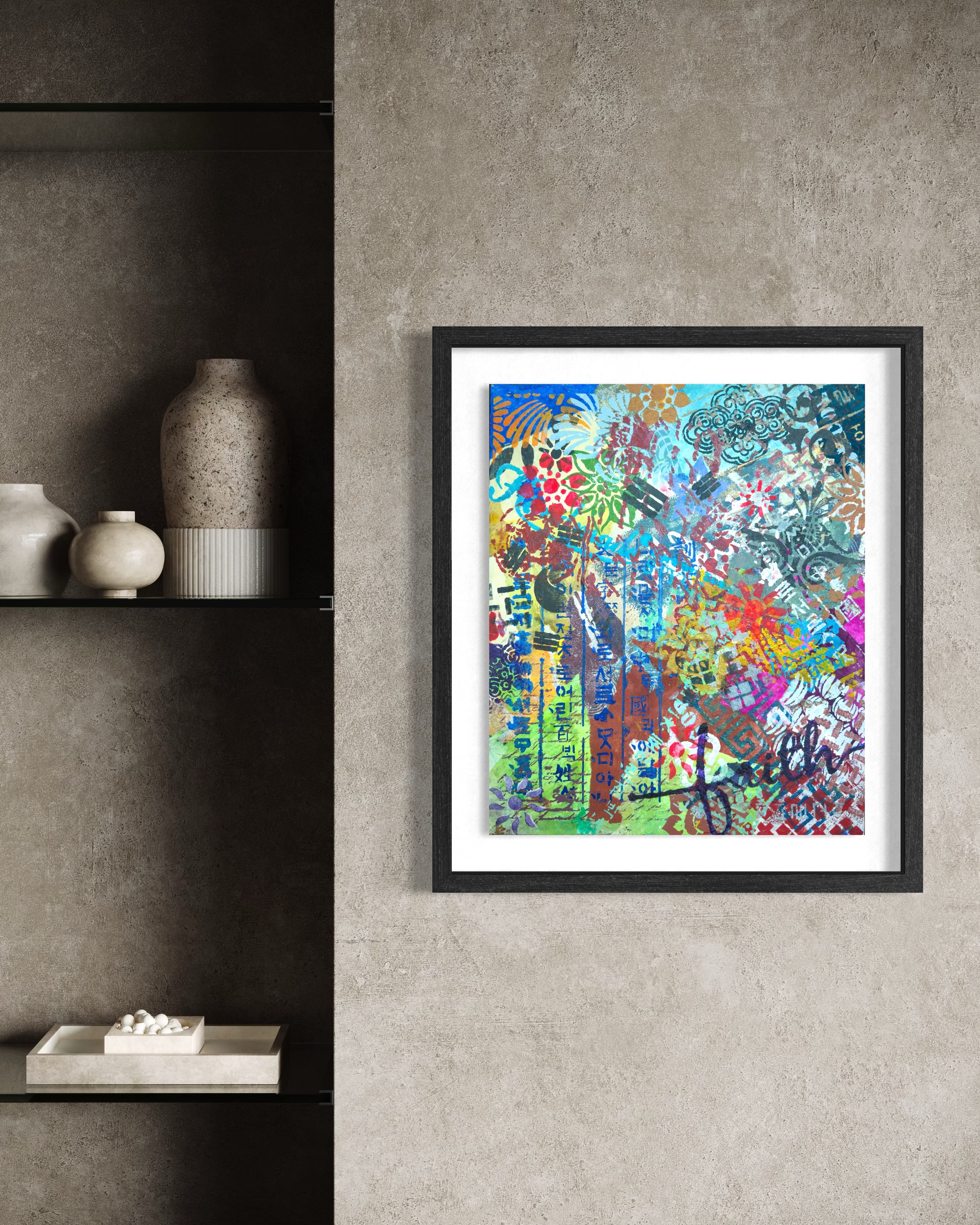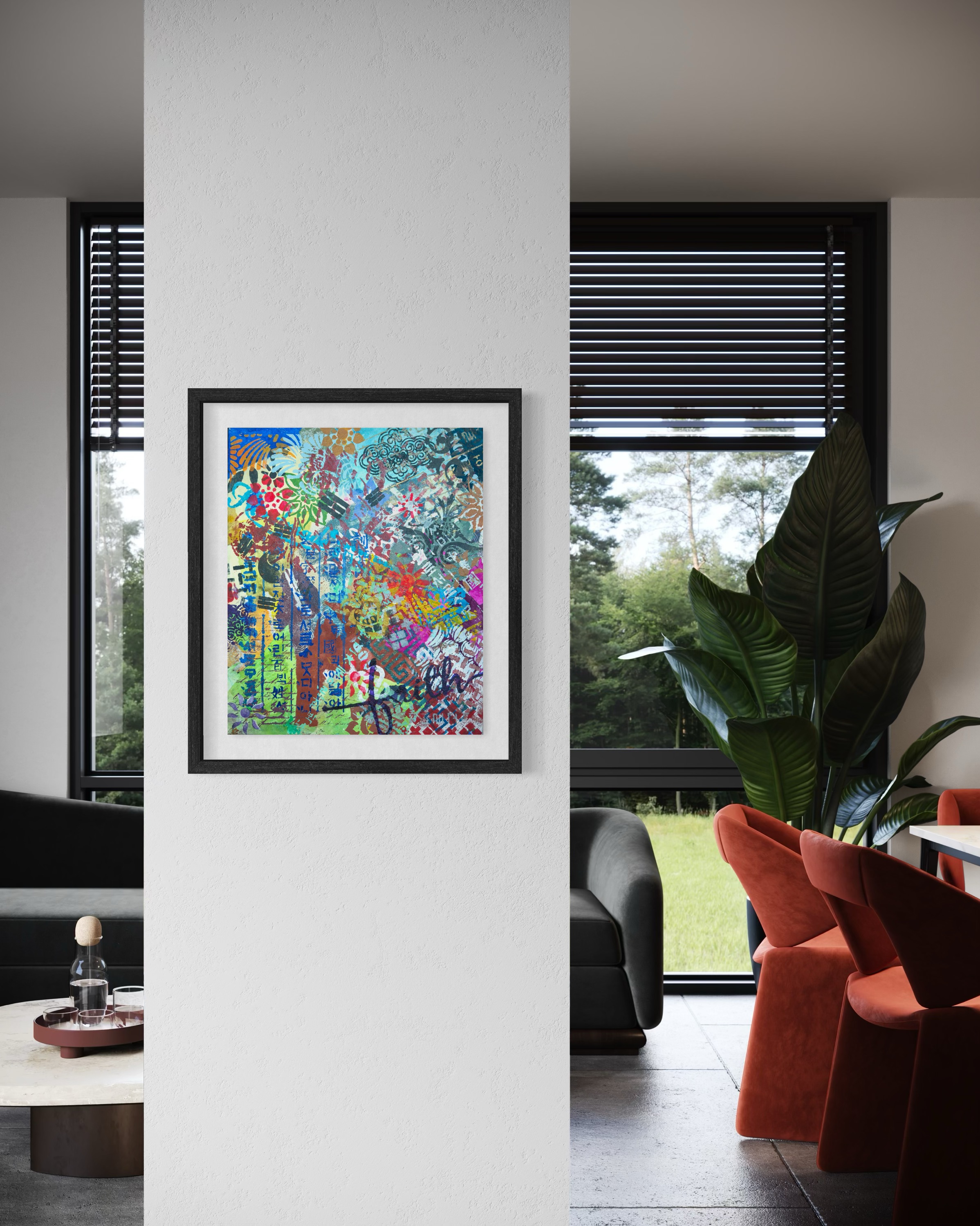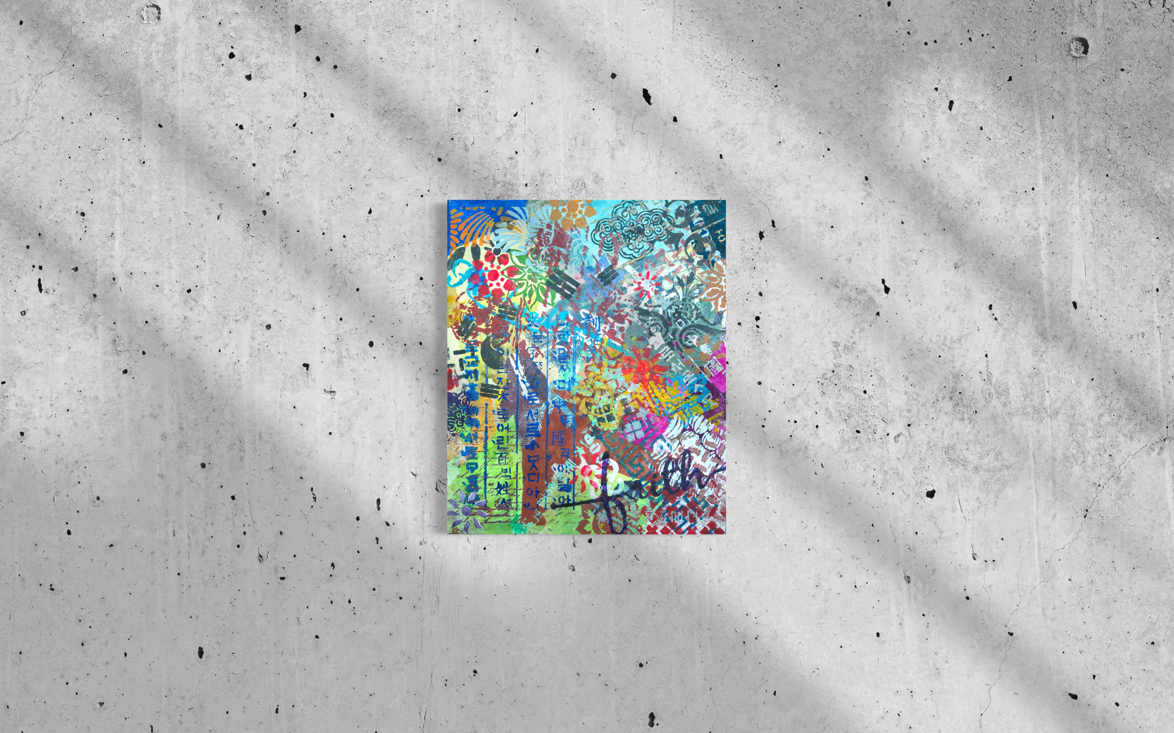 What distinguishes this work from many contemporaries is restraint. There is no didactic impulse, no symbolic overload. The painting trusts its materials. Hanji absorbs pigment and holds depth. Stencil imposes structure. Overlaps create friction without drama. The result is a surface that feels lived-in rather than performed.