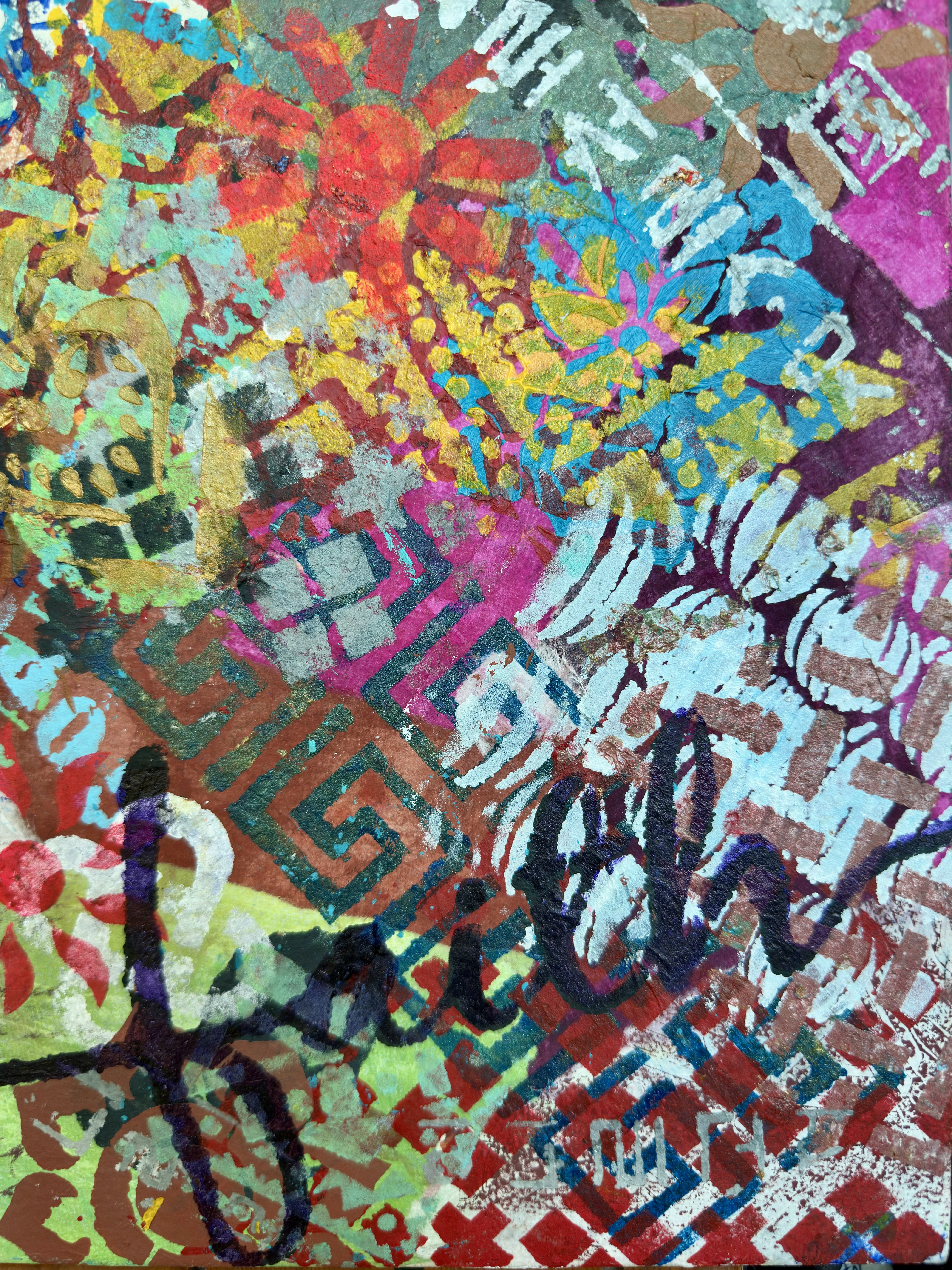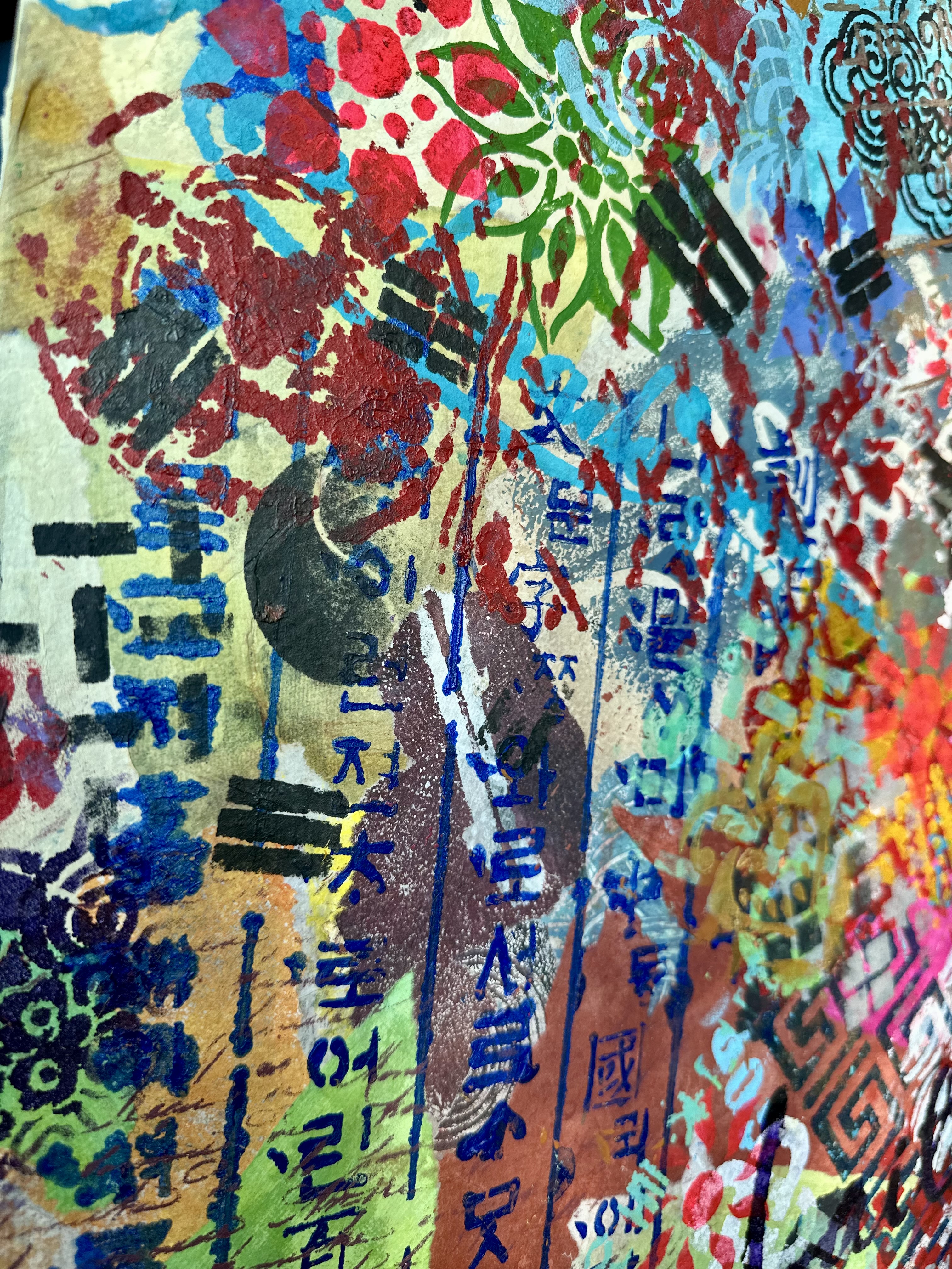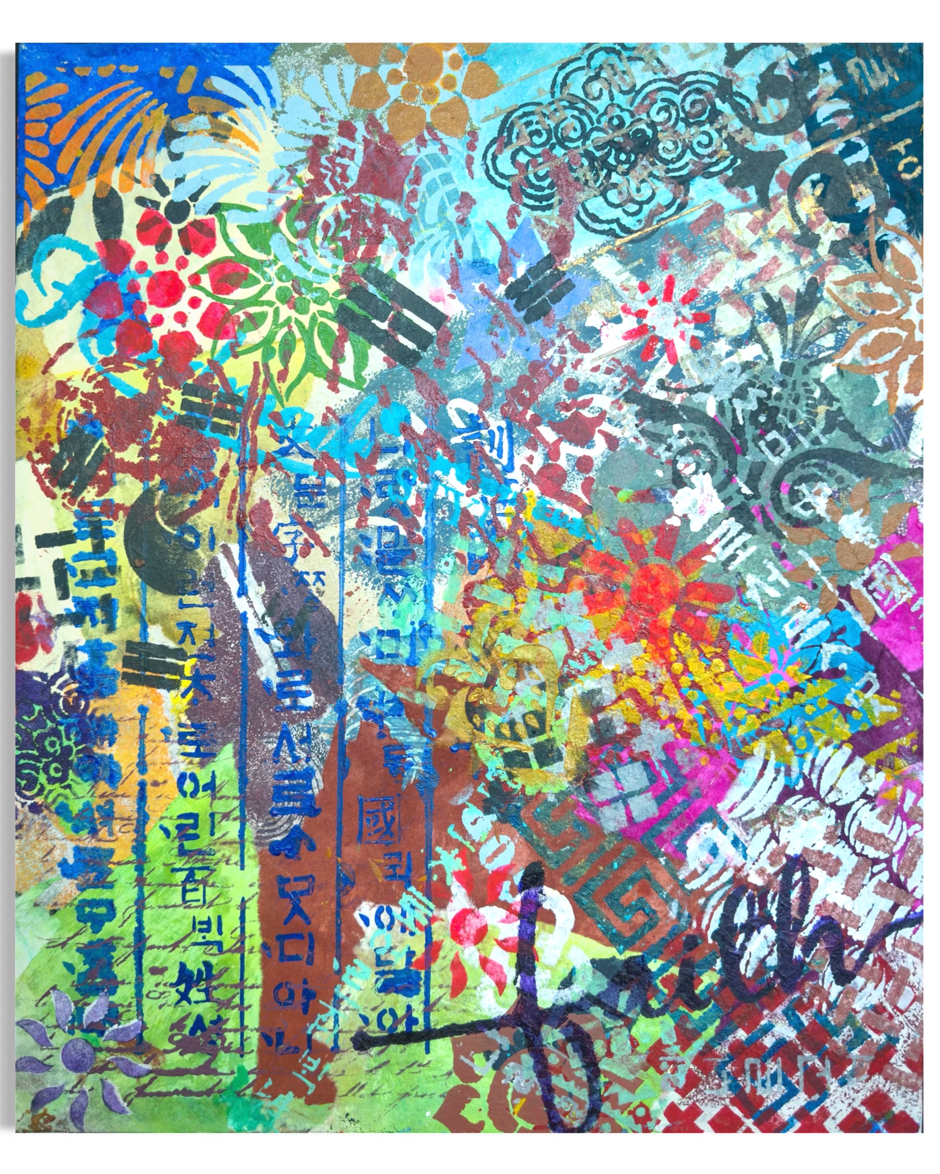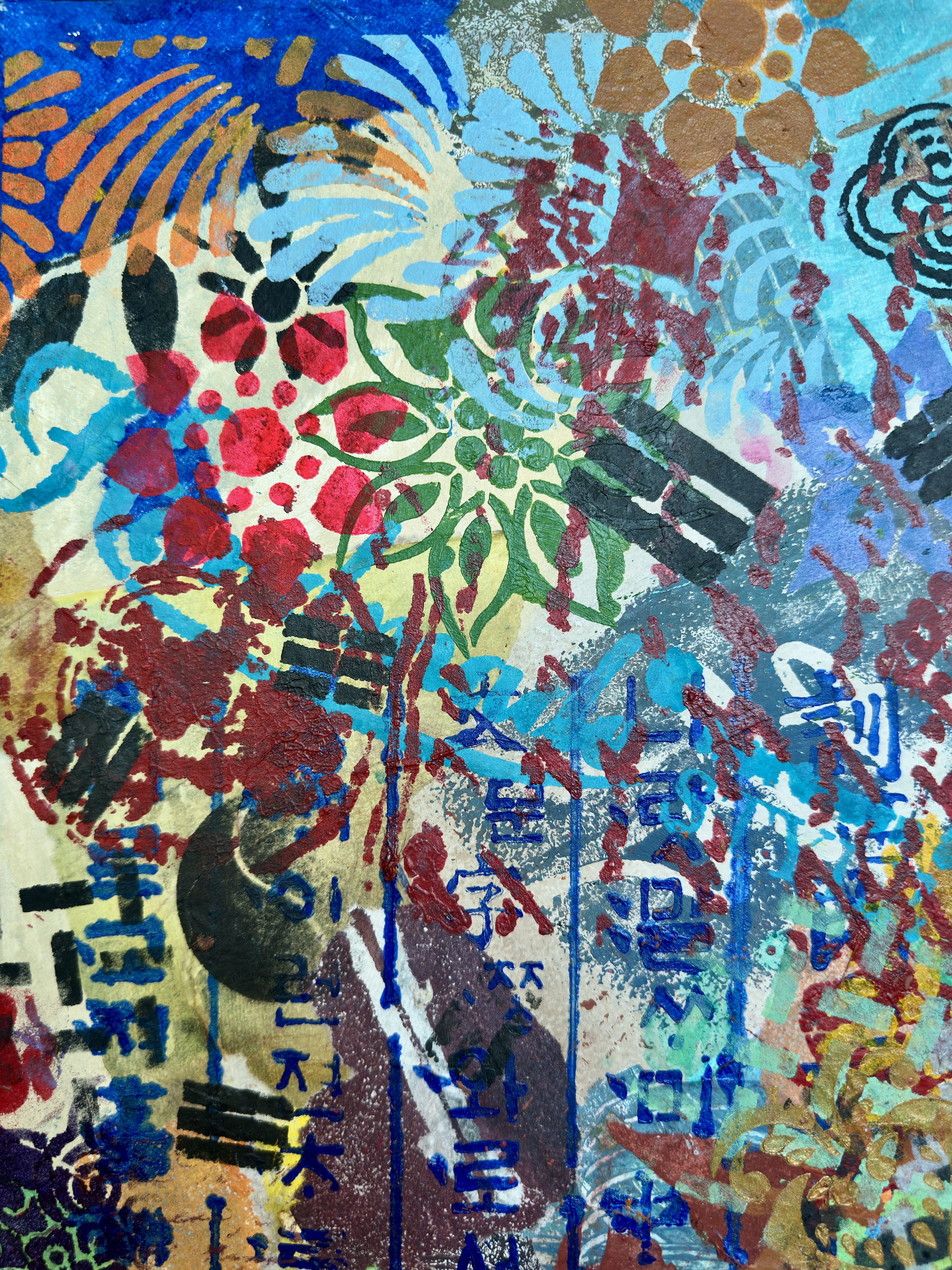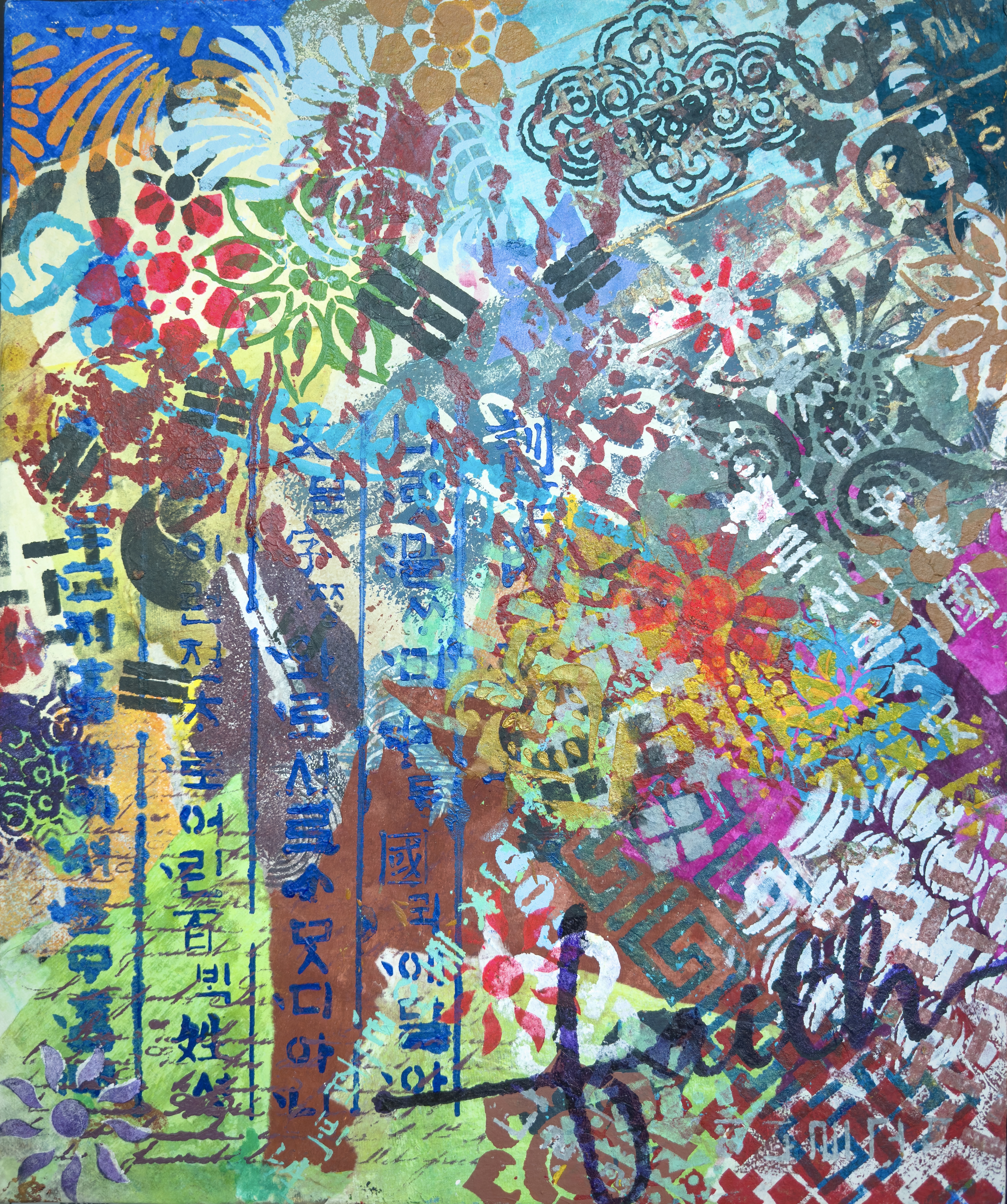 Mixed media on canvas (Dyed hanji and gel-printed hanji collage, acrylic stencil)
