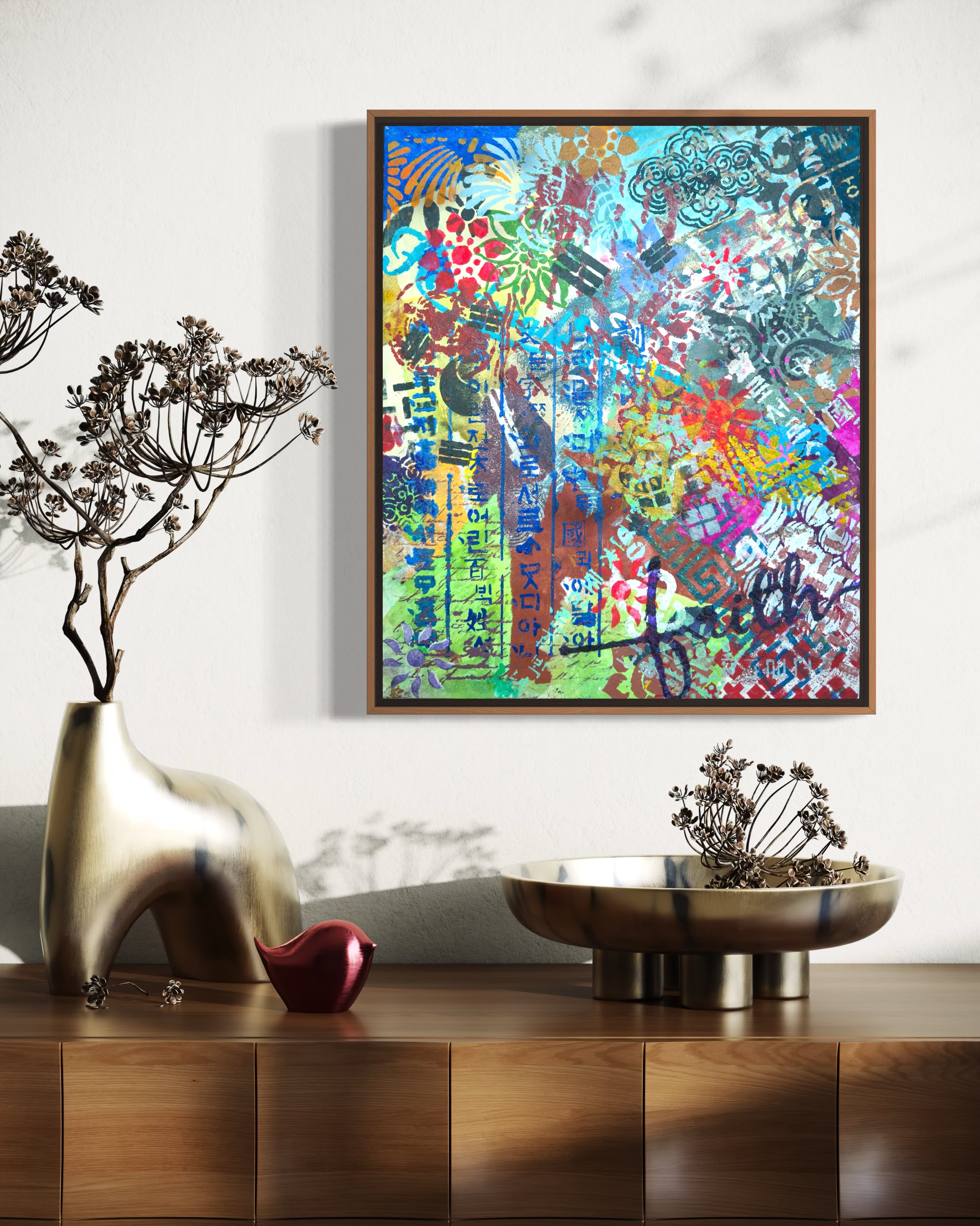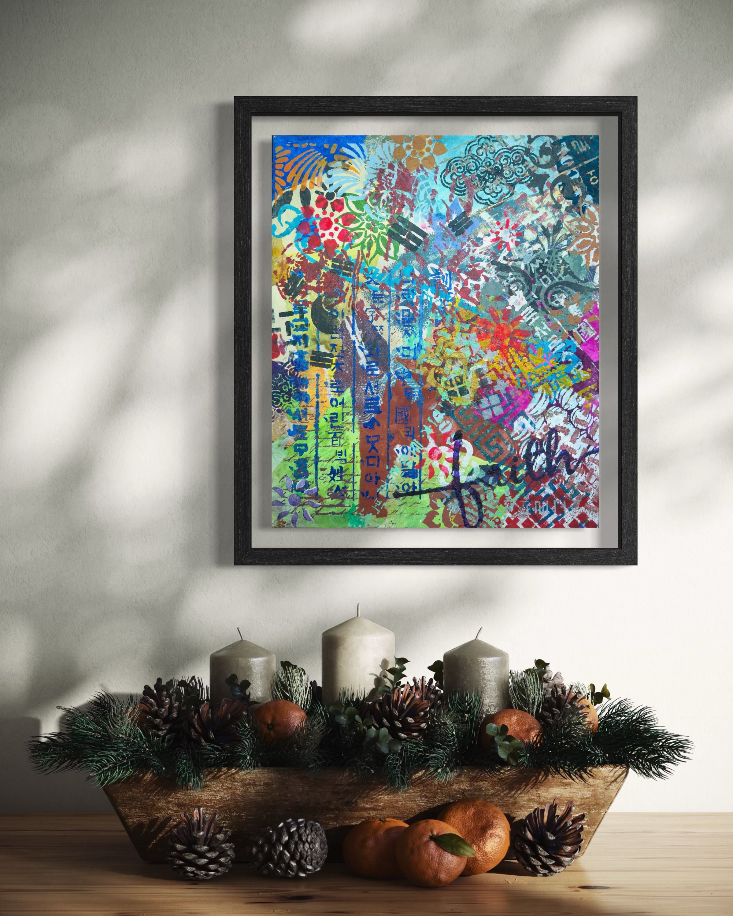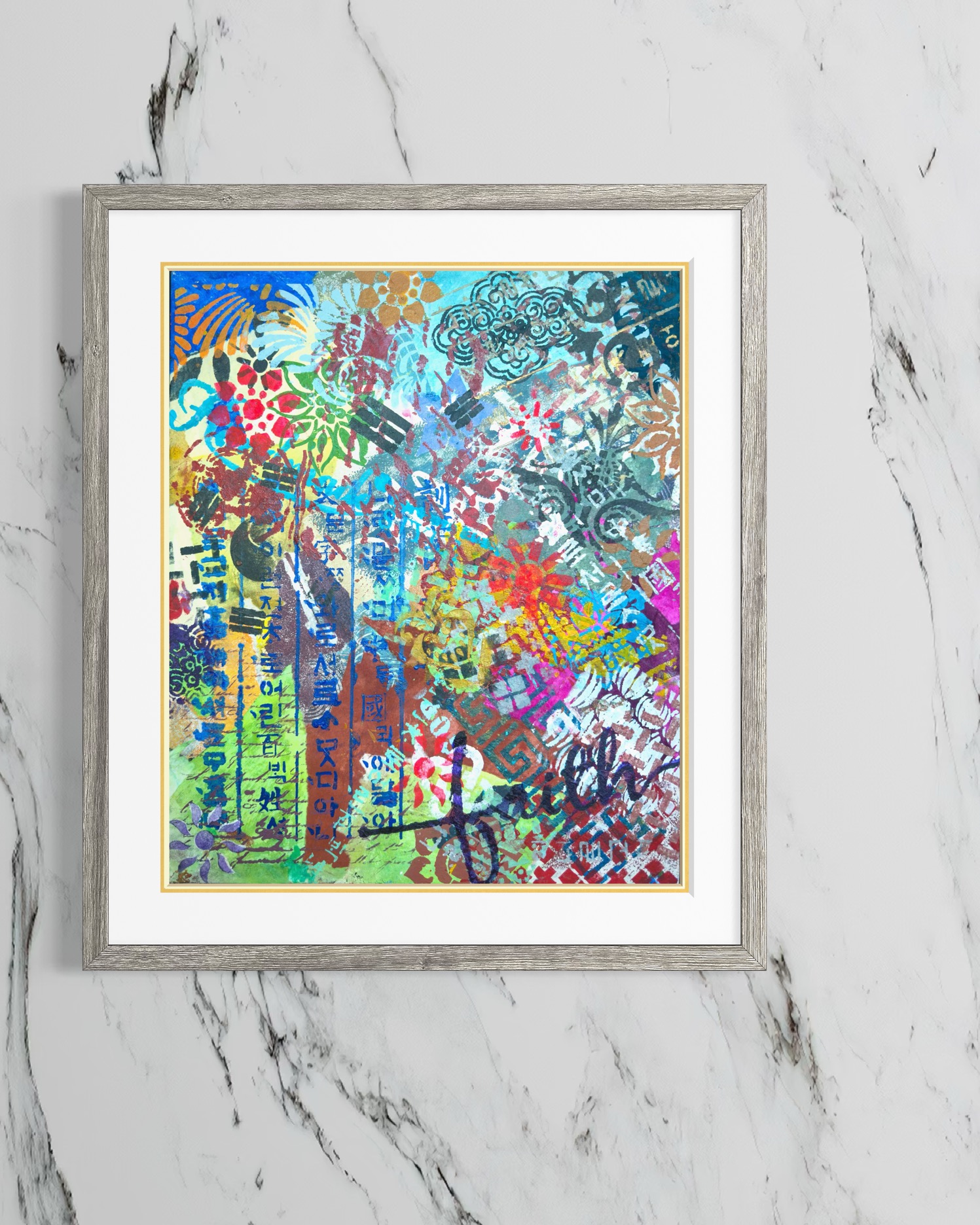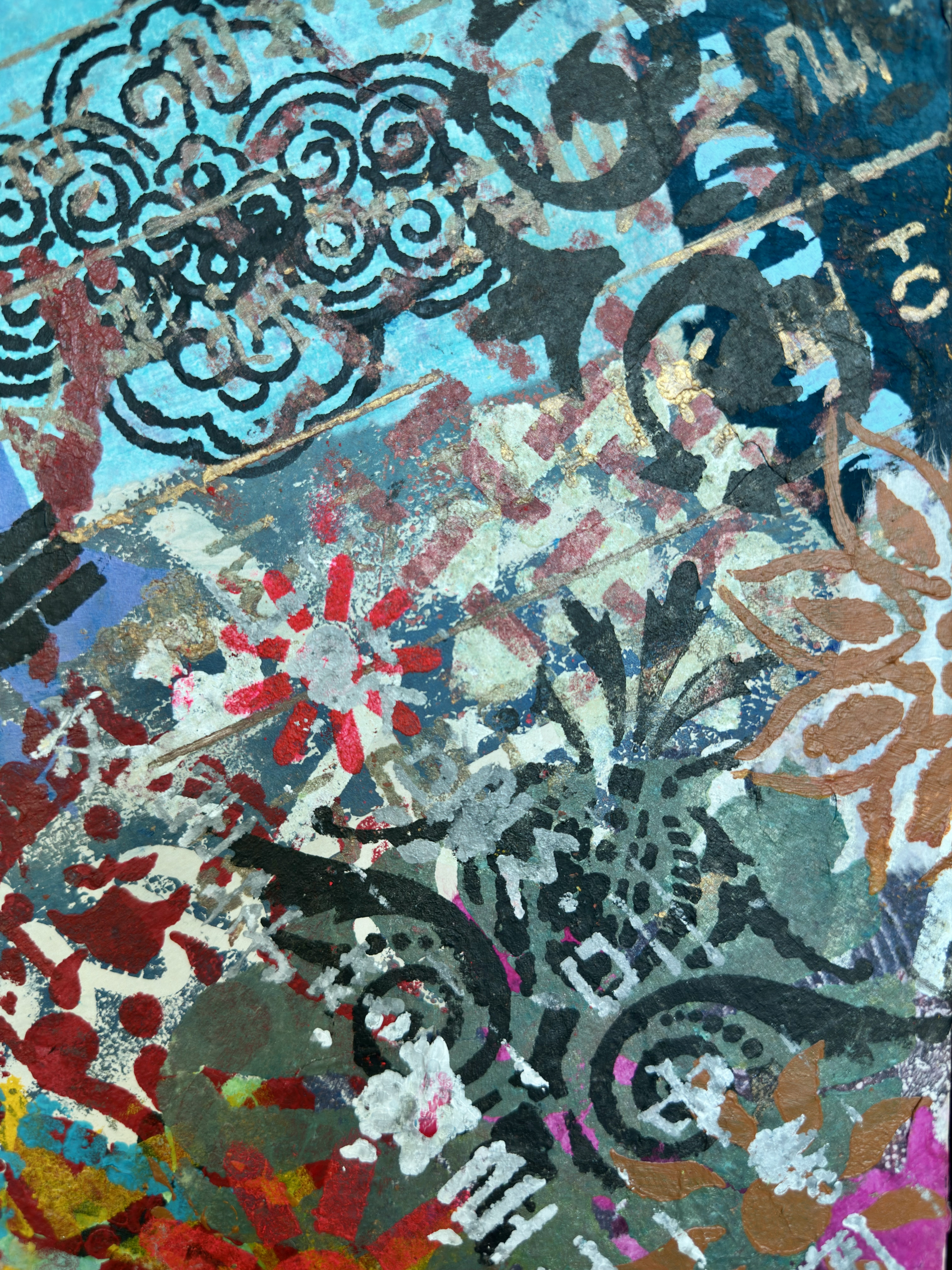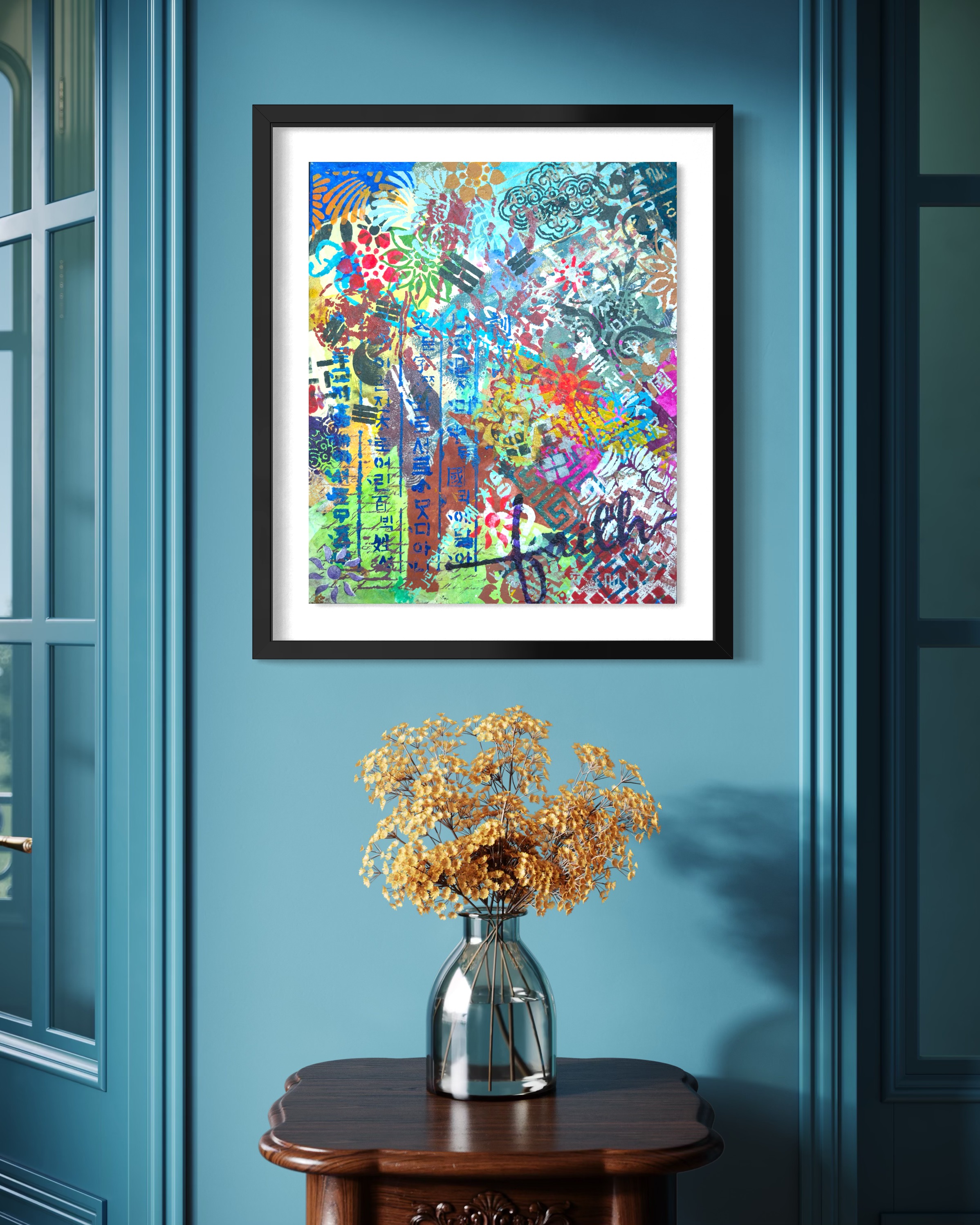 Mixed media on canvas (Dyed hanji and gel-printed hanji collage, acrylic stencil)