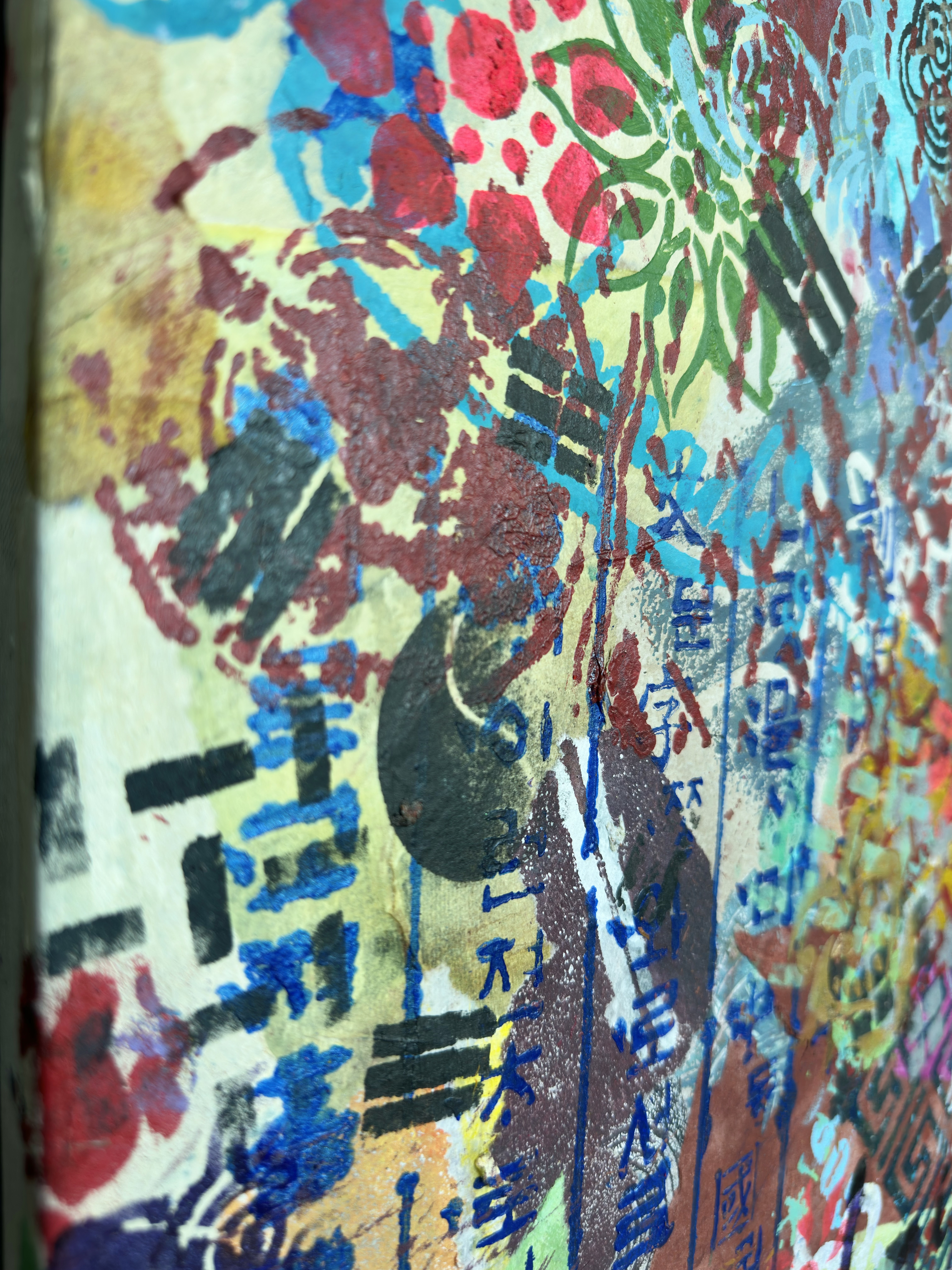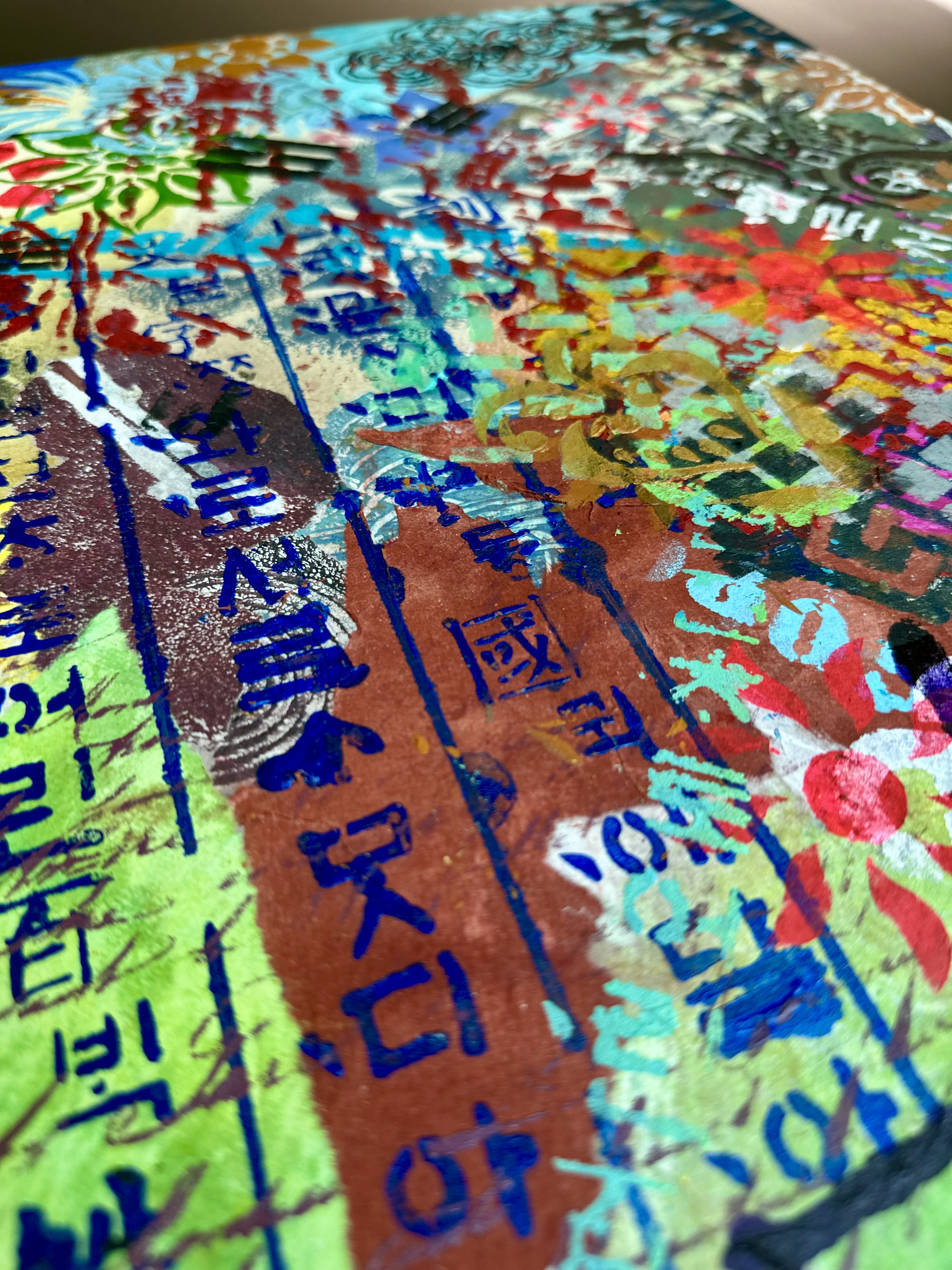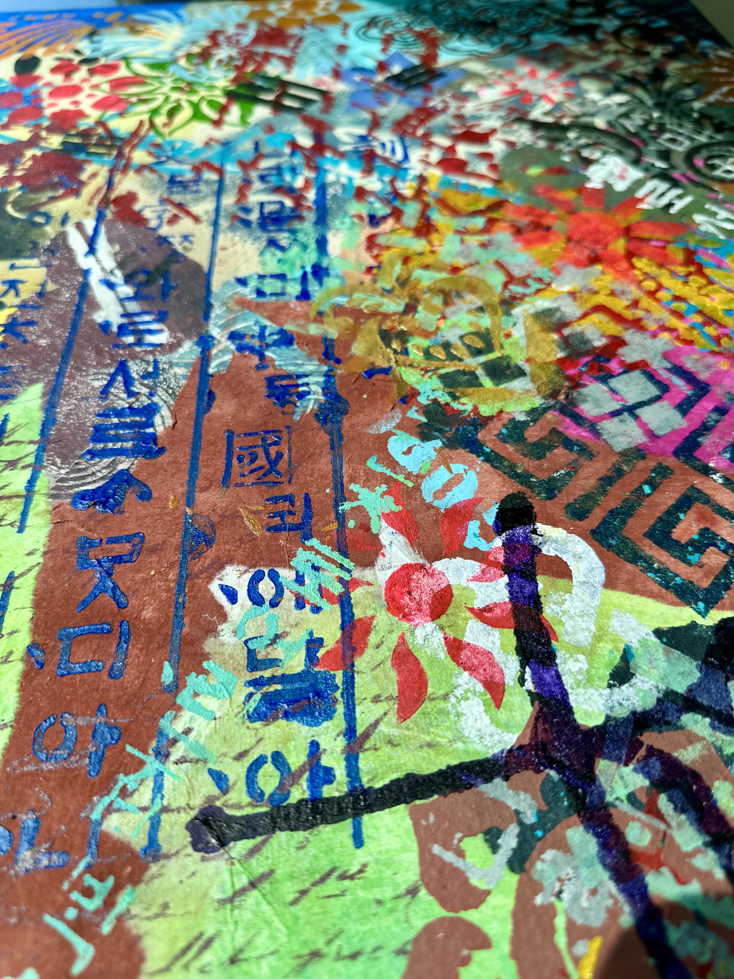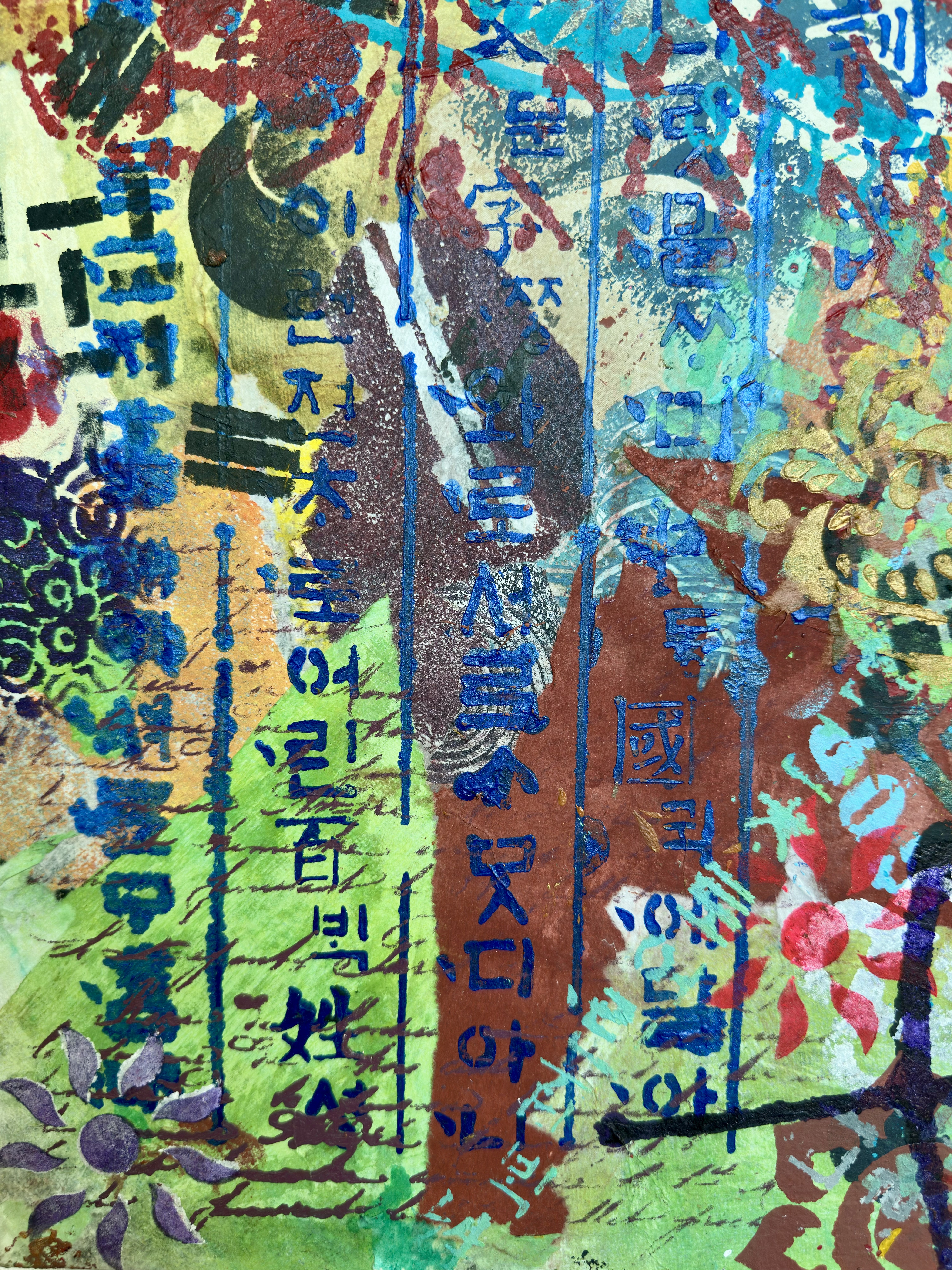 Vertically along the margin, Hangul characters in dark indigo stencil. The positioning insists on its own logic. This descent mirrors a generational experience. The artist grew up in a time when Western forms seemed the default template for modernity. To be contemporary meant to move away from the local. The childhood dream was to escape into Western visual culture. Now the vectors have reversed. K-culture occupies global space without asking permission. The artist finds herself in a strange position: what she spent her youth seeking externally is now available internally. The question is no longer "How do I access the global?" but "Now that the global has come home, who am I?"