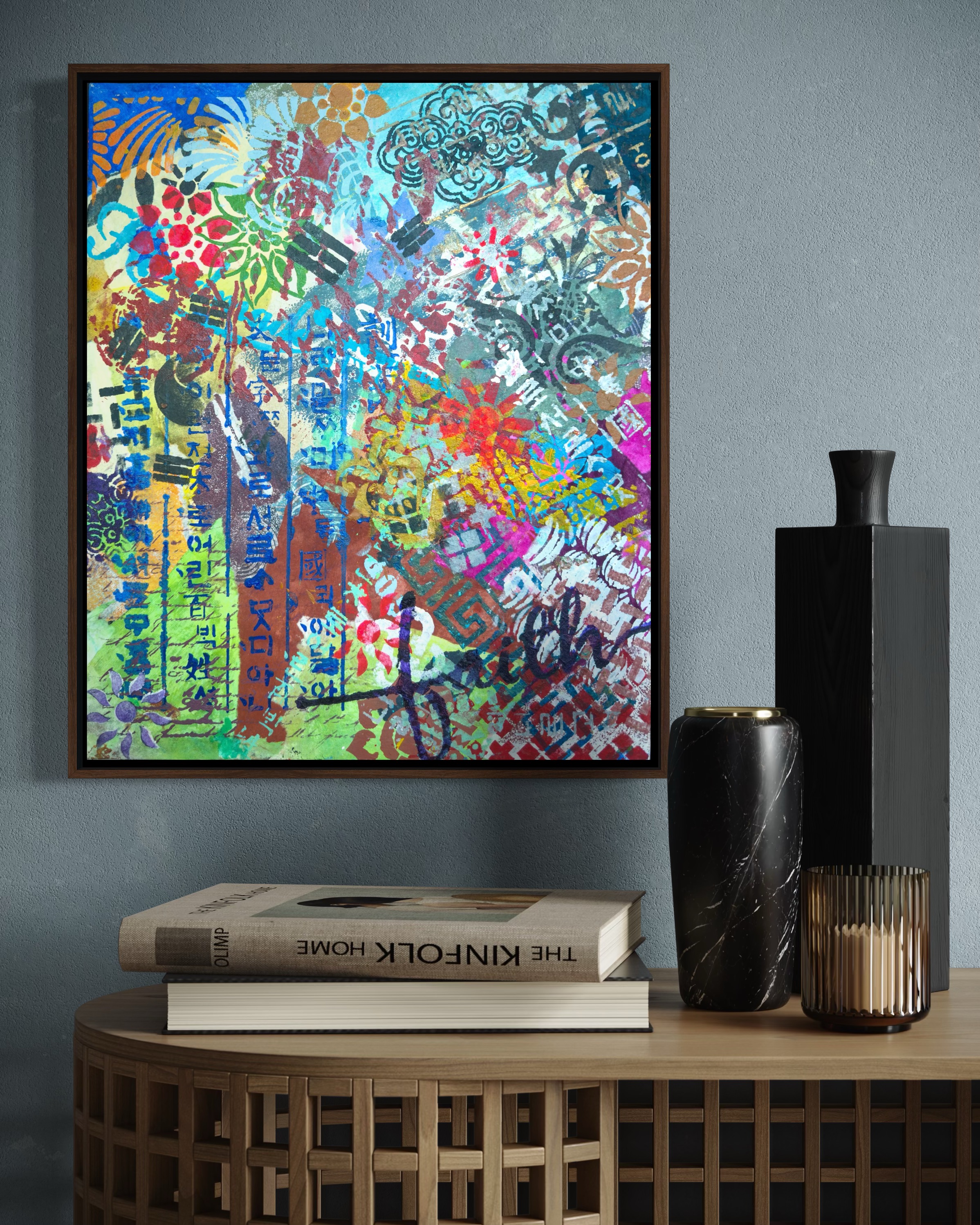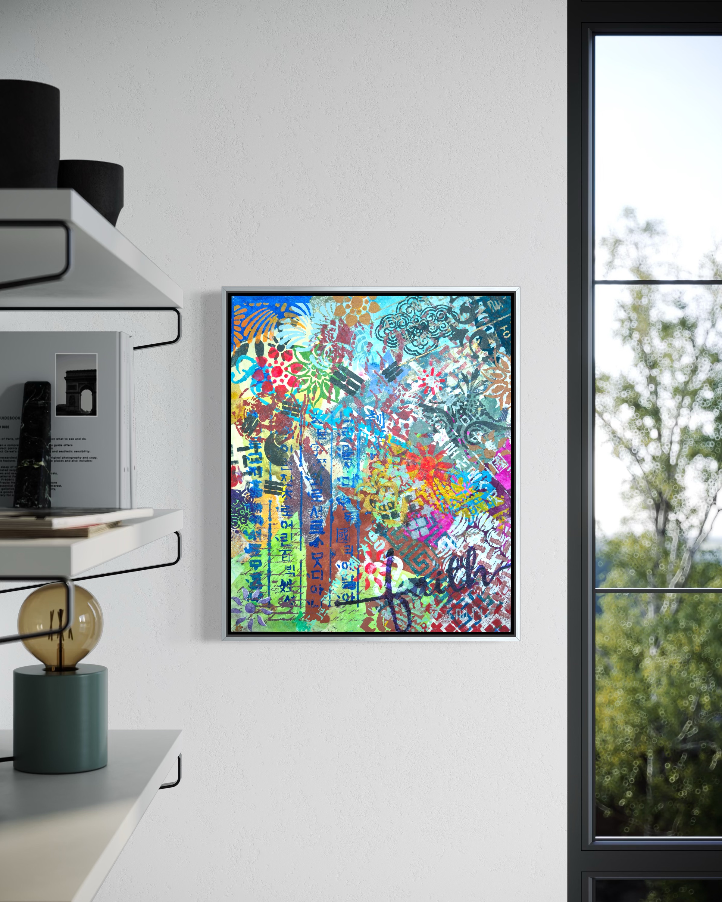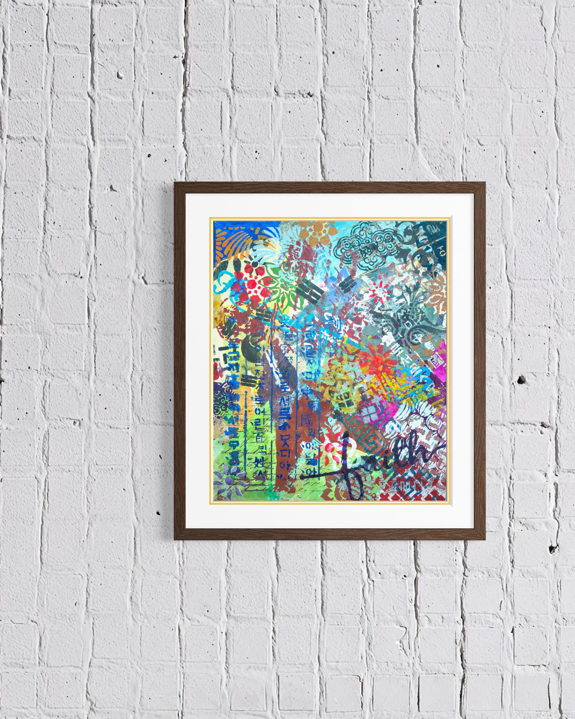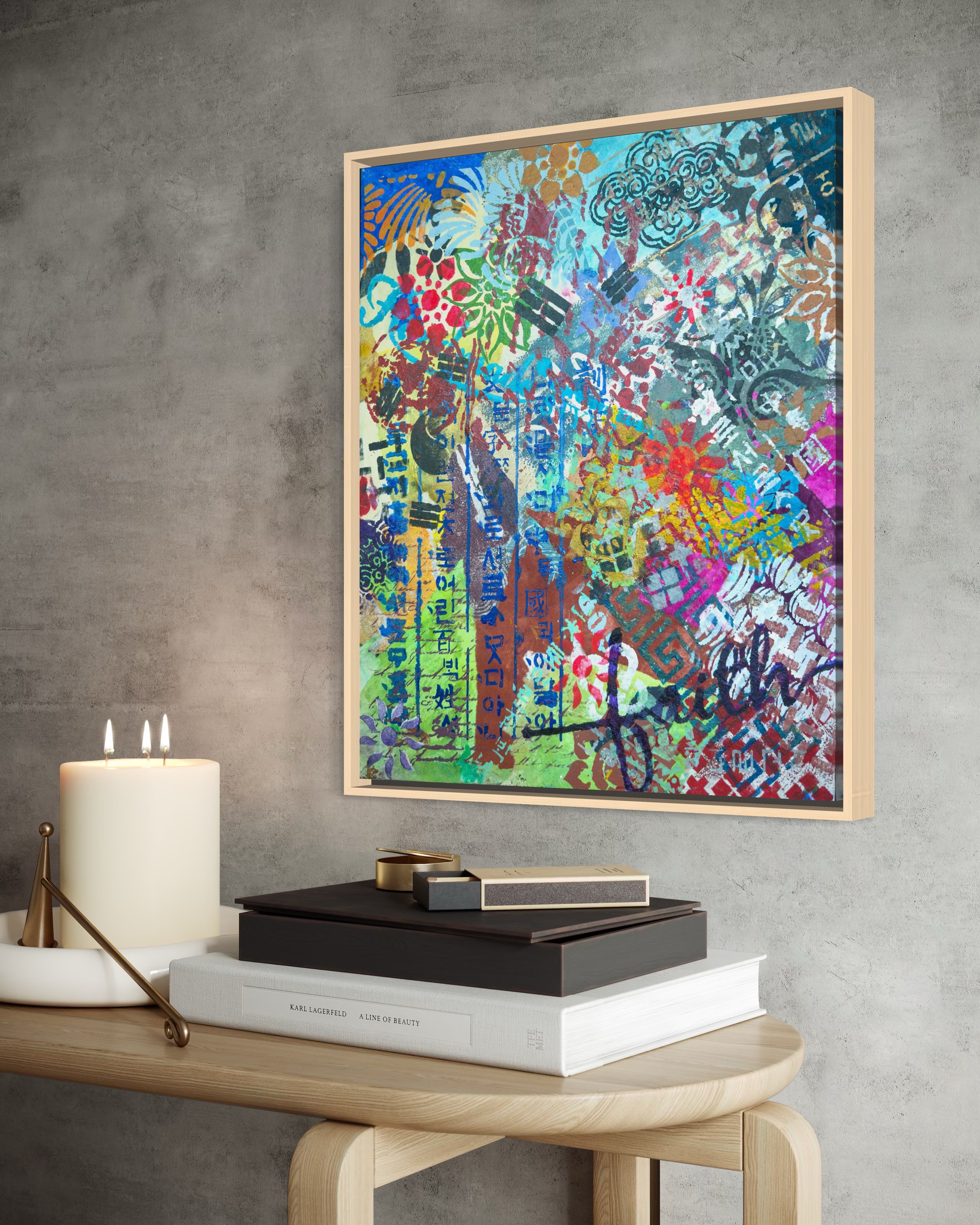 Vertically along the margin, Hangul characters in dark indigo stencil. The positioning insists on its own logic. This descent mirrors a generational experience. The artist grew up in a time when Western forms seemed the default template for modernity. To be contemporary meant to move away from the local. The childhood dream was to escape into Western visual culture. Now the vectors have reversed. K-culture occupies global space without asking permission. The artist finds herself in a strange position: what she spent her youth seeking externally is now available internally. The question is no longer "How do I access the global?" but "Now that the global has come home, who am I?"