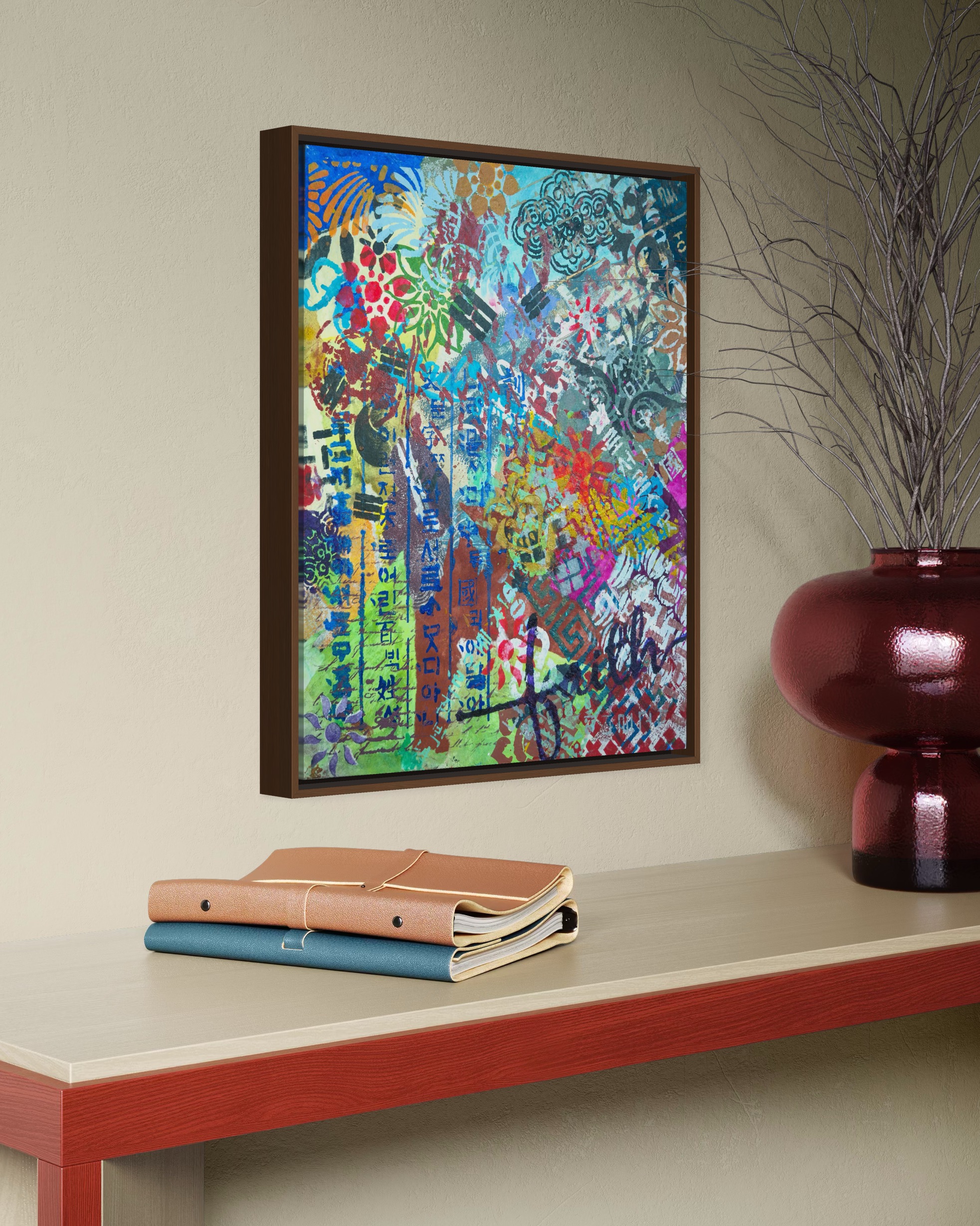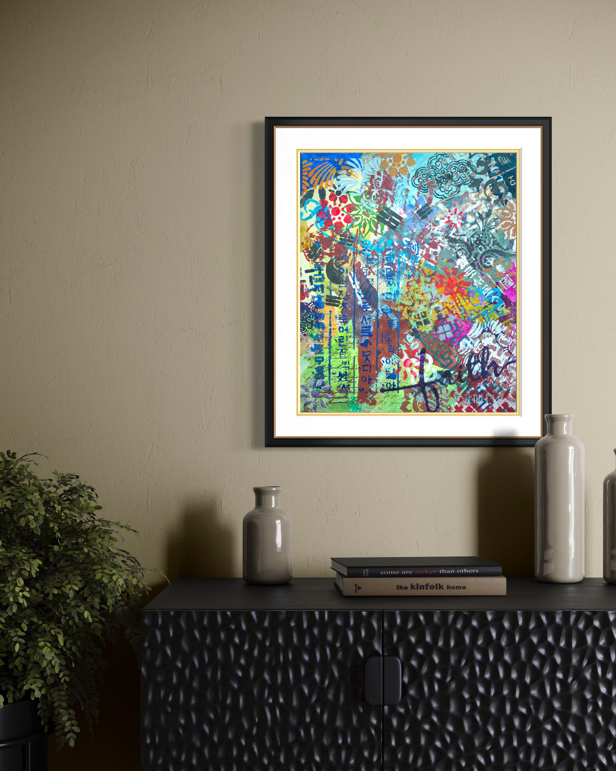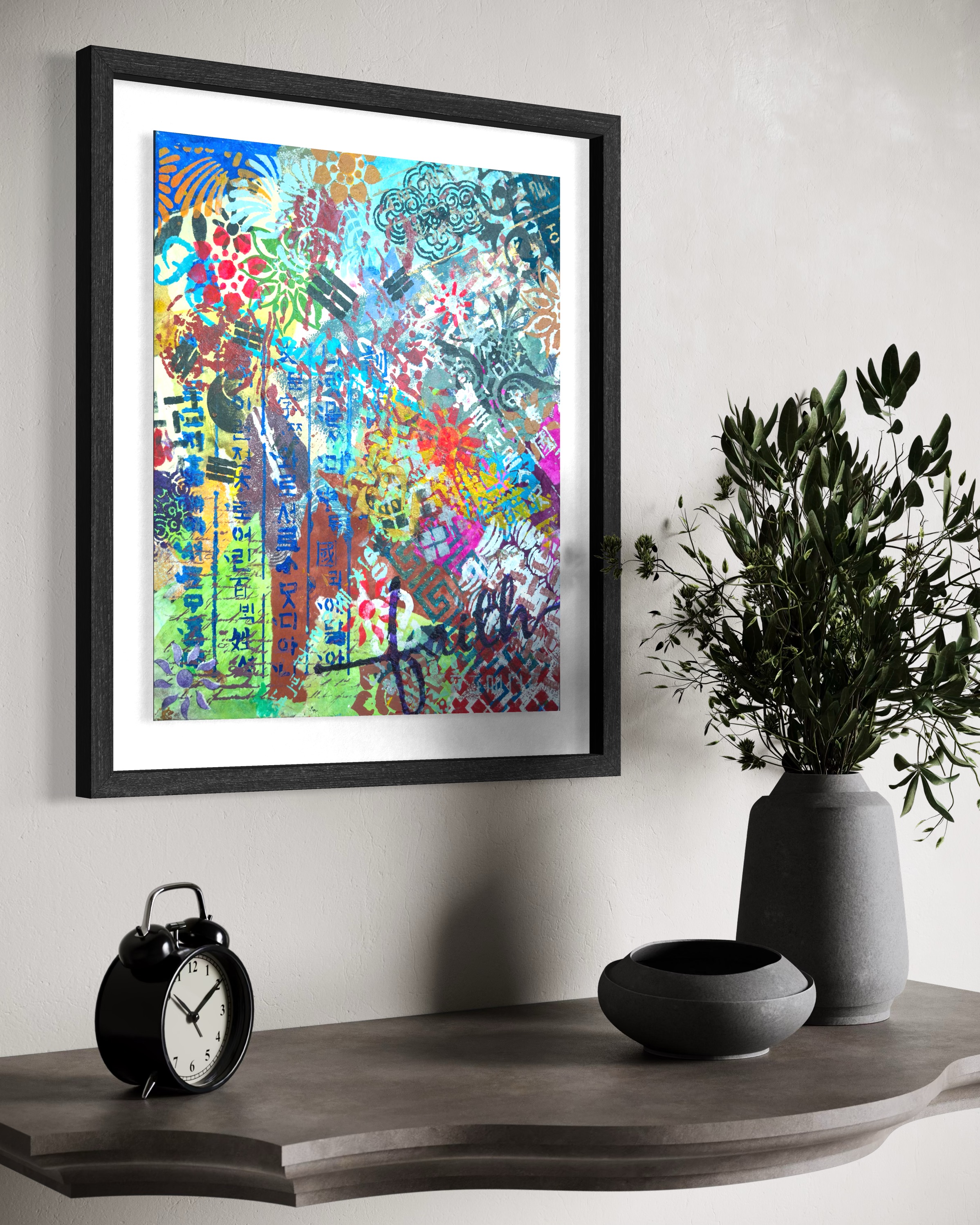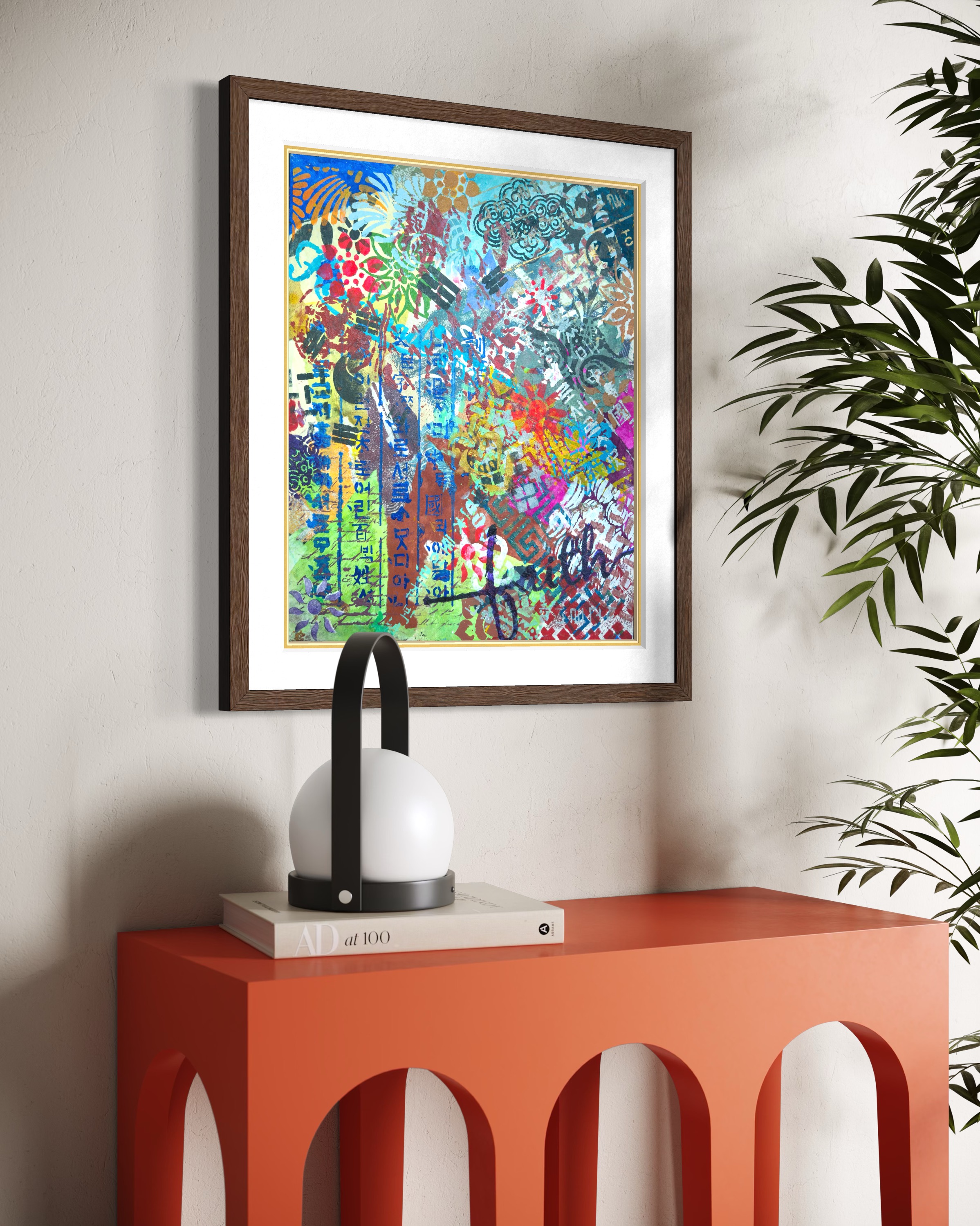 Vertically along the margin, Hangul characters in dark indigo stencil. The positioning insists on its own logic. This descent mirrors a generational experience. The artist grew up in a time when Western forms seemed the default template for modernity. To be contemporary meant to move away from the local. The childhood dream was to escape into Western visual culture. Now the vectors have reversed. K-culture occupies global space without asking permission. The artist finds herself in a strange position: what she spent her youth seeking externally is now available internally. The question is no longer "How do I access the global?" but "Now that the global has come home, who am I?"