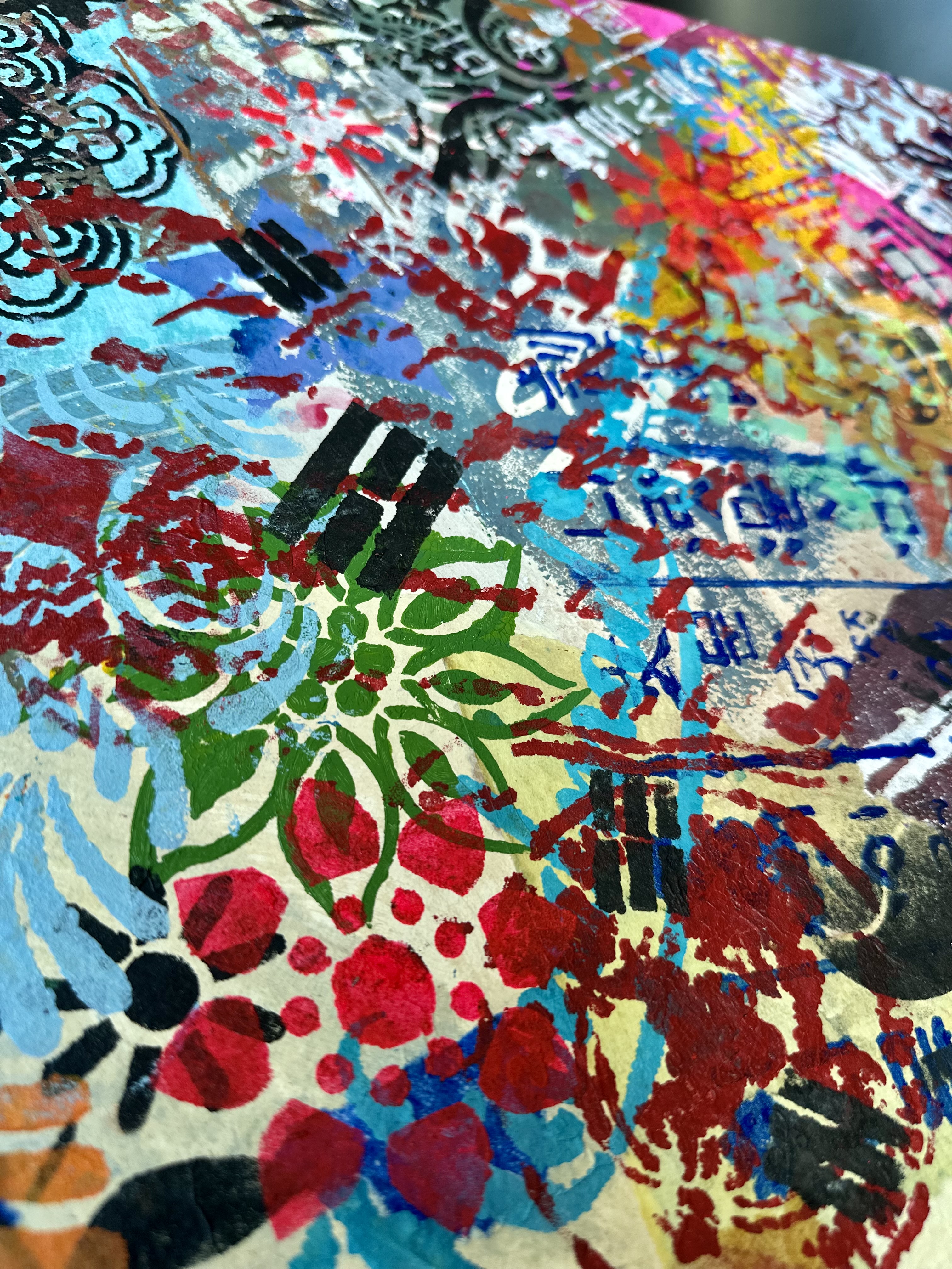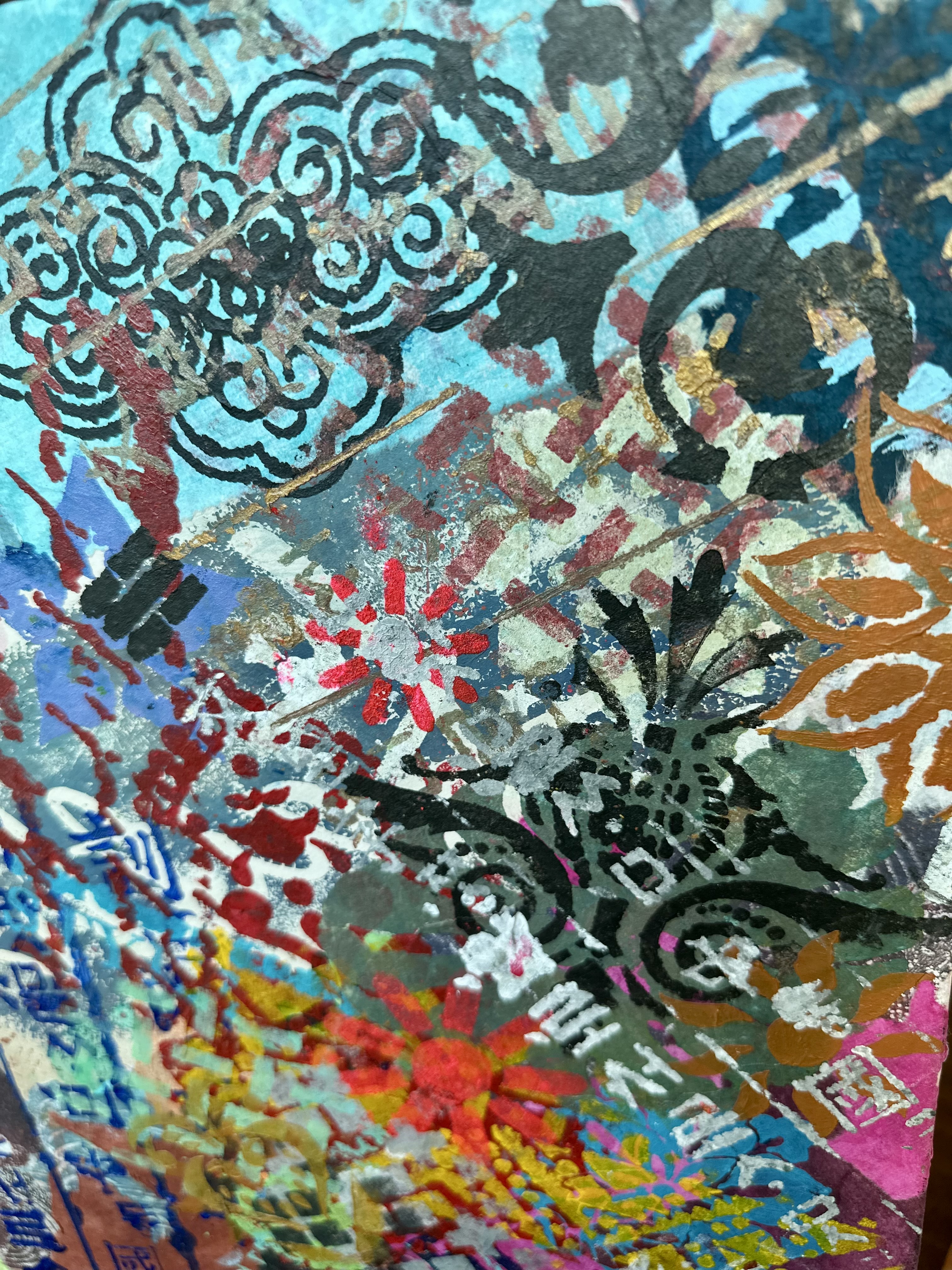 The work builds itself through collision without synthesis. Sheets of dyed hanji—each one already a choice—are placed against one another. The paper absorbs pigment deep within its fiber. Where these papers overlap, there is visual friction: one tone meeting another, neither yielding. Over this foundation, stenciled patterns emerge. The geometric language of dancheong—spirals and interlocking chains—appears in sharp black and white. These patterns do not apologize for their structure. They assert, retreat, and overlap with gel-printed surfaces where touch marks become visible.