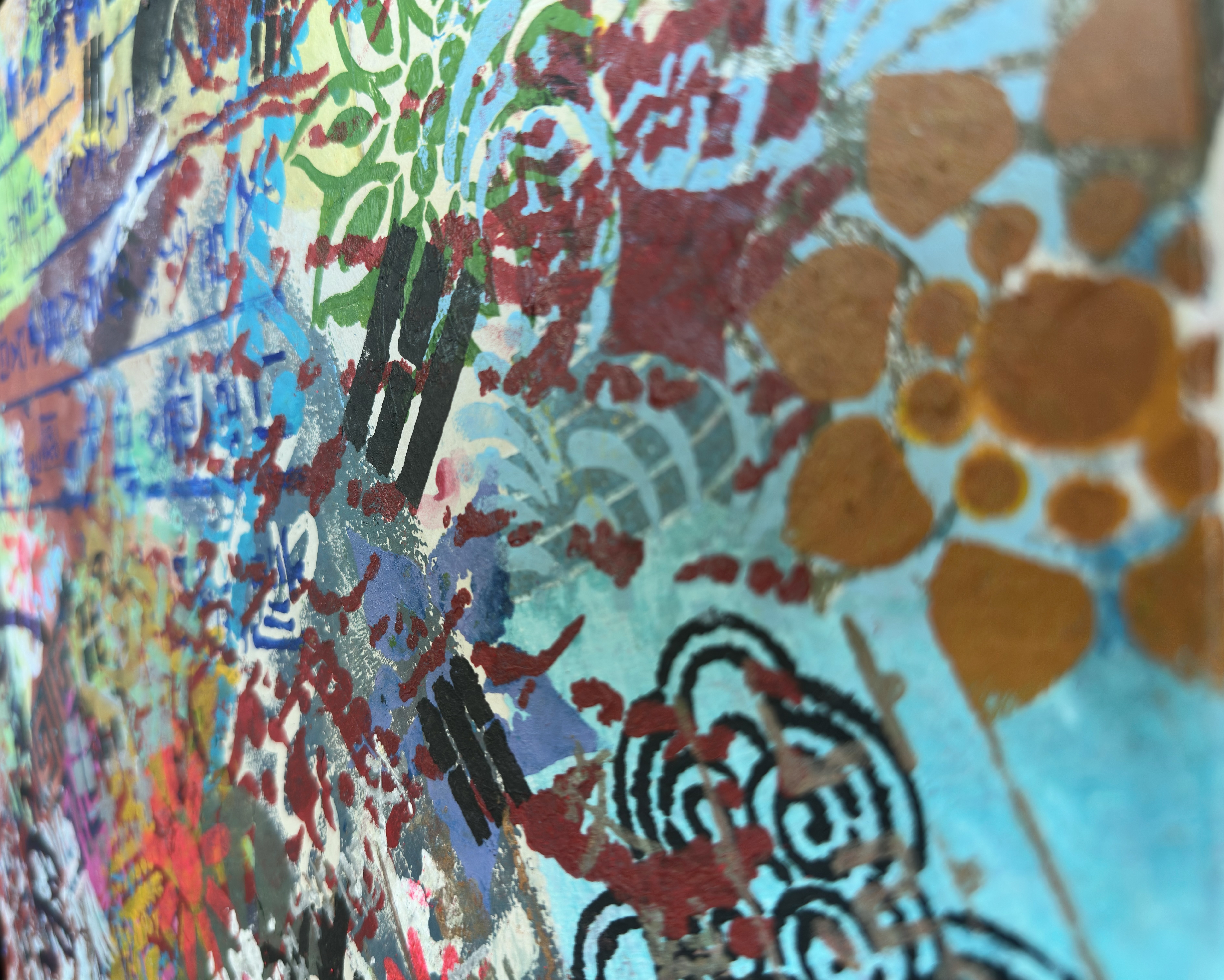 This restraint marks a departure from the series' earlier works. Where the first painting operated at maximum density—every element competing for space—and the second established hierarchies through material endurance, the third relaxes its grip. Not softening, but ceasing to assert. The patterns no longer fight because the fight is over.