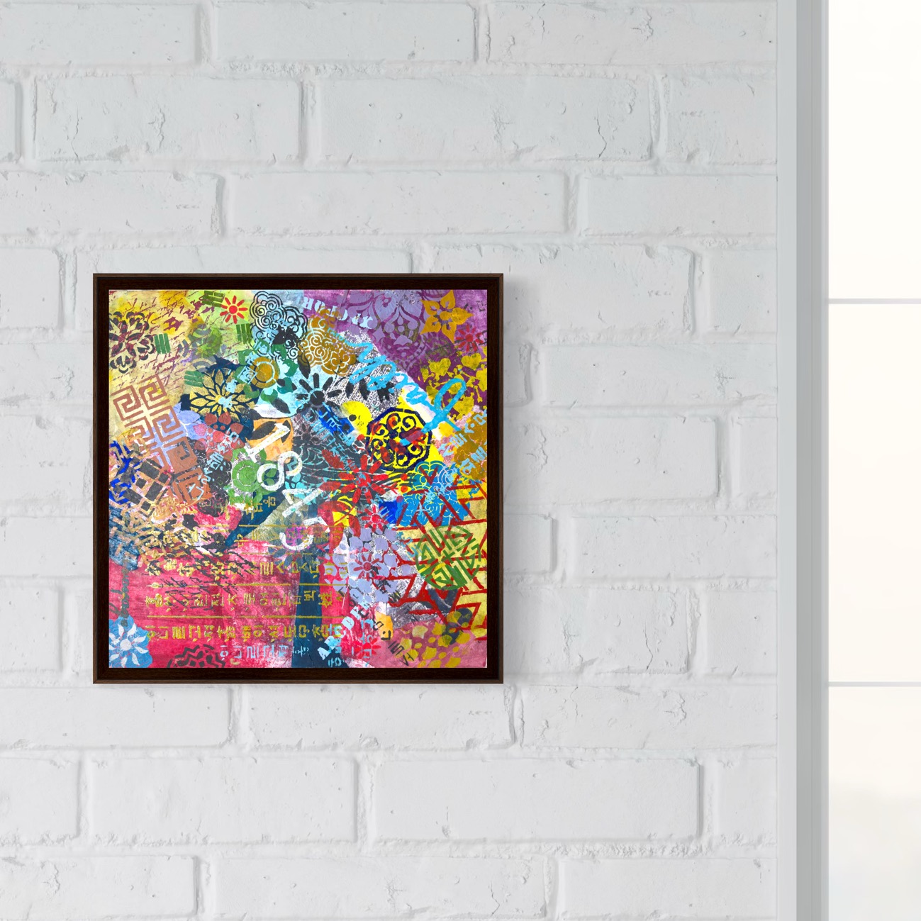 이 흡수적 기반 위로 아크릴 스텐실이 즉각적인 명료함을 부여한다. 단청의 구름과 문양은 건축적 역할에서 벗어나 자유롭게 회전하며, 정사각형 포맷은 이러한 회전을 허용한다. 캔버스를 돌릴 때마다 어떤 요소는 전면으로 떠오르고, 다른 요소는 리듬으로 물러난다.