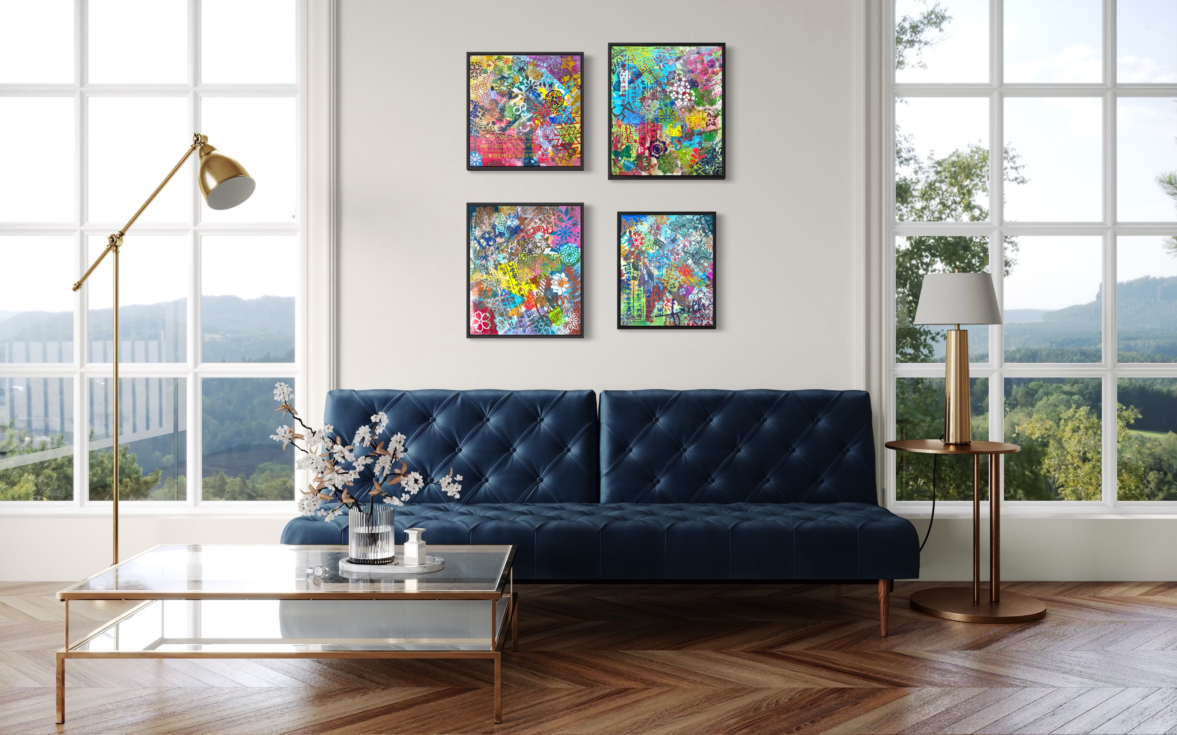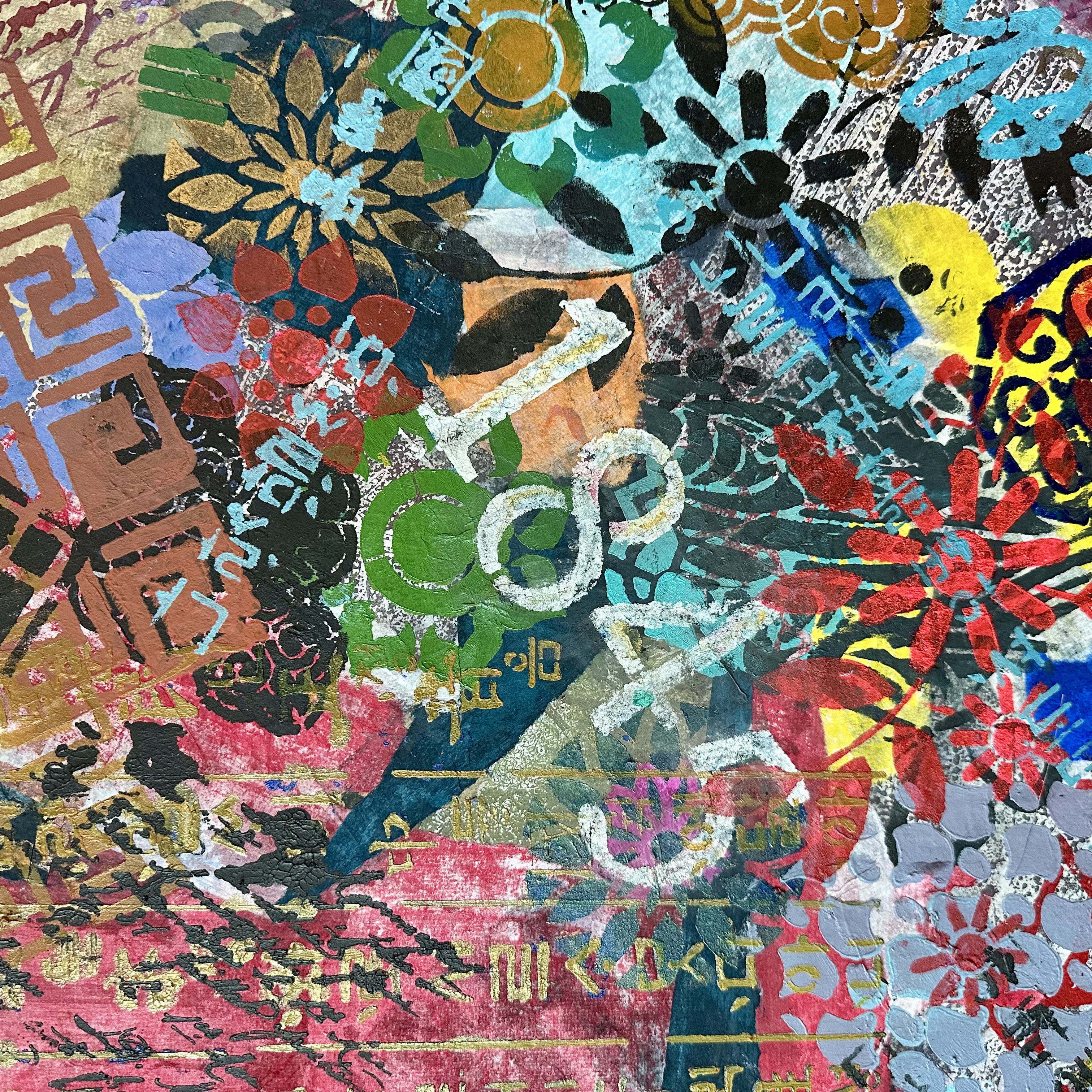 The answer is not theoretical. It is material. You see it in the way gold Hangul holds its vertical weight while French cursive drifts across it. You see it in the way dyed hanji builds depth through time while acrylic stencil introduces instantaneous clarity. You see it in the way the square format refuses to privilege any single viewpoint, turning the act of looking into an act of decision.
