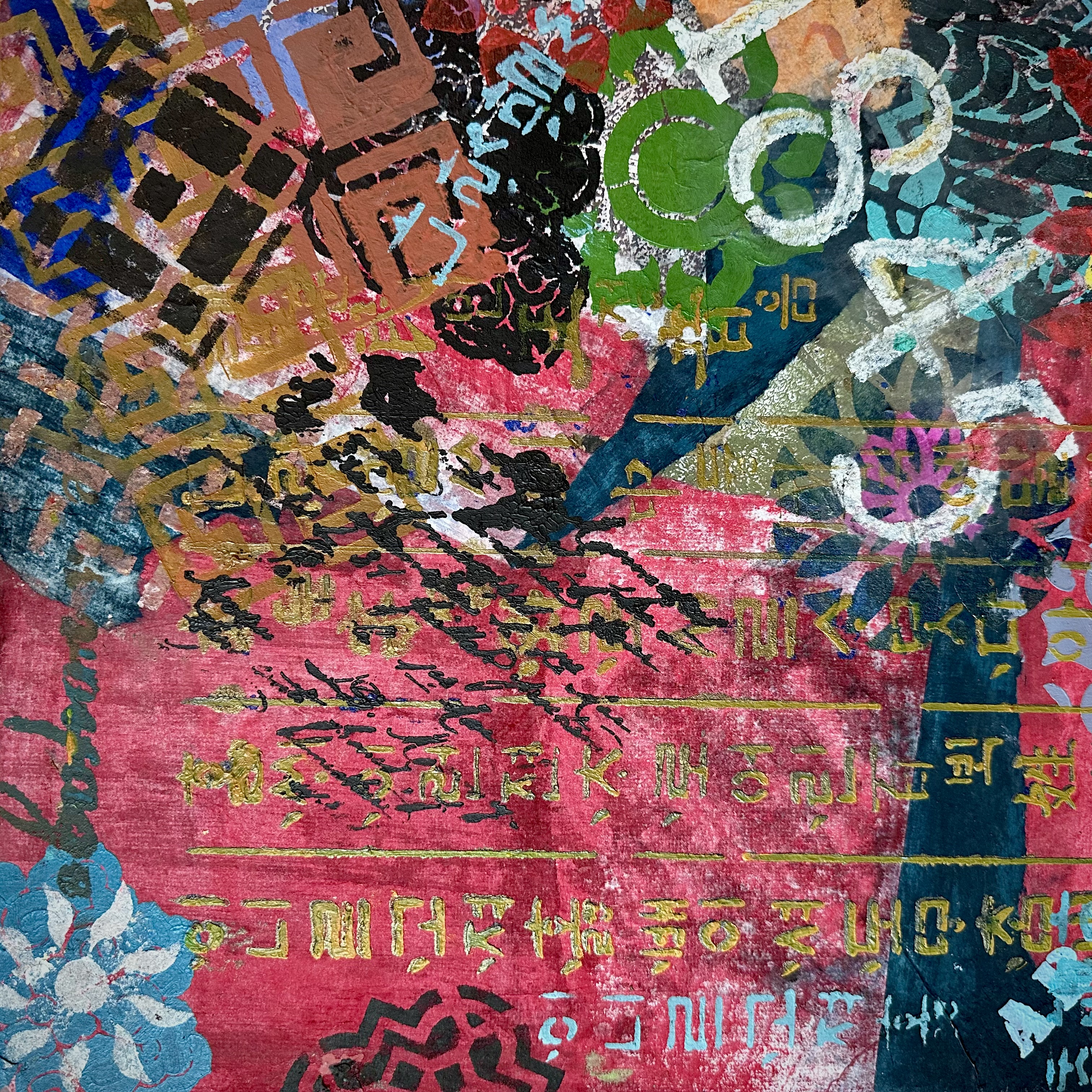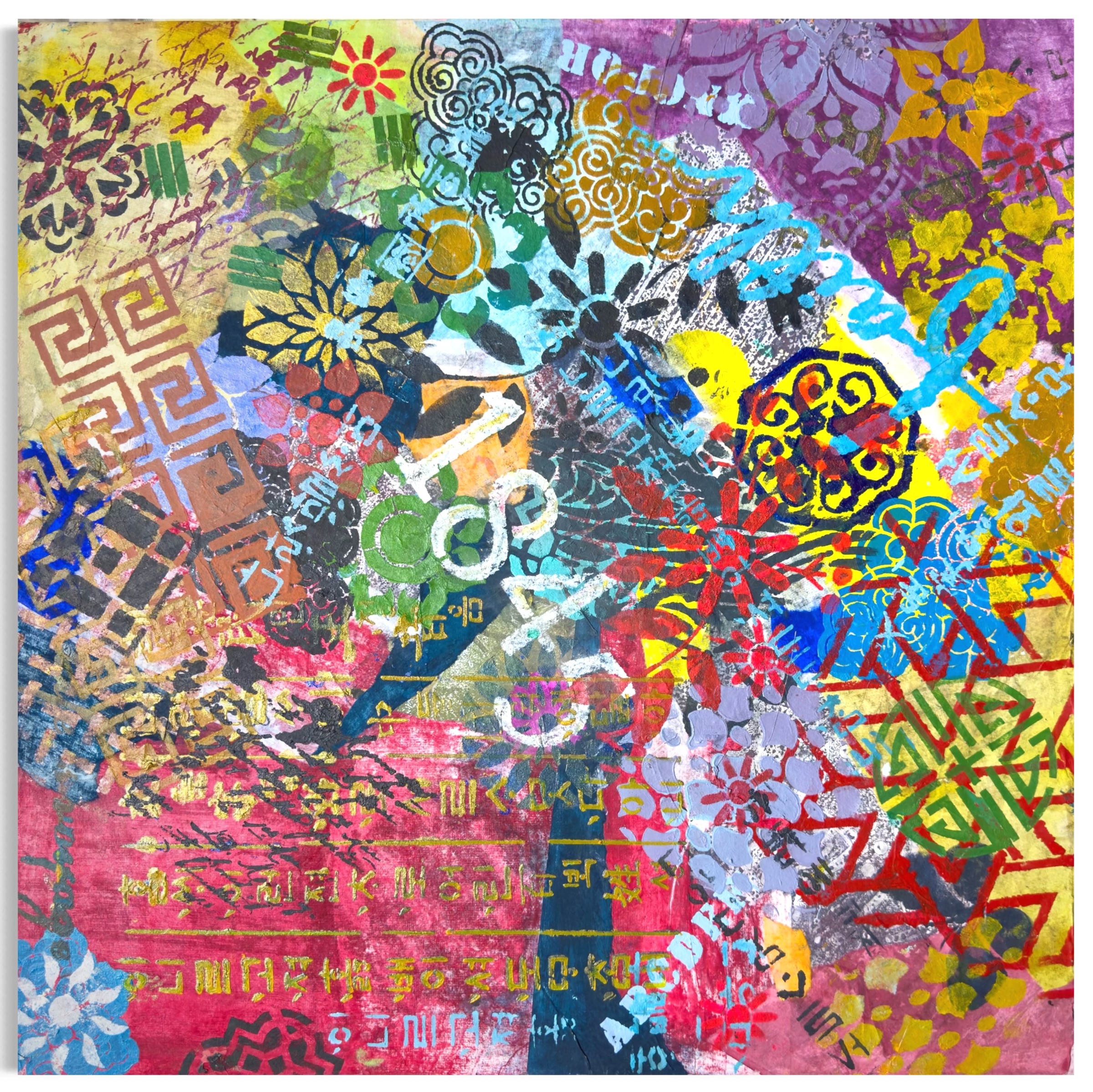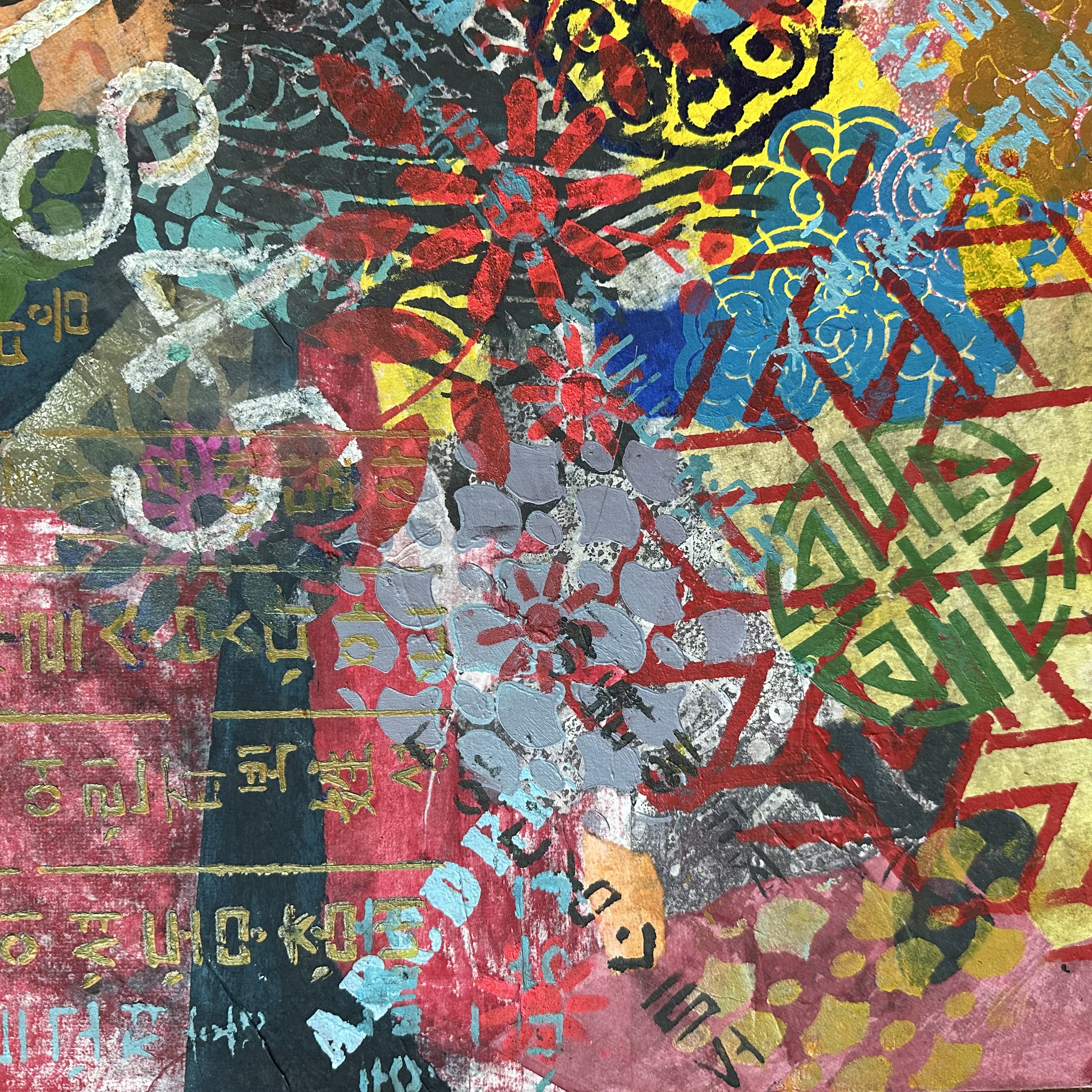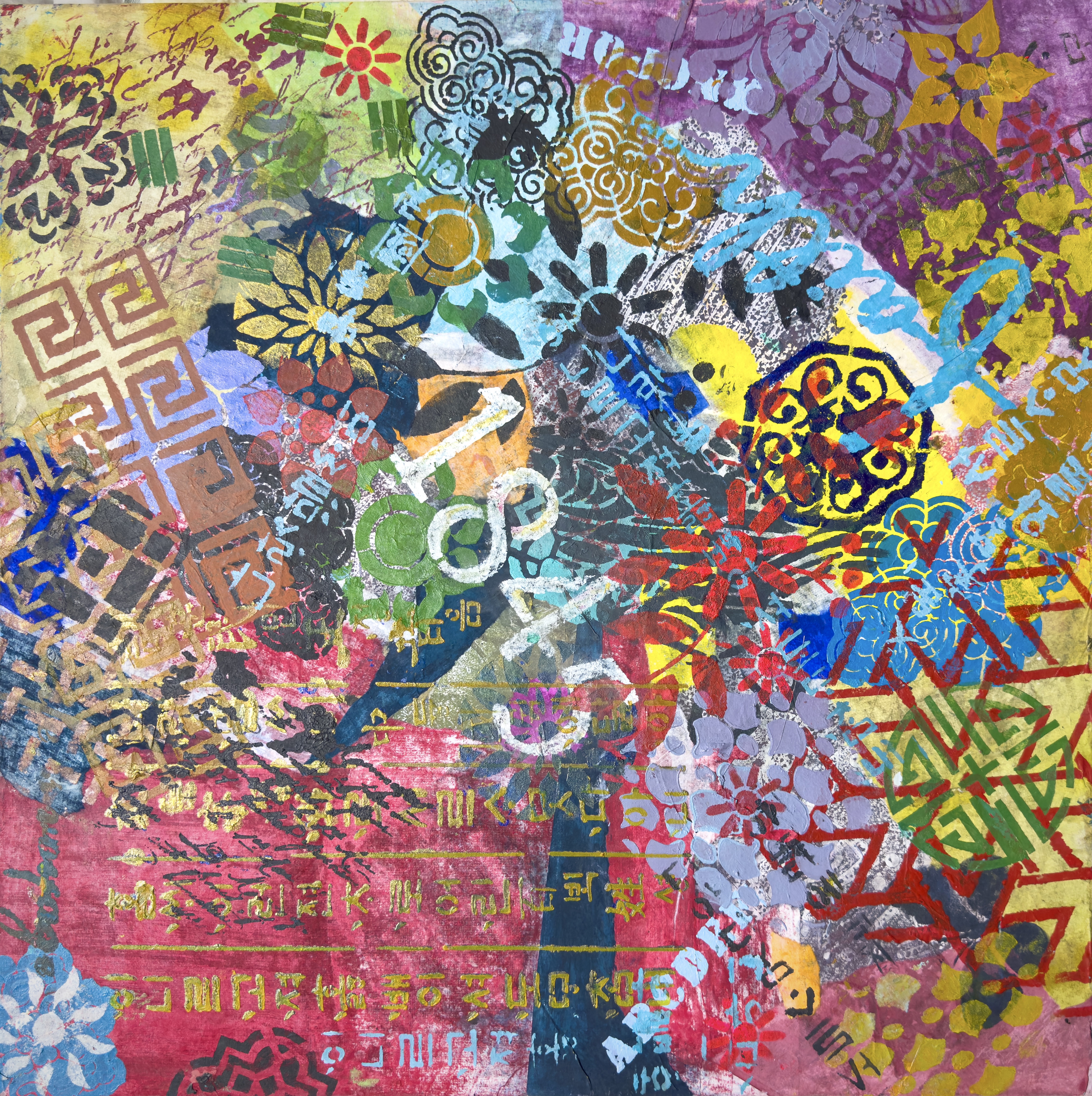 Mixed media on canvas (Dyed hanji and gel-printed hanji collage, acrylic stencil)